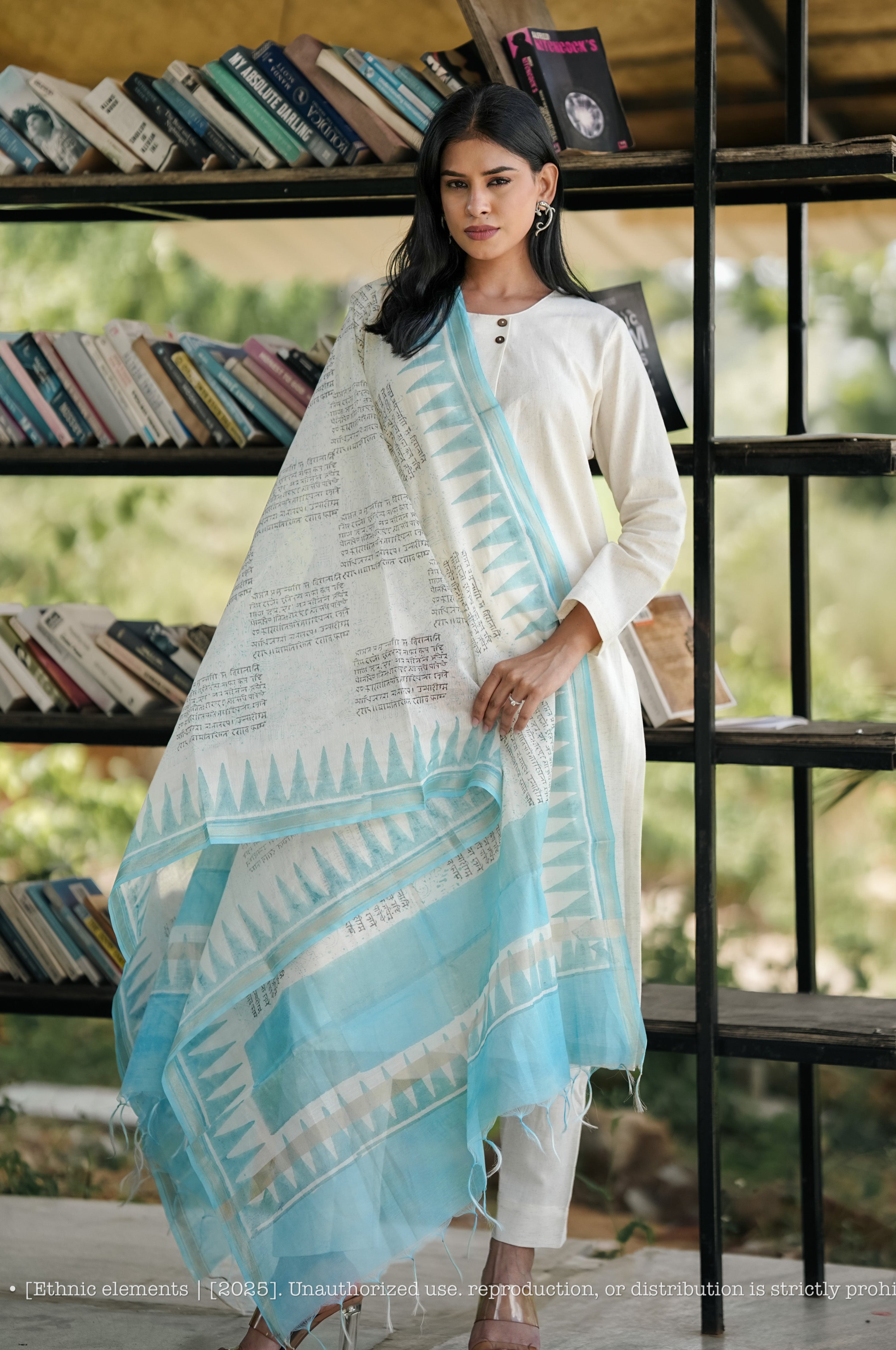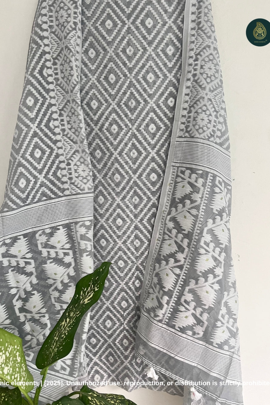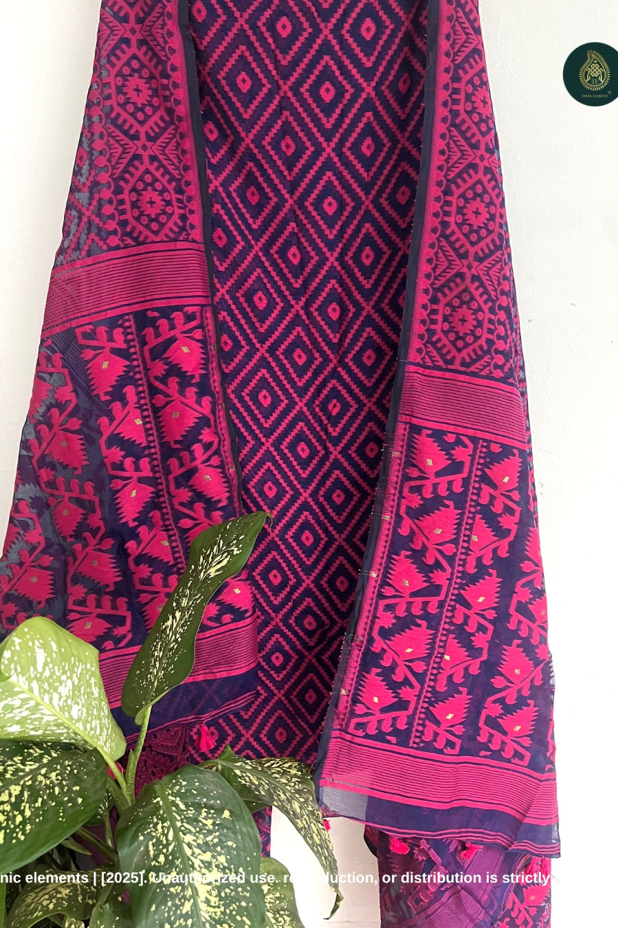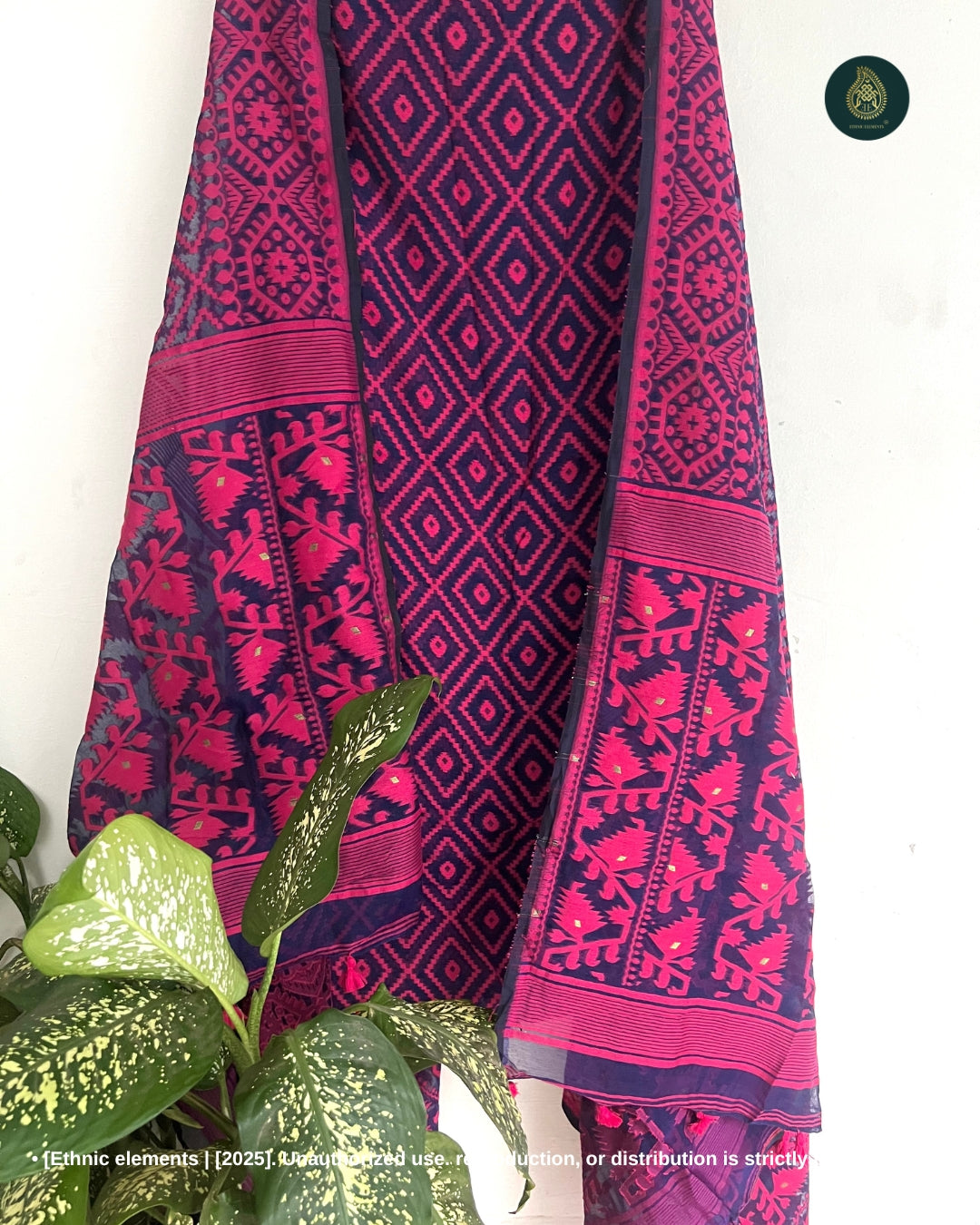 A Jamdani handloom suit set features intricate woven patterns with extra threads, creating a luxurious and textured fabric. Perfect for elegant occasions, it combines traditional craftsmanship with timeless beauty.