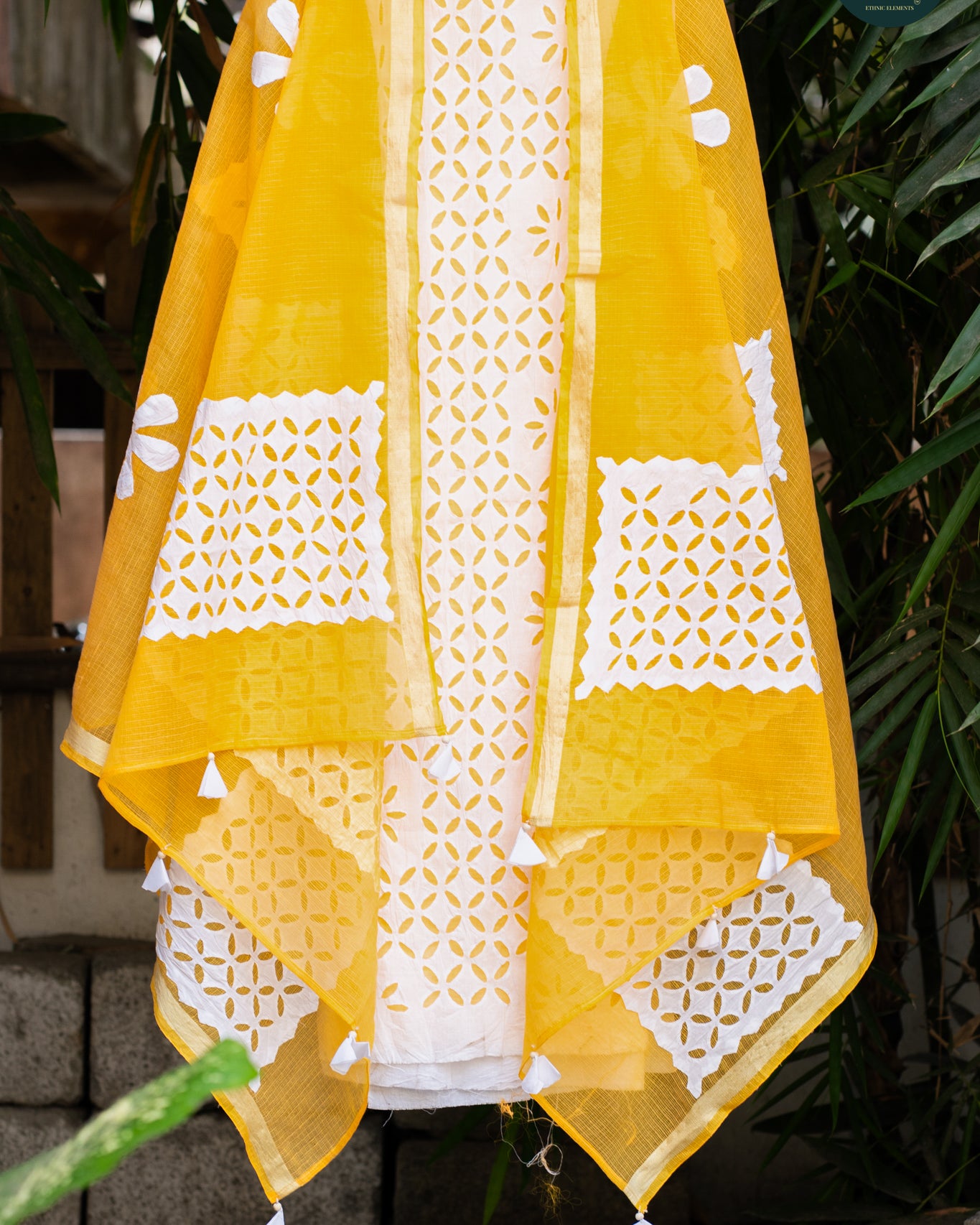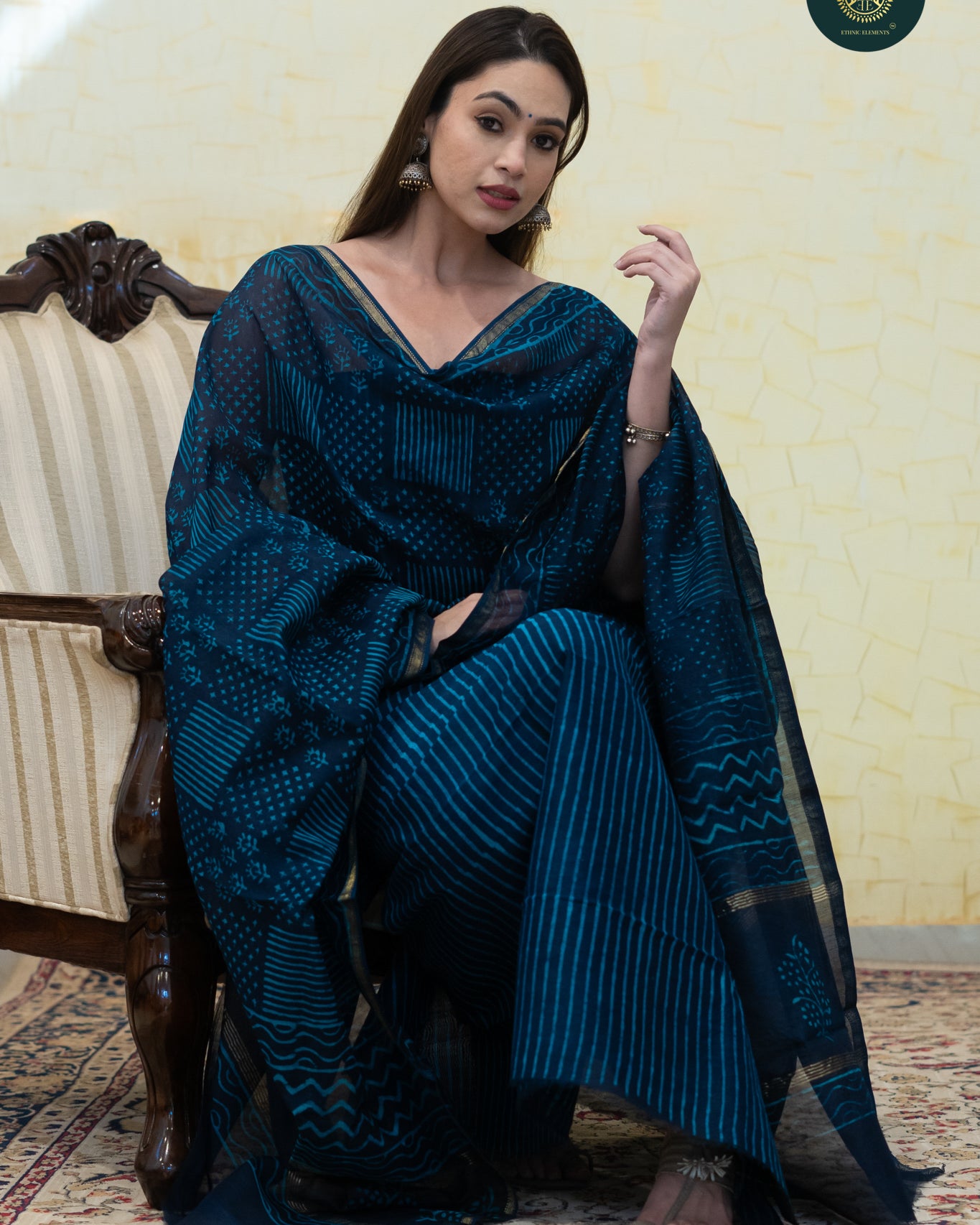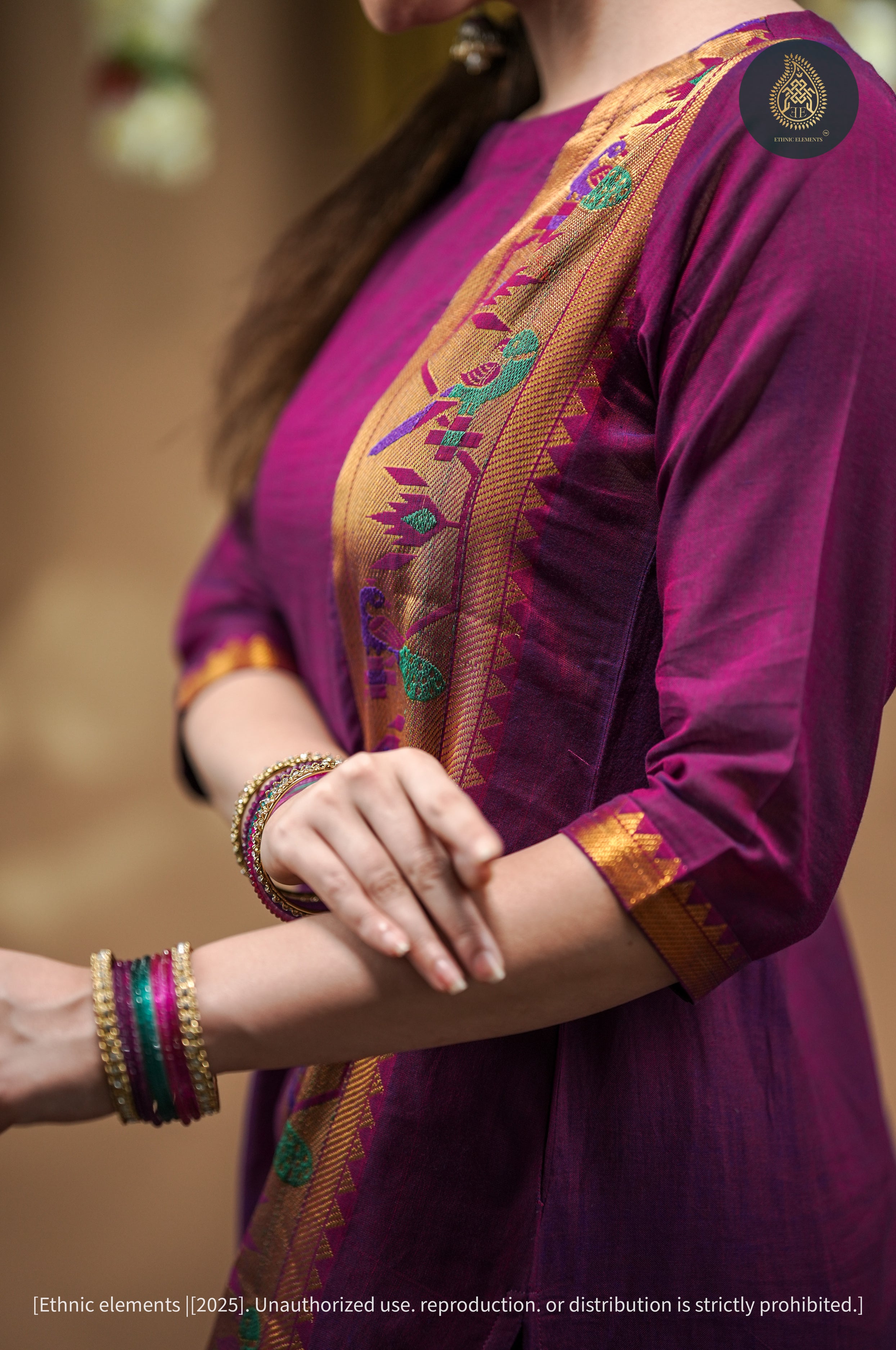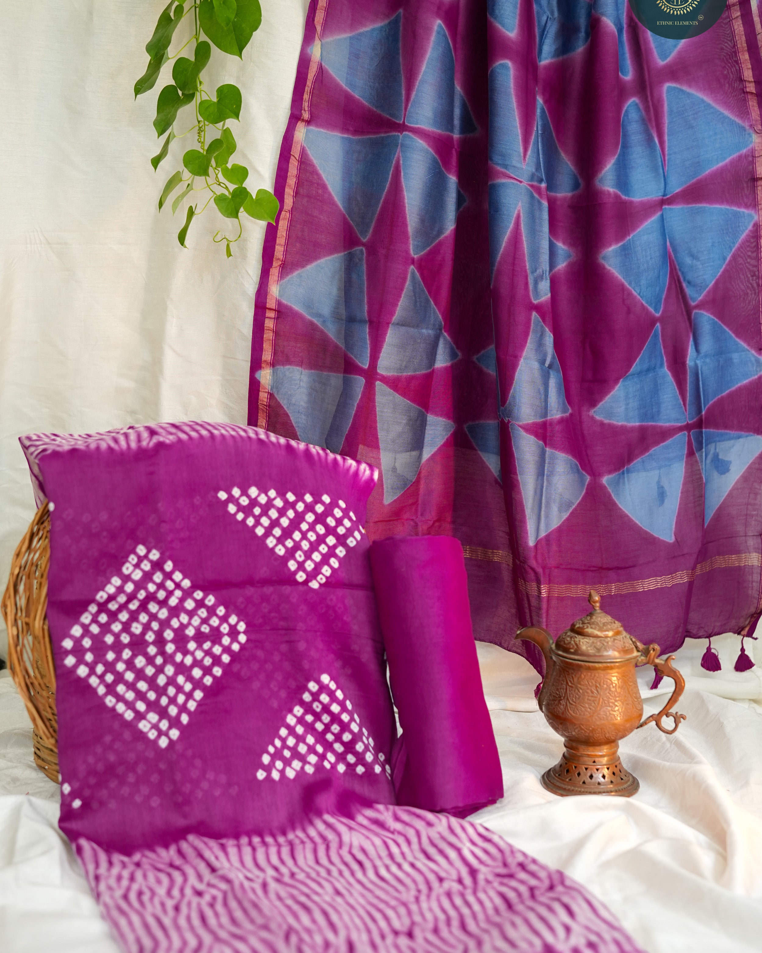 A Jamdani handloom suit set features intricate woven patterns with extra threads, creating a luxurious and textured fabric. Perfect for elegant occasions, it combines traditional craftsmanship with timeless beauty.