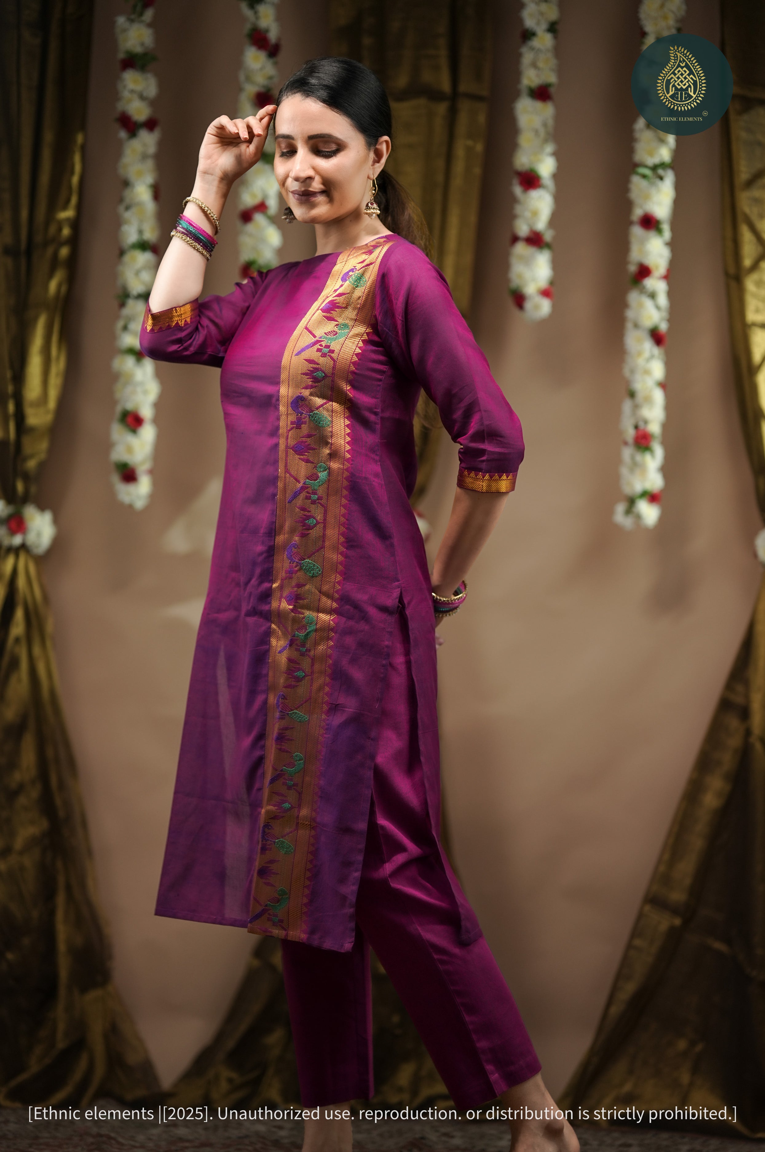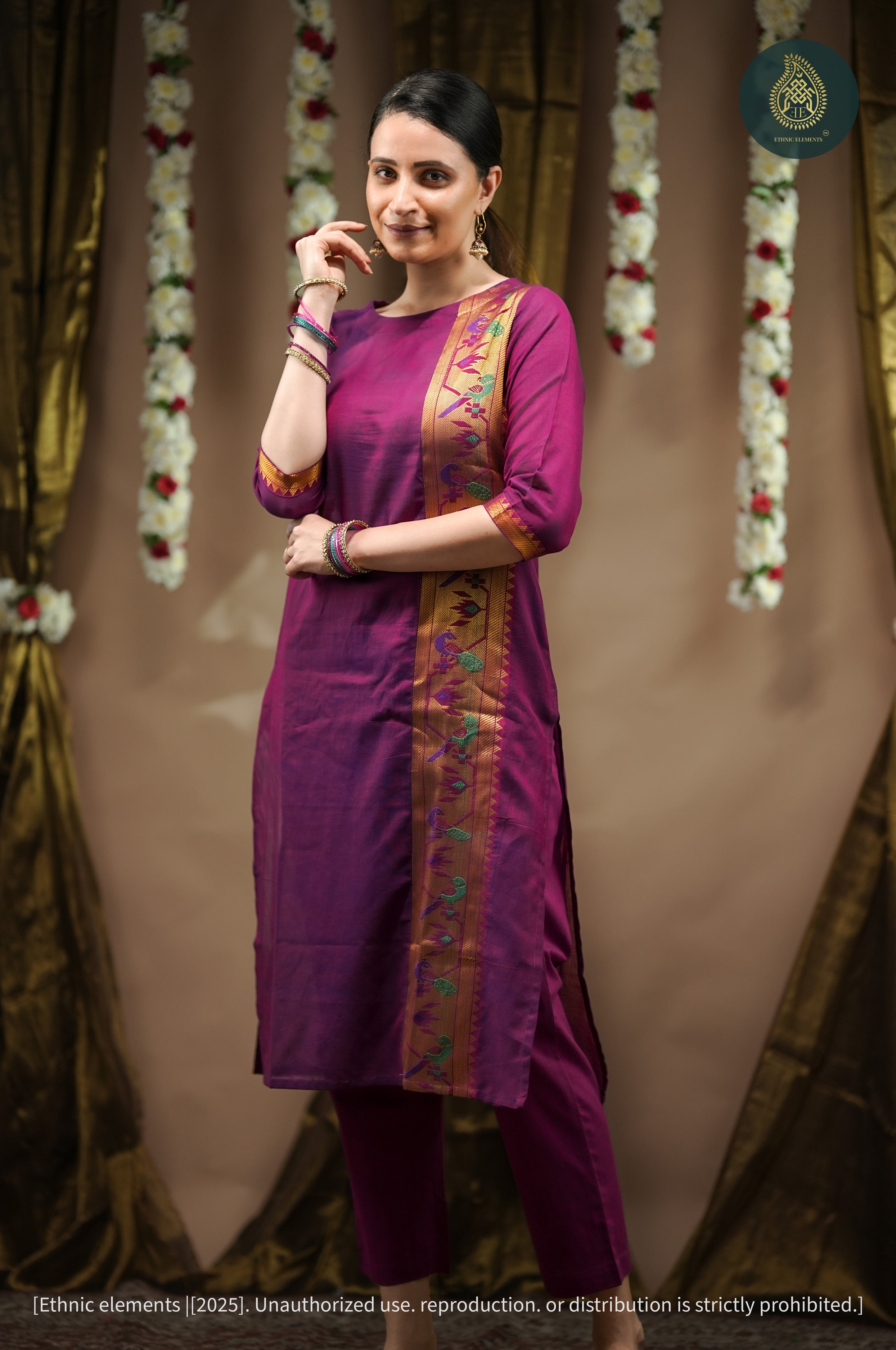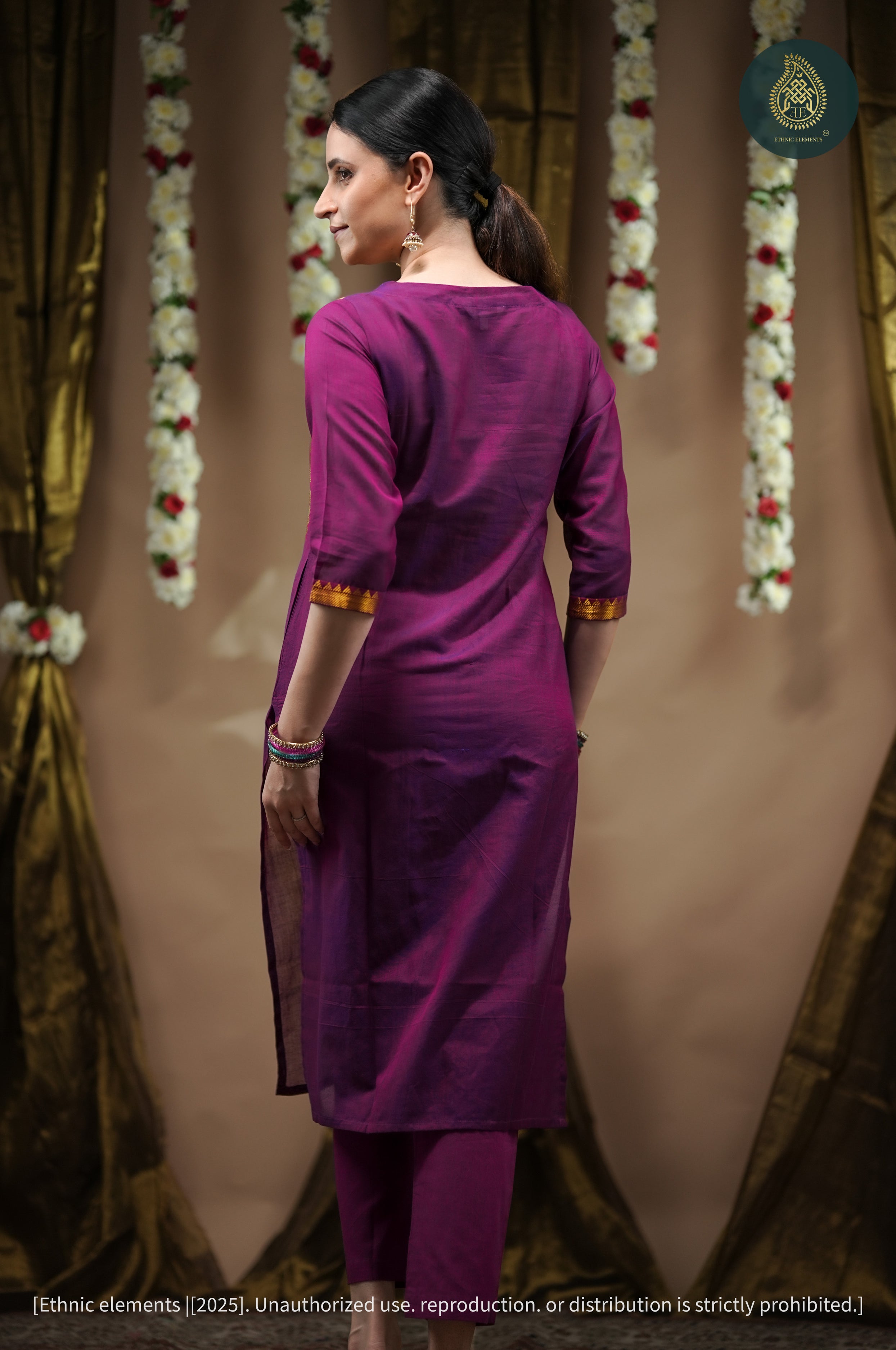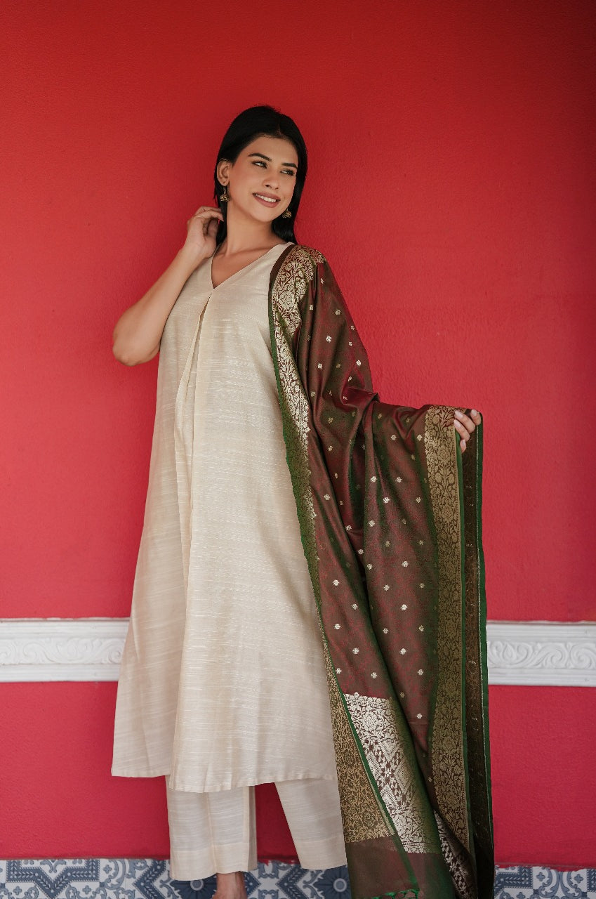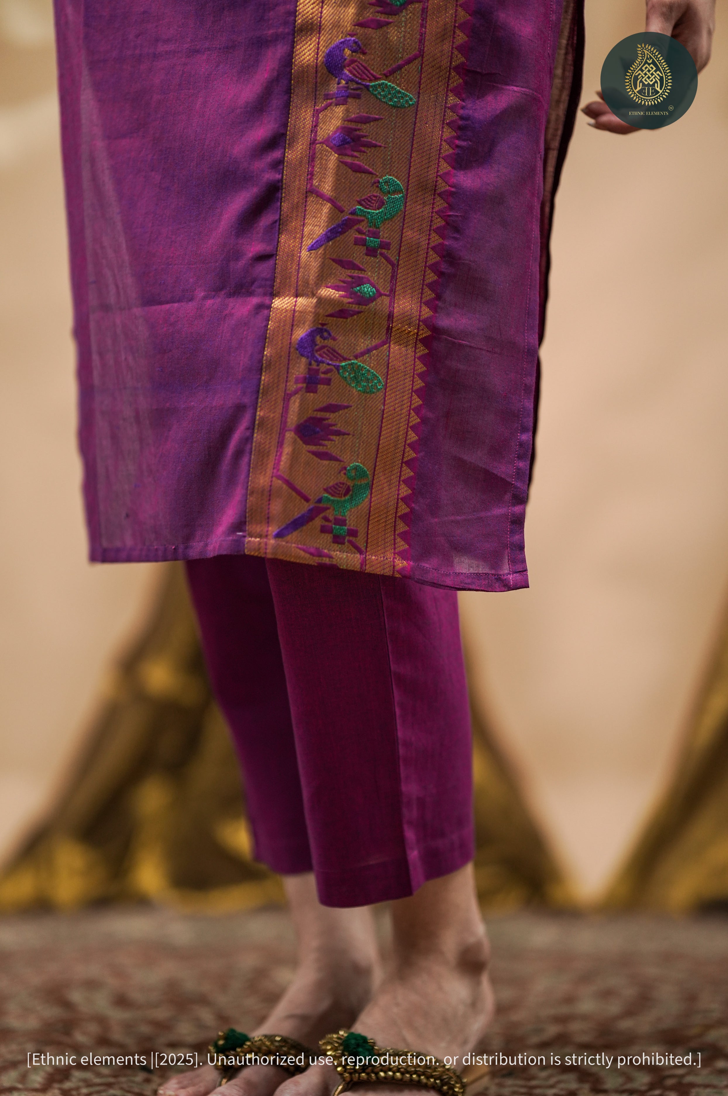 A Jamdani handloom suit set features intricate woven patterns with extra threads, creating a luxurious and textured fabric. Perfect for elegant occasions, it combines traditional craftsmanship with timeless beauty.