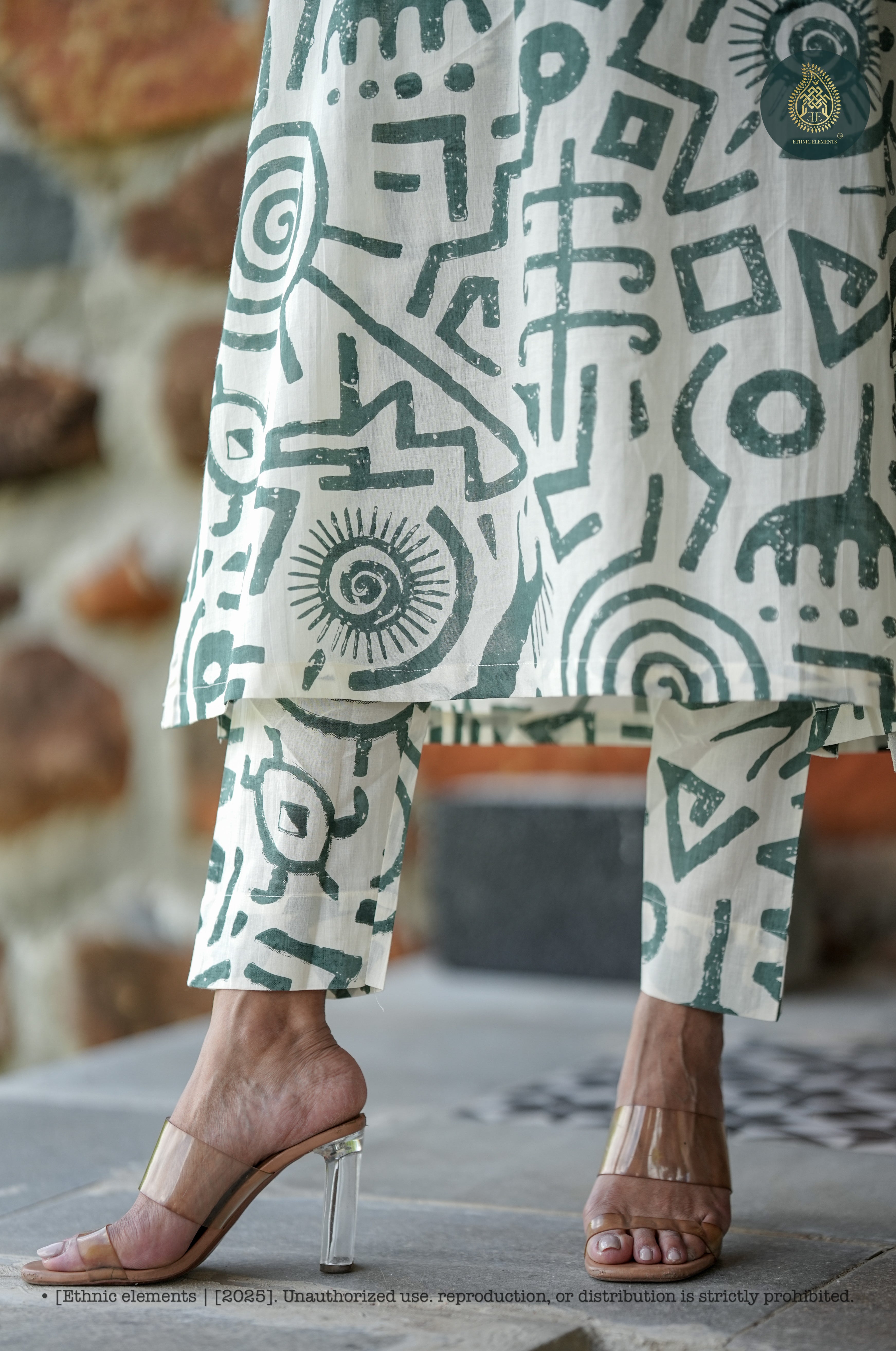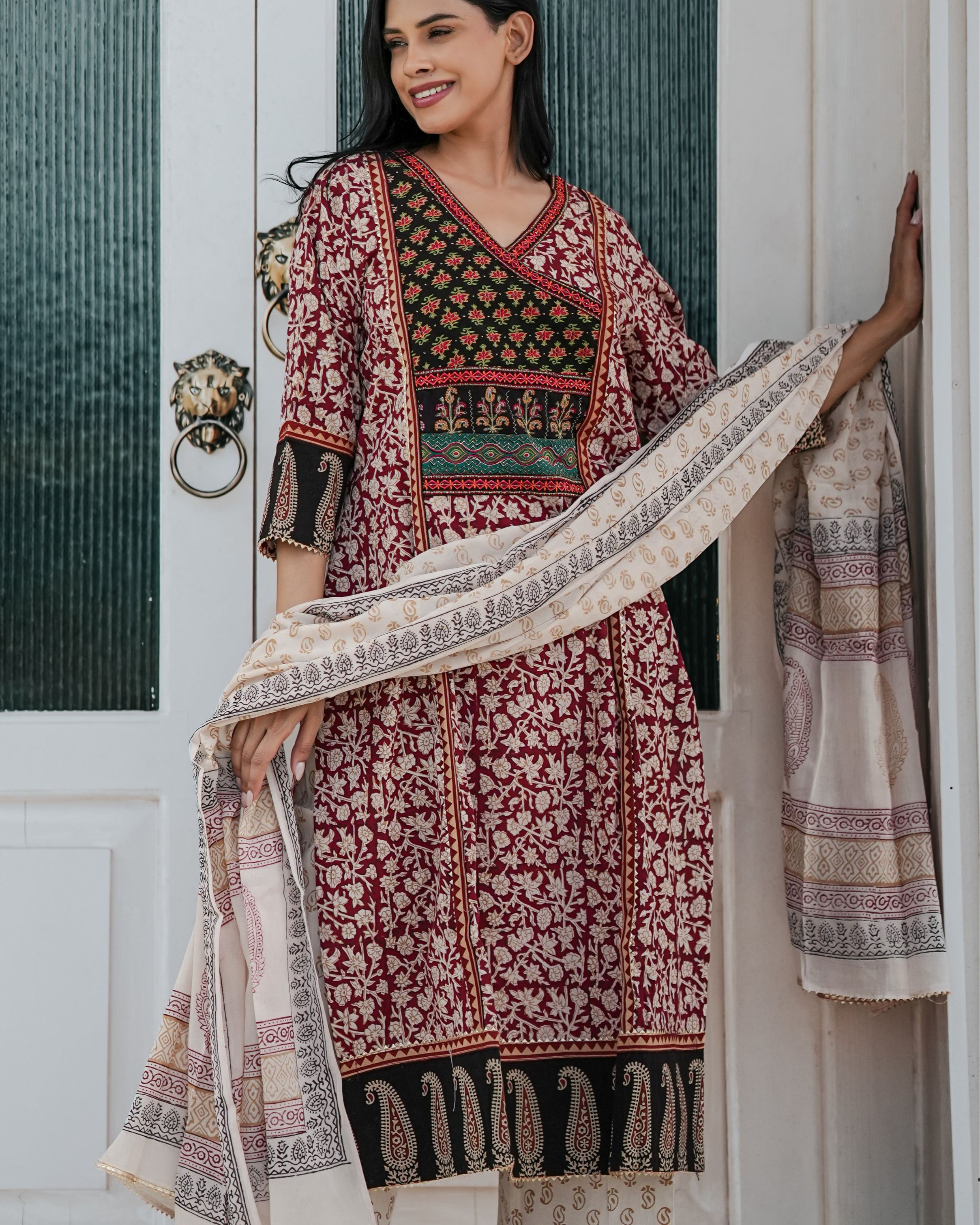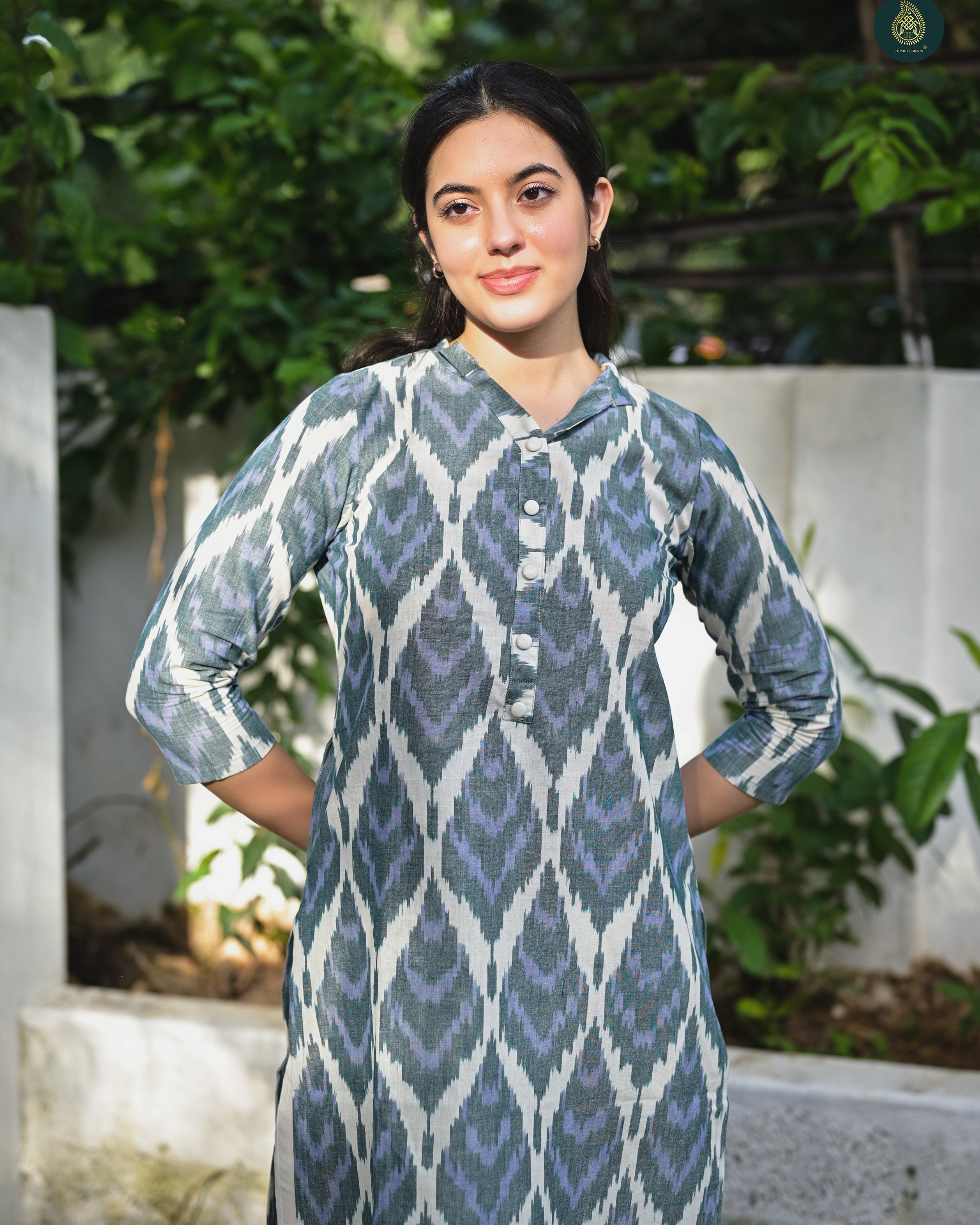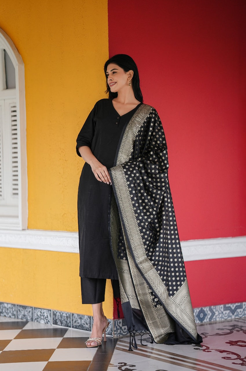 A Jamdani handloom suit set features intricate woven patterns with extra threads, creating a luxurious and textured fabric. Perfect for elegant occasions, it combines traditional craftsmanship with timeless beauty.