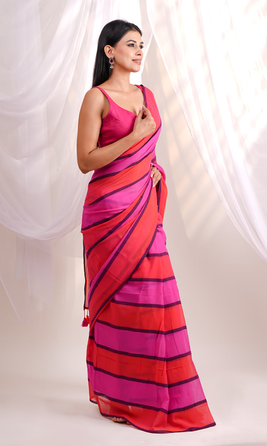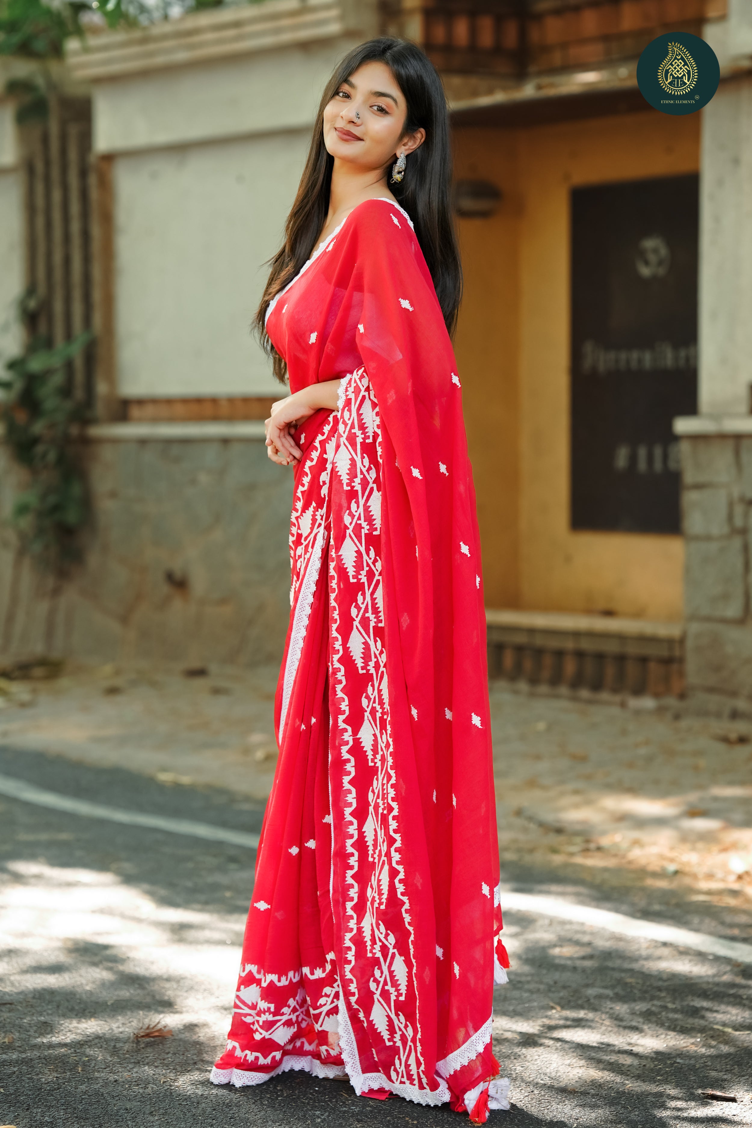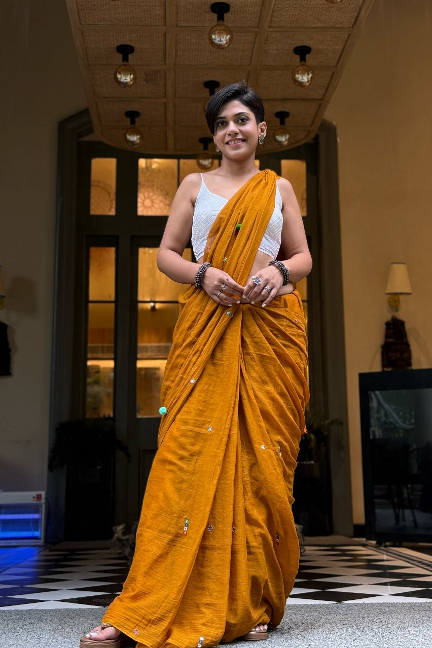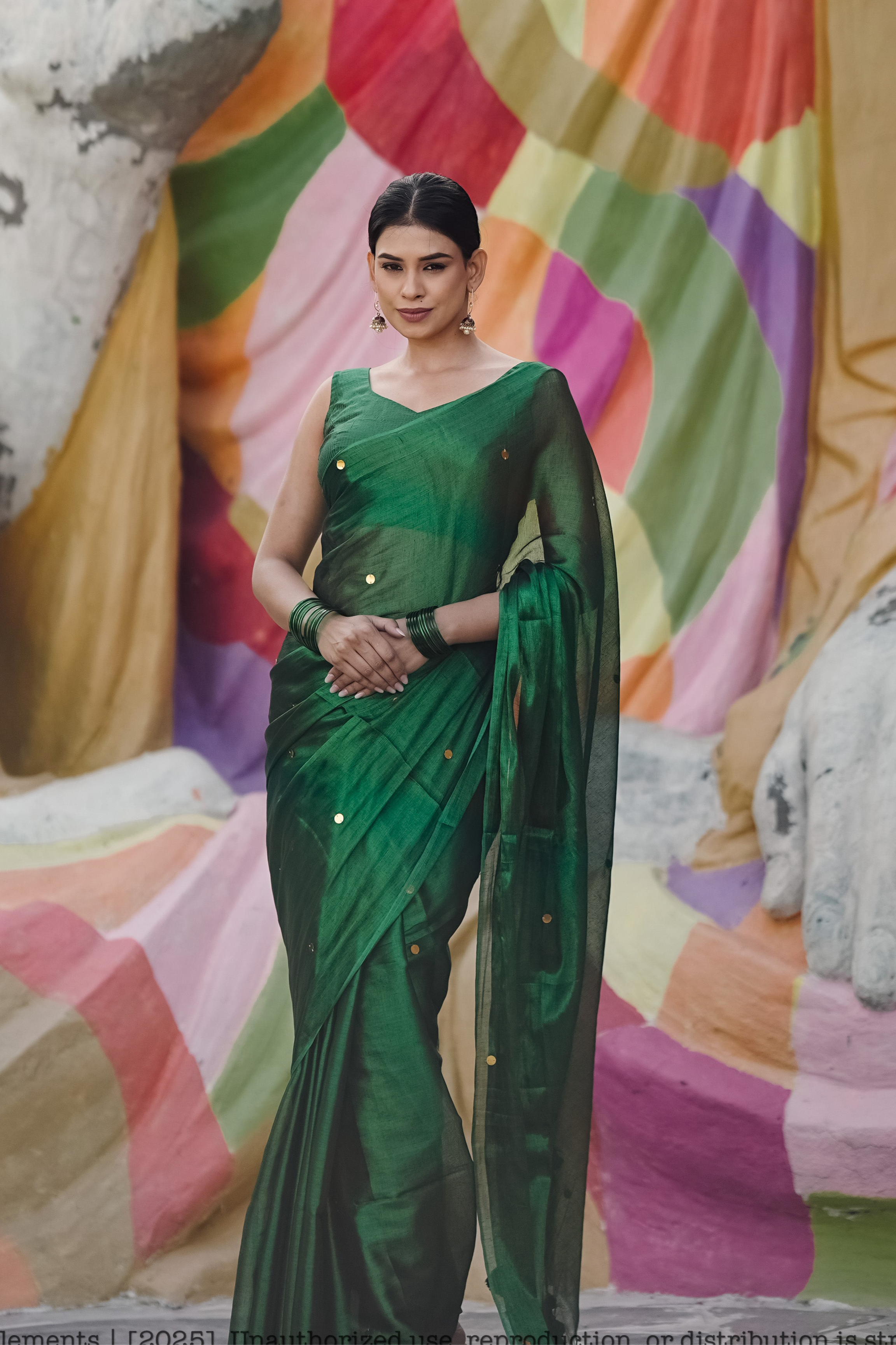 This saree is pure joy! The color is so fresh and vibrant, and the fabric feels light and breezy-perfect for all-day wear. I love how effortlessly elegant it makes me feel, whether I’m outdoors or at a casual gathering.
