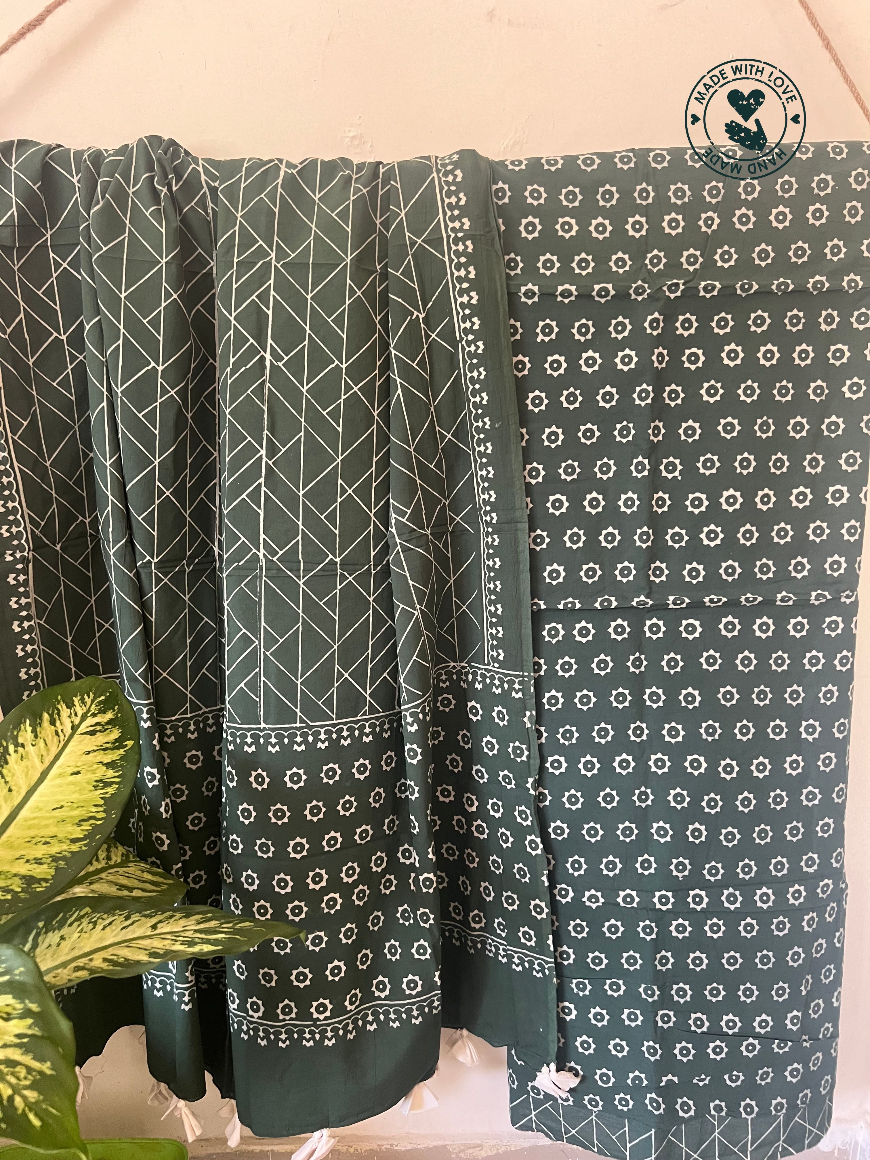 Monochrome hand-block printed 3-Pcs suit set. All the three fabrics - kurta, dupatta and bottoms are naturally dyed using organic colors. All the fabrics are woven cotton. Dupatta has hand-made tassels on both sides. The tassels too are made of cotton. No synthetic material is used anywhere in the suit set. Hand-block prints are made using wooden stencils in the old fashioned way.