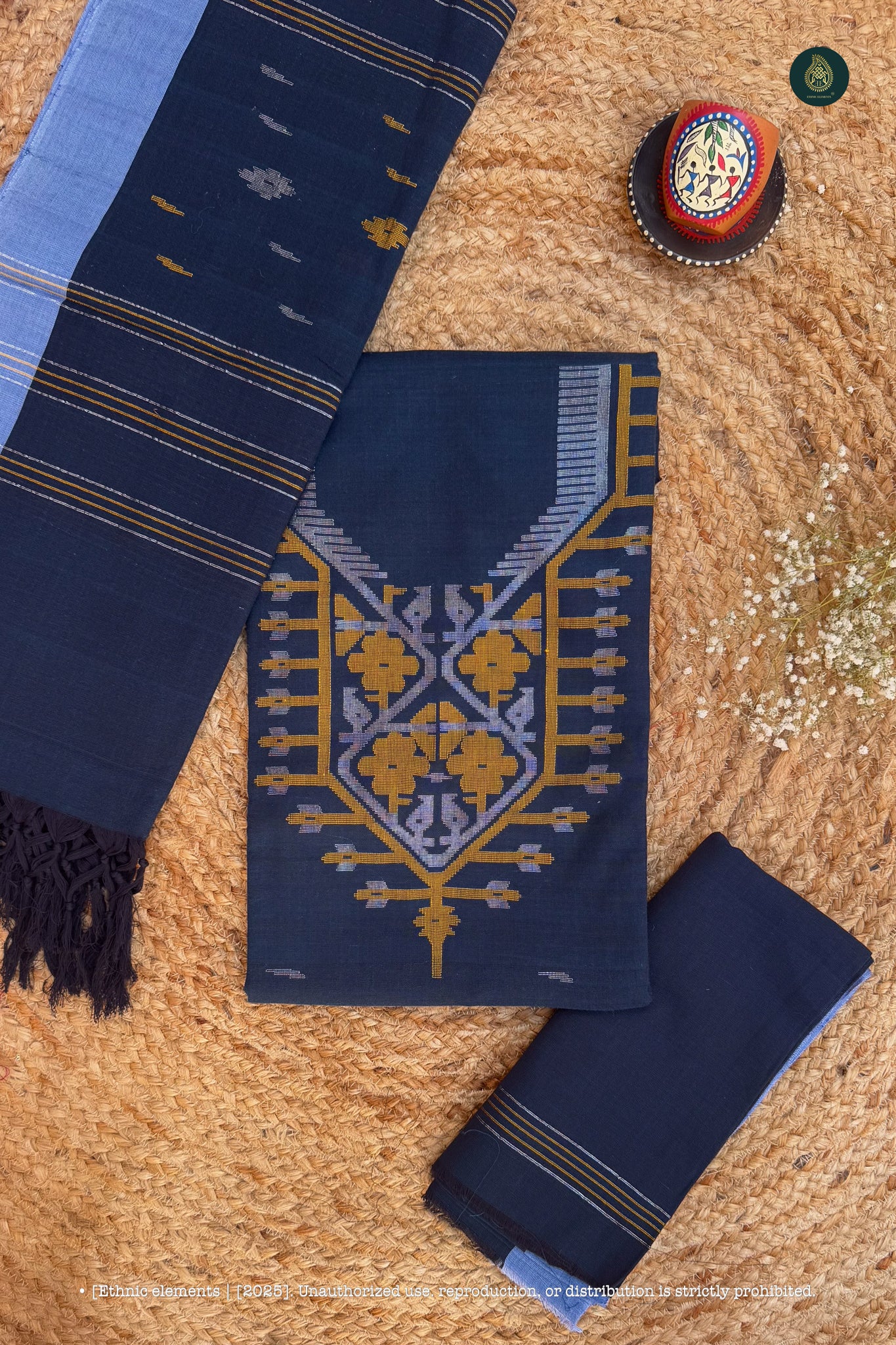 Bangladeshi Soft Cotton Jamdani Unstitched 3pc suit set- Indigo