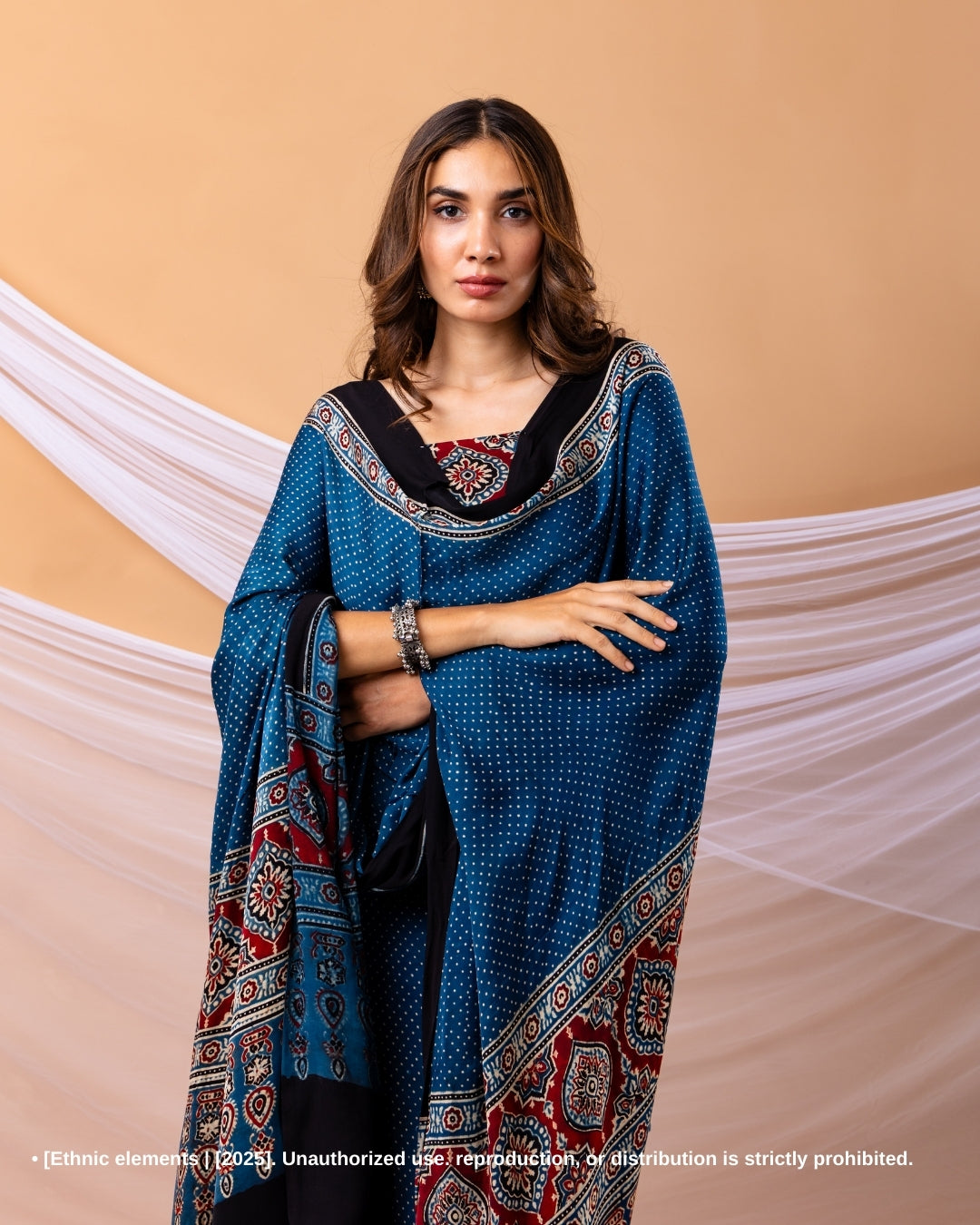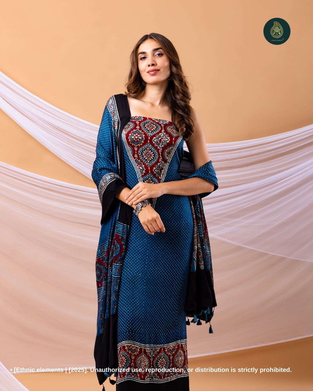 Add timeless elegance to your wardrobe with this beautifully handcrafted Ajrakh 3-piece suit set in soft and luxurious modal silk. Featuring intricate block prints made using natural vegetable dyes, this ensemble reflects the charm of traditional craftsmanship with a modern appeal. The matching dupatta, adorned with tassels, adds the perfect finishing touch.