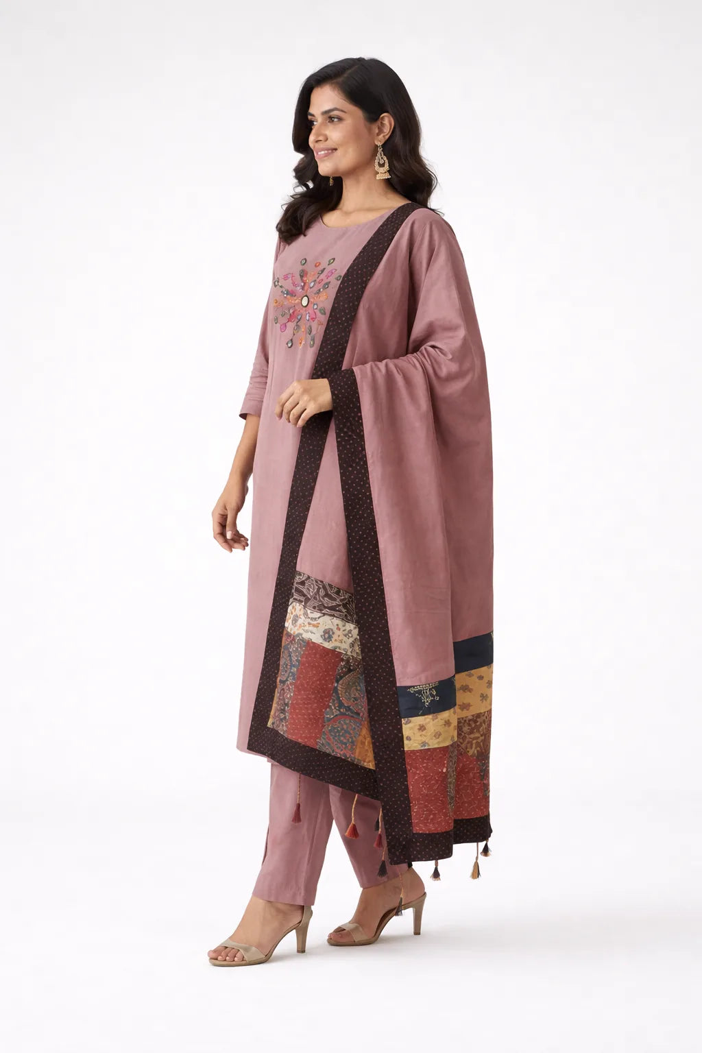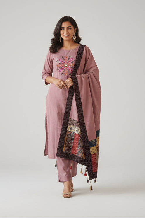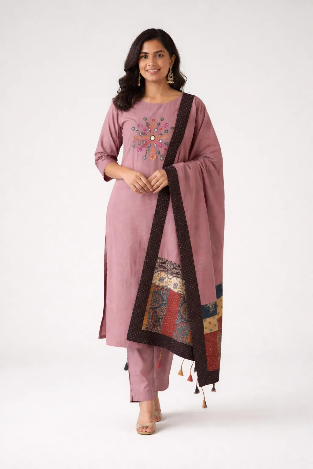 Celebrate India's living craft traditions with this handcrafted Kutchi mirror work kurta set, elevated by all-over Kantha hand stitch and paired with an authentic Kutchi Ajrakh patchwork dupatta. A timeless ensemble that reflects slow fashion, heritage craftsmanship, and conscious luxury