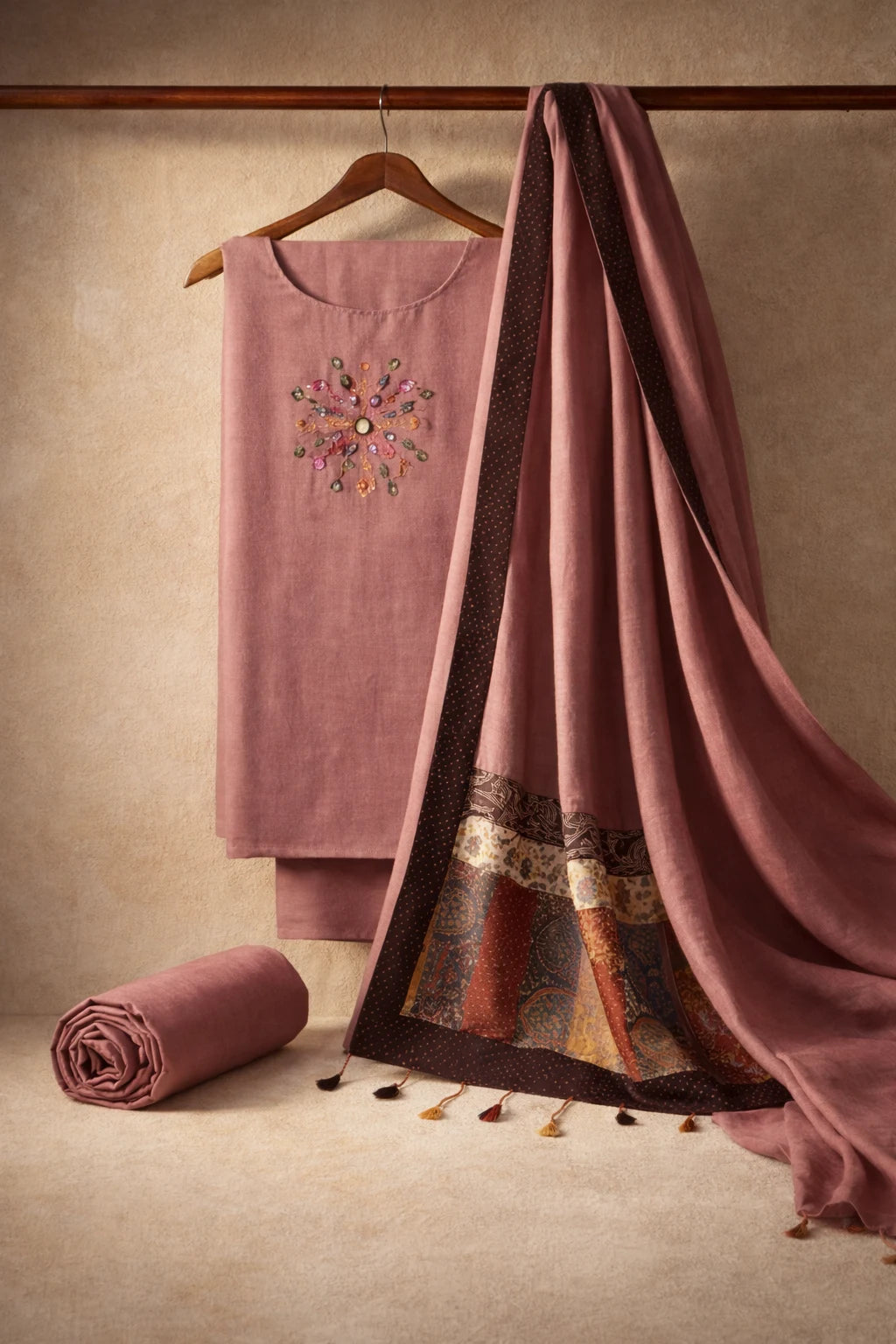 Kutchi Mirror Kantha Unstitched Cotton 3Pc Suit Set With Ajrakh Dupatta