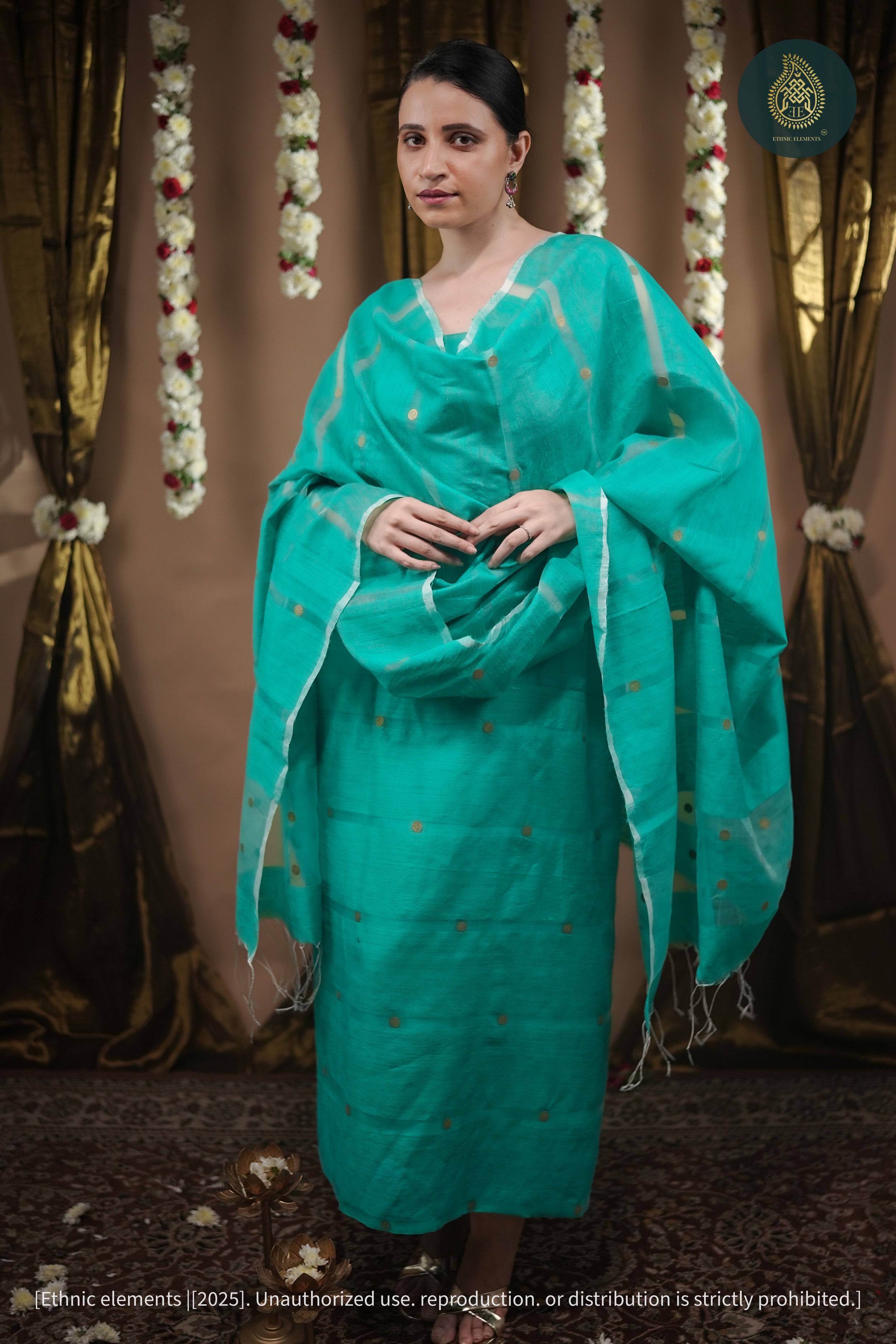 Taashvi celebrates the quiet beauty of handloom artistry — an unstitched Matka silk suit set woven with depth, character, and refined elegance. Crafted with purity, texture, and heritage. Woven in a refreshing Aqua Green shade, Taashvi embodies quiet luxury, artisanal charm, and the timeless beauty of handloom textiles. Designed for the woman who appreciates grace without excess, it carries the soul of India’s weaving traditions in every thread.