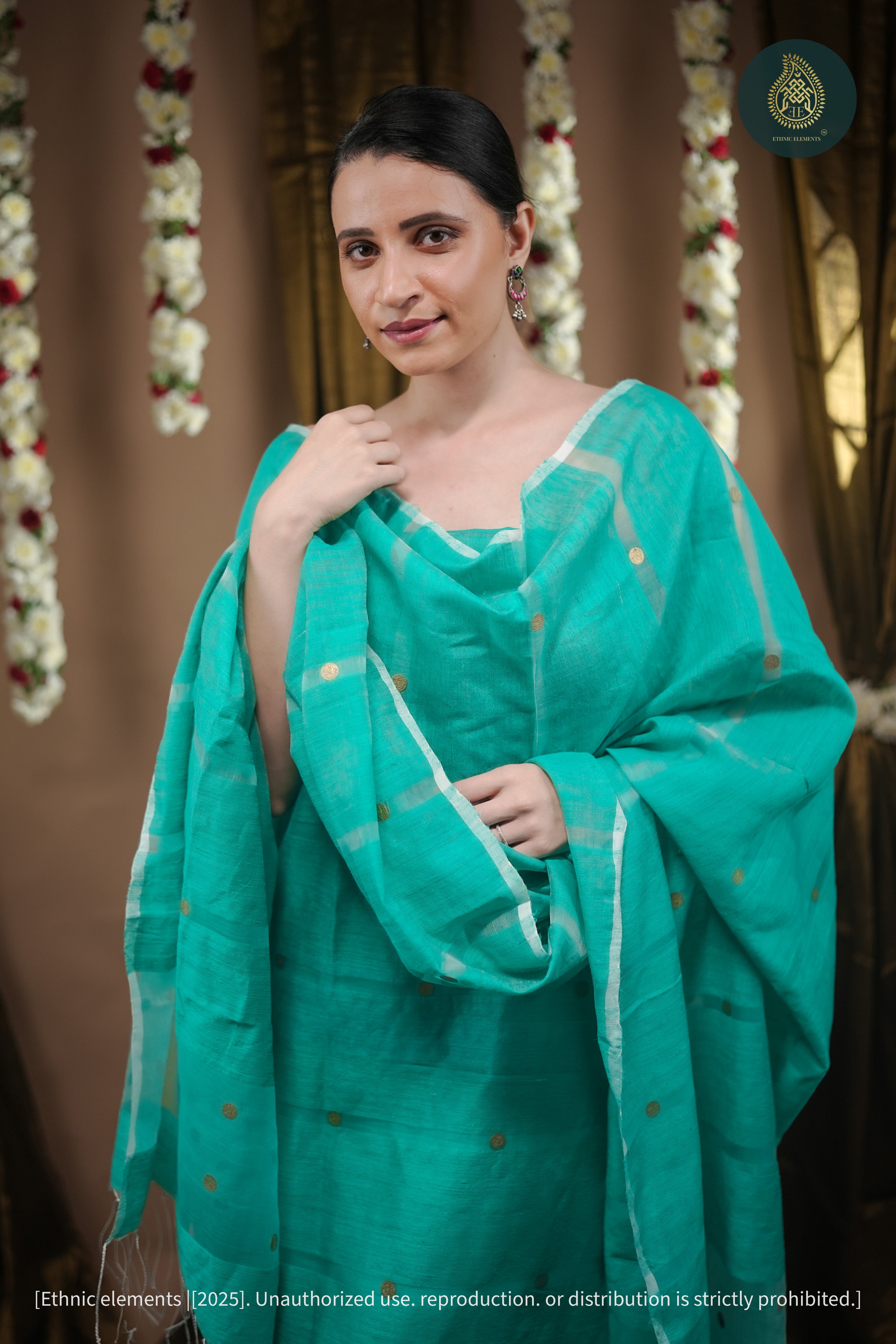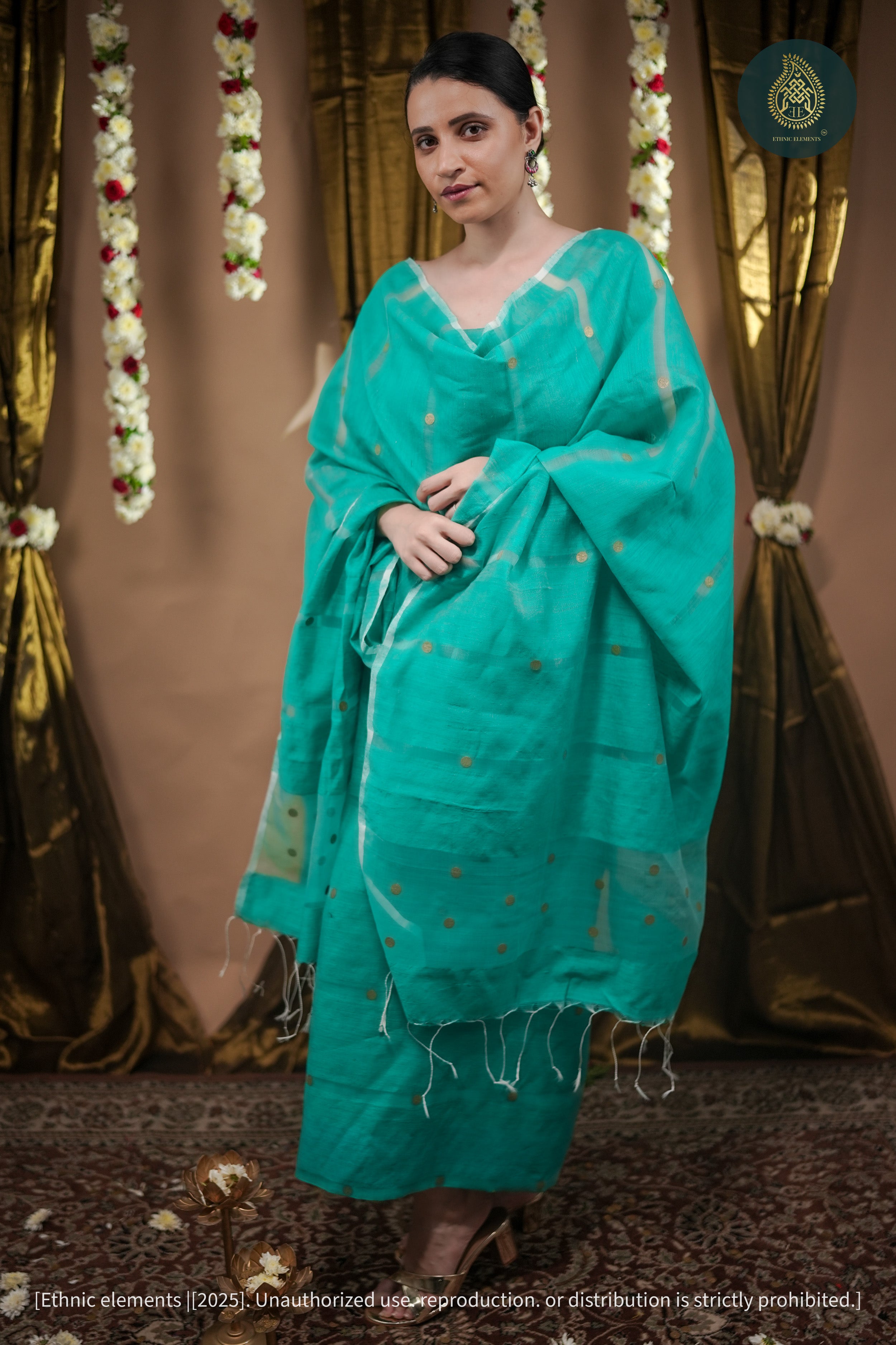 Details: Textured Matka weave with handwoven gold coin motifs