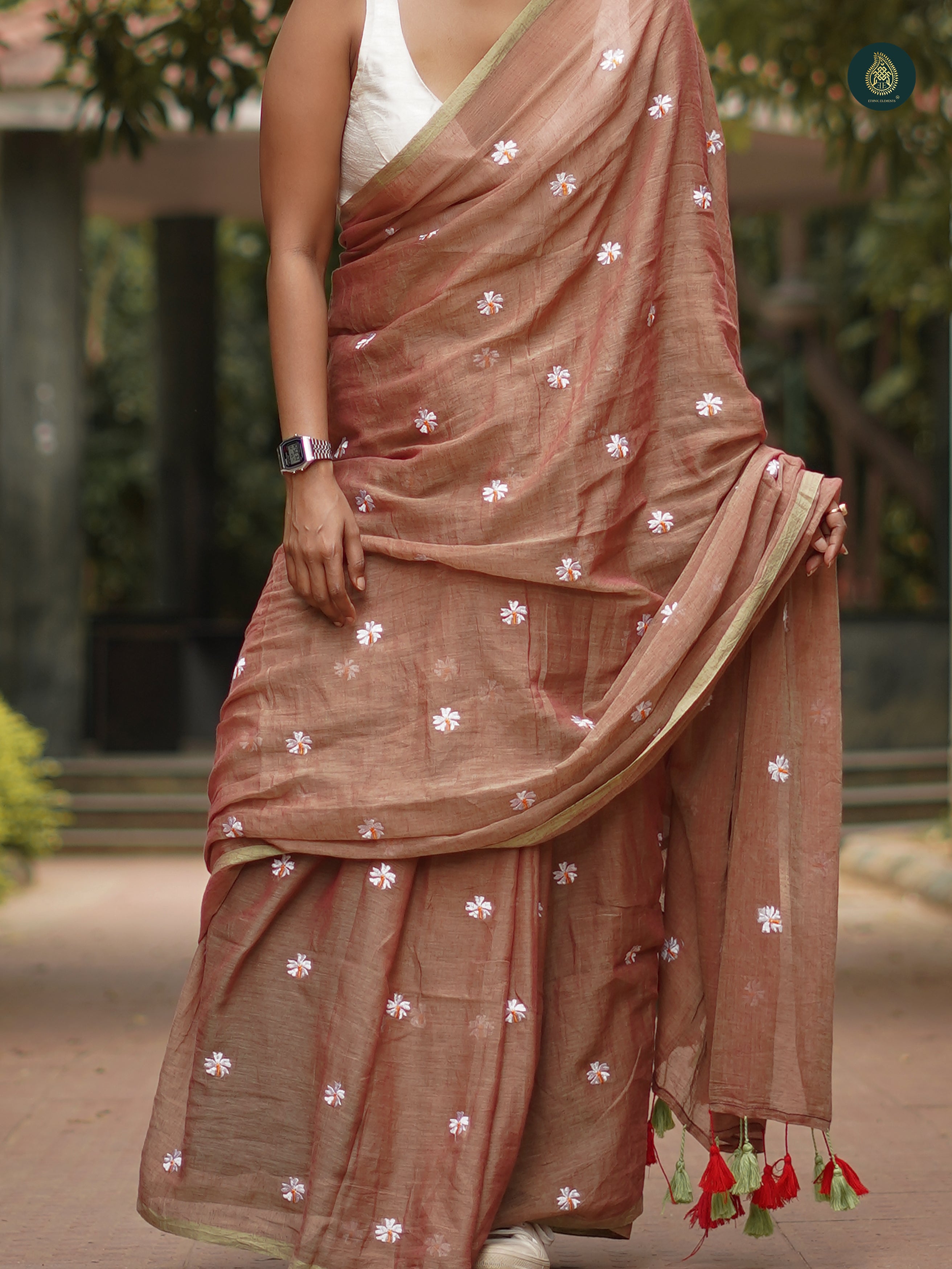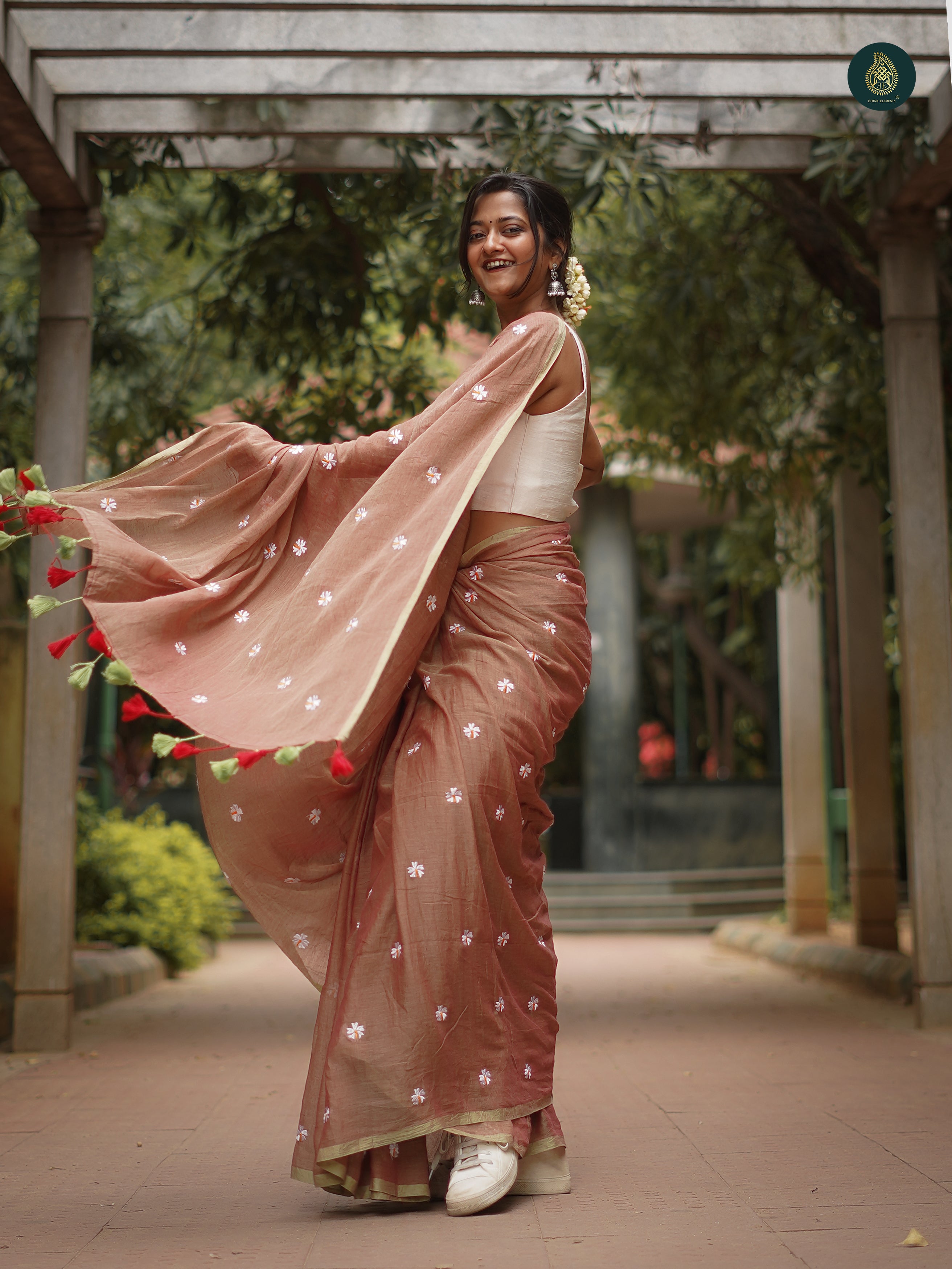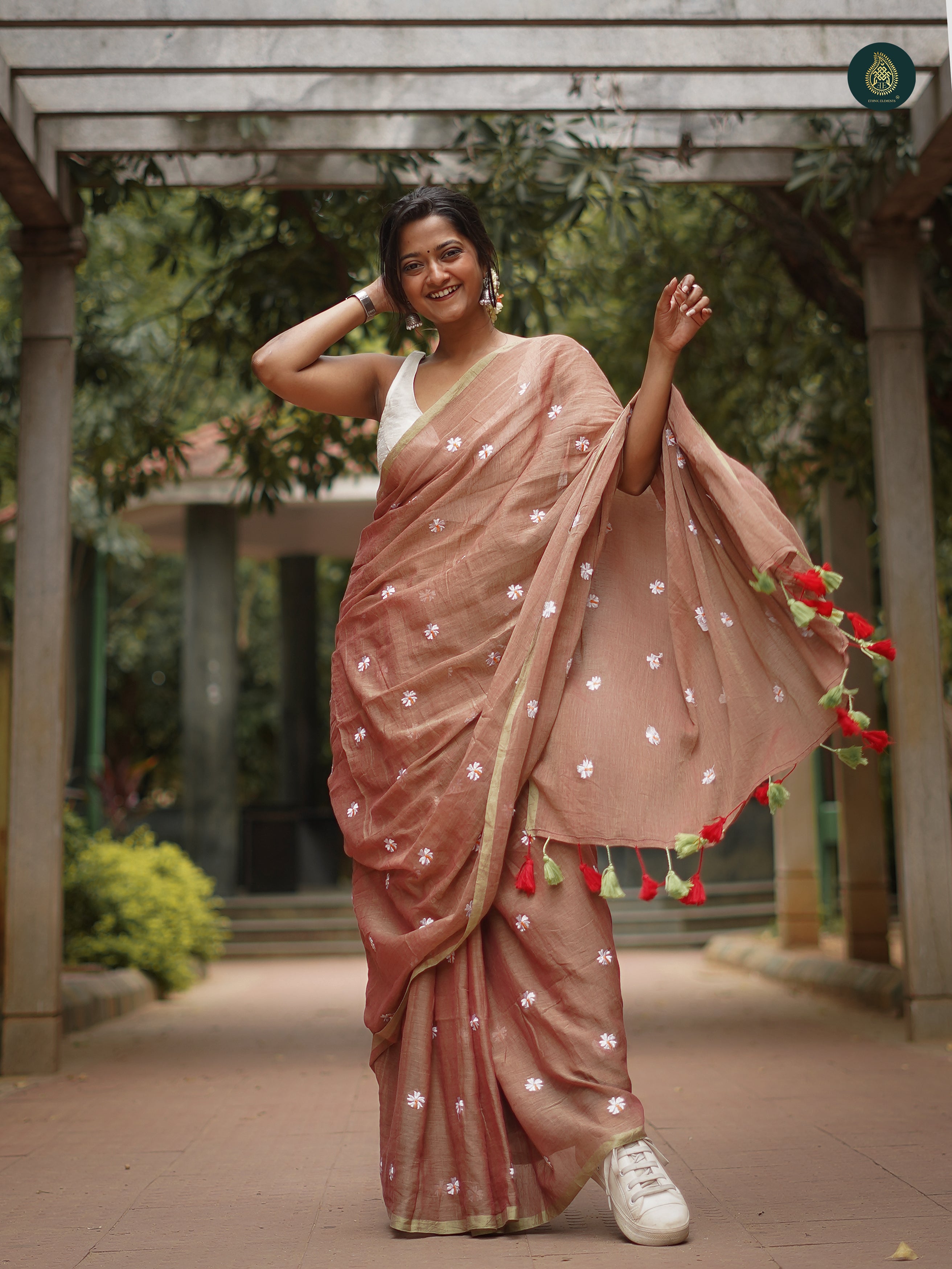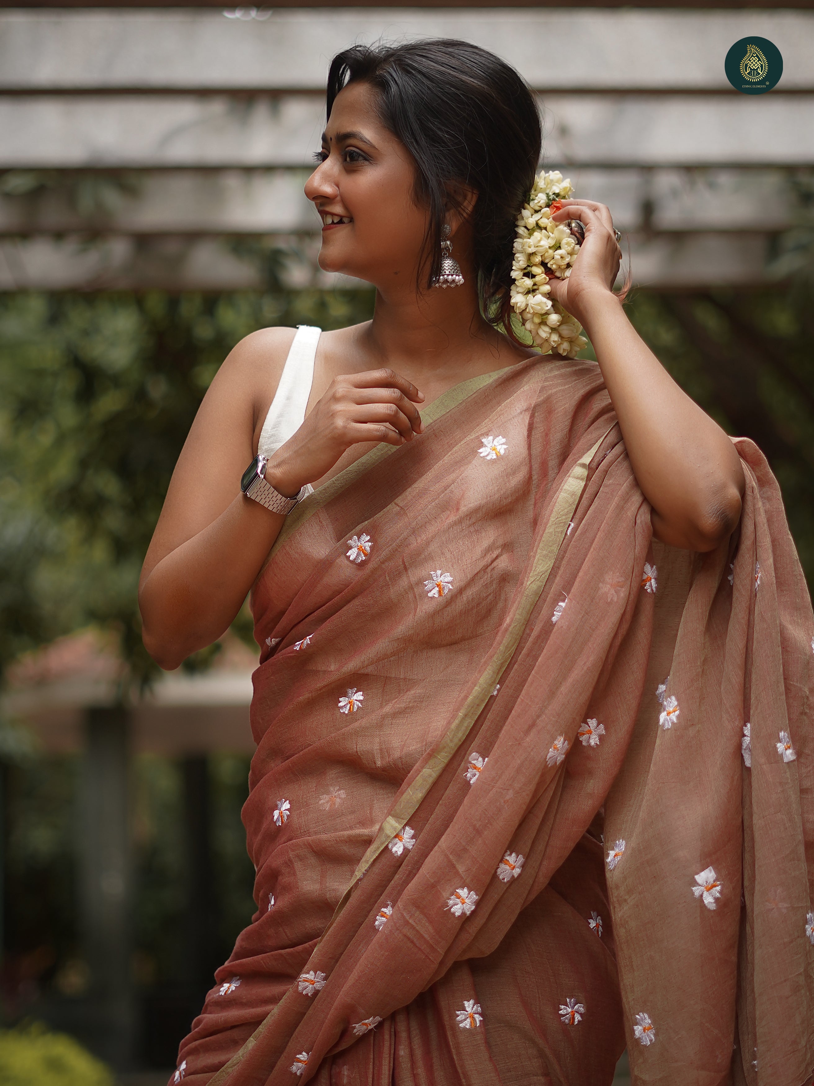 Mul Cotton Embroidered Saree - Shiuli Mocha