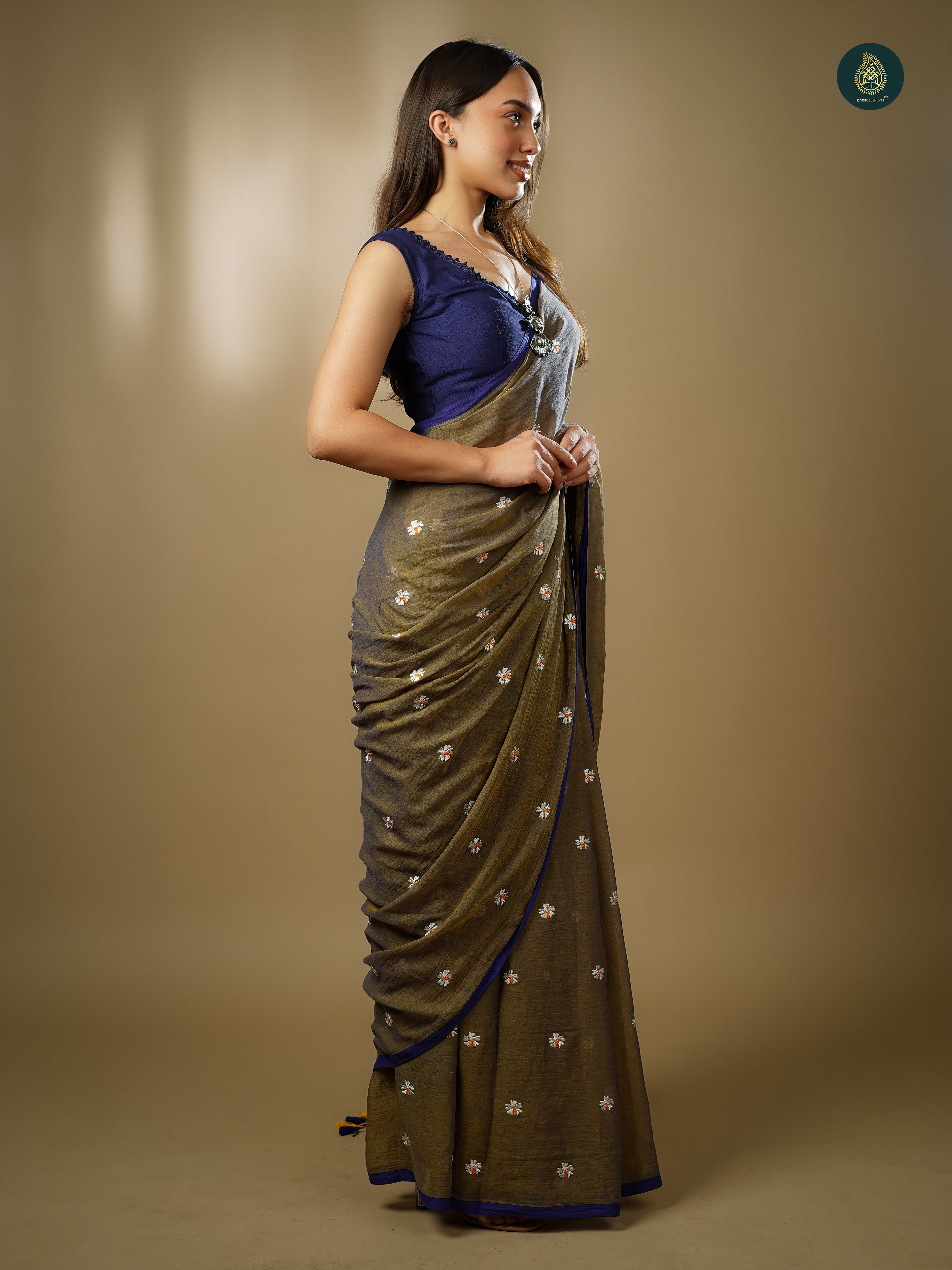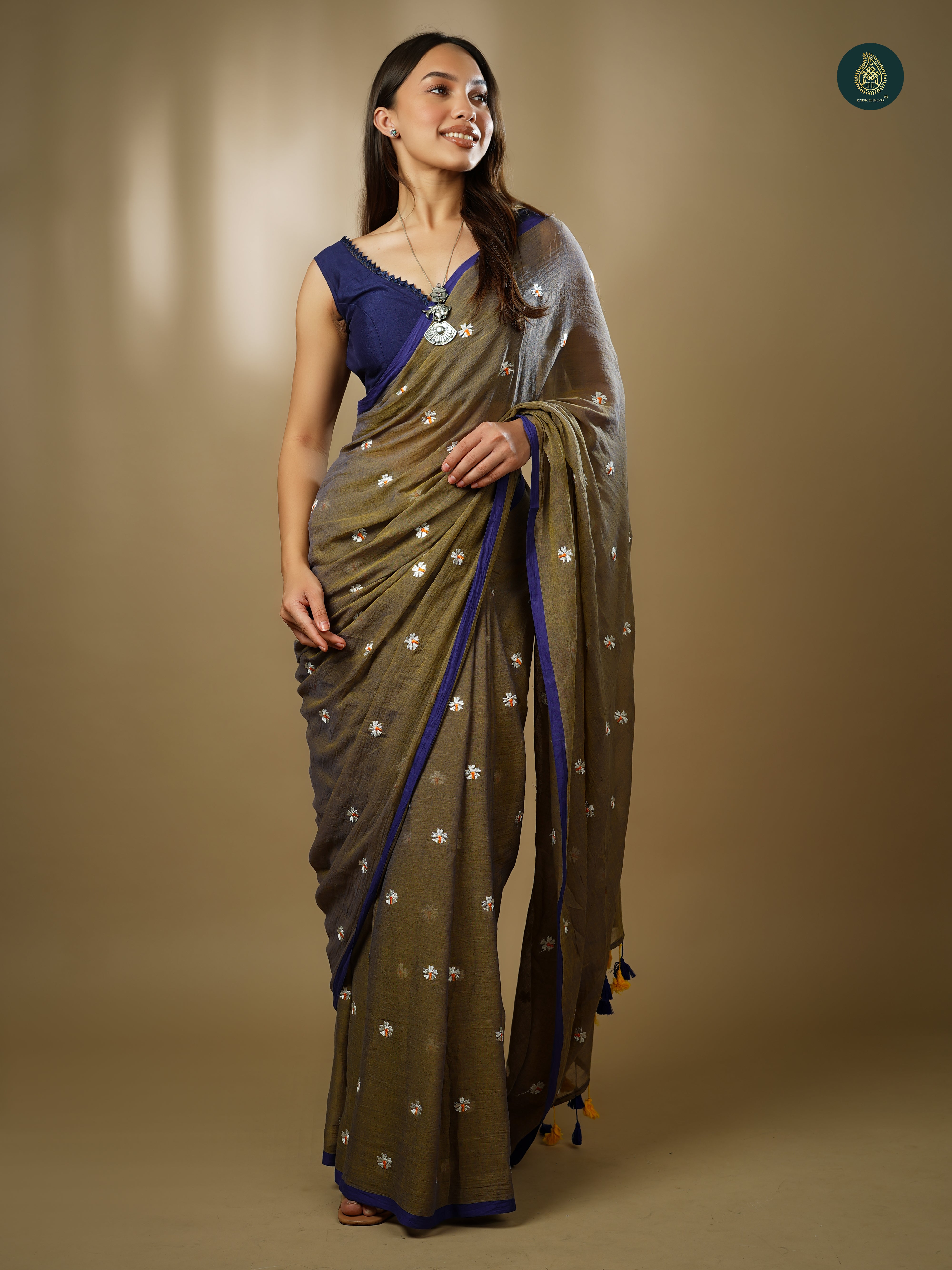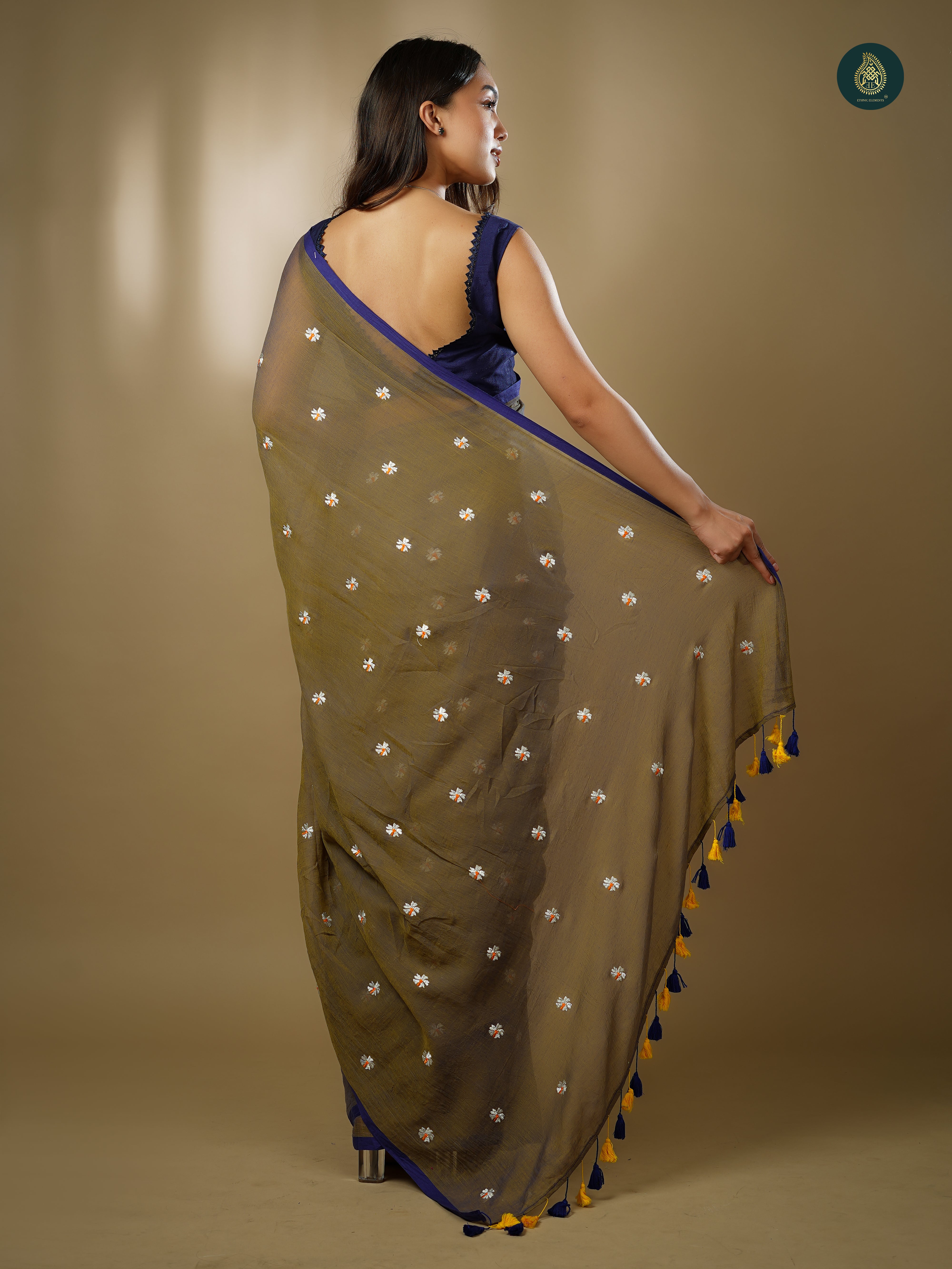 Mul Cotton Embroidered Saree - Shiuli Olive