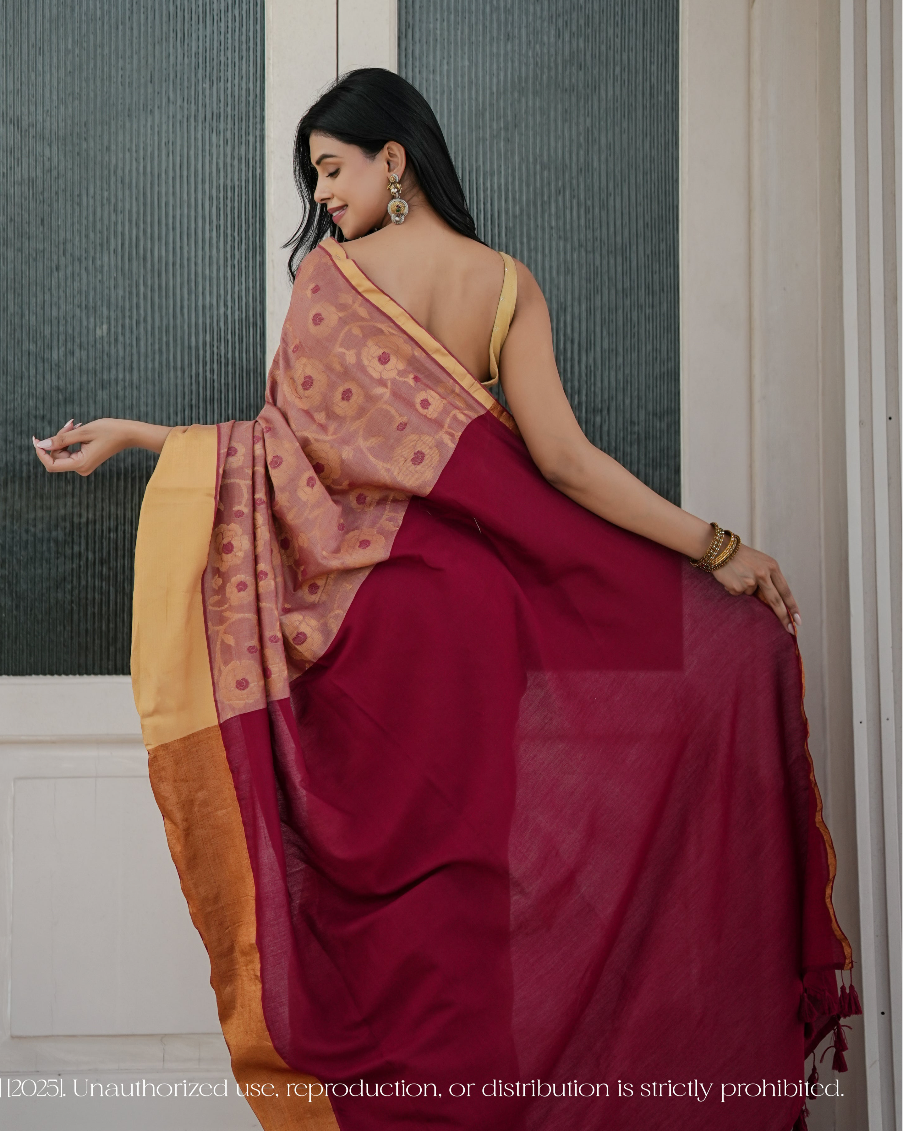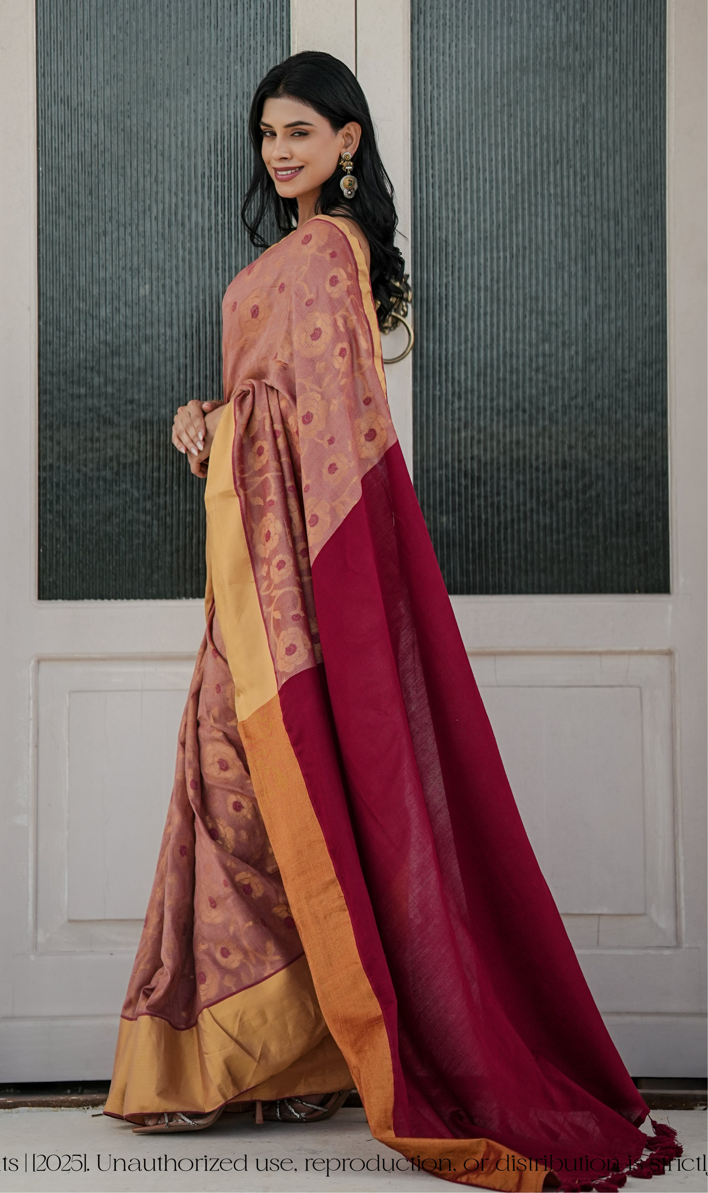 Mul Cotton Tissue Maroon and Olive-Gold Striped Saree – Garnet Panel