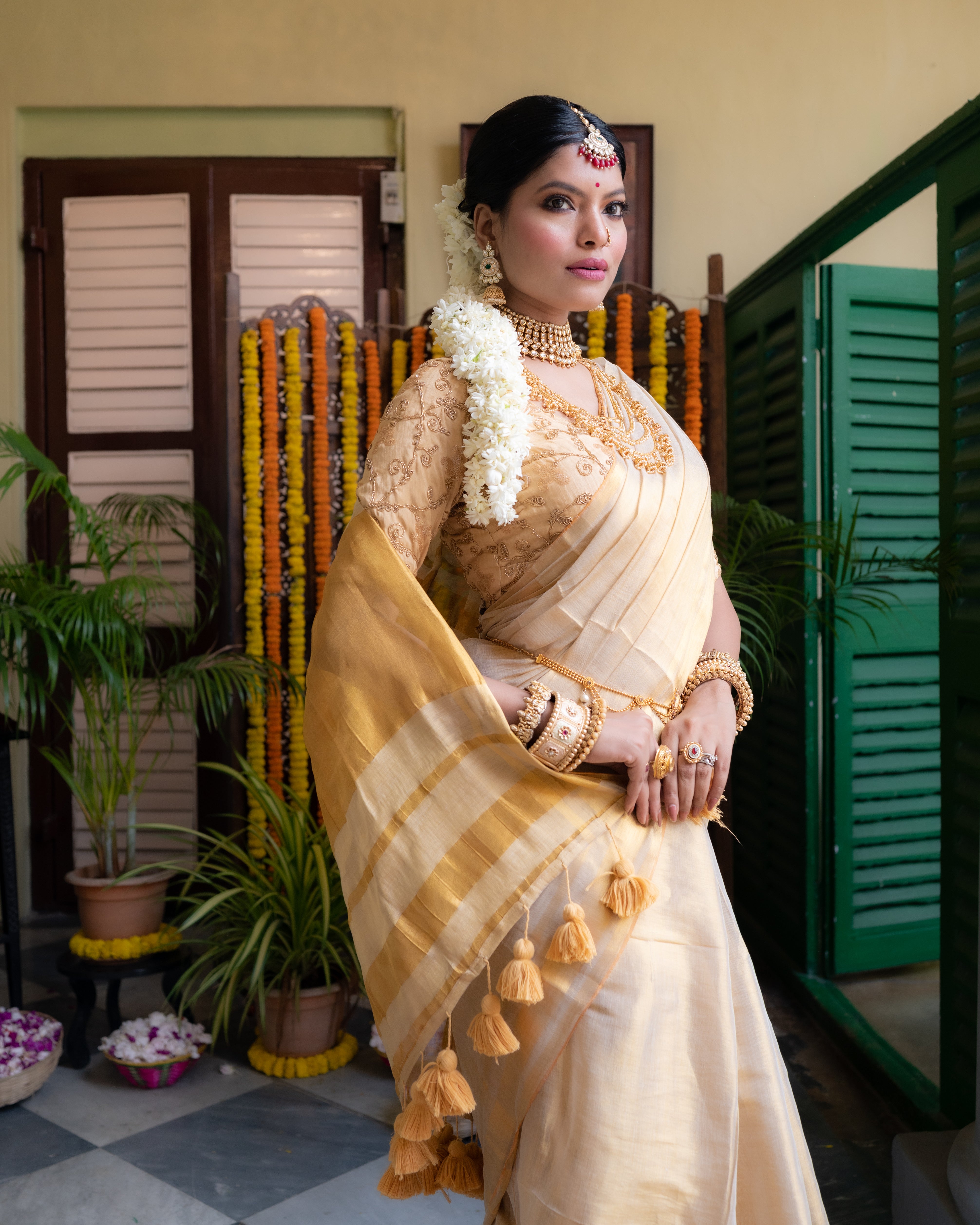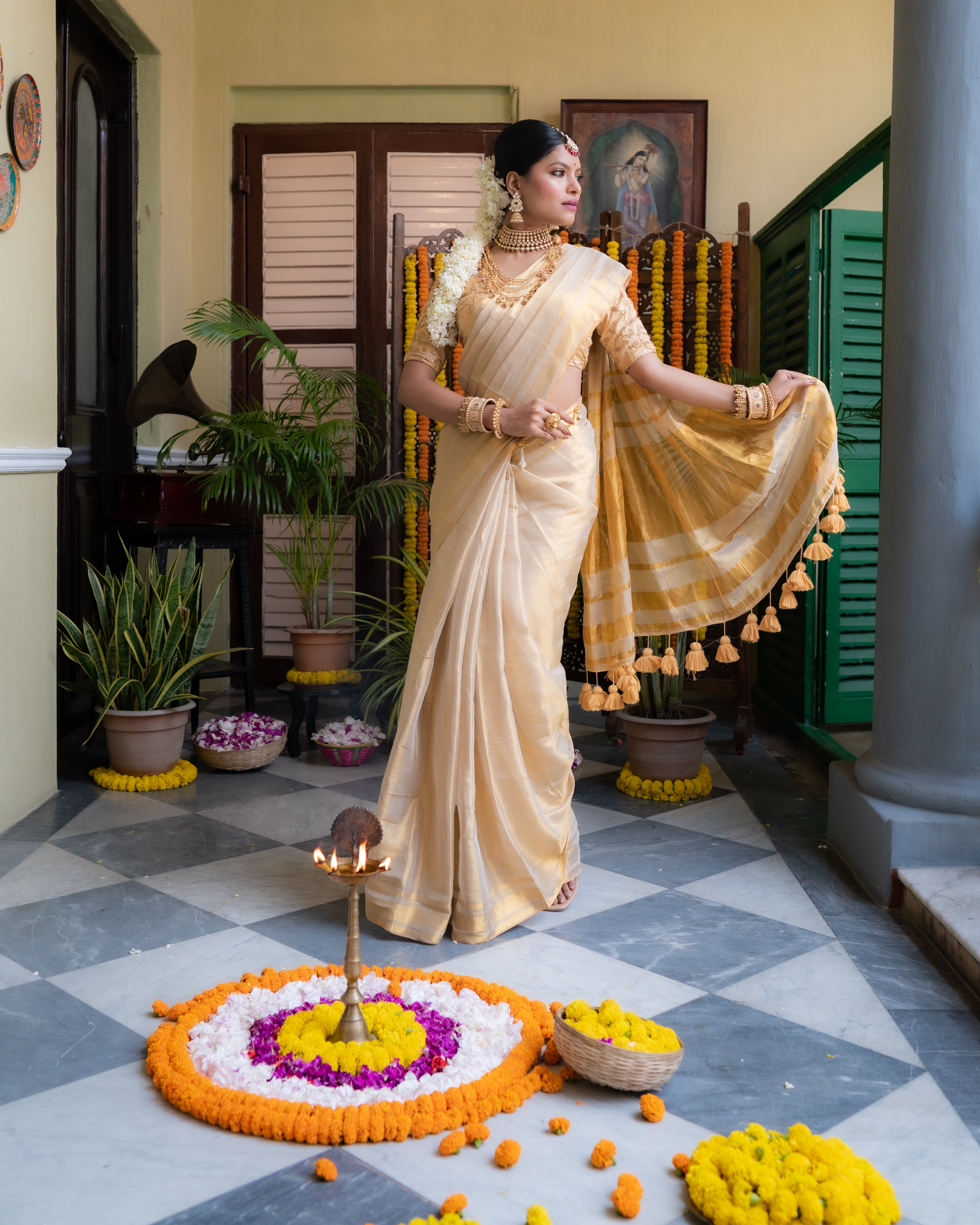 Mul Cotton Tissue Shiuli Saree- Golden Olive