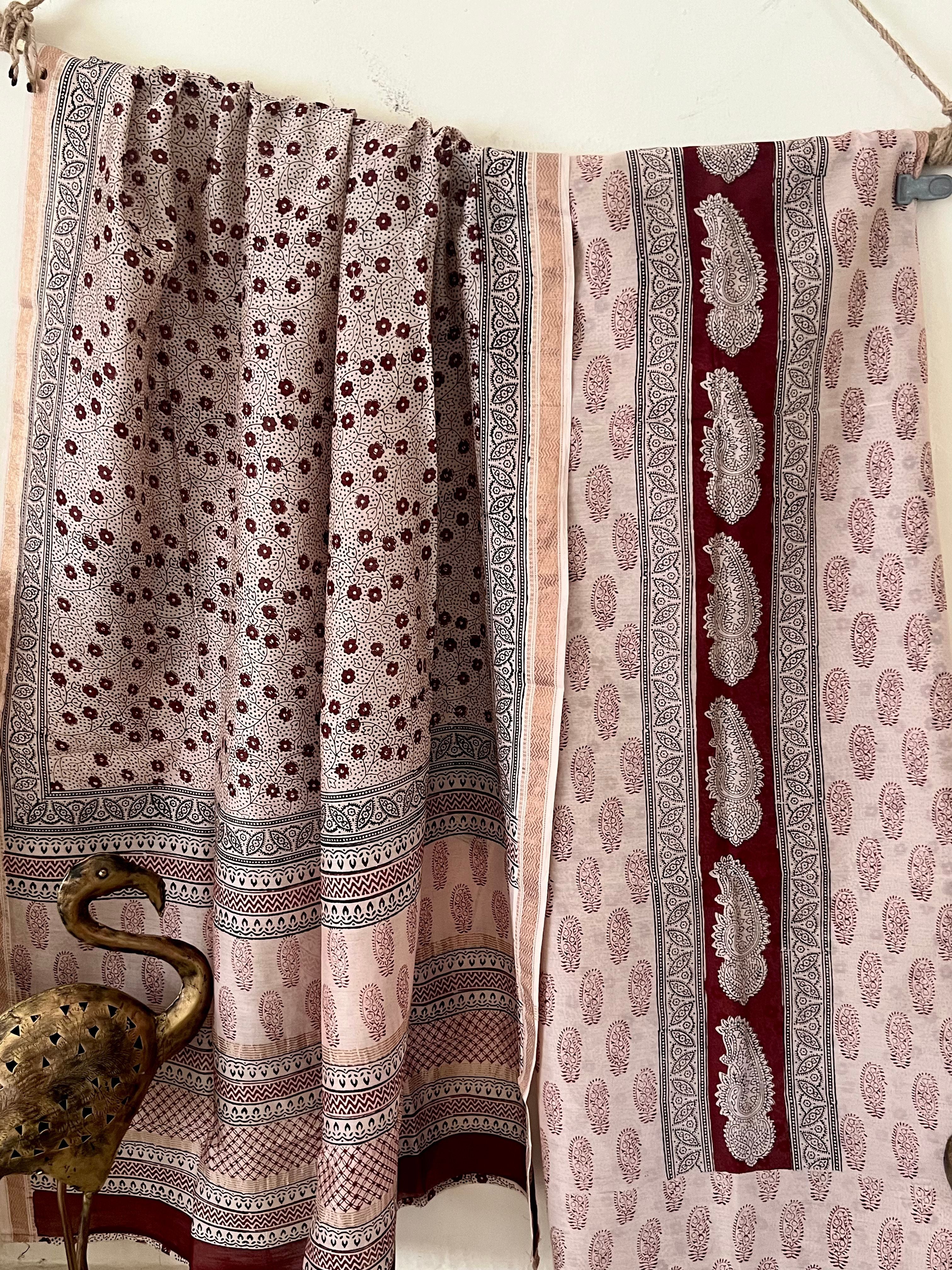 Maheshwari suit set with Bagh print. The kurta and dupatta are naturally dyed with Bagh print on them. The dupatta has tissue border. This is a 3-Pcs suit set with cotton bottoms. It is a festive wear suit set.