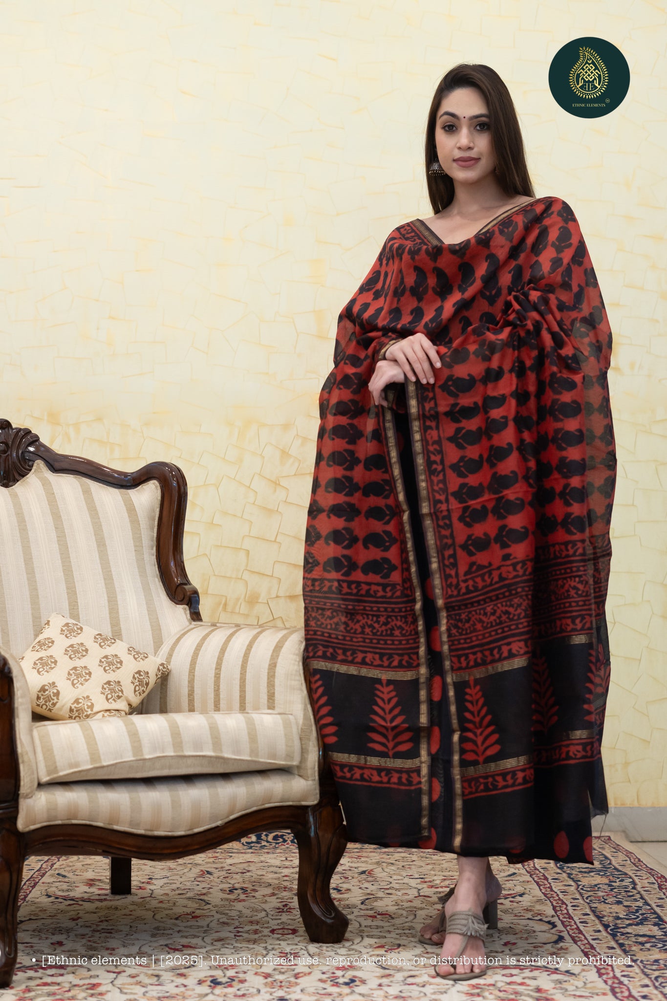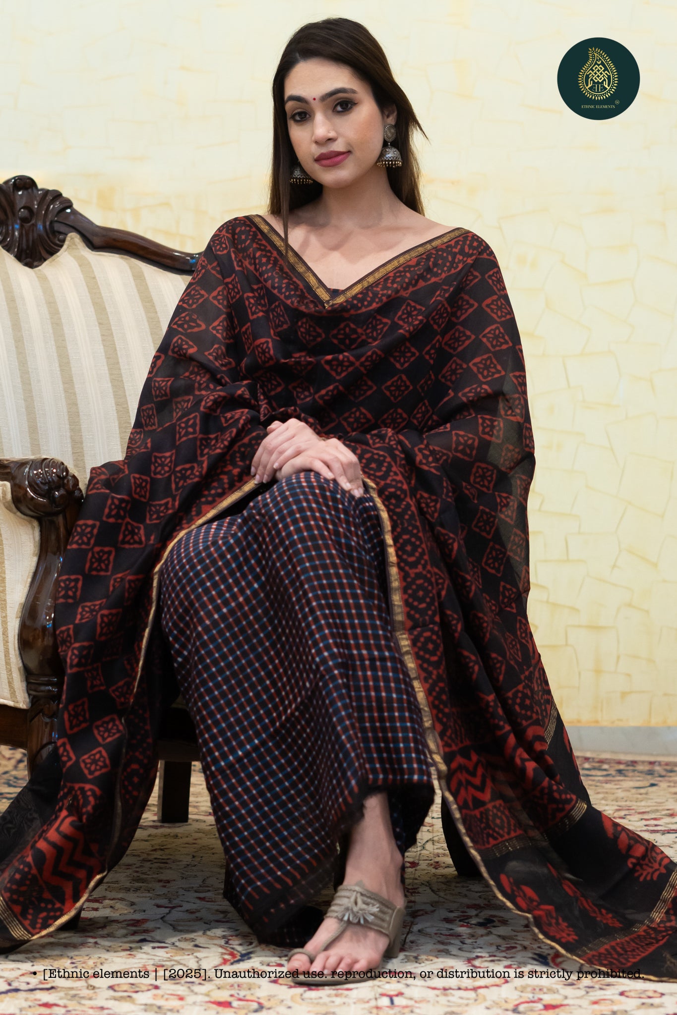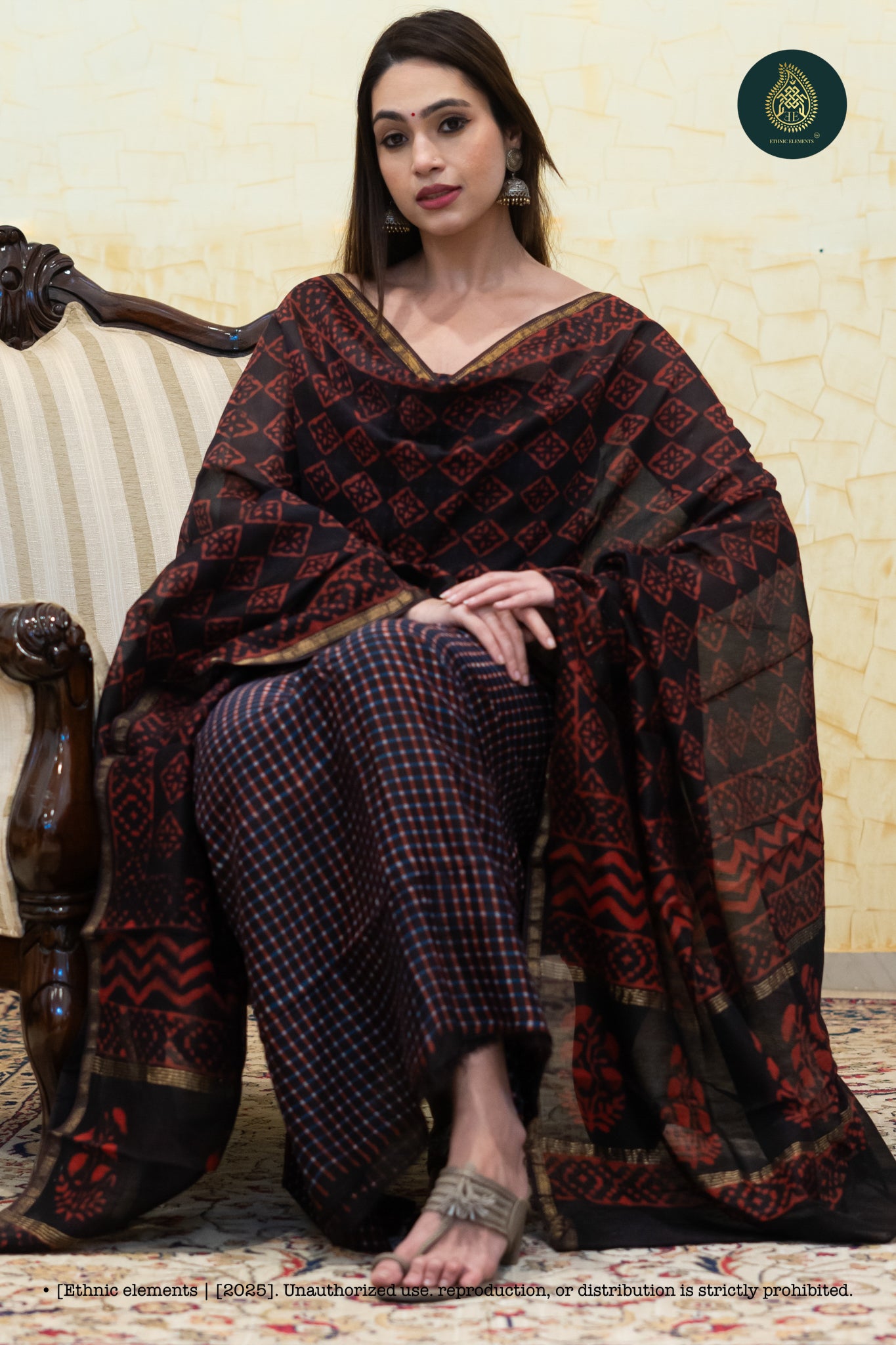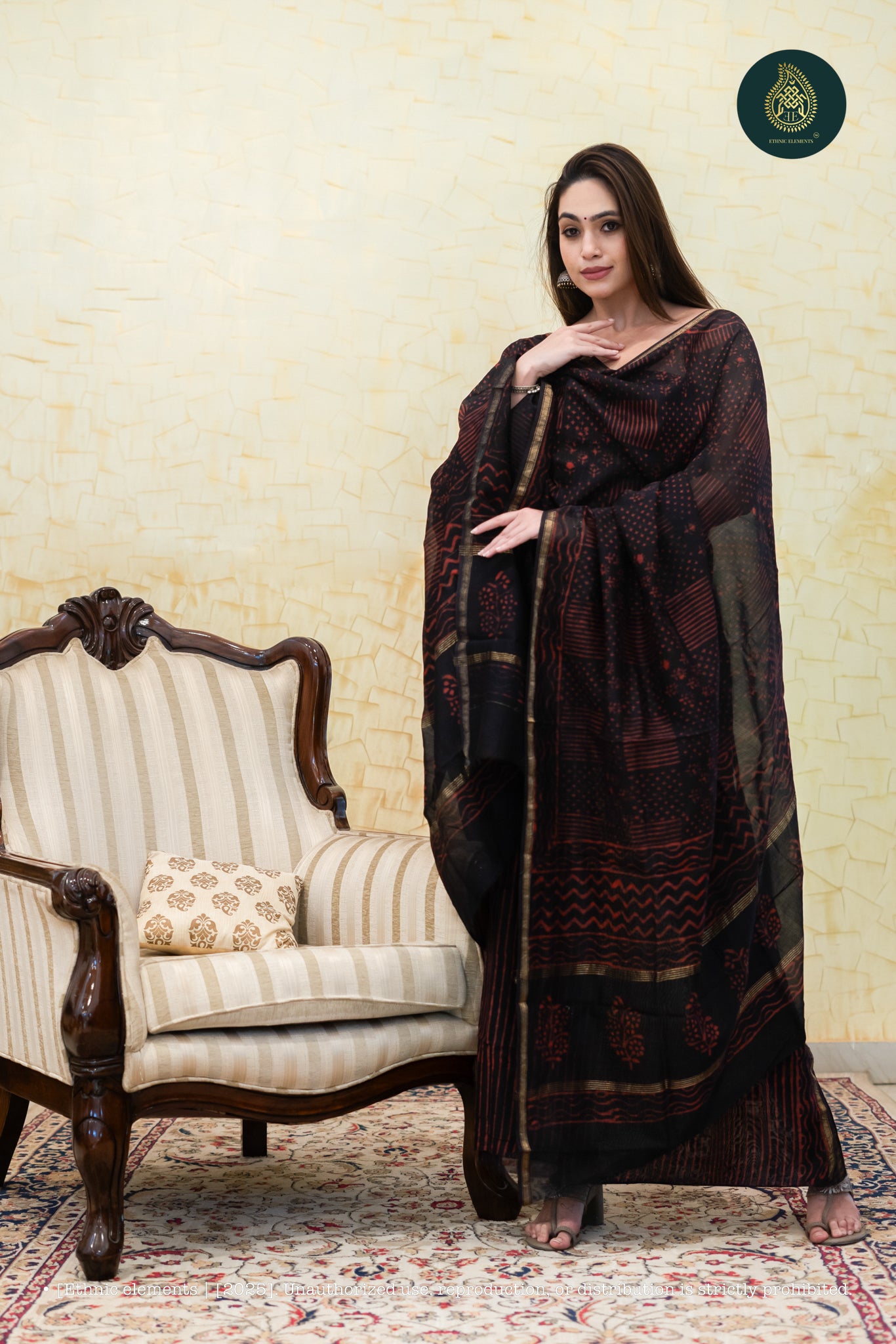 Dabu prints are a form of hand block printing done by natural colors followed by the Chippa's. A traditional sculpture in hand-block printing is made by using a mud-resist material created by a mixture of desert sands called "Dabu”. This unique art is used to leave effects as mud-colored block prints on fabric.