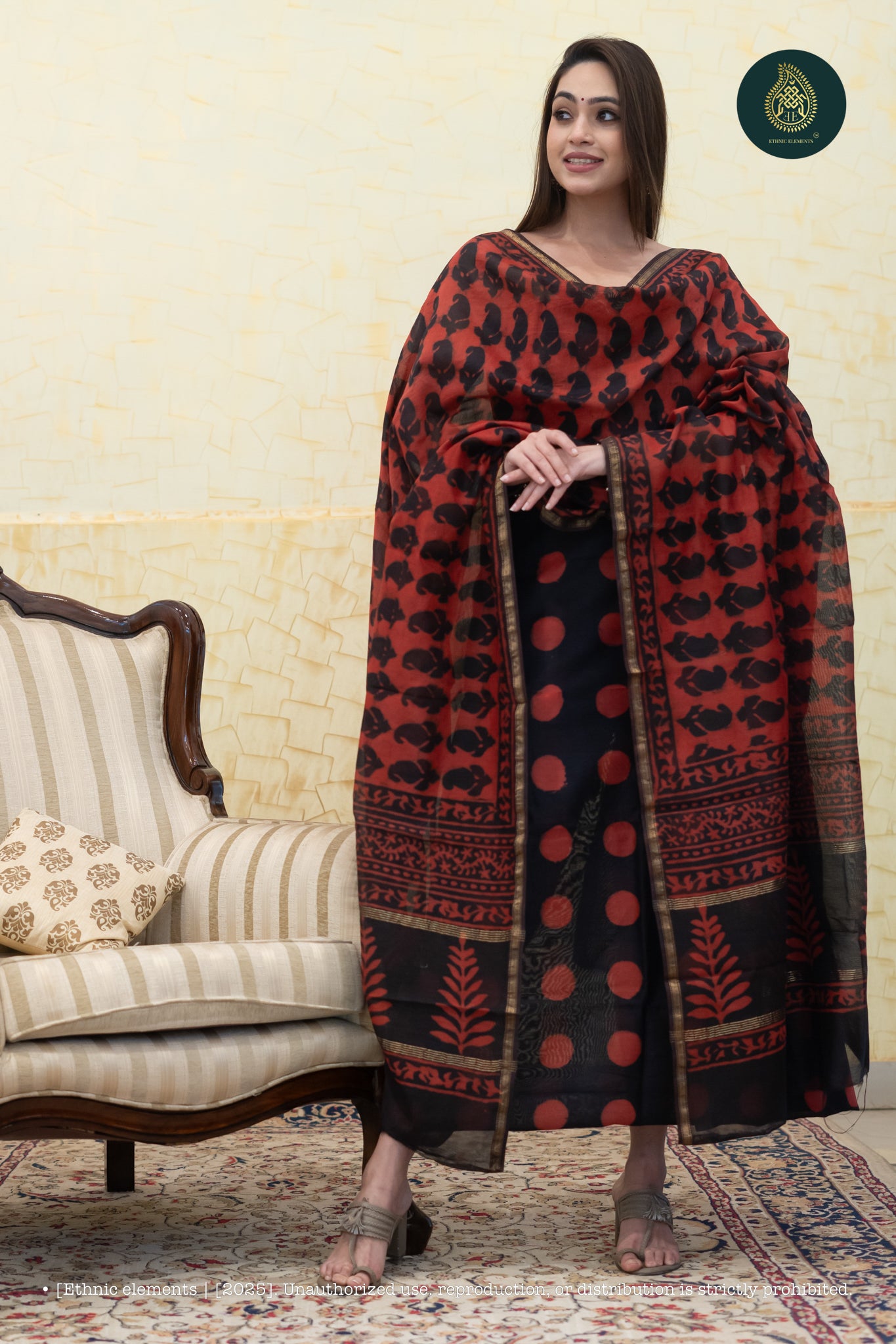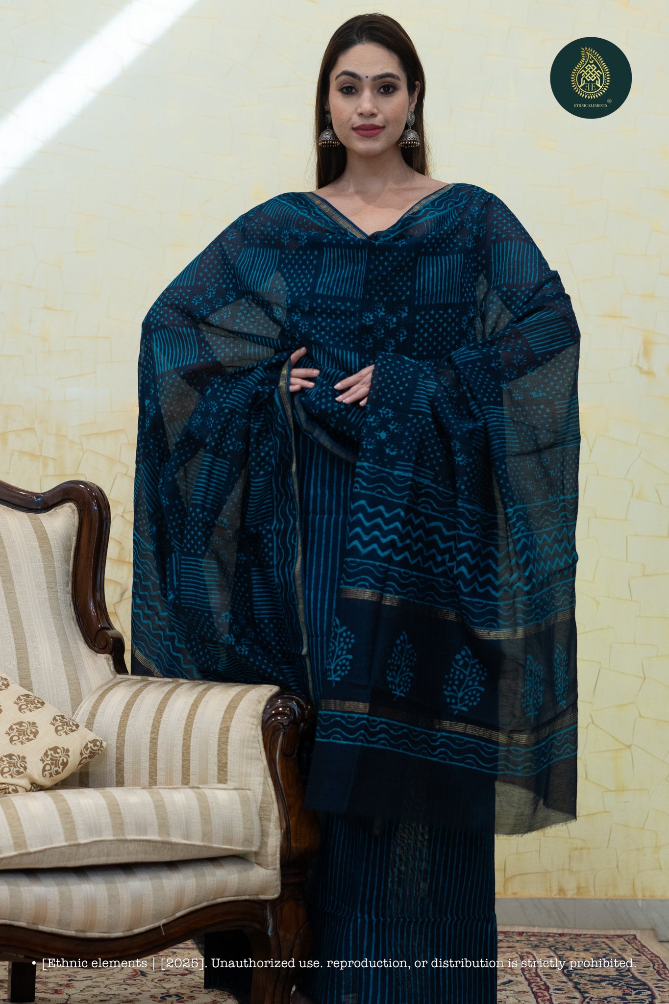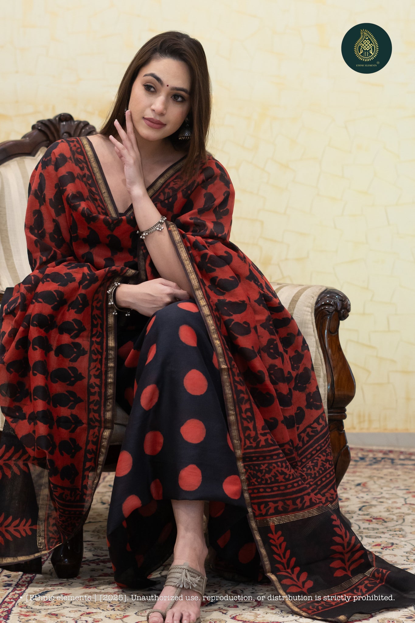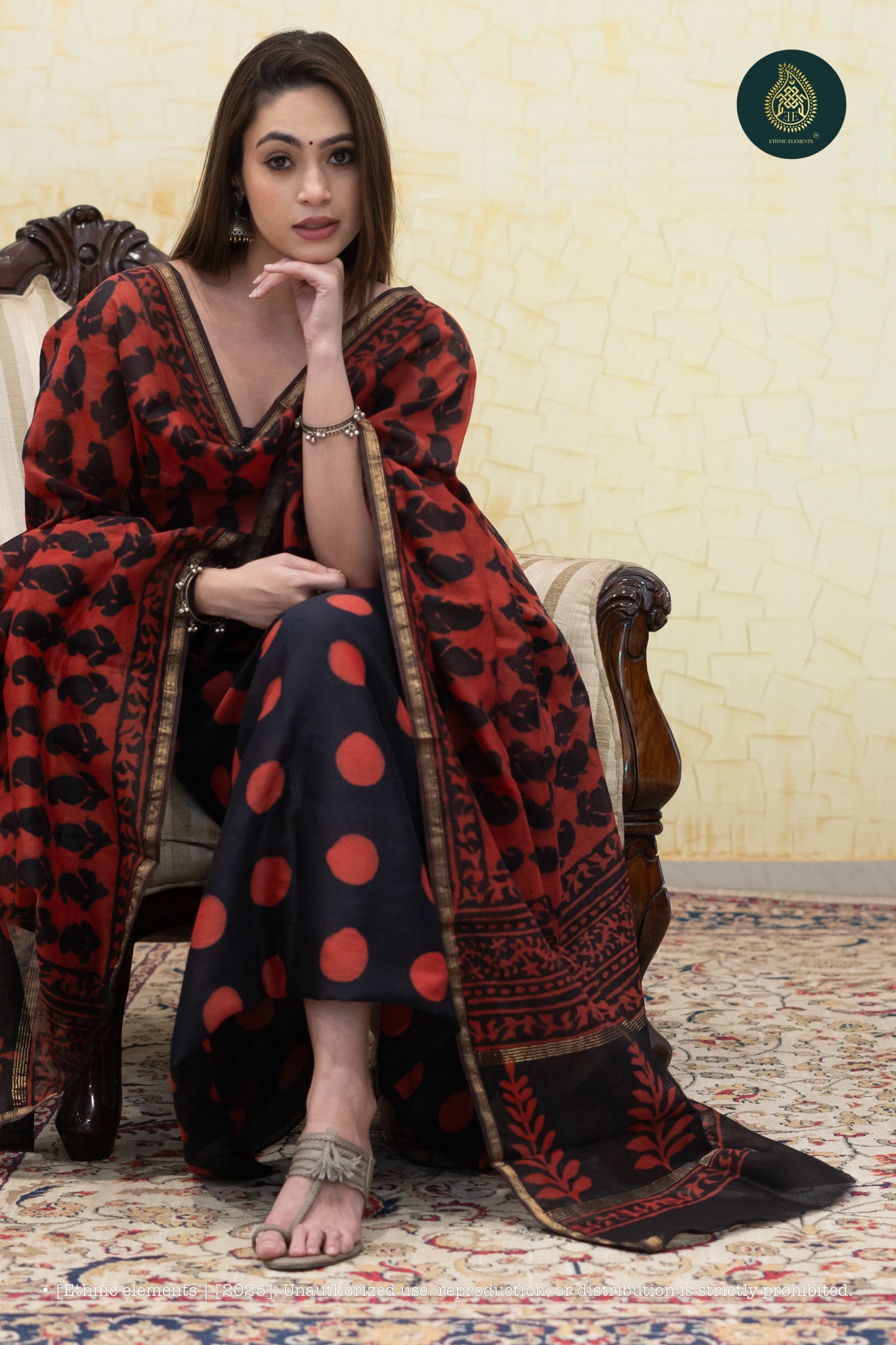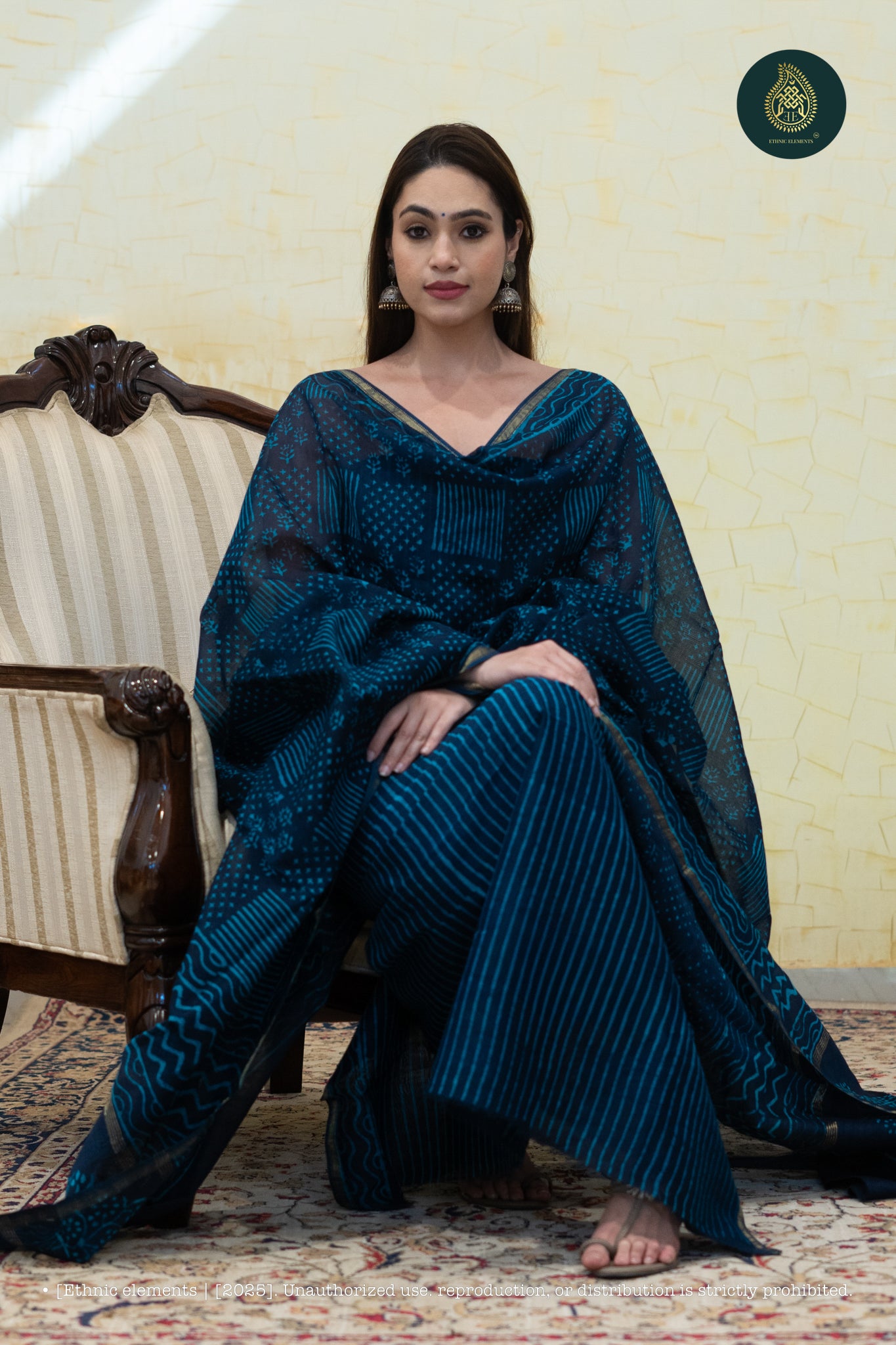 Dabu prints are a form of hand block printing done by natural colors followed by the Chippa's. A traditional sculpture in hand-block printing is made by using a mud-resist material created by a mixture of desert sands called "Dabu”. This unique art is used to leave effects as mud-colored block prints on fabric.