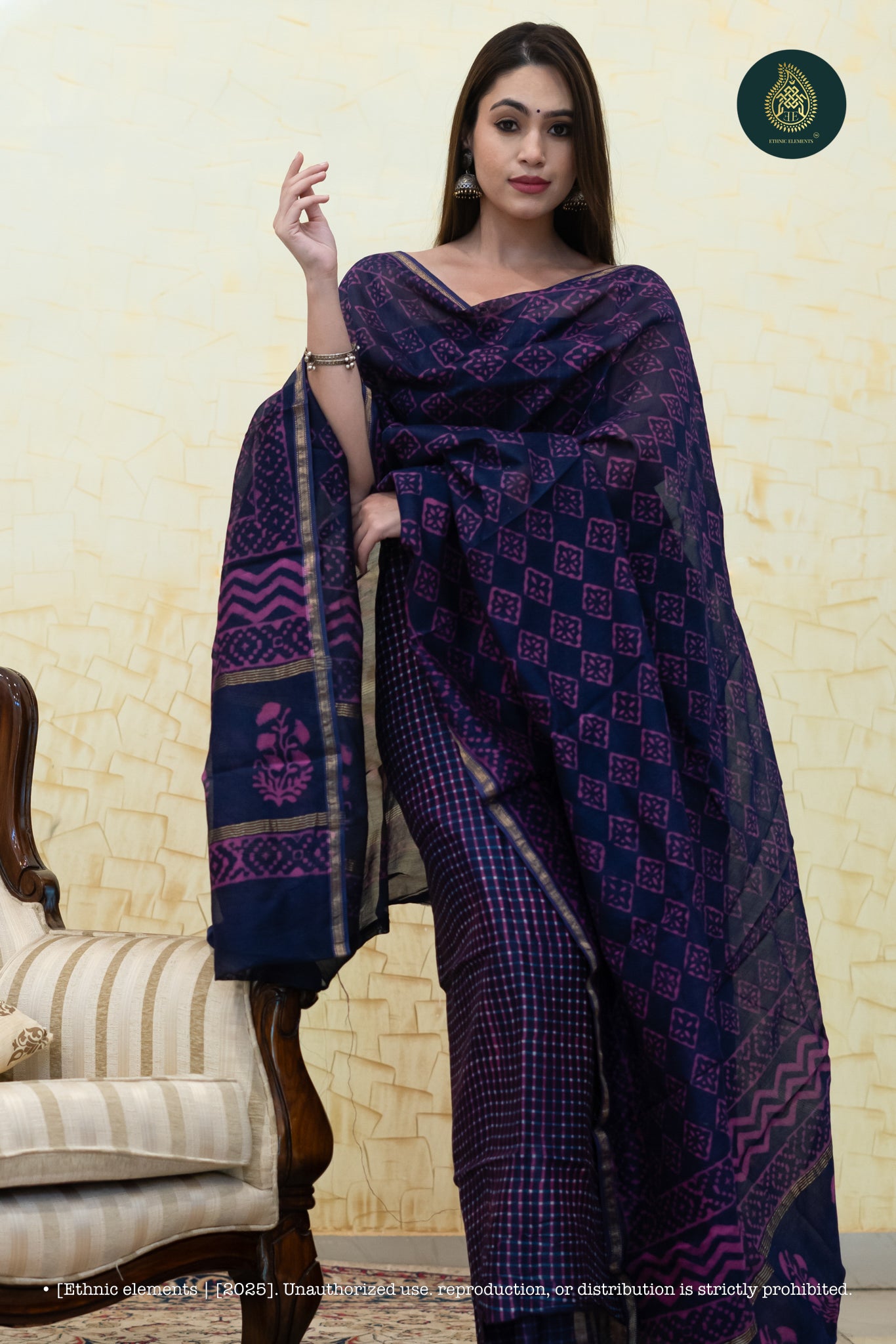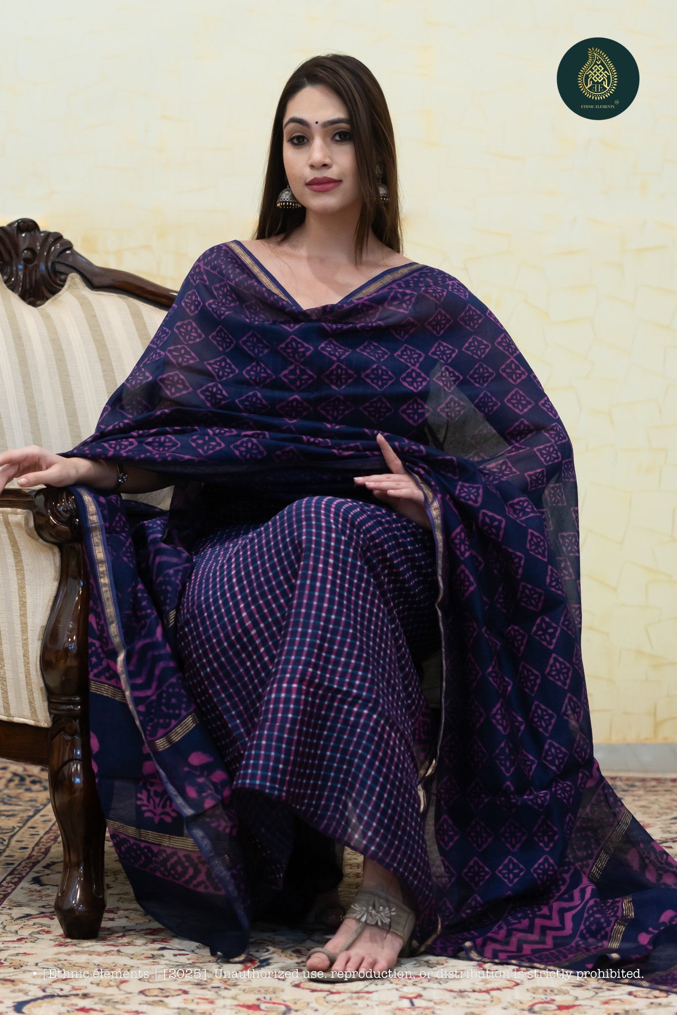 This Maheswari Dabu Print 3-piece unstitched suit set blends traditional handblock prints with luxurious Maheswari fabric. Dyed with natural colors, it offers a soft, eco-friendly feel. The set includes a premium Maheswari Dabu handblock printed kurta, bottom, and a dupatta with zari borders, perfect for those who appreciate timeless ethnic wear.
