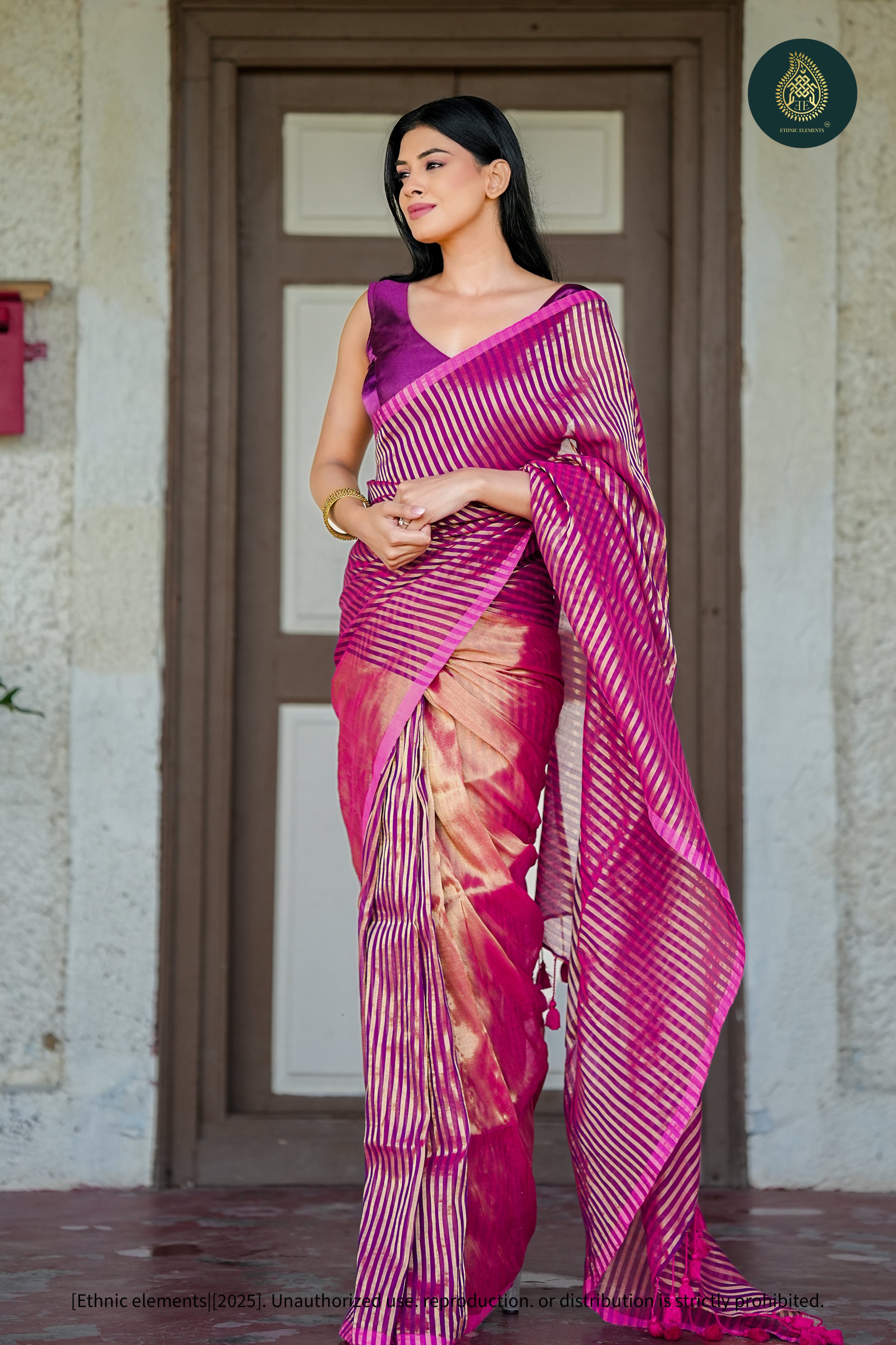 - Pattern: Solid wine body with gold-striped pallu and pleats