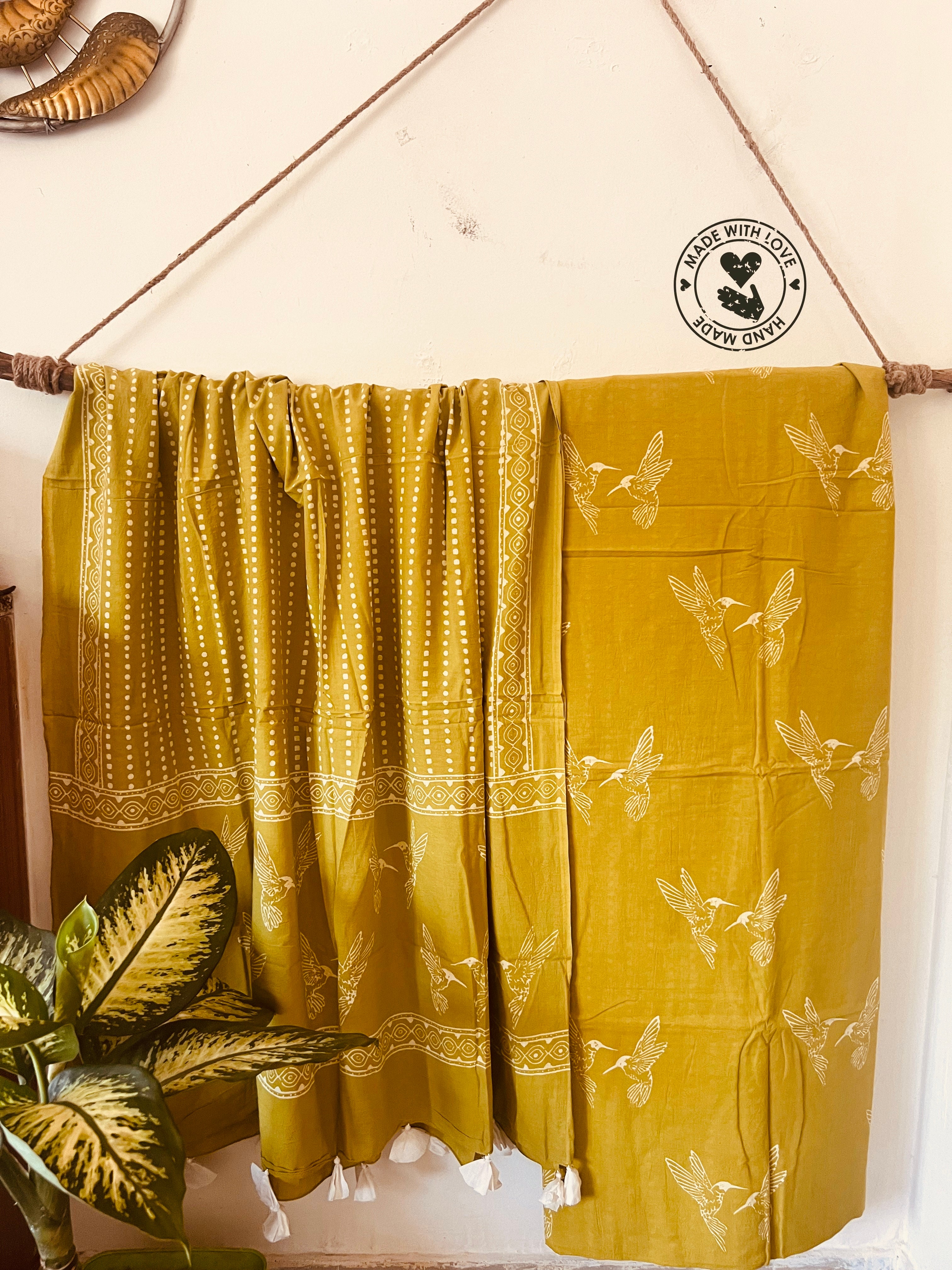 Monochrome hand-block printed 3-Pcs suit set. All the three fabrics - kurta, dupatta and bottoms are naturally dyed using organic colors. All the fabrics are woven cotton. Dupatta has hand-made tassels on both sides. The tassels too are made of cotton. No synthetic material is used anywhere in the suit set. Hand-block prints are made using wooden stencils in the old fashioned way.