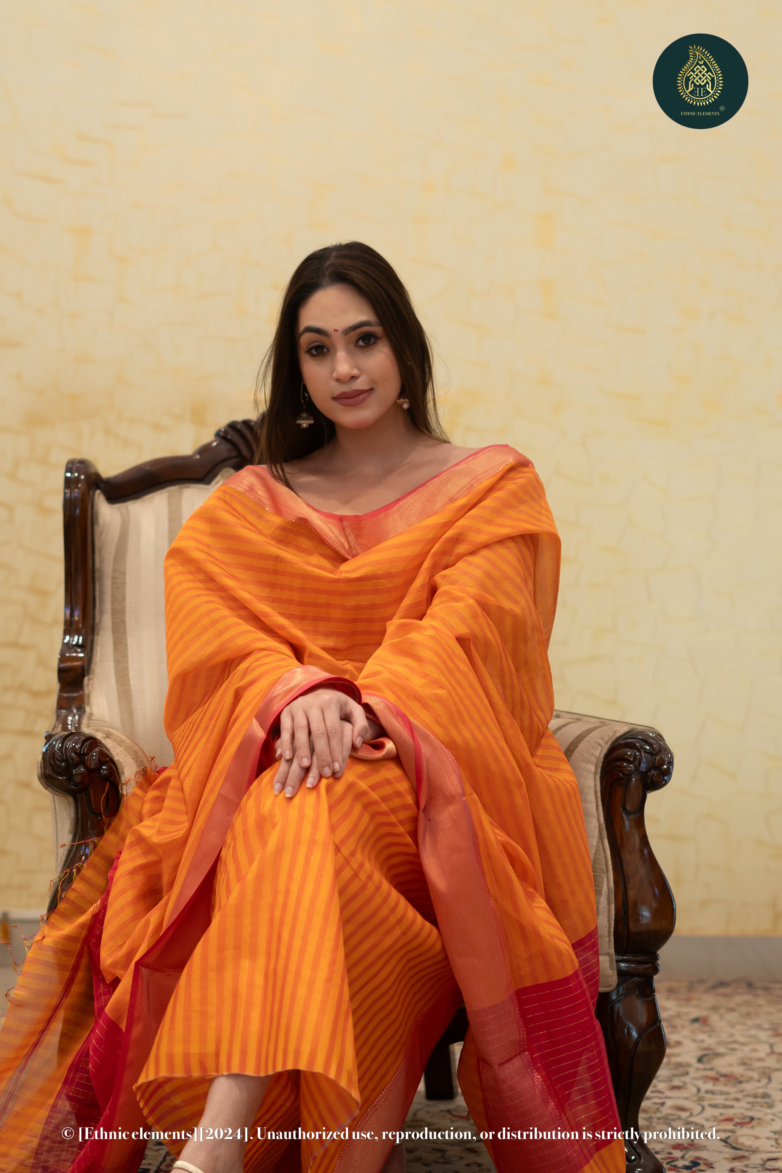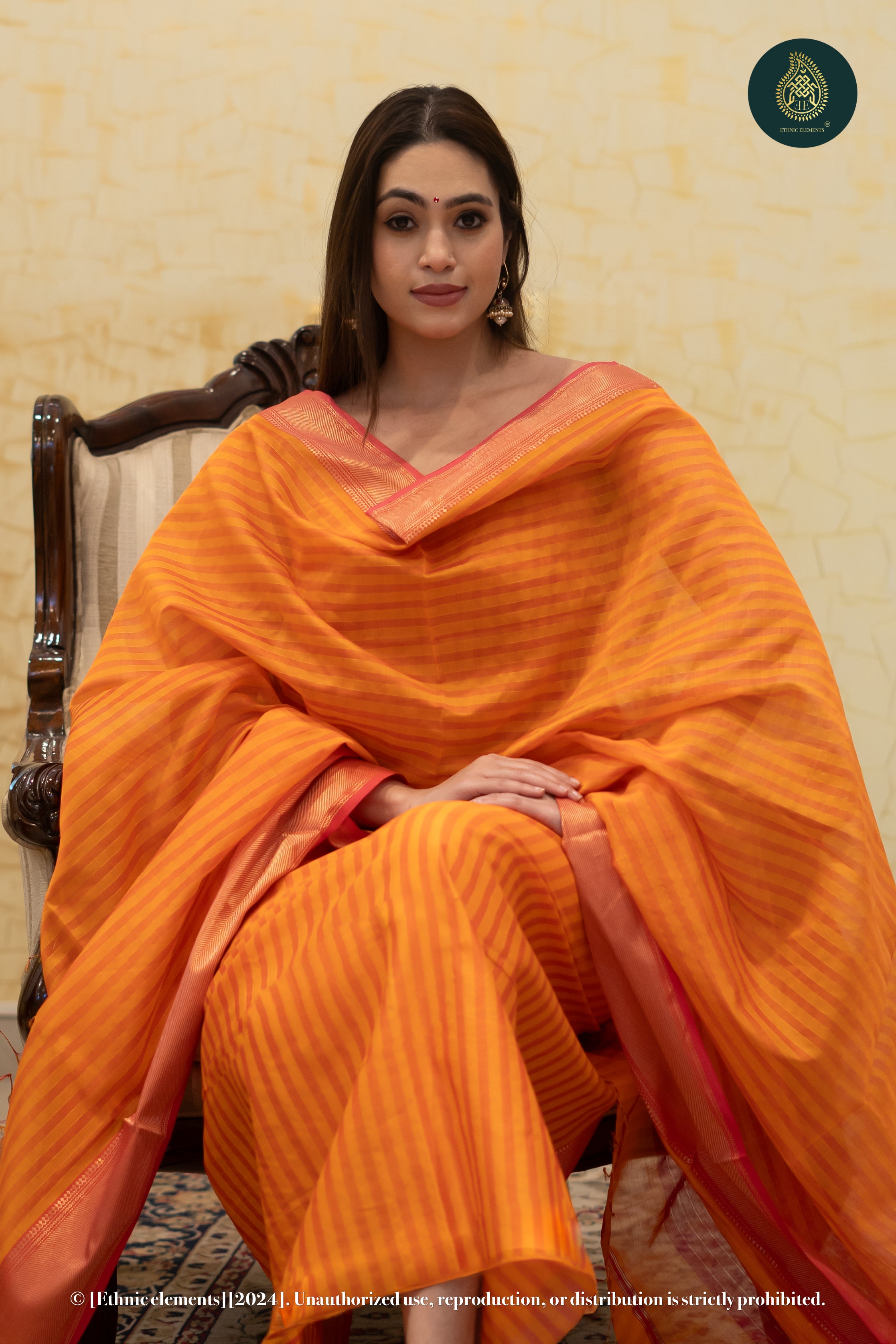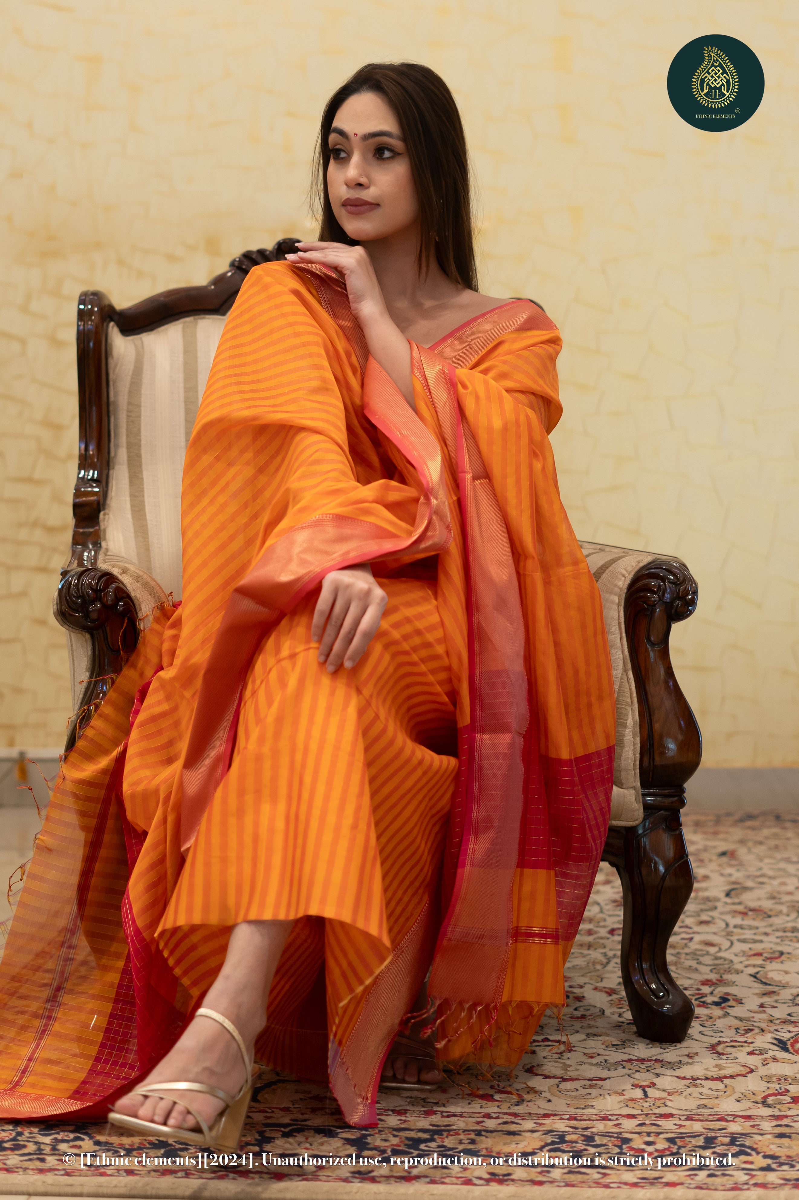 Presenting our exquisite unstitched Handwoven Maheshwari Silk Suit Set, a perfect blend of heritage and modern style. Crafted from lightweight, handwoven Maheshwari silk, this set is designed to offer comfort while radiating elegance. The subtle sheen and intricate stripe patterns add an air of sophistication, making it a versatile choice for both festive occasions and everyday wear.