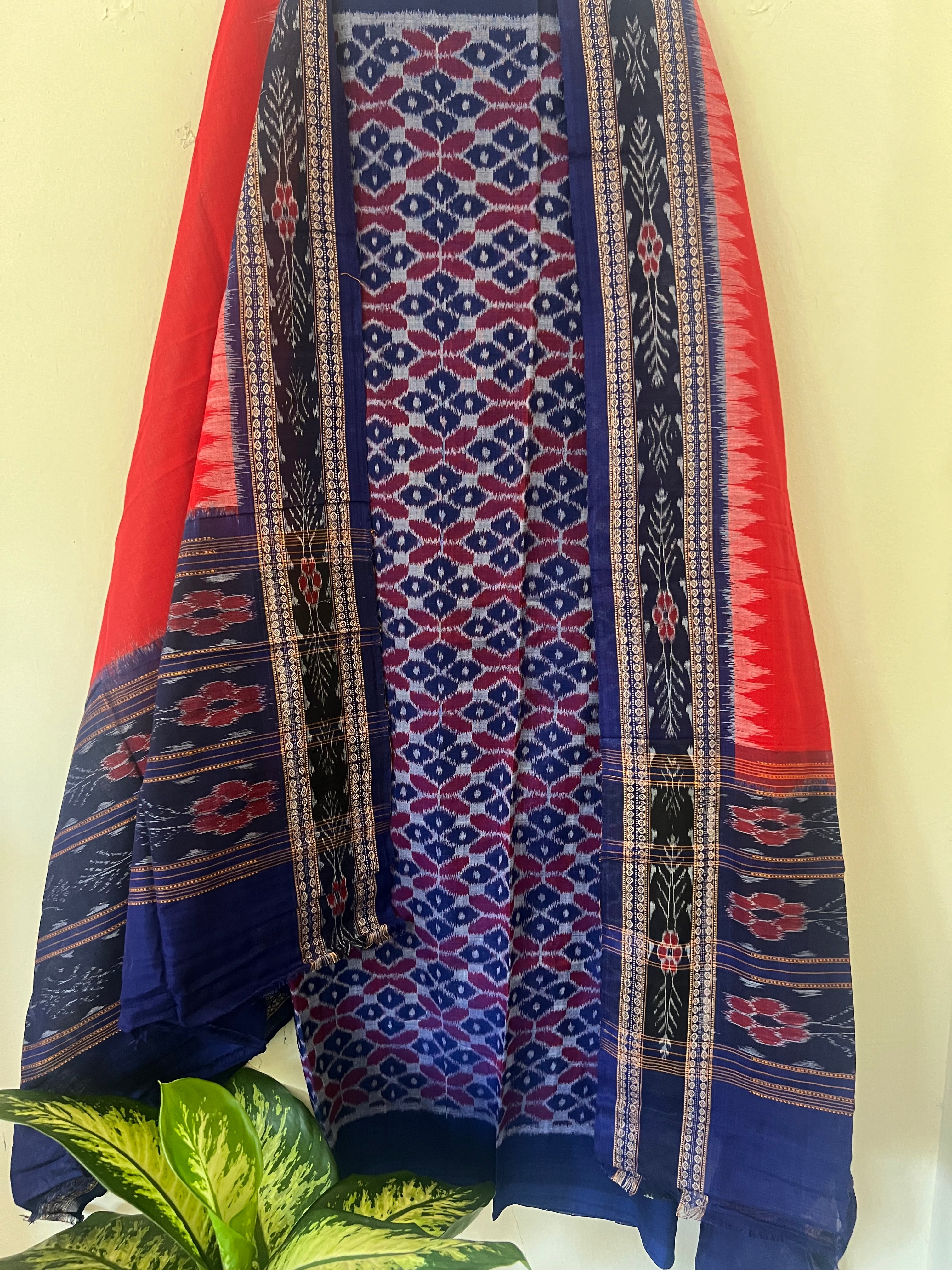 Sambalpuri Ikkat 3-Pcs Suit Set. Humble Odisha Tie and Dye dress material with Gudia/doll woven design. Uplift your soul and make everyone gasp in wonder. Yes, that's the power of Odisha Ikat Yardages!