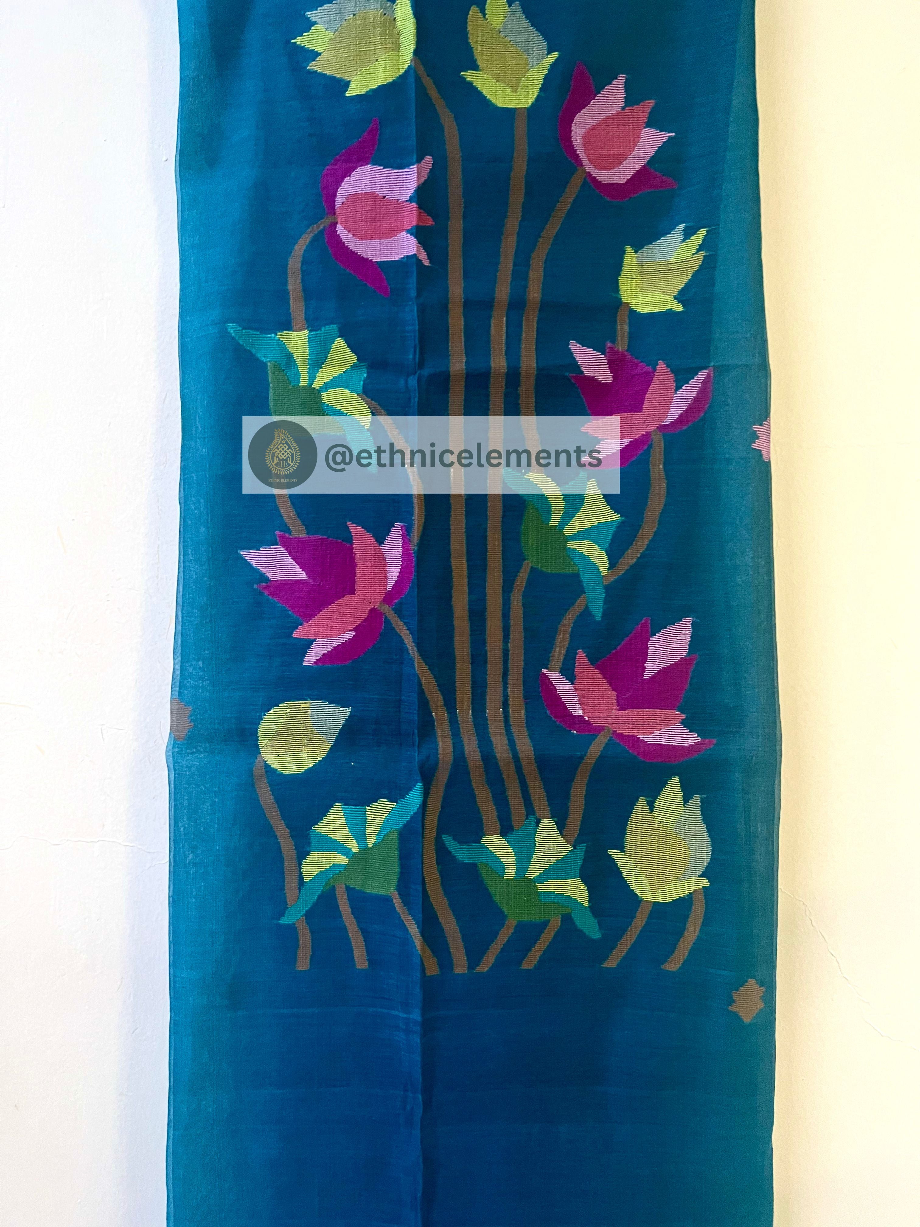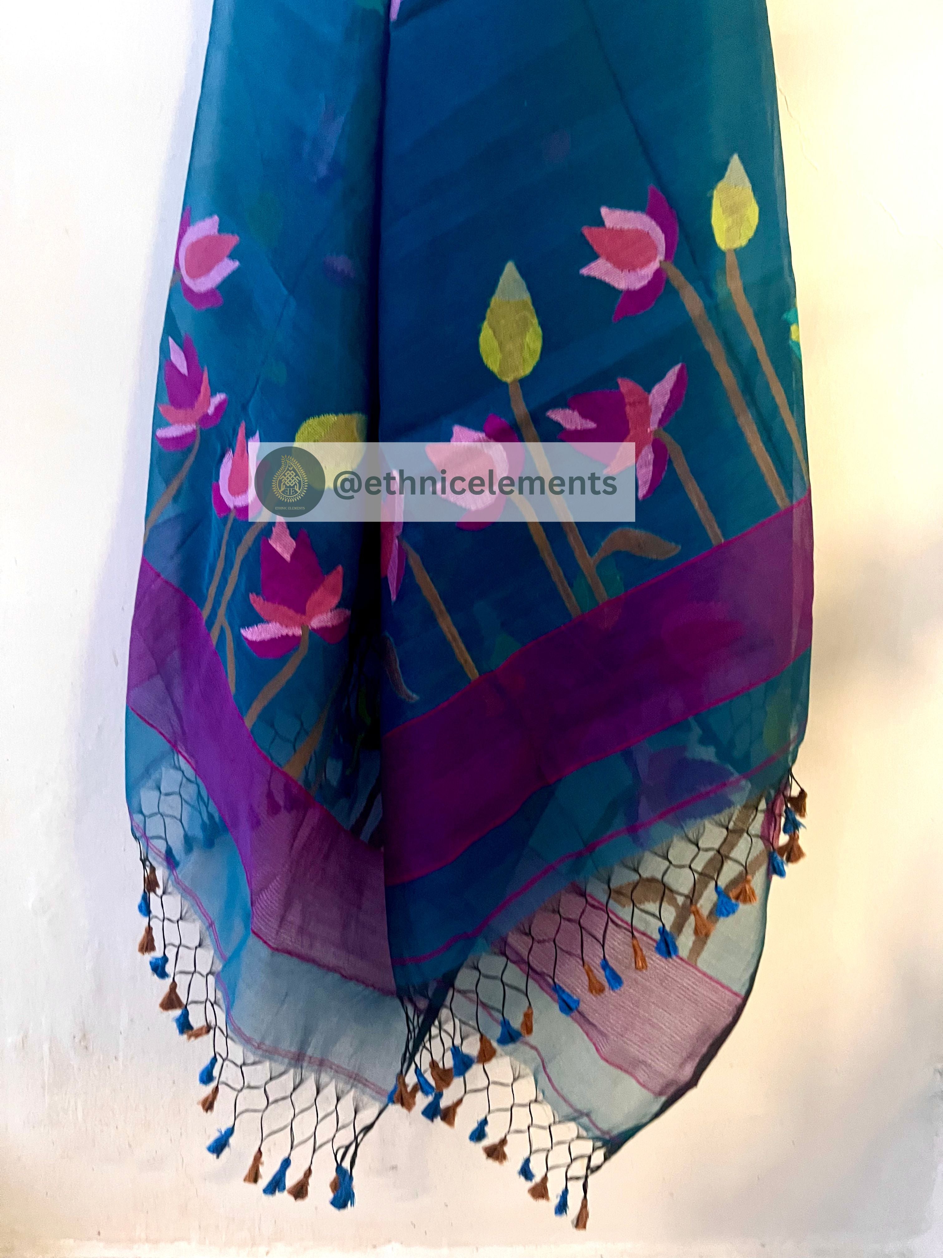 Original woven Jaal work muslin Jamdani kurta dupatta set.3-Pcs unstitched Jamdani dress material with Pichwai themed Jaal work all over the body. Dupatta is adorned with tassels