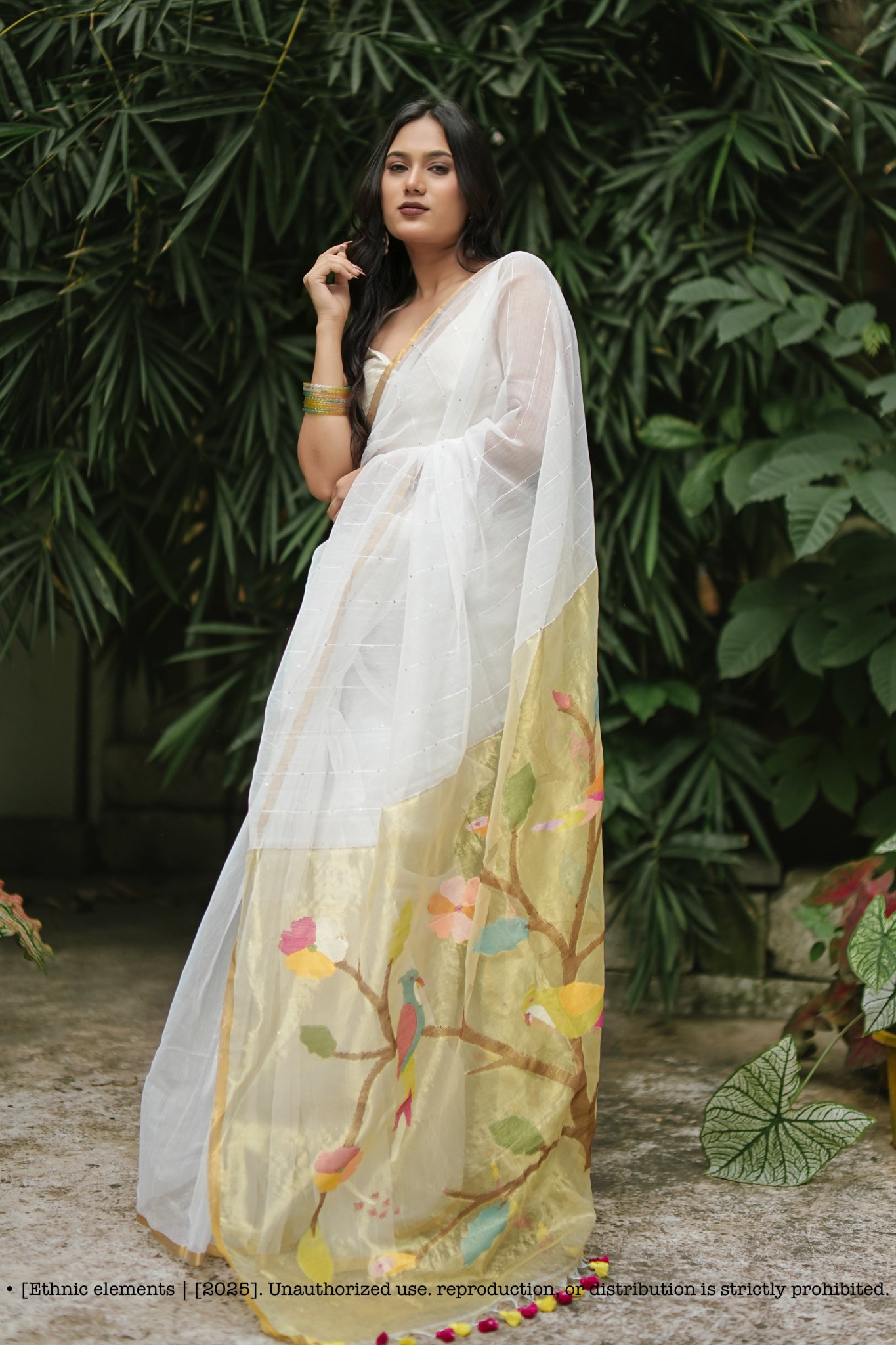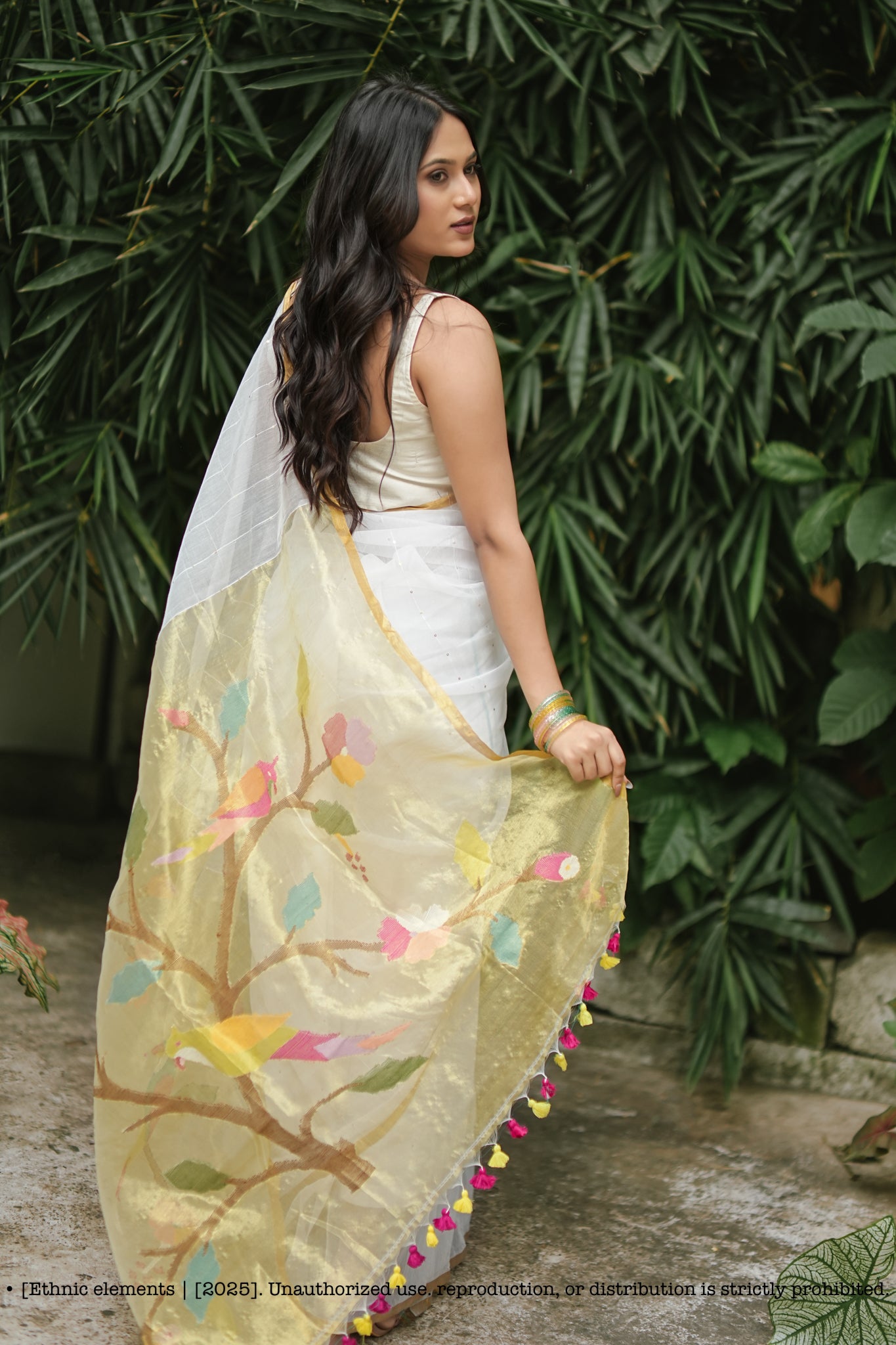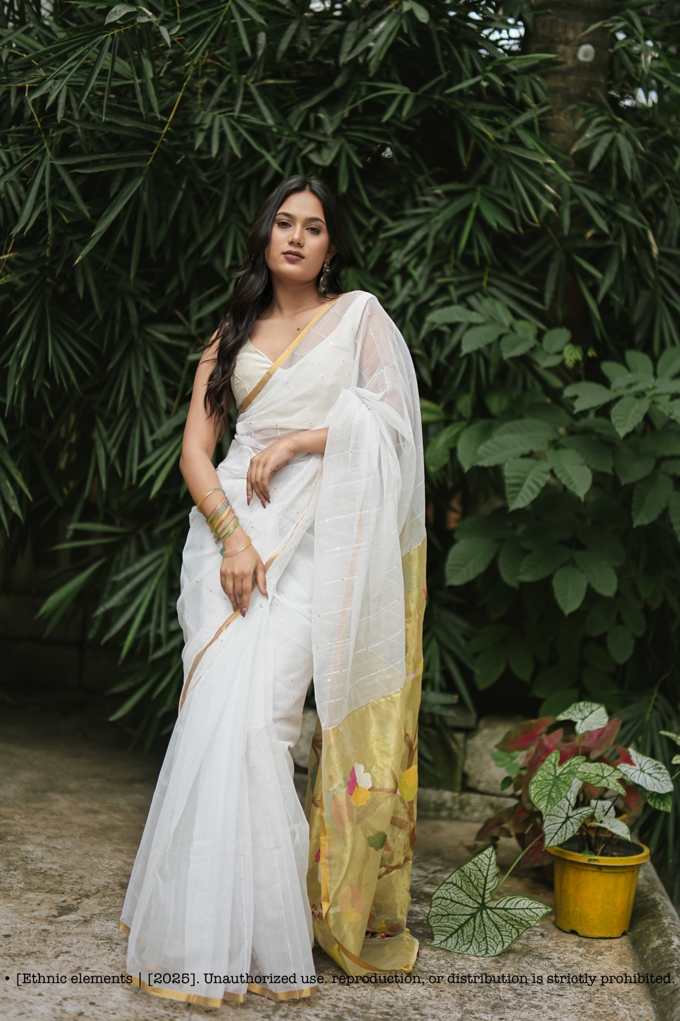 Light as a whisper, and just as captivating. “Pakhee” is a handwoven muslin Jamdani saree that evokes softness, grace, and quiet artistry. The sheer white body is delicately detailed with vertical threadwork and hints of sequins that glimmer subtly as you move—like sunlight dancing on morning dew. The highlight: an exquisite pallu woven with vibrant birds perched on blooming branches, in a palette of soft pinks, greens, yellows, and blues. An heirloom piece that feels as weightless as it looks.