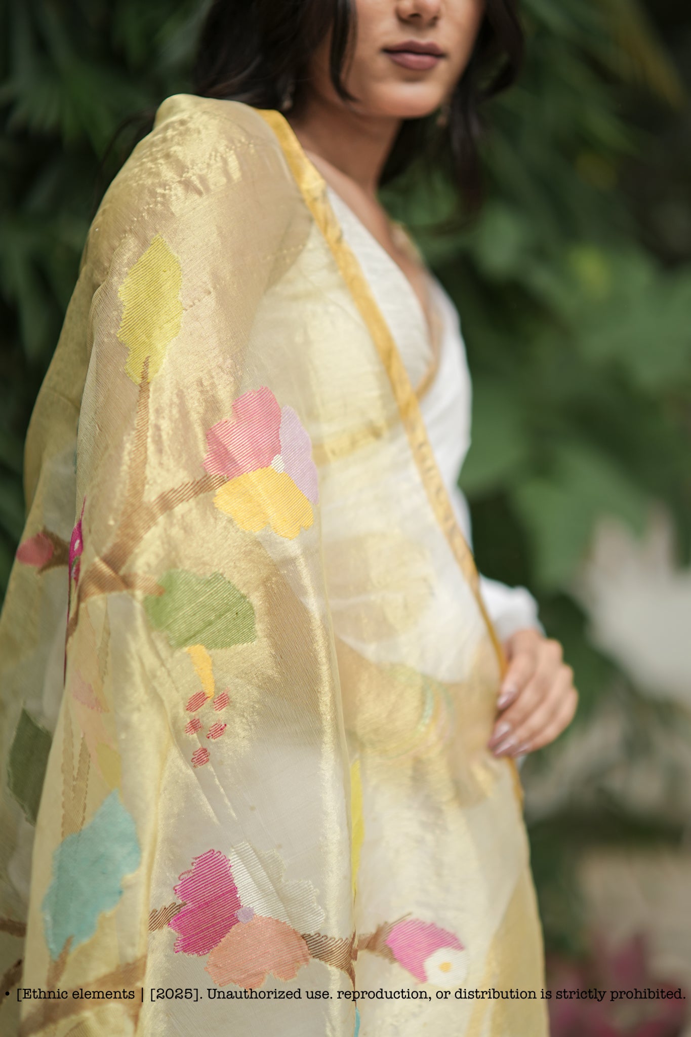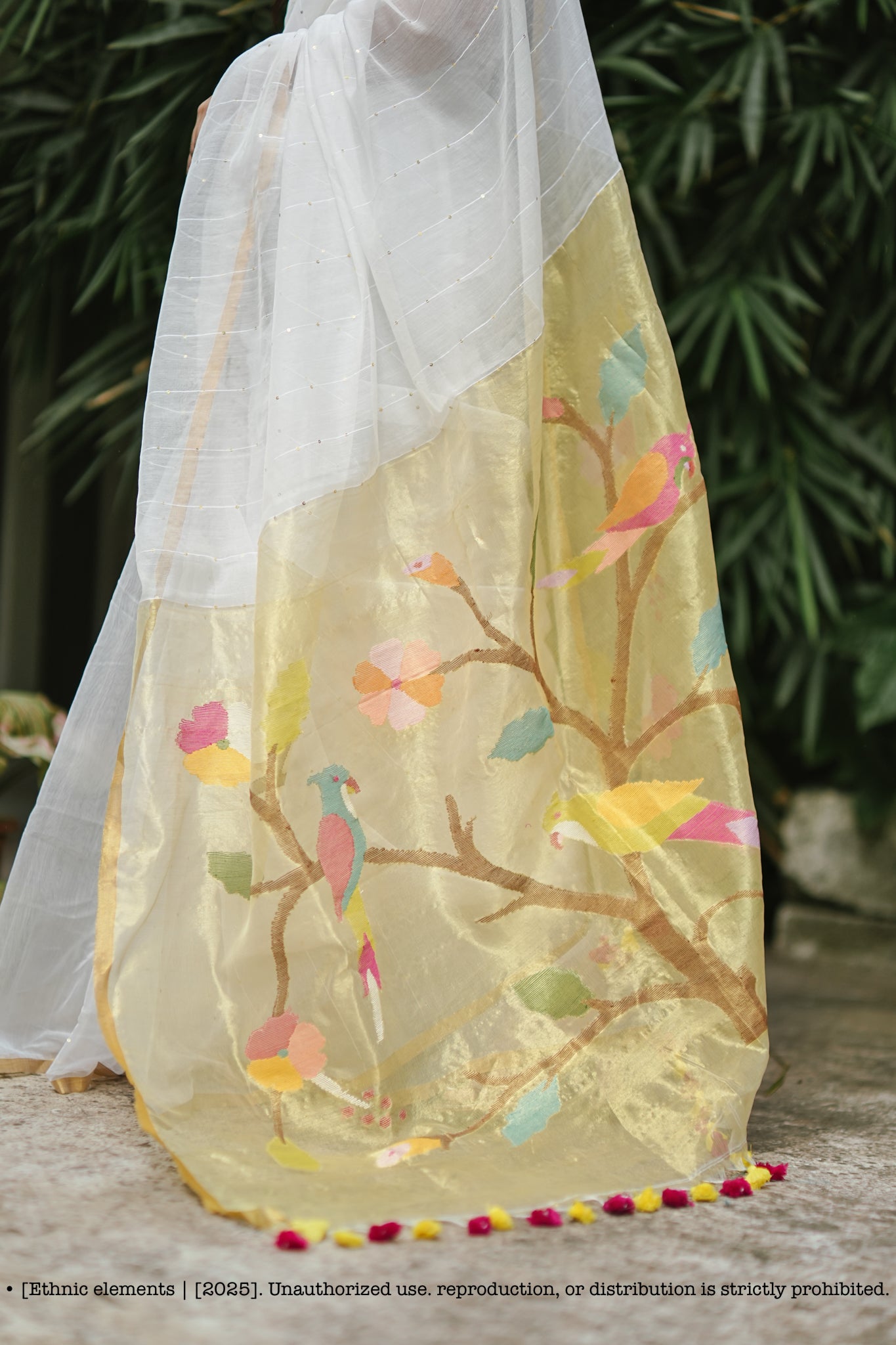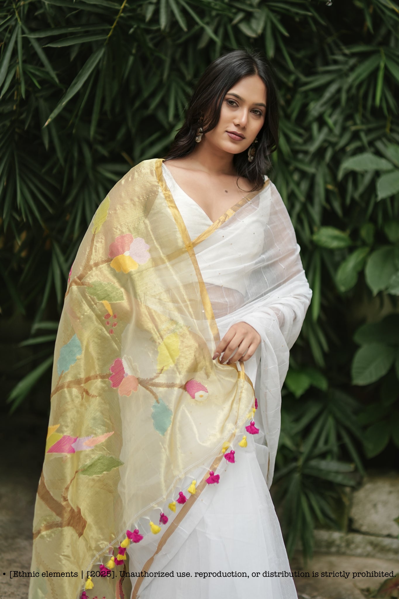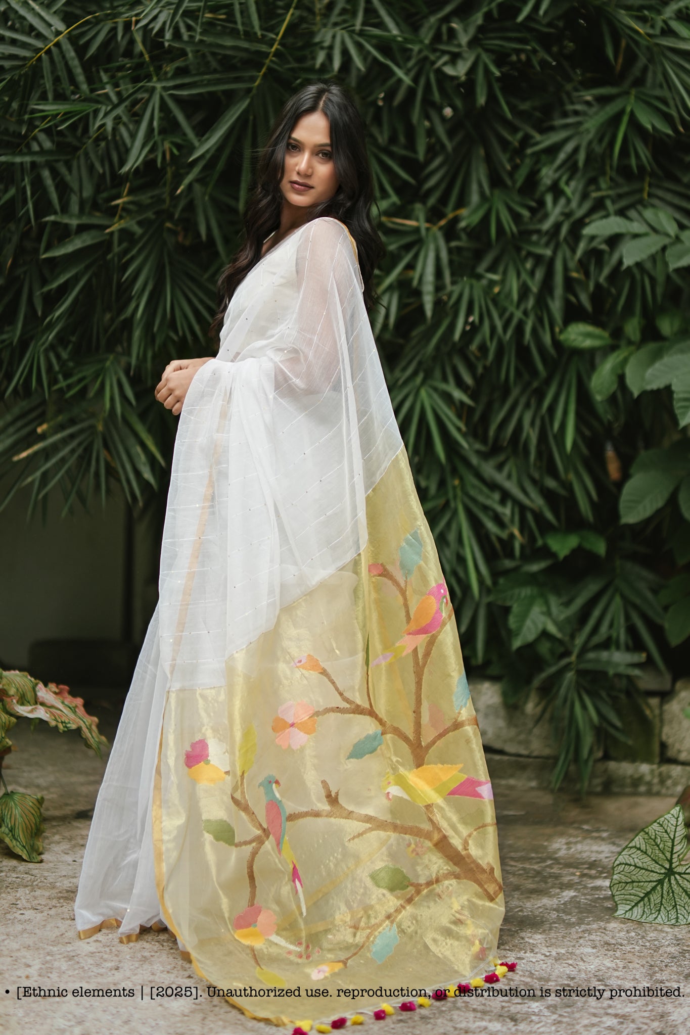 Light as a whisper, and just as captivating. “Pakhee” is a handwoven muslin Jamdani saree that evokes softness, grace, and quiet artistry. The sheer white body is delicately detailed with vertical threadwork and hints of sequins that glimmer subtly as you move—like sunlight dancing on morning dew. The highlight: an exquisite pallu woven with vibrant birds perched on blooming branches, in a palette of soft pinks, greens, yellows, and blues. An heirloom piece that feels as weightless as it looks.