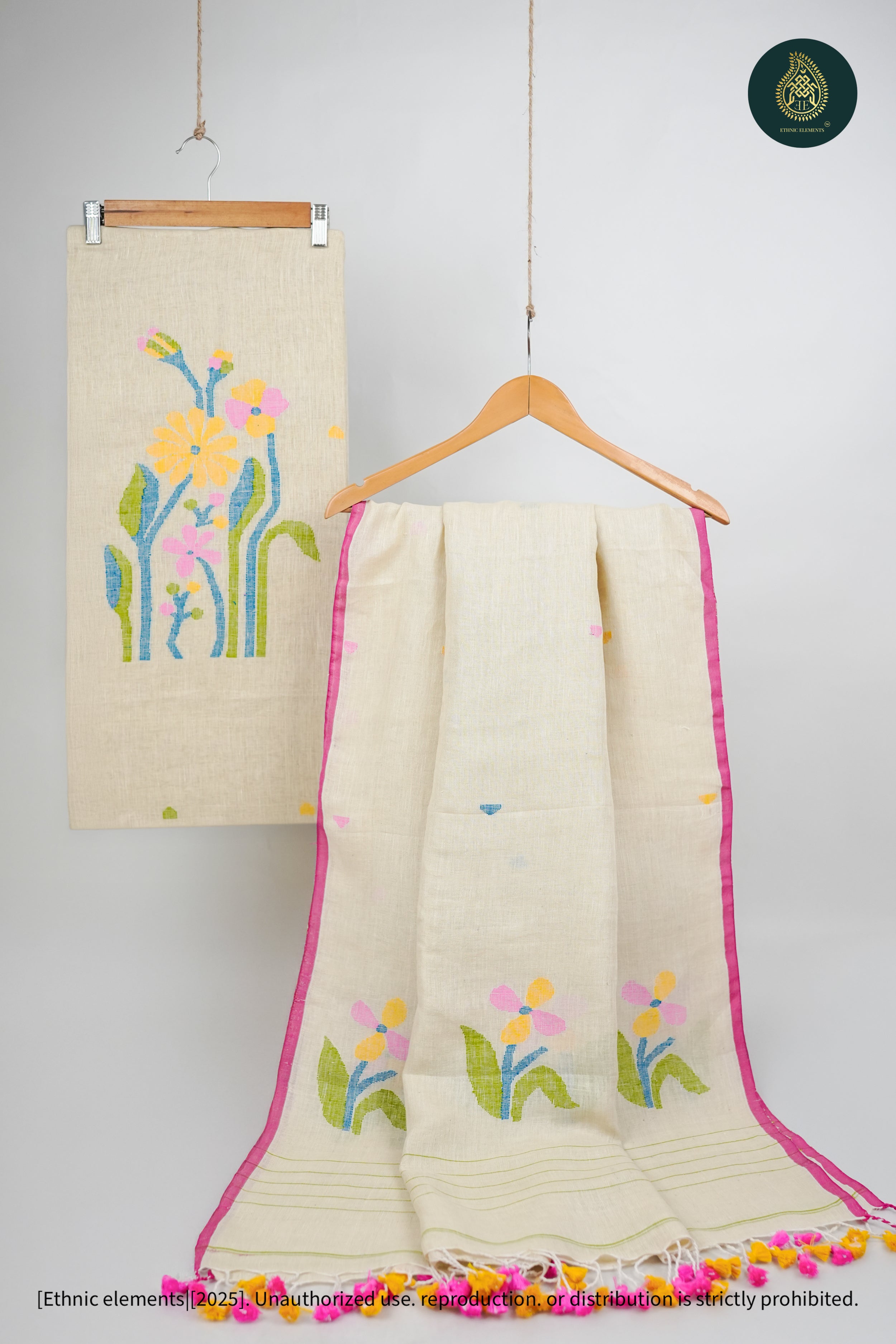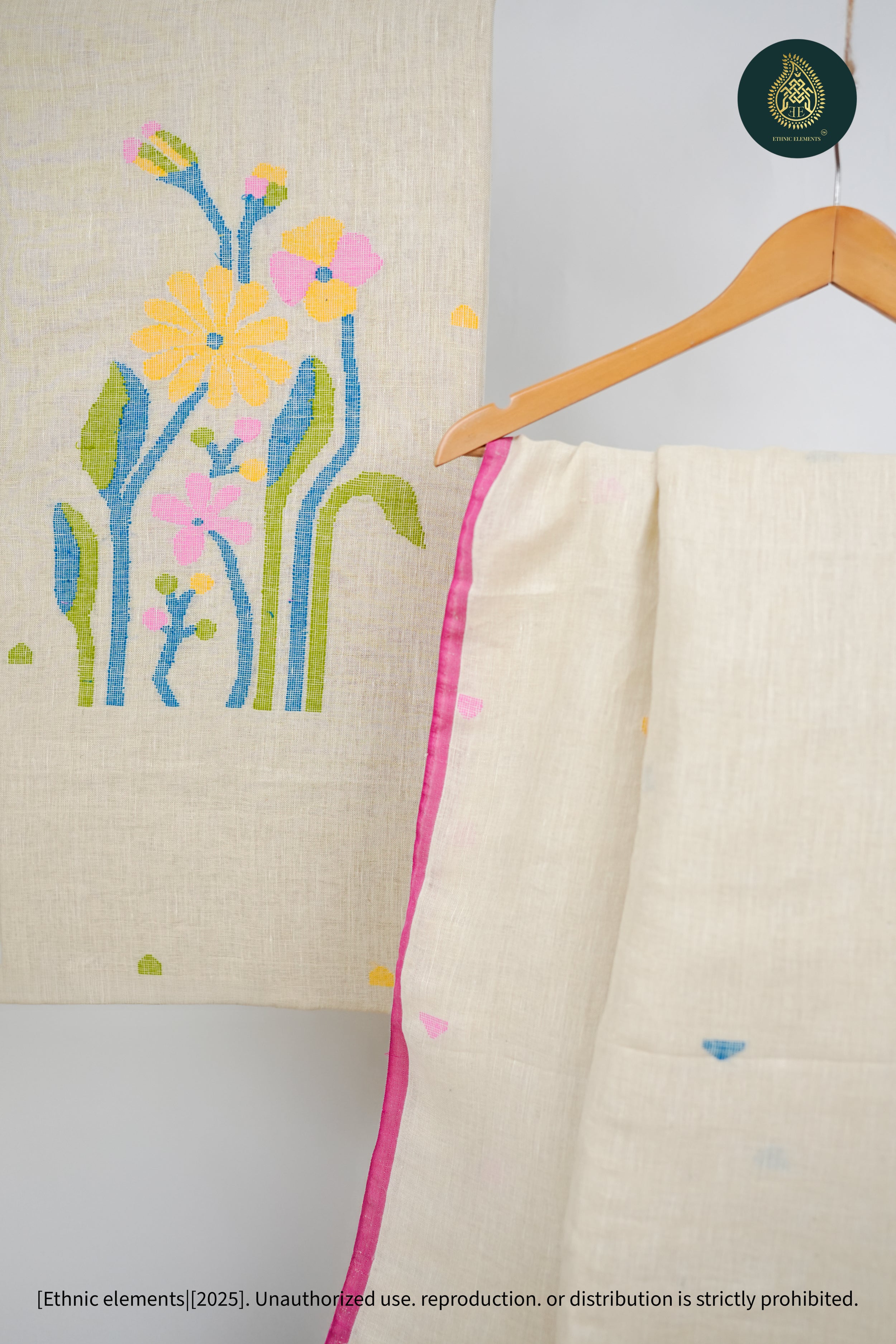Our Pure Hand Woven Linen Jamdani Kurta and Dupatta Set is a perfect blend of traditional craftsmanship and modern elegance. Crafted from 100% pure Hand Woven linen, this set showcases the delicate art of Jamdani weaving, known for its intricate patterns and timeless beauty. The set includes an unstitched kurta and a matching dupatta, offering versatility and style for a variety of occasions.