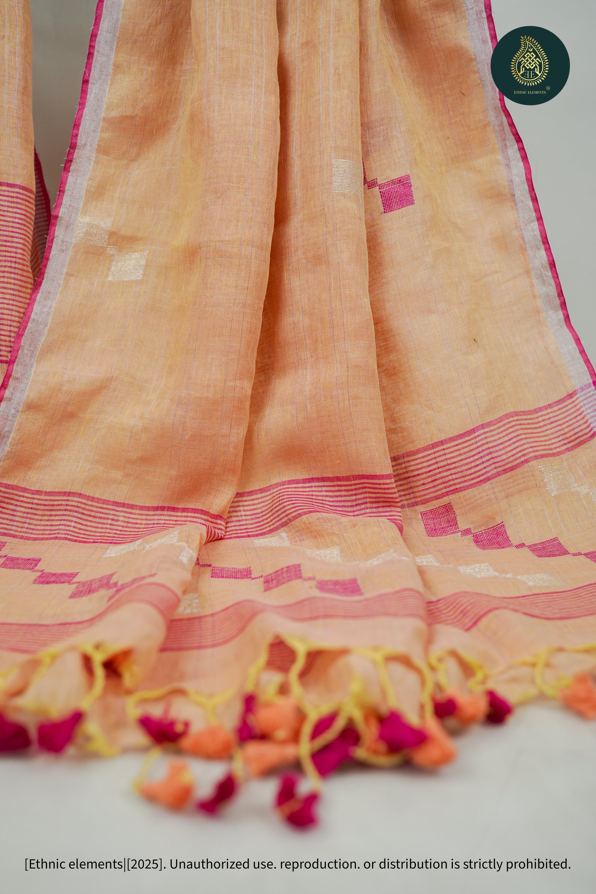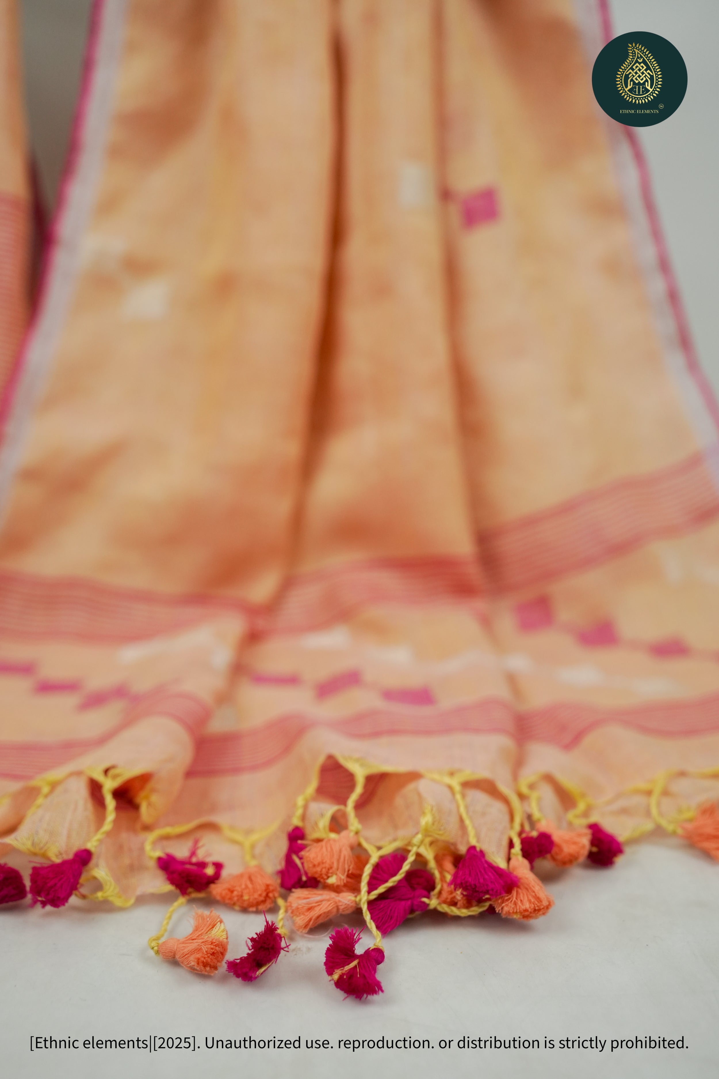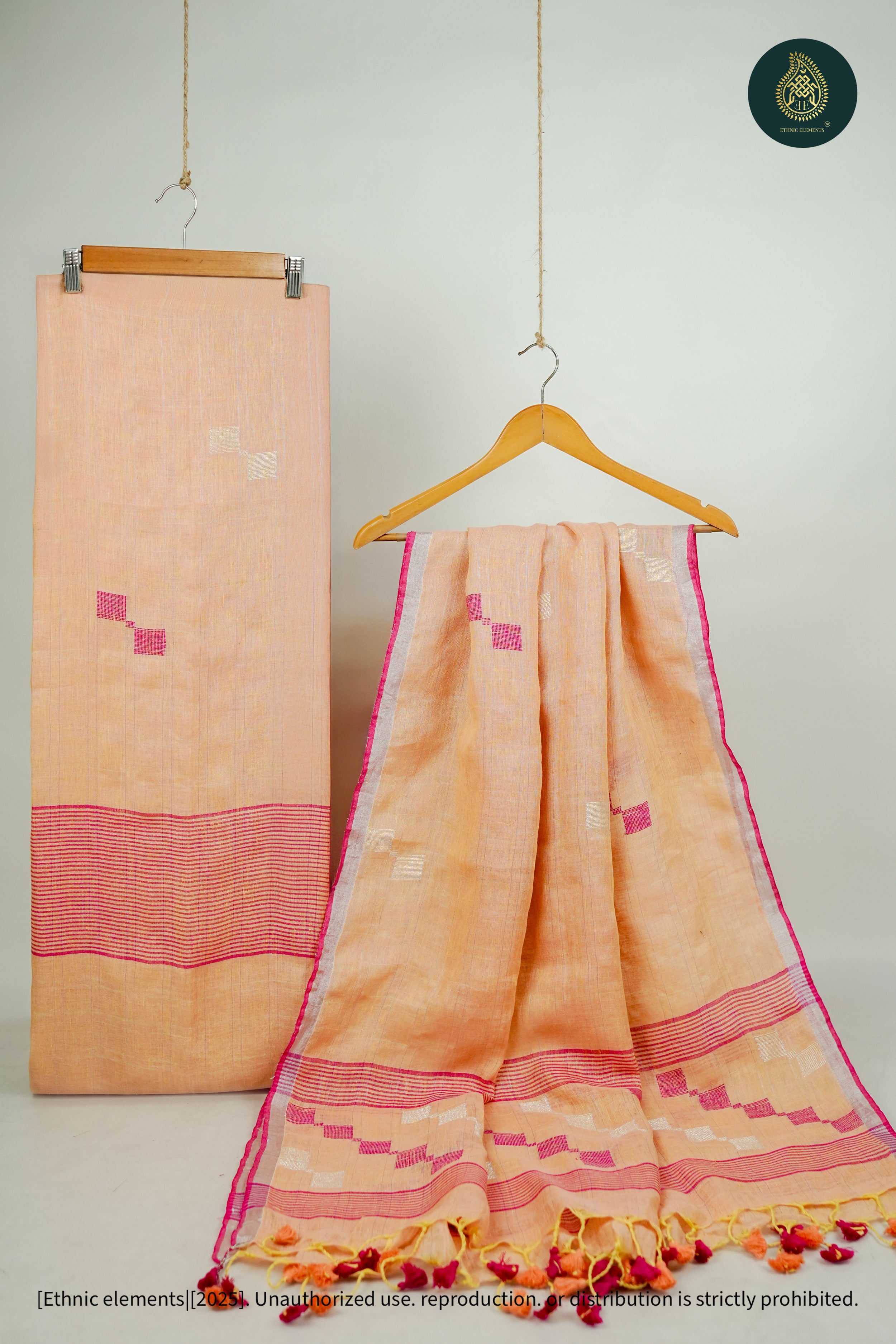 Our Pure Hand Woven Linen Jamdani Kurta and Dupatta Set is a perfect blend of traditional craftsmanship and modern elegance. Crafted from 100% pure Hand Woven linen, this set showcases the delicate art of Jamdani weaving, known for its intricate patterns and timeless beauty. The set includes an unstitched kurta and a matching dupatta, offering versatility and style for a variety of occasions.