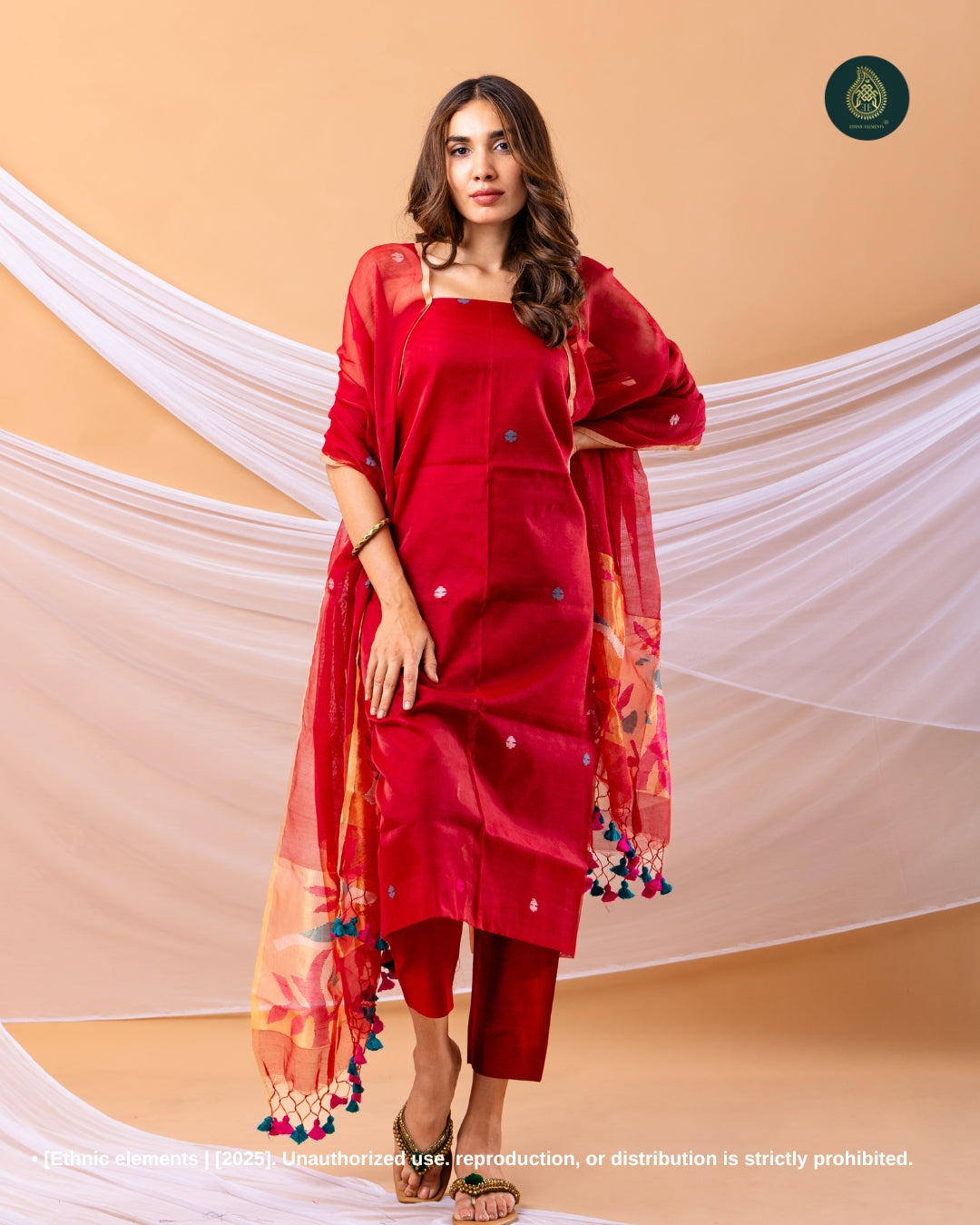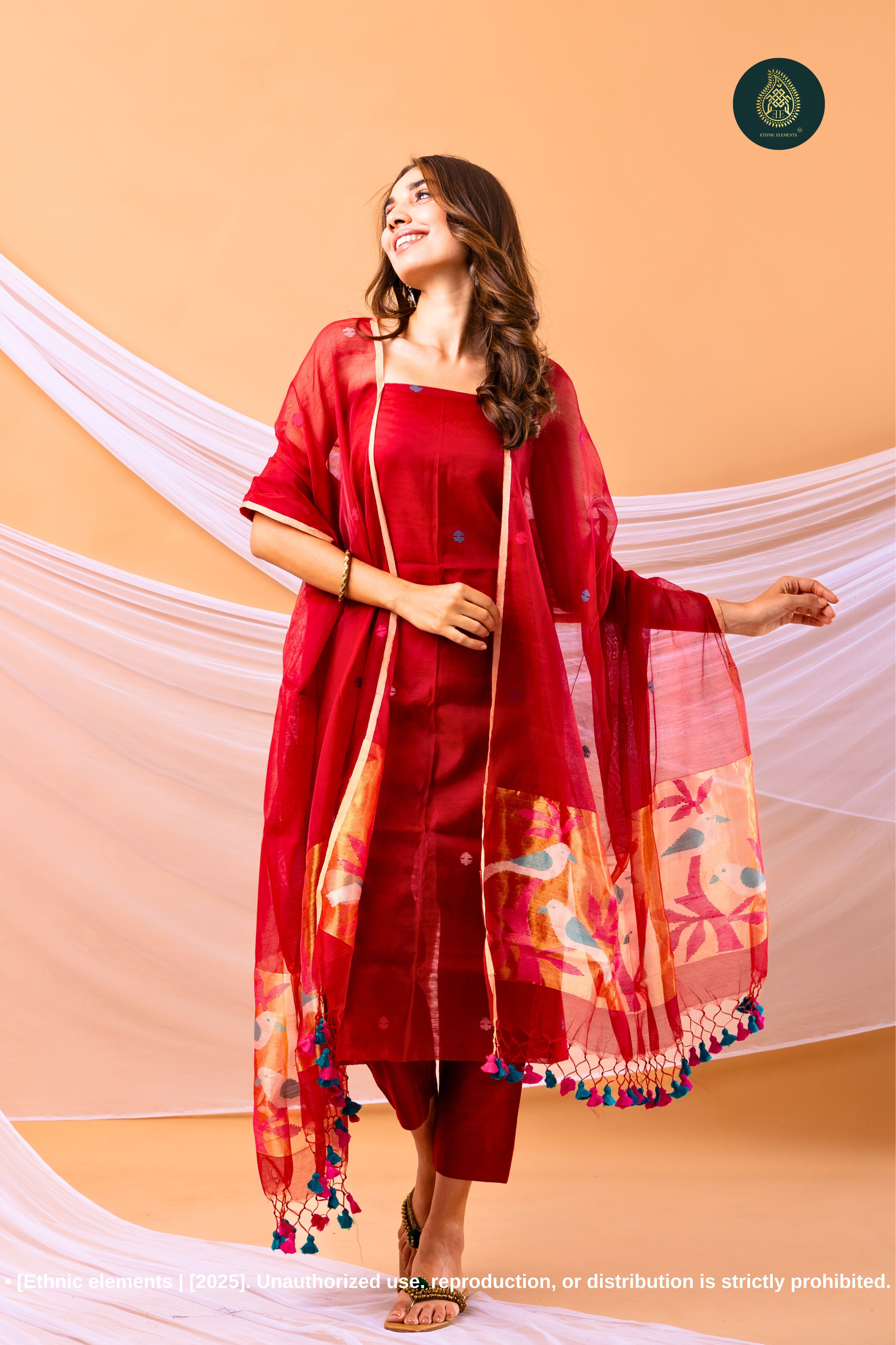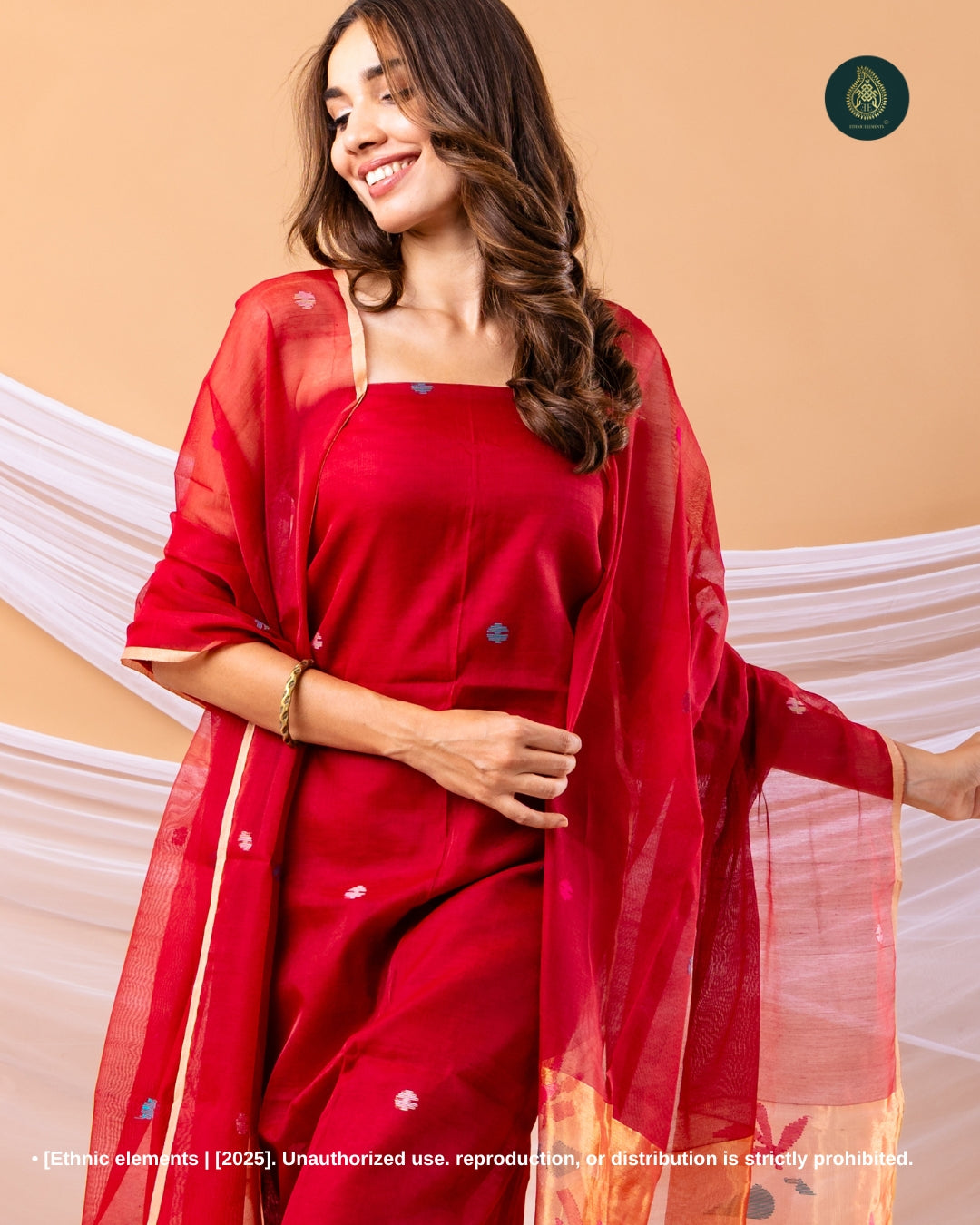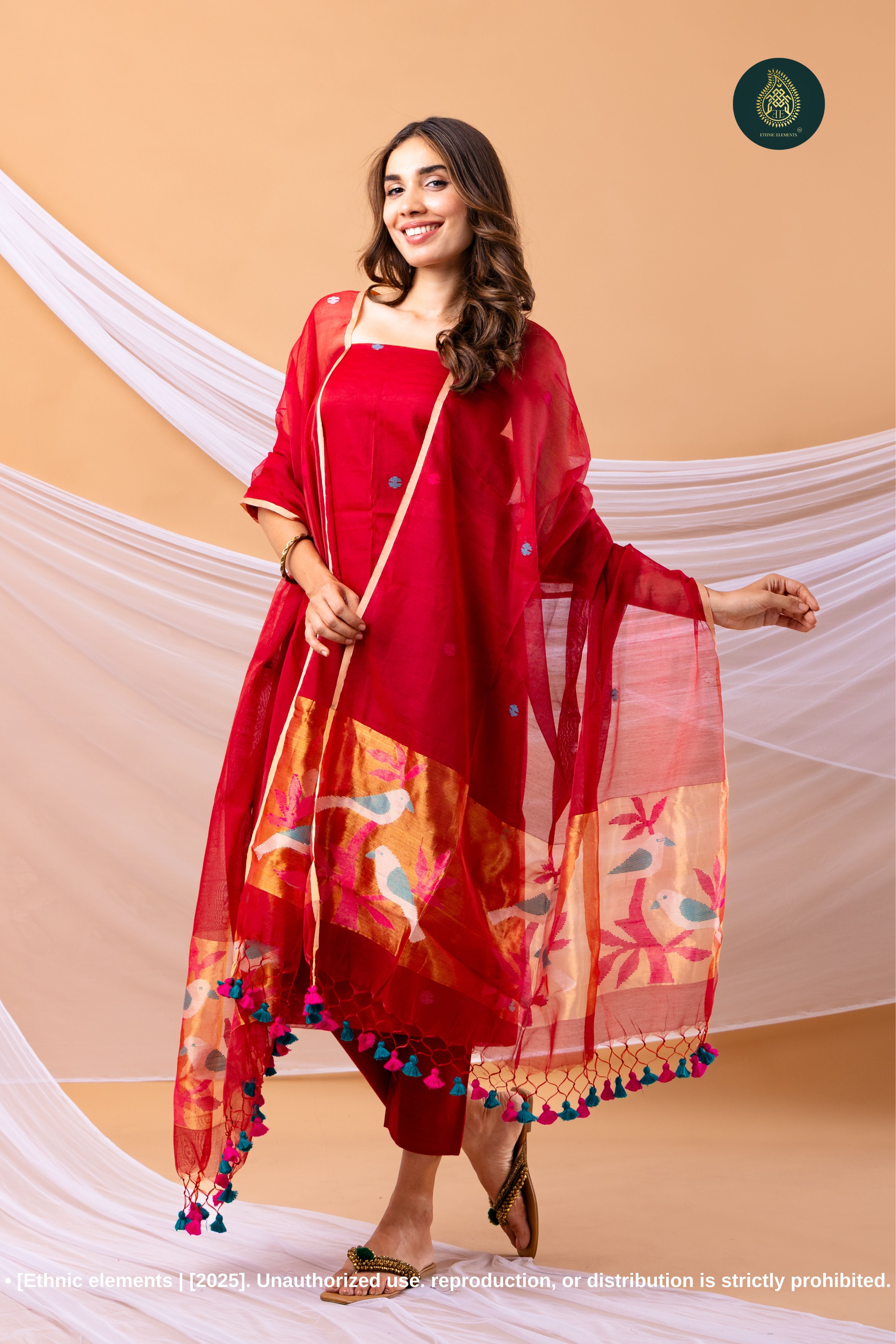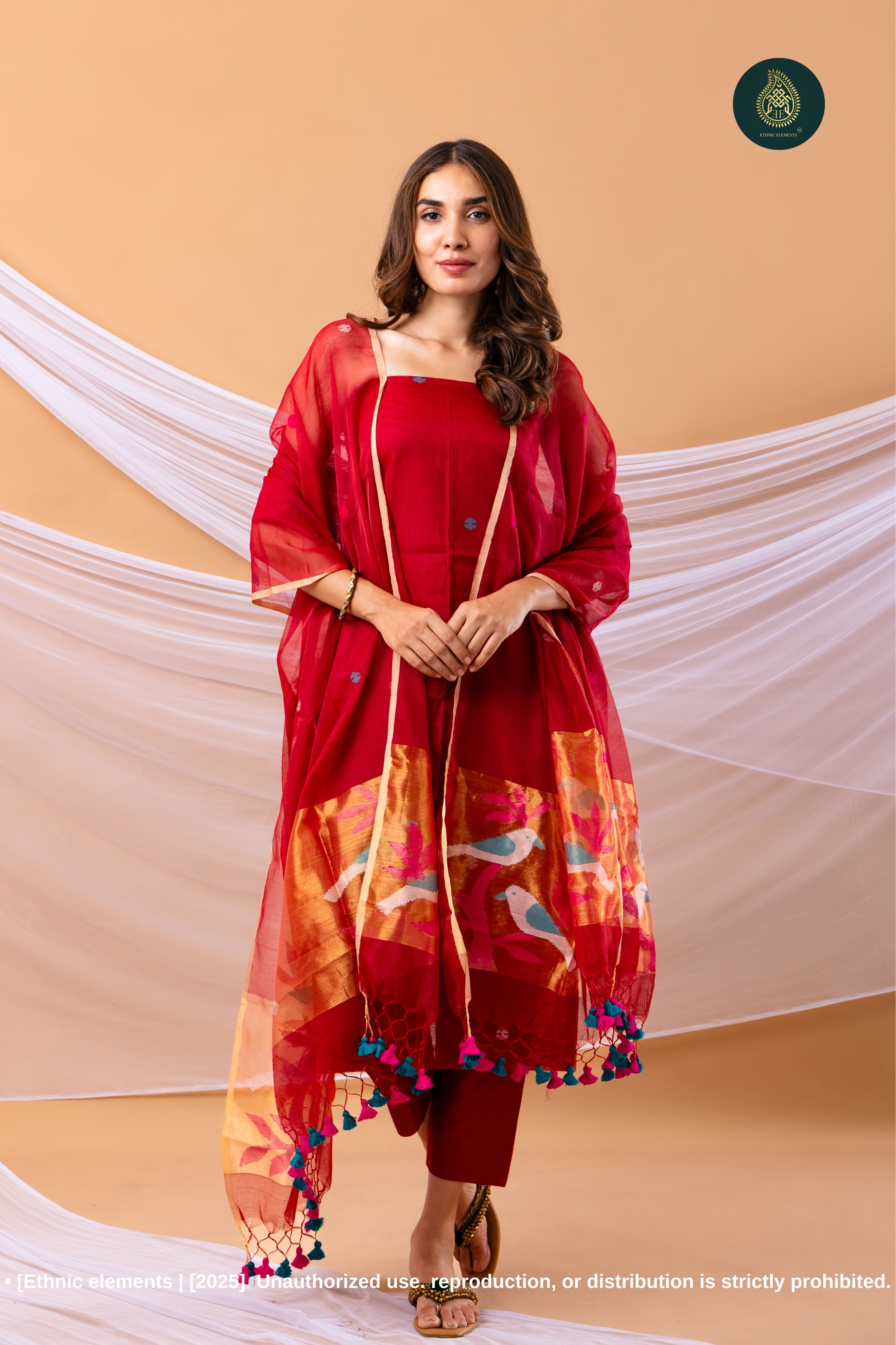Paithani Muslin Jamdani Suit Set- Raani Red