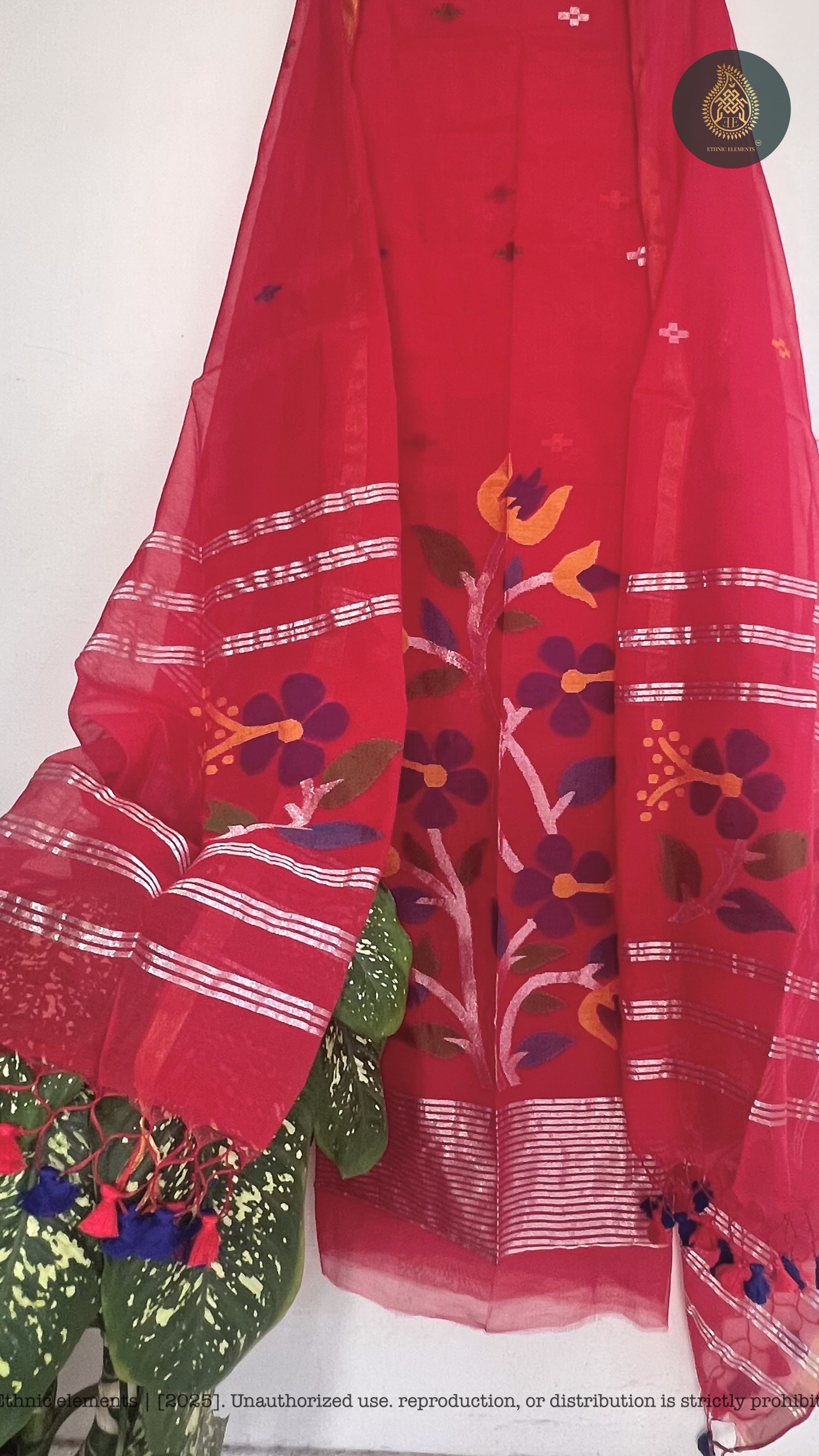 Resham Muslin Jamdani Suit Set - Flaming Rose