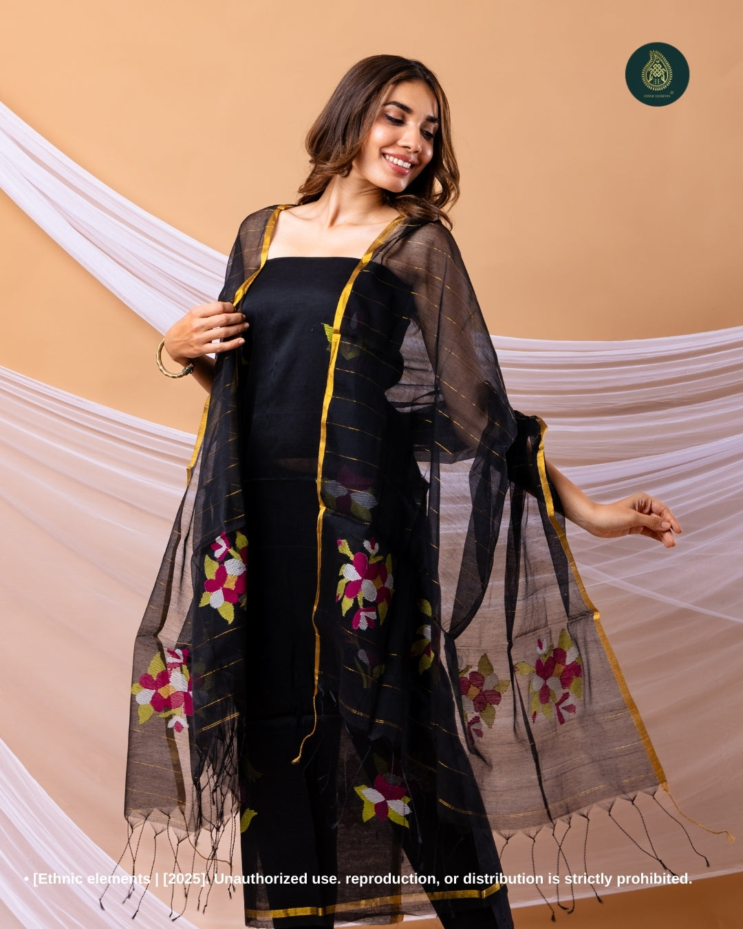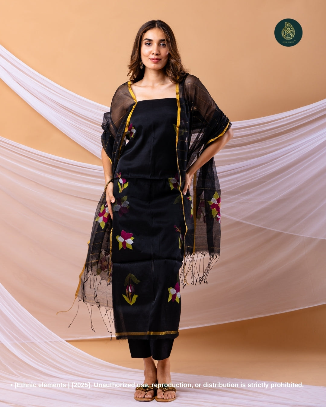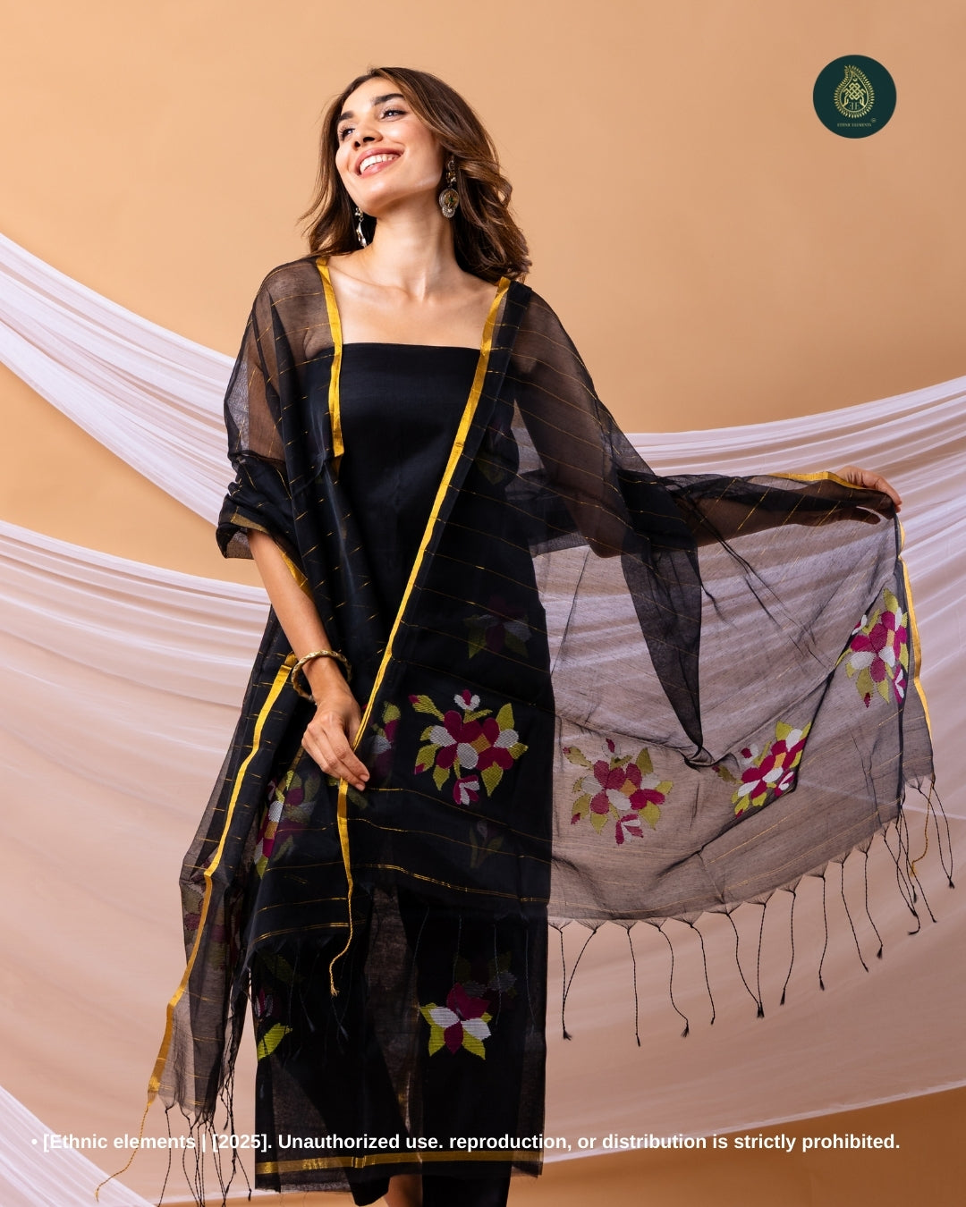 One of our timeless classics is here. Handloom woven natural Resham Muslin Jamdani 2 pc suit set. Hand woven jamdani work all over the front and back of the kurta fabric. Dupatta has woven zari border and zari stripes all over the jamdani pallu with handmade tassels.