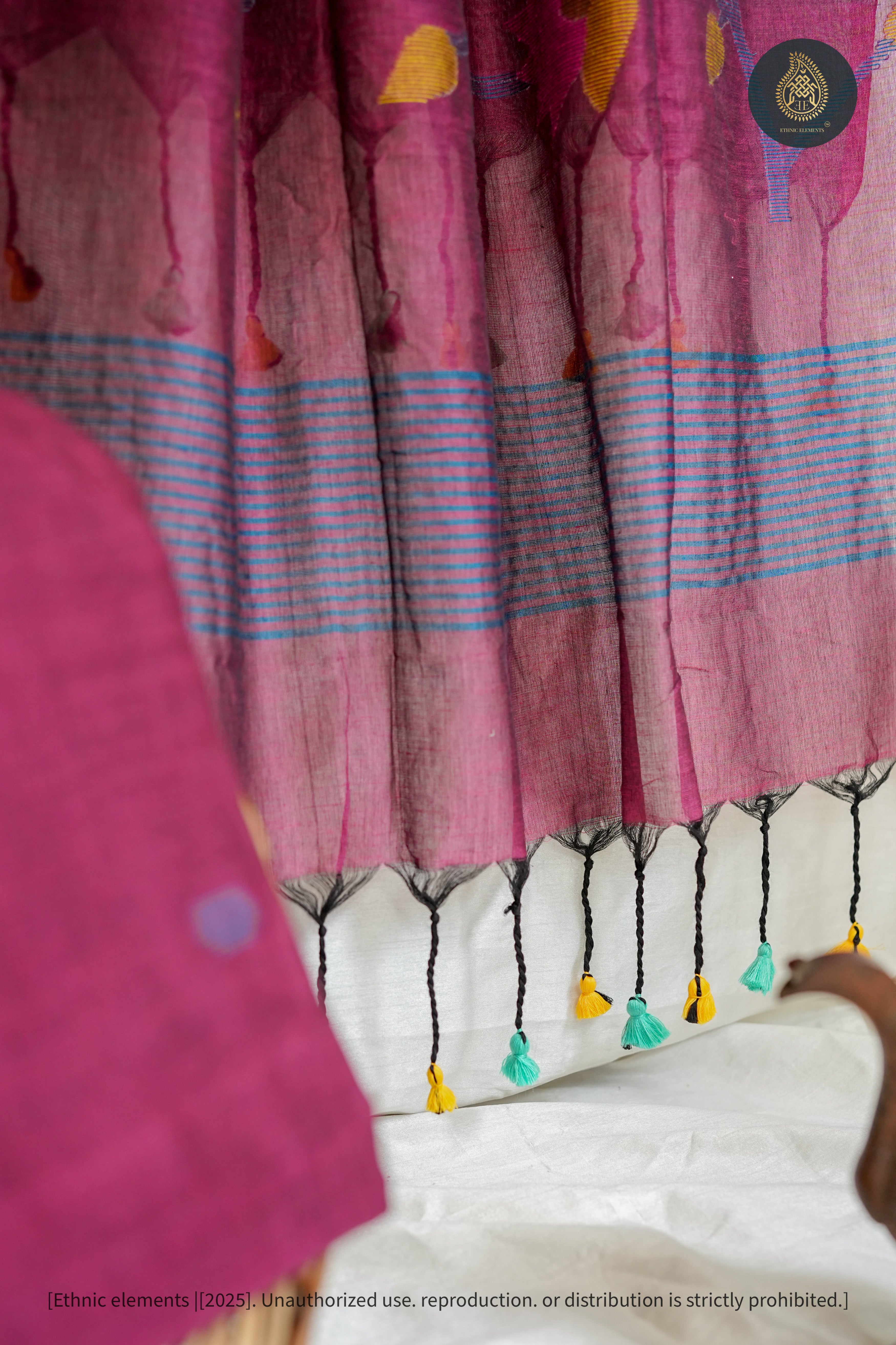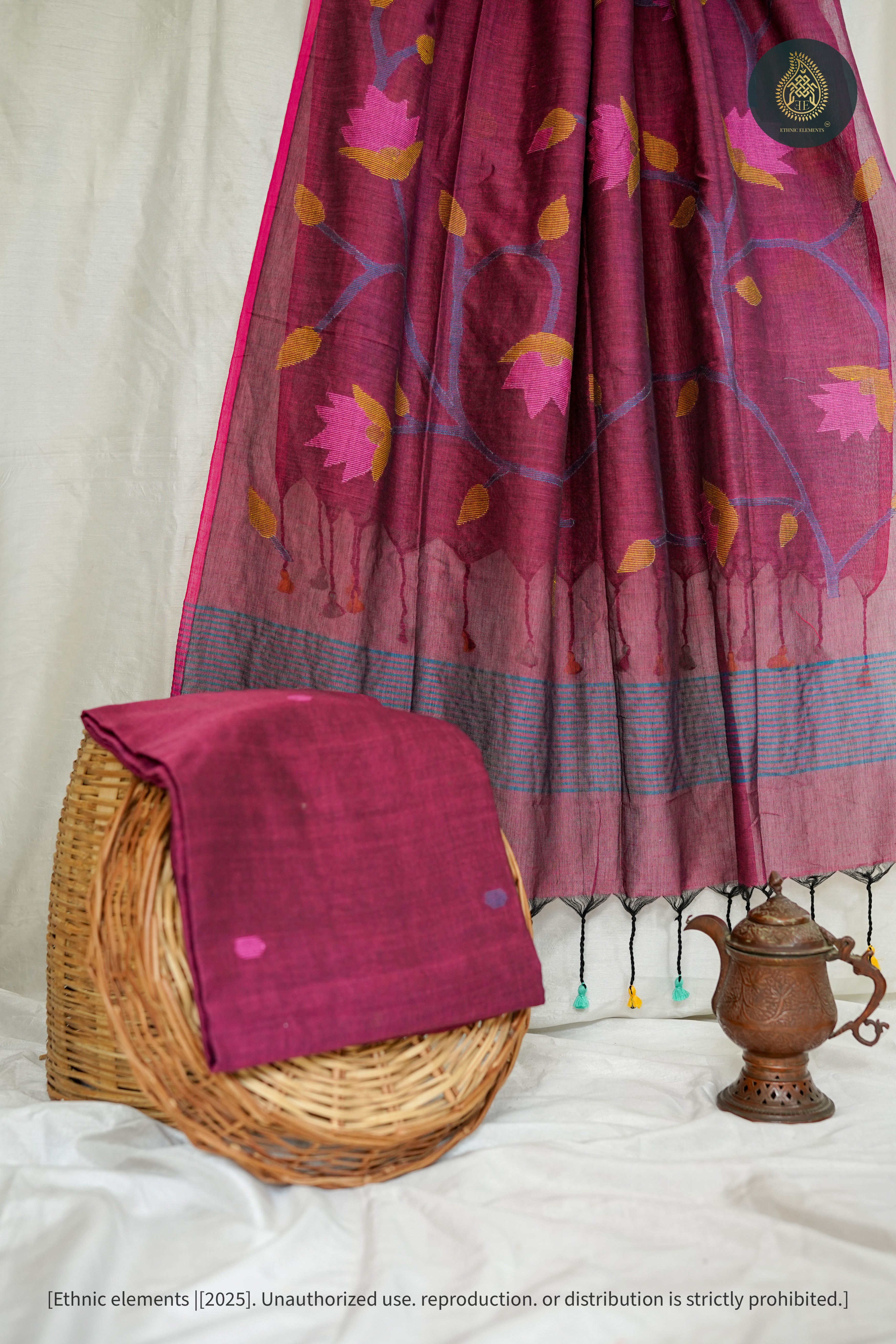 Immerse yourself in the timeless beauty of handloom craftsmanship with our Jamdani Cotton Suit Set. This piece ensemble is meticulously handwoven on traditional looms, showcasing intricate floral and Jamdani motifs in shades of terracotta.Crafted with exquisite craftsmanship, this unstitched Jamdani suit set celebrates the heritage of handloom weaving. The soft premium cotton fabric is adorned with intricate needle Jamdani work featuring delicate motifs, adding a touch of artistry and grace to your ensemble. Each piece is meticulously handwoven by skilled artisans, offering a perfect blend of comfort, culture, and timeless elegance.