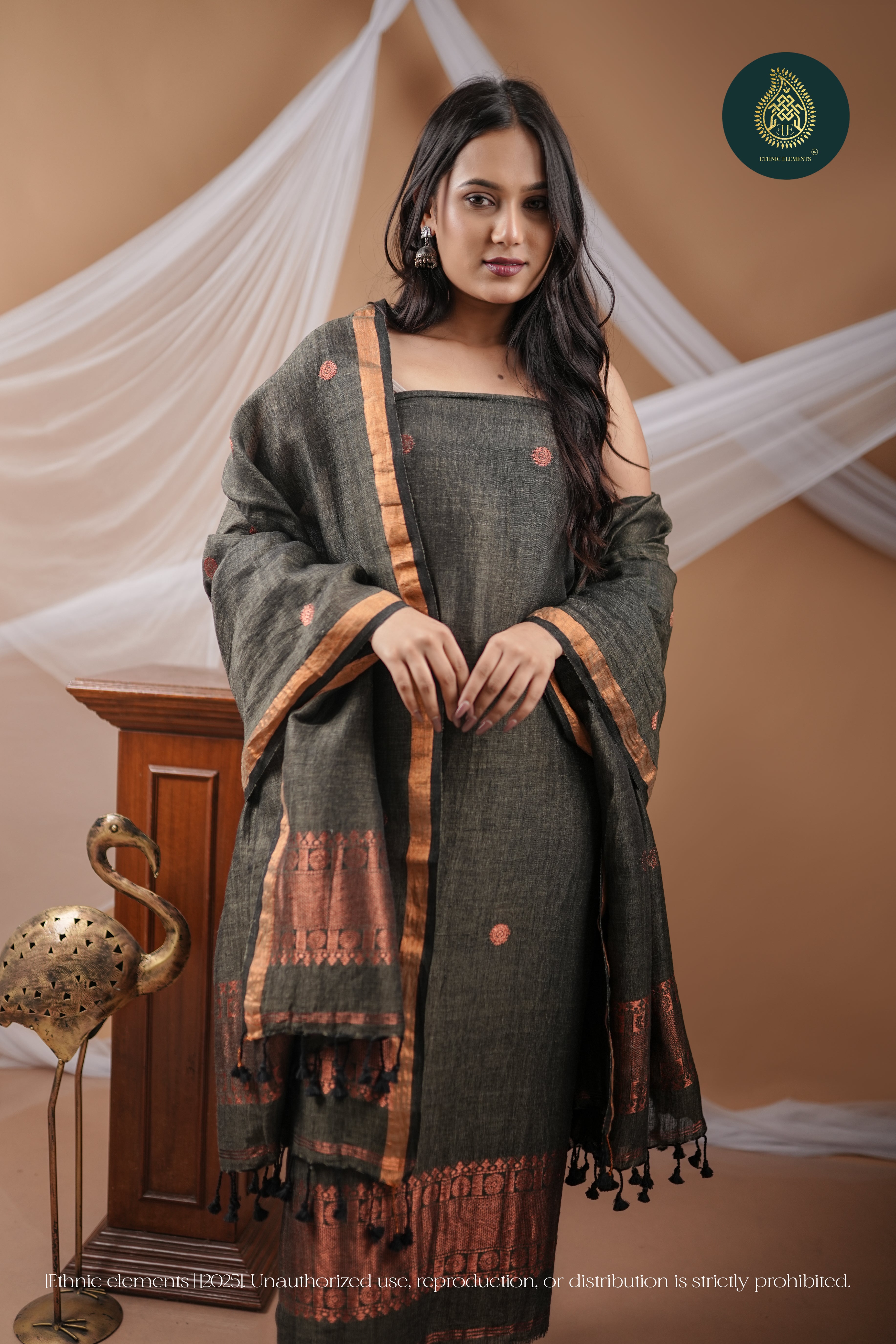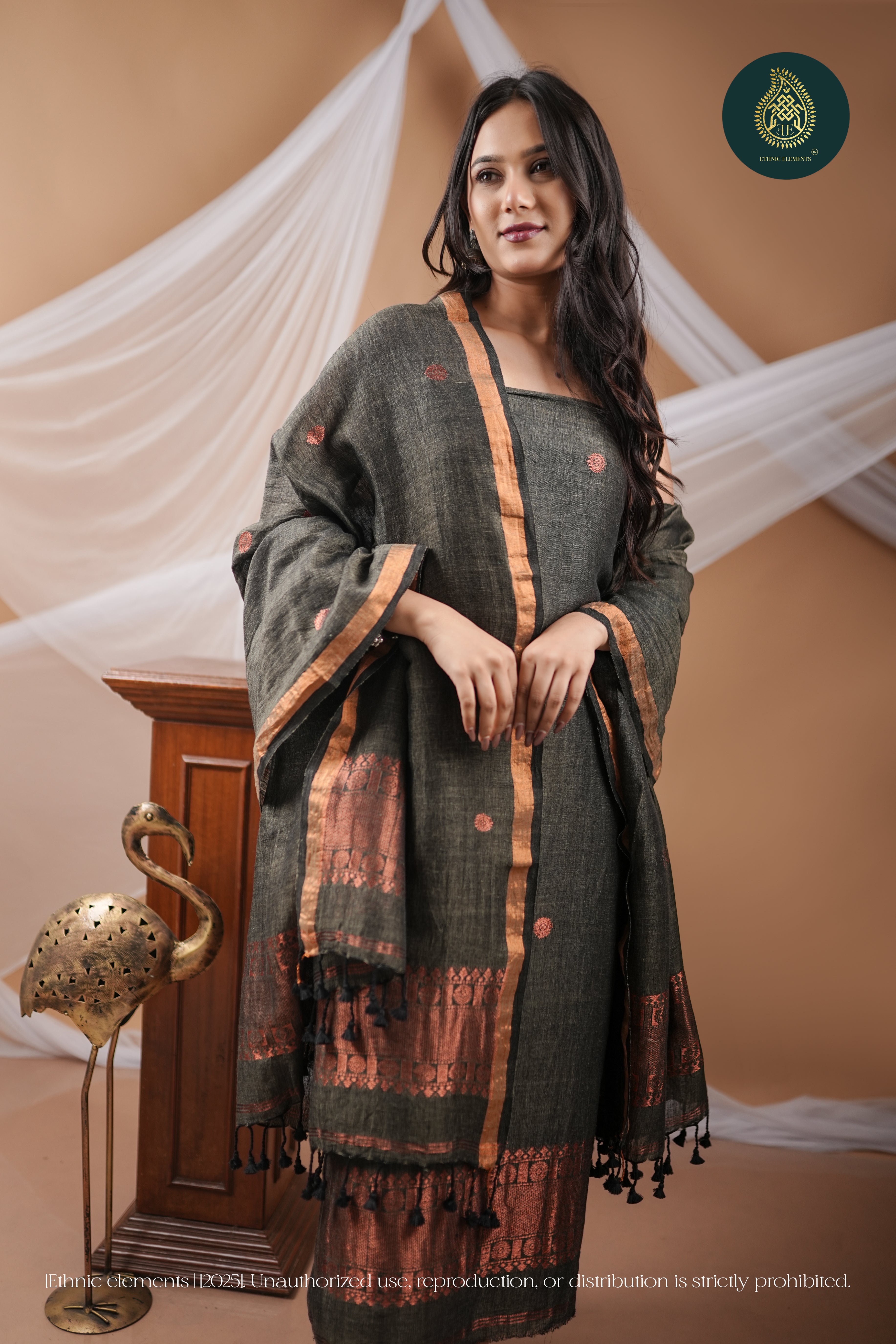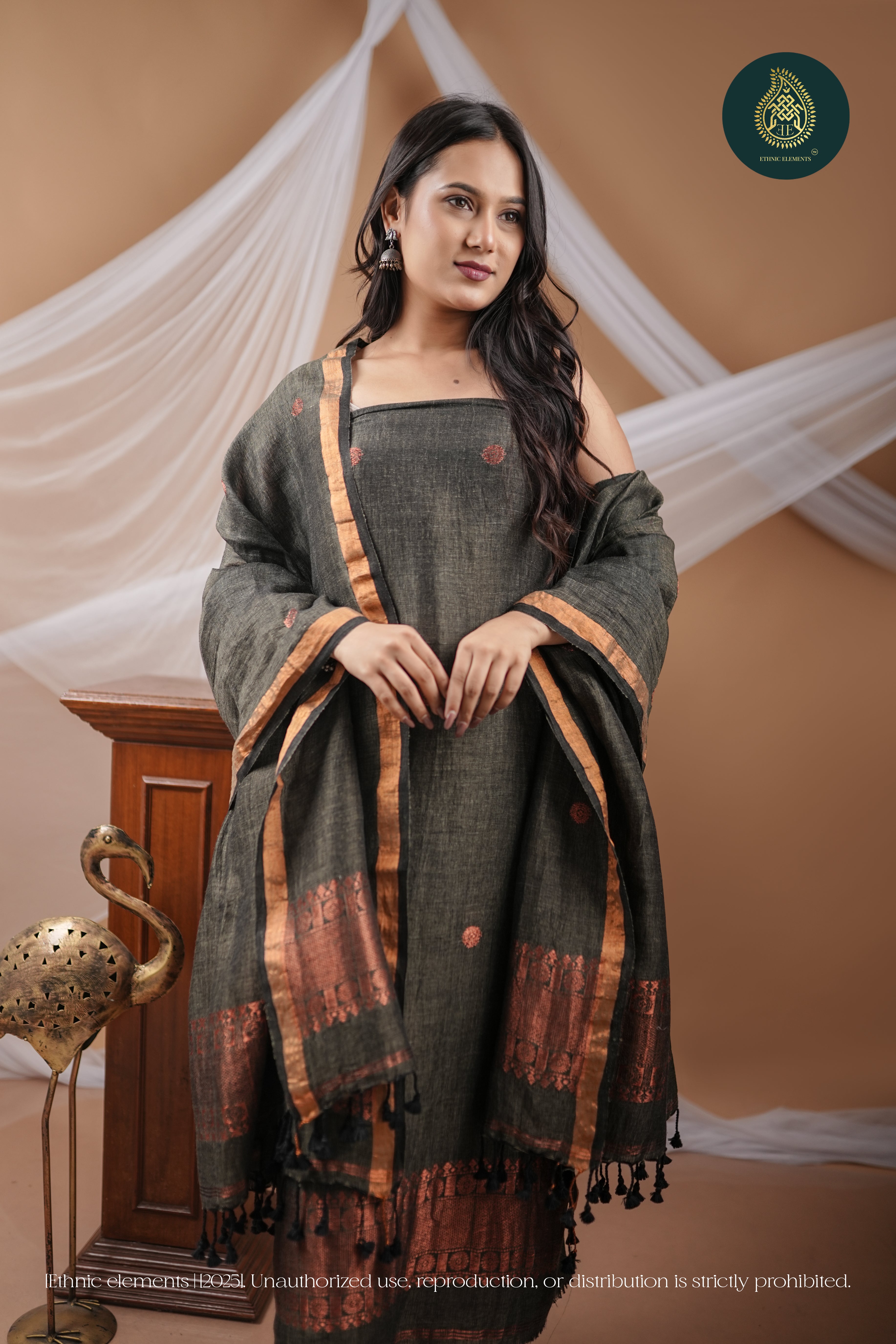 Bask in the earthy glow of Khol Dusk, a handloom-woven linen suit set that blends deep olive tones with warm rust-hued zari. Subtle circular Jamdani motifs are scattered across the body, while the edges gleam with a rose gold zari border and contrast selvedge — a perfect harmony of texture, tone, and tradition.