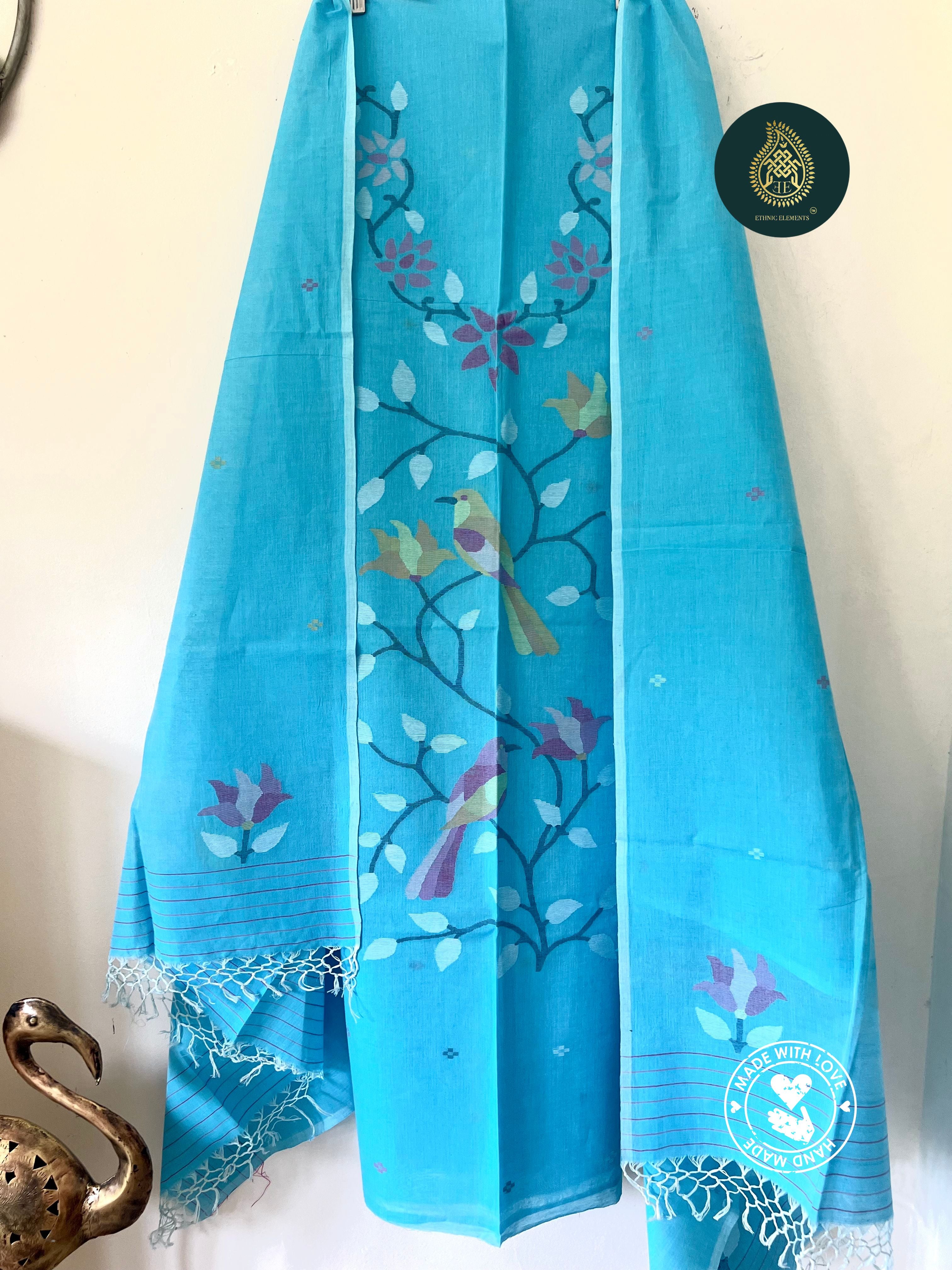 Unstitched premium cotton Jamdani dress material with intricate needle bird design Jamdani work. This is a handmade kurta and dupatta suit set.