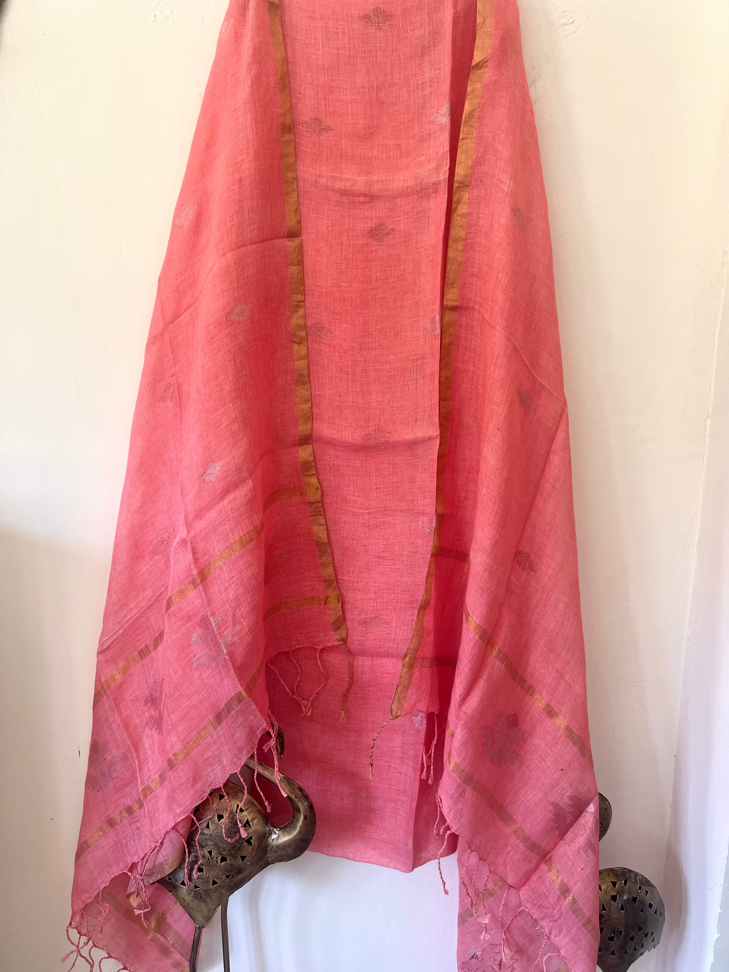 Handloom woven original 100count pure linen Jamdani kurta, dupatta set with tested zari weaving. These suit sets are super-soft and light weight, 100% hand-weaved over Wooden Taant. Our weavers themselves color dye the threads. Only organic natural color dyes are used.