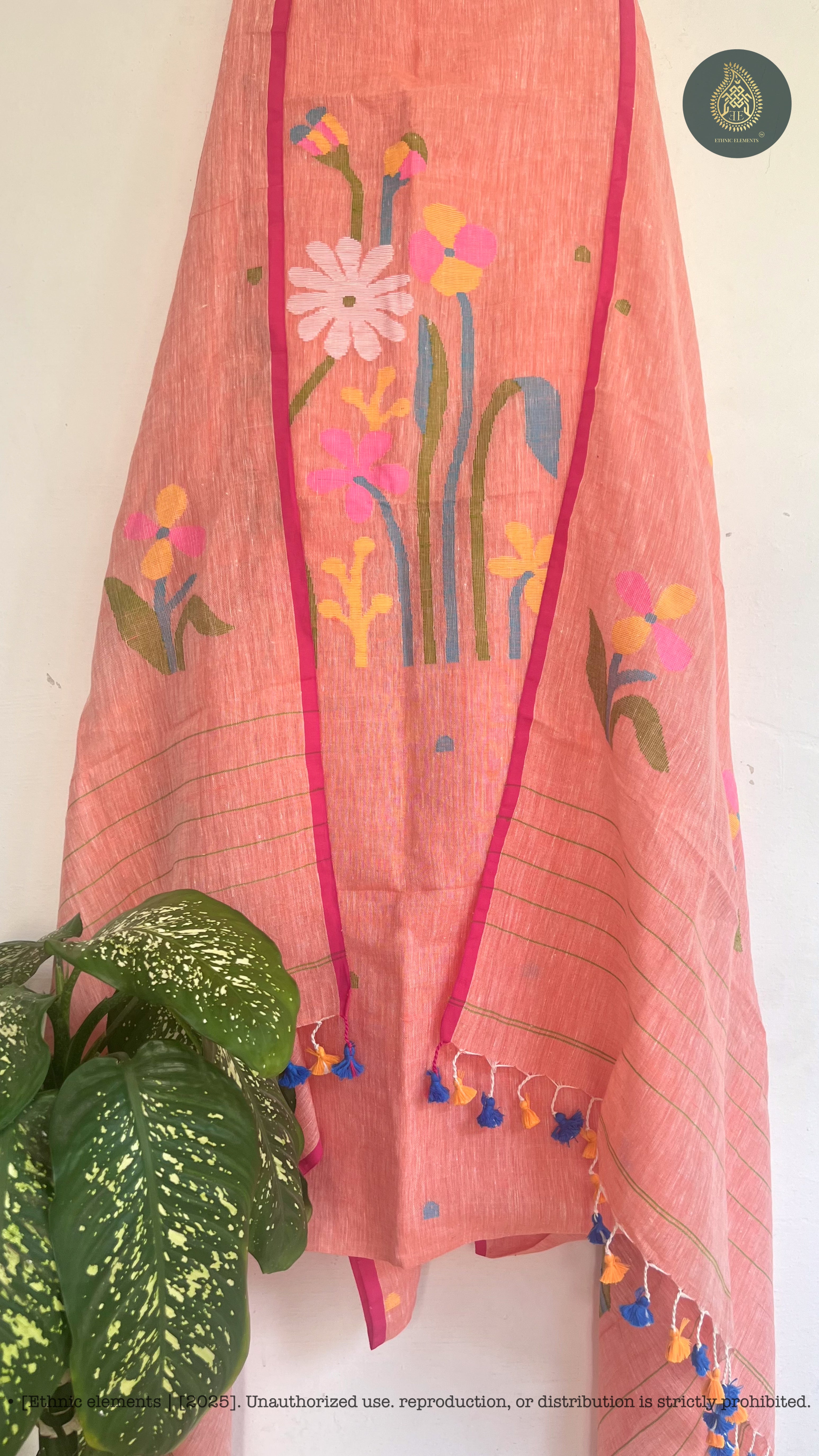 Our Pure Handwoven Linen Jamdani Kurta and Dupatta Set is a perfect blend of traditional craftsmanship and modern elegance. Crafted from 100% pure handwoven linen, this set showcases the delicate art of Jamdani weaving, known for its intricate patterns and timeless beauty. The set includes an unstitched kurta and a matching dupatta, offering versatility and style for a variety of occasions.