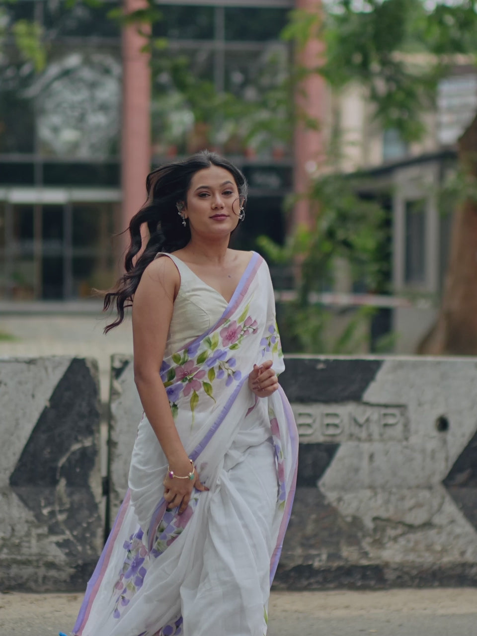Soft, airy and elegant, this ivory mul cotton saree features delicate hand-painted floral bunches scattered across the body and pallu. The artwork blends soft greens, pinks, blues and lilacs—bringing a light, watercolor-like charm to the fabric without overpowering it.