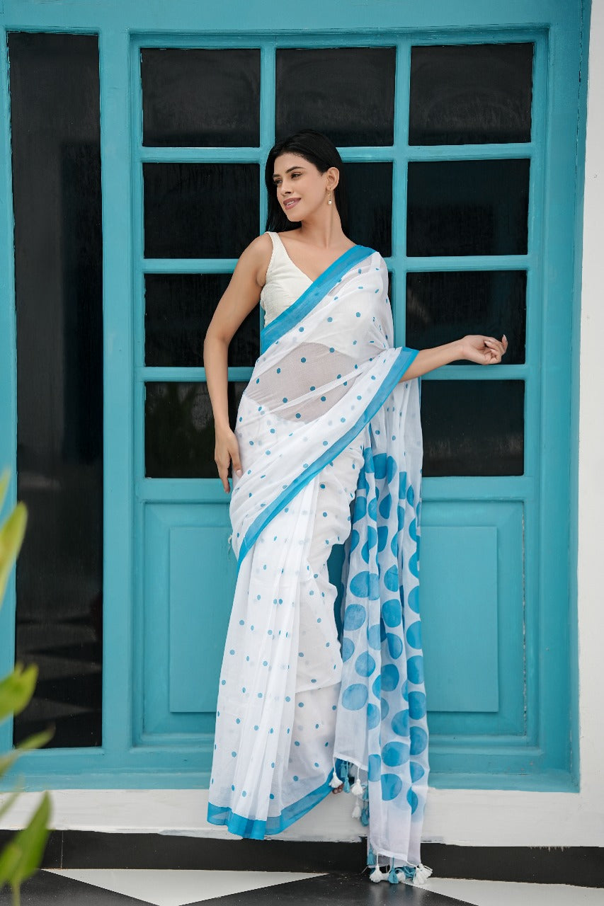Mul cotton saree with Polka dots - Dot Affair Blue