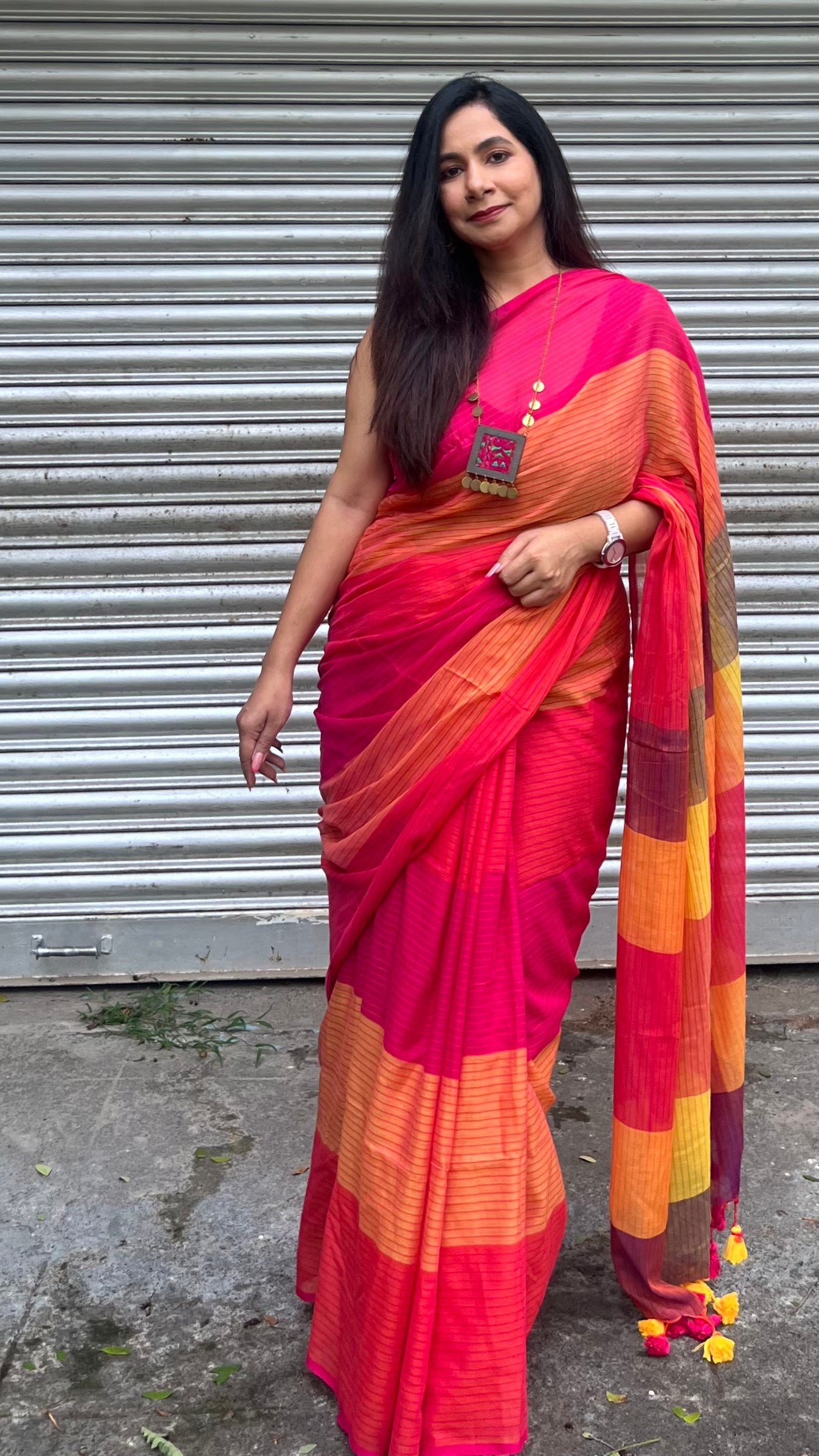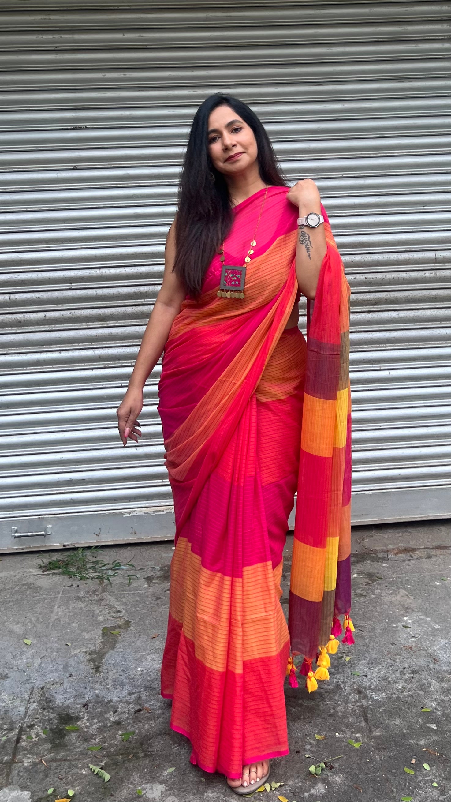 • Everyday Bold: Pair with a plain red or pink cotton blouse and silver bangles. Let the saree do the talking.