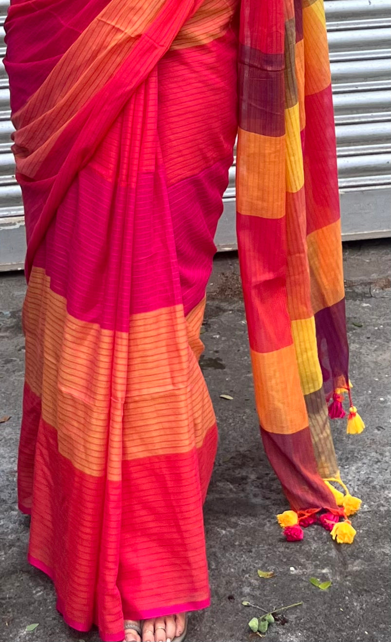 A celebration of color and craft, this Rainbow Red mul cotton saree is handwoven with care to bring joy to your everyday wardrobe. The multicolored stripes dance across a base of vibrant red, creating a saree that’s bold yet balanced—perfect for the woman who wears her spirit with confidence.