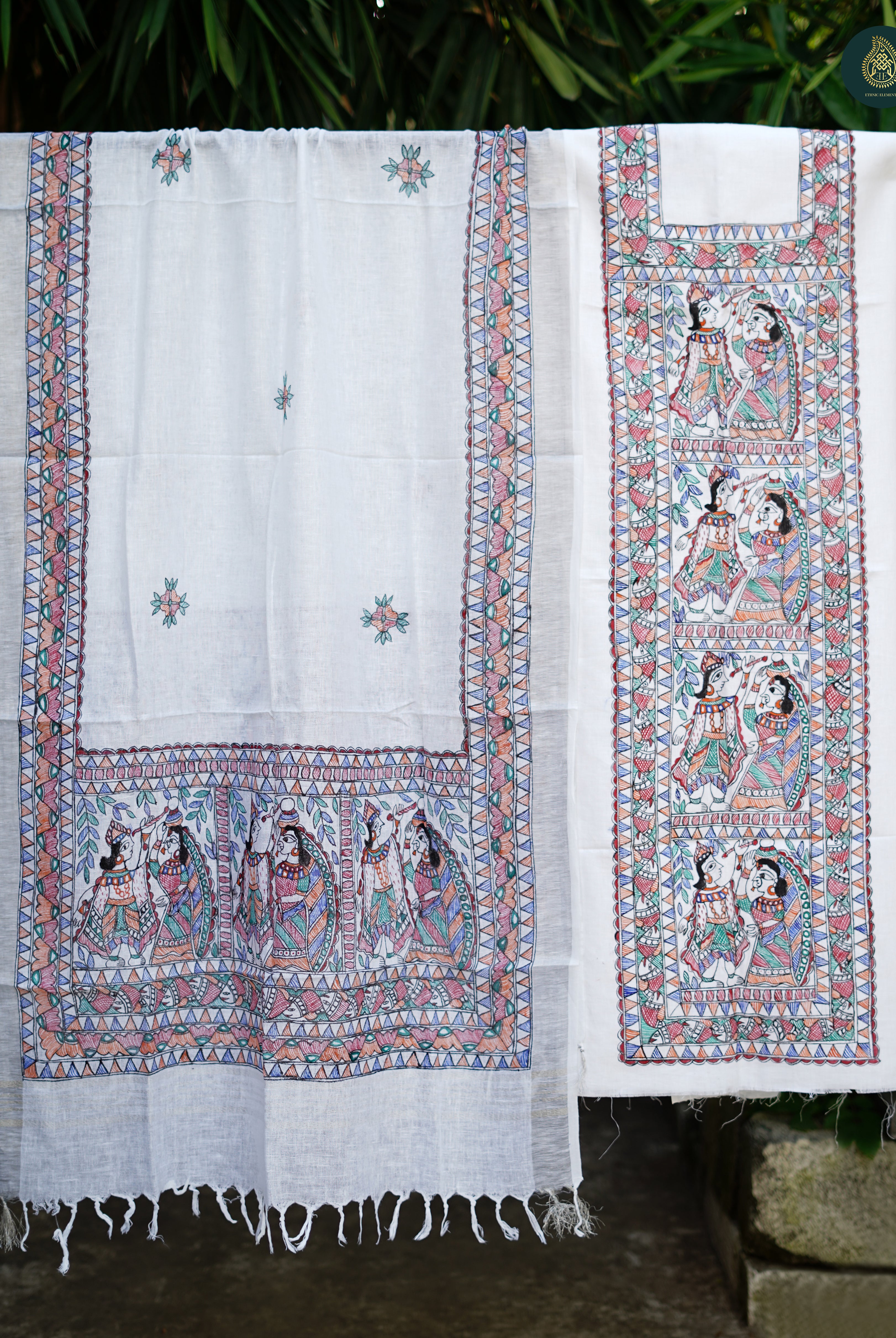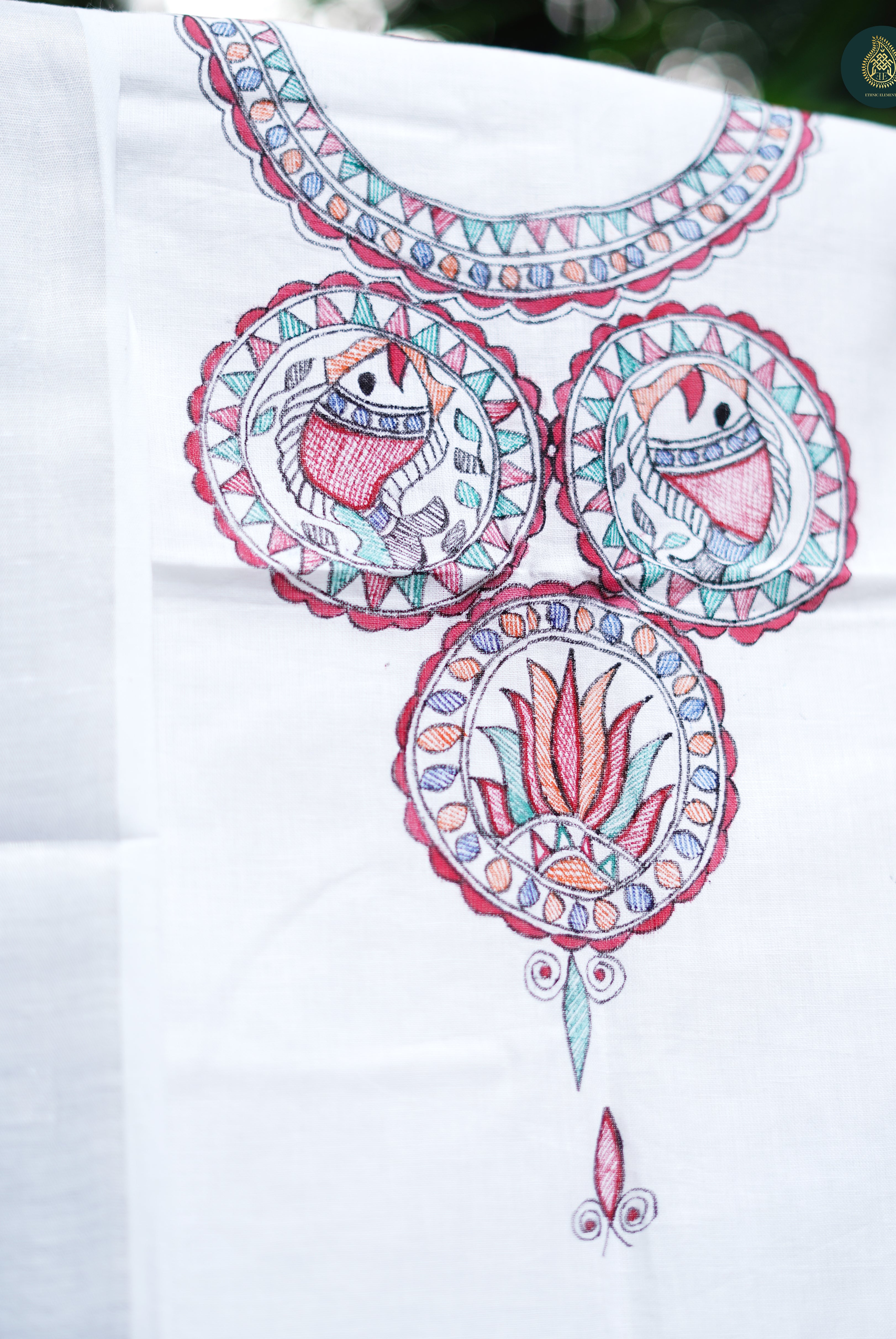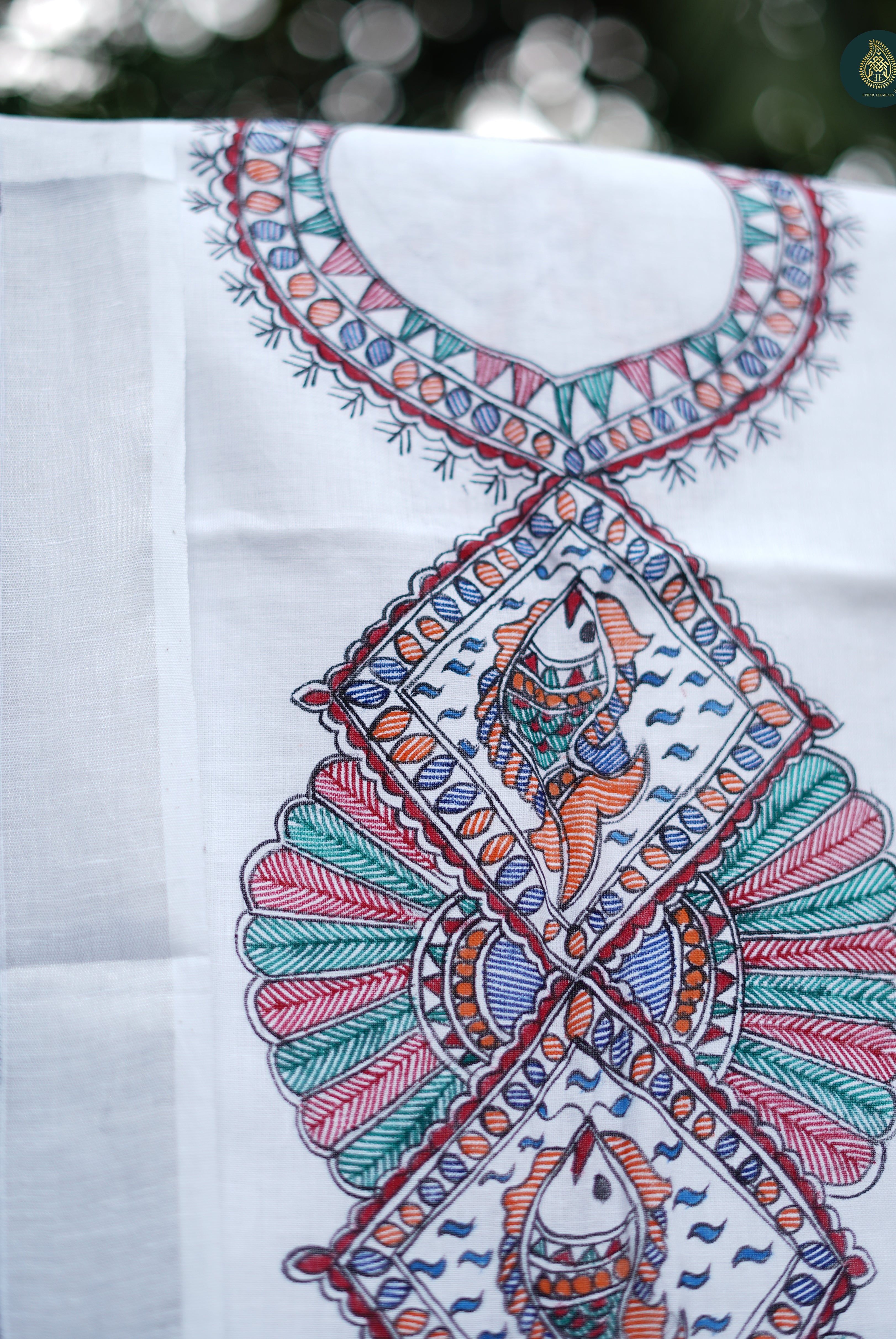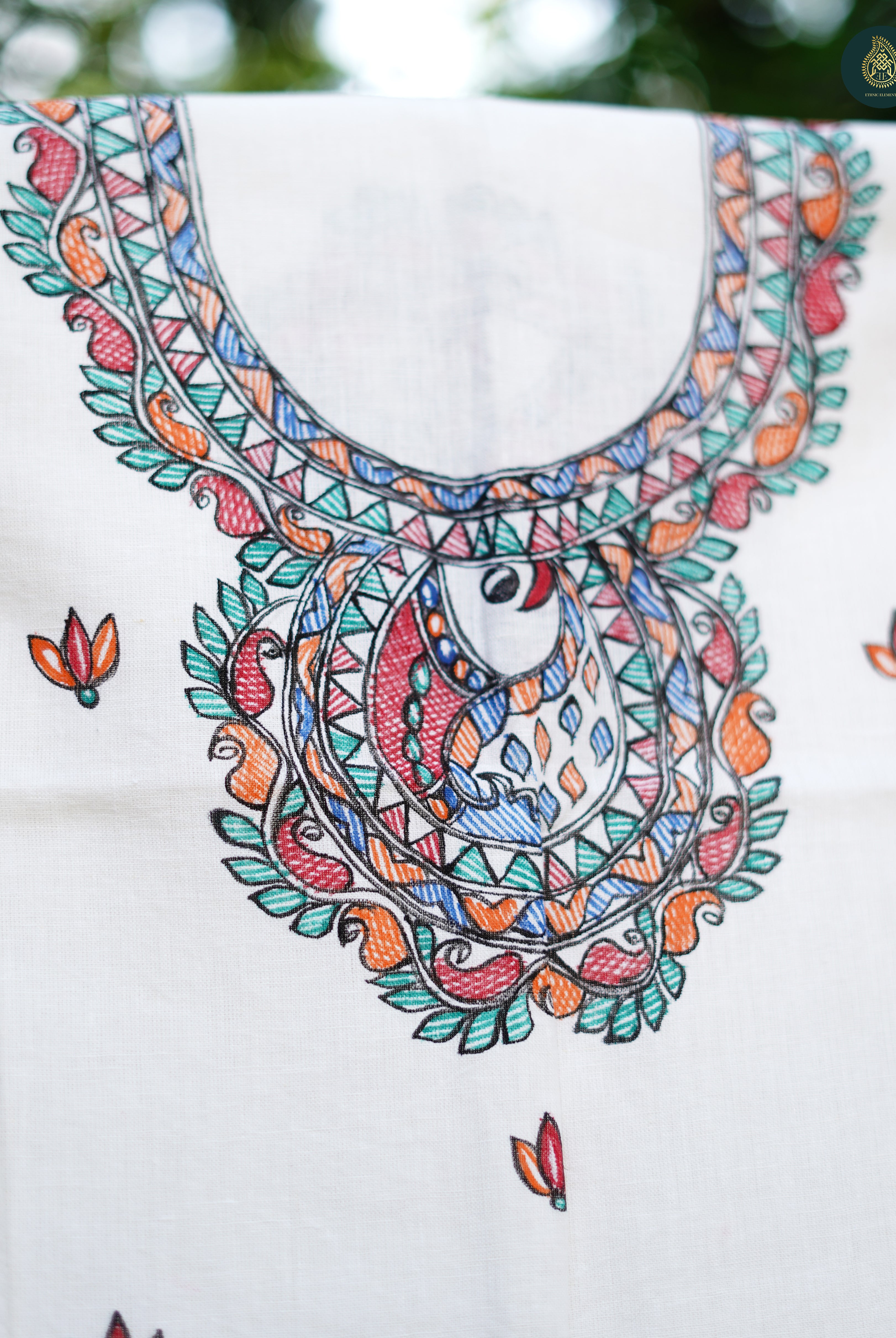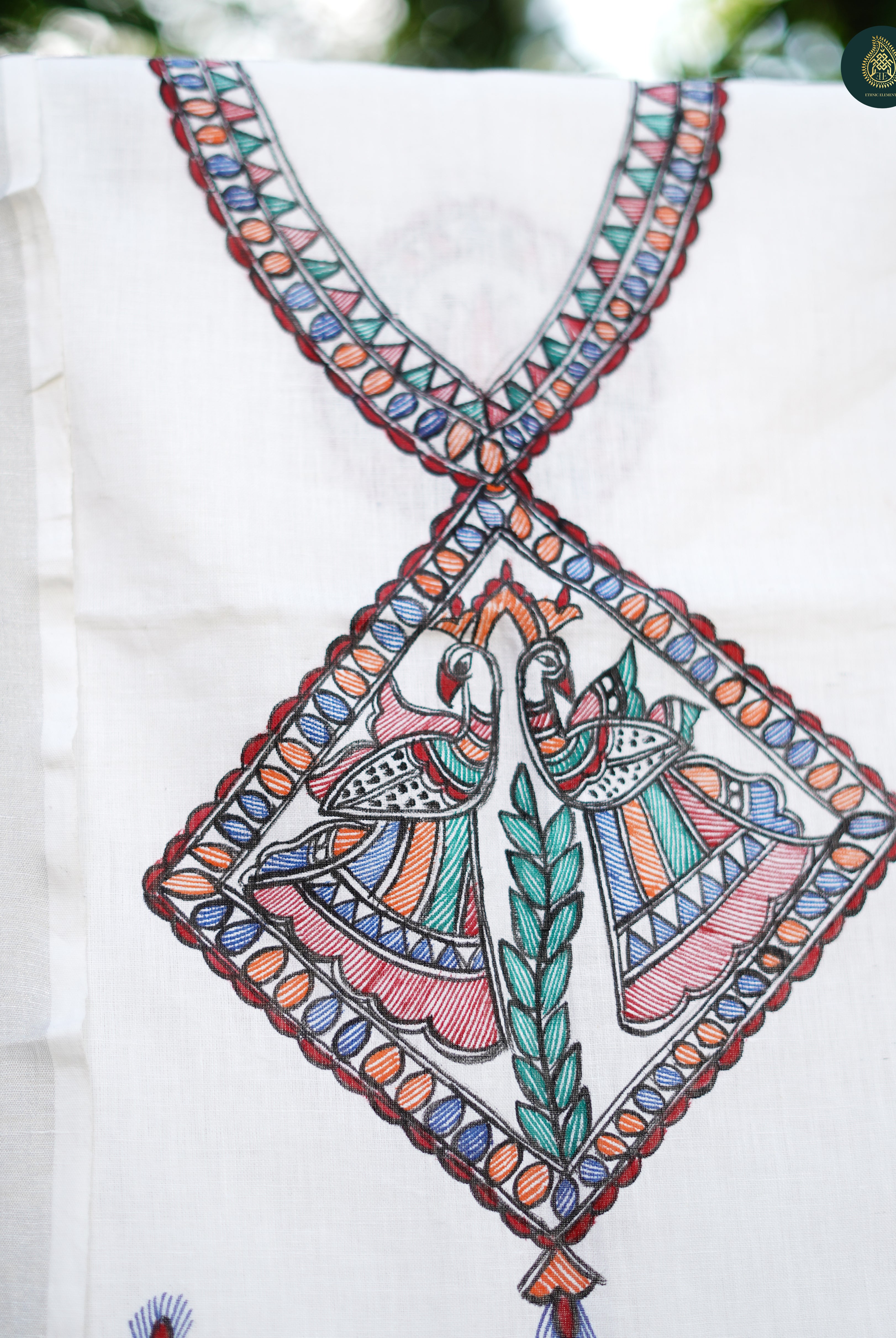 Authentic Original Hand-Painted Madhubani Suit Sets made from pure woven fabrics. Madhubani Art is a type of folk-art form. Each suit consists of line drawings filled with bright colors and contrasts or patterns. Only natural dyes and pigments are used for fabric color and painting.