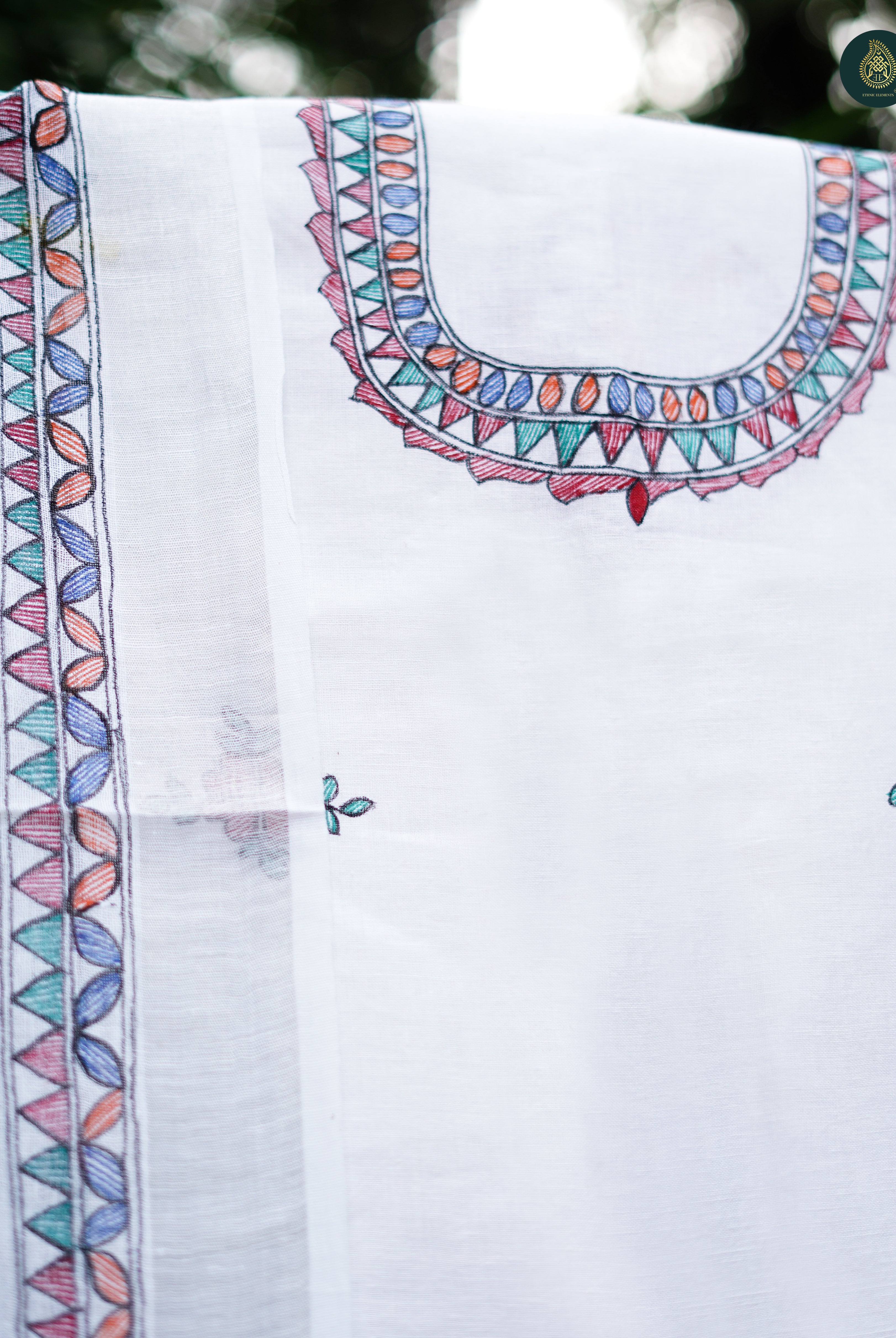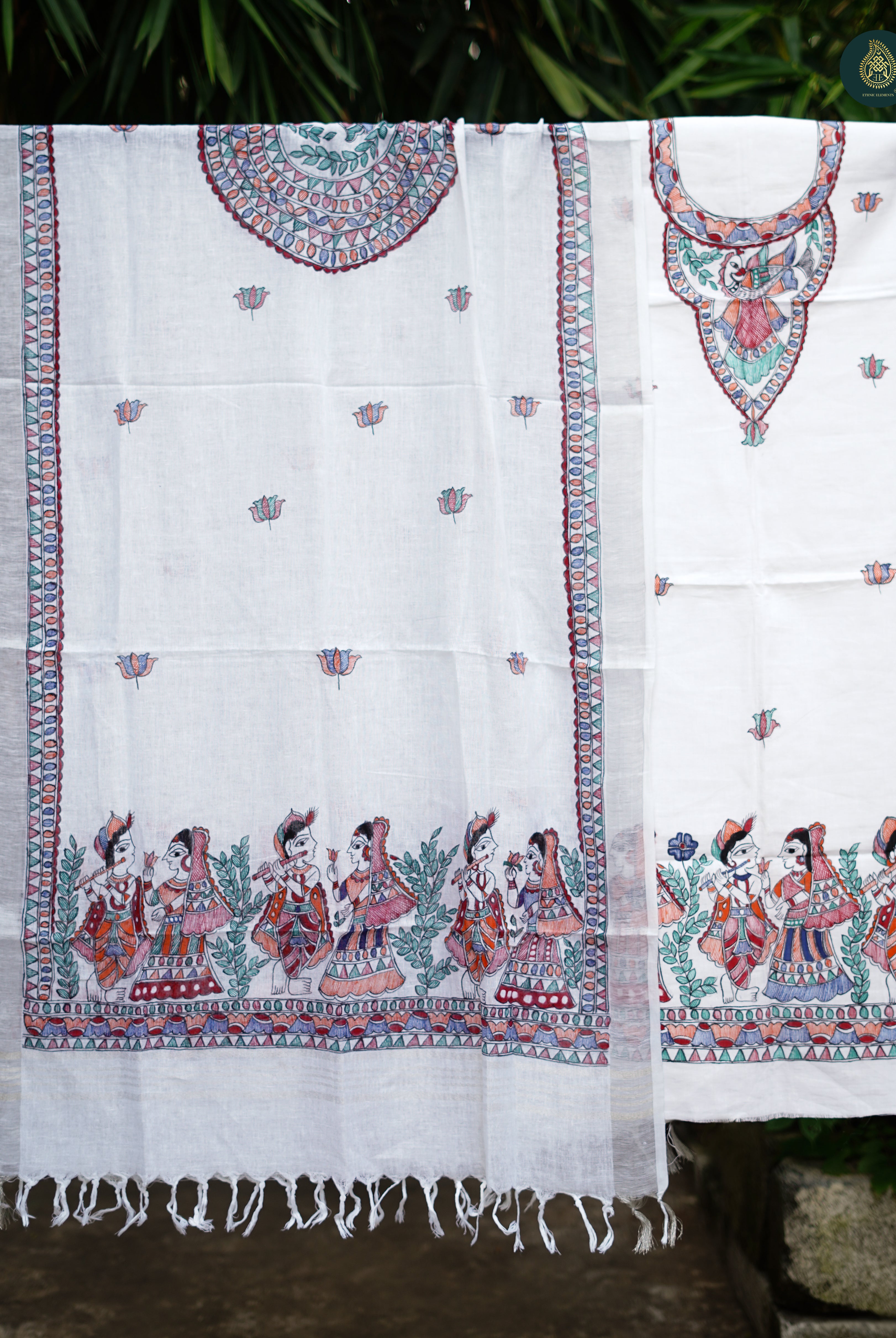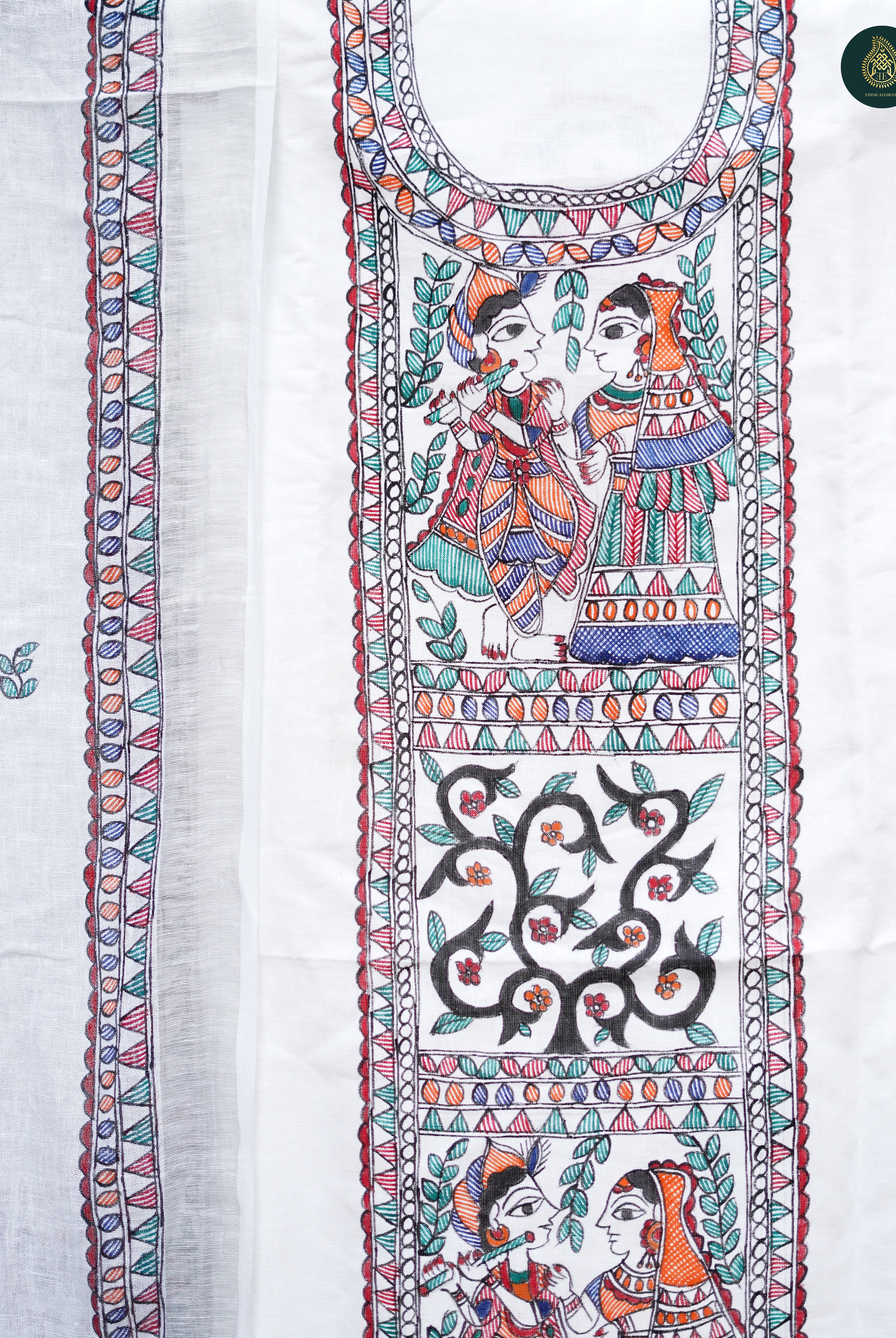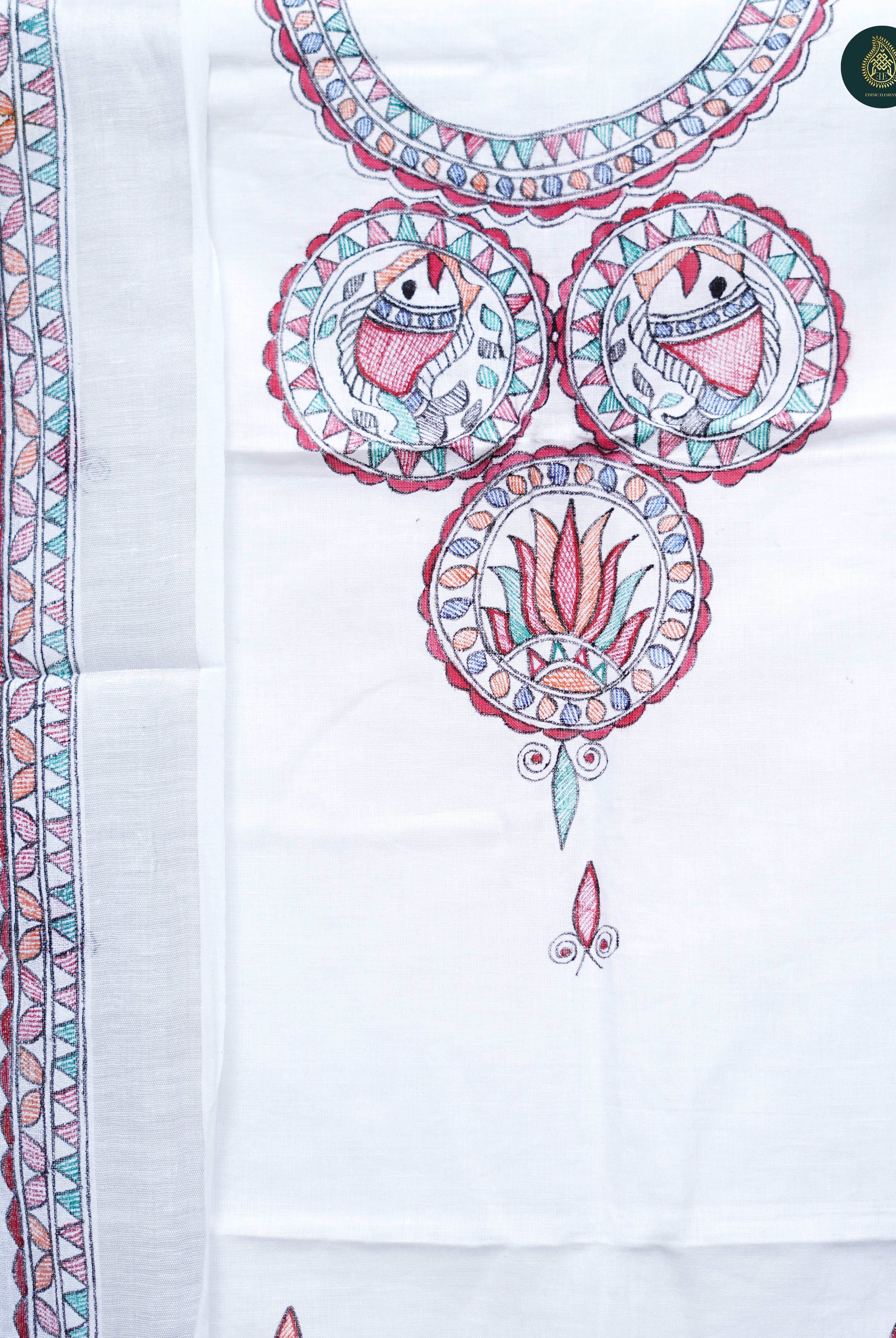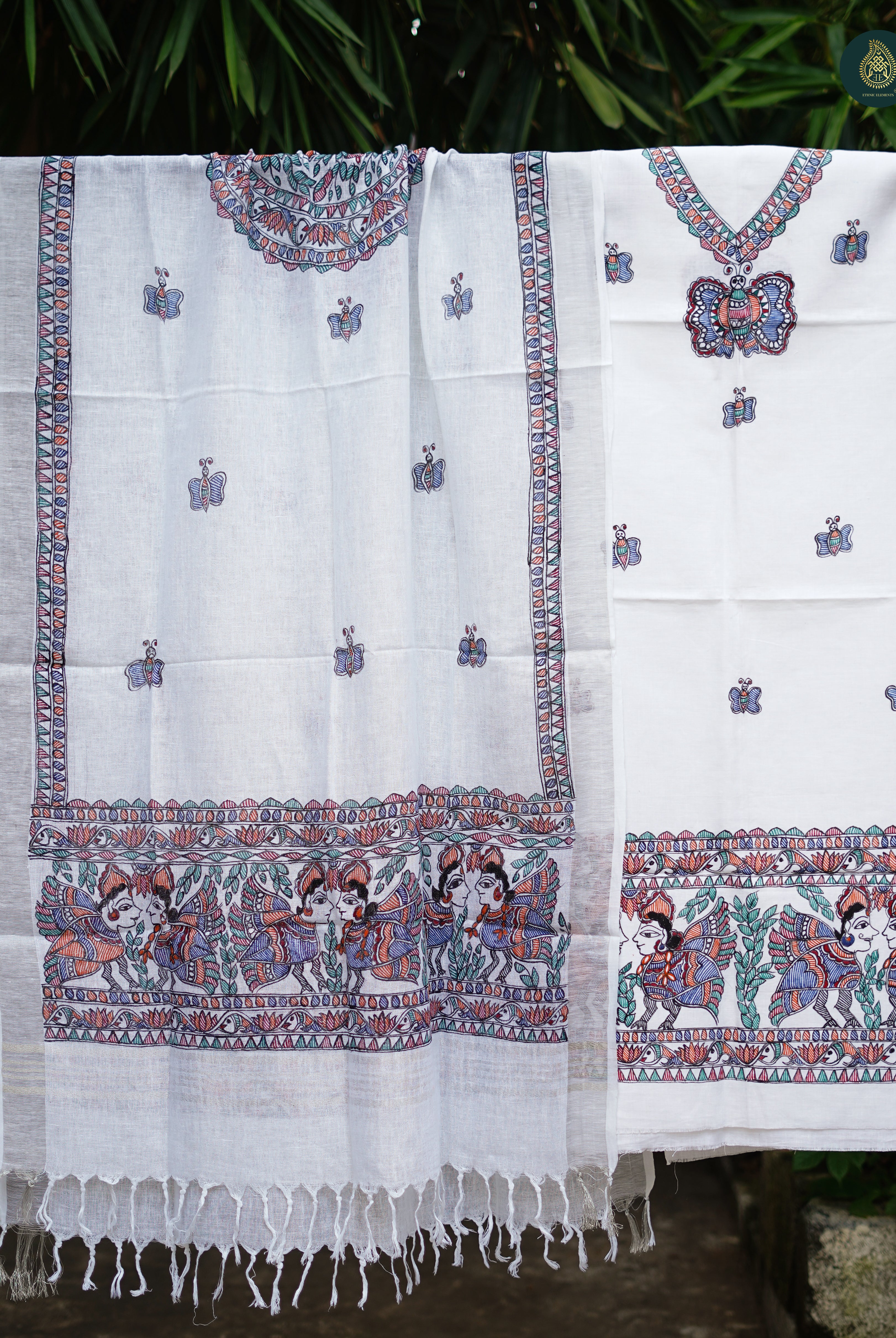 Authentic Original Hand-Painted Madhubani Suit Sets made from pure woven fabrics. Madhubani Art is a type of folk-art form. Each suit consists of line drawings filled with bright colors and contrasts or patterns. Only natural dyes and pigments are used for fabric color and painting.