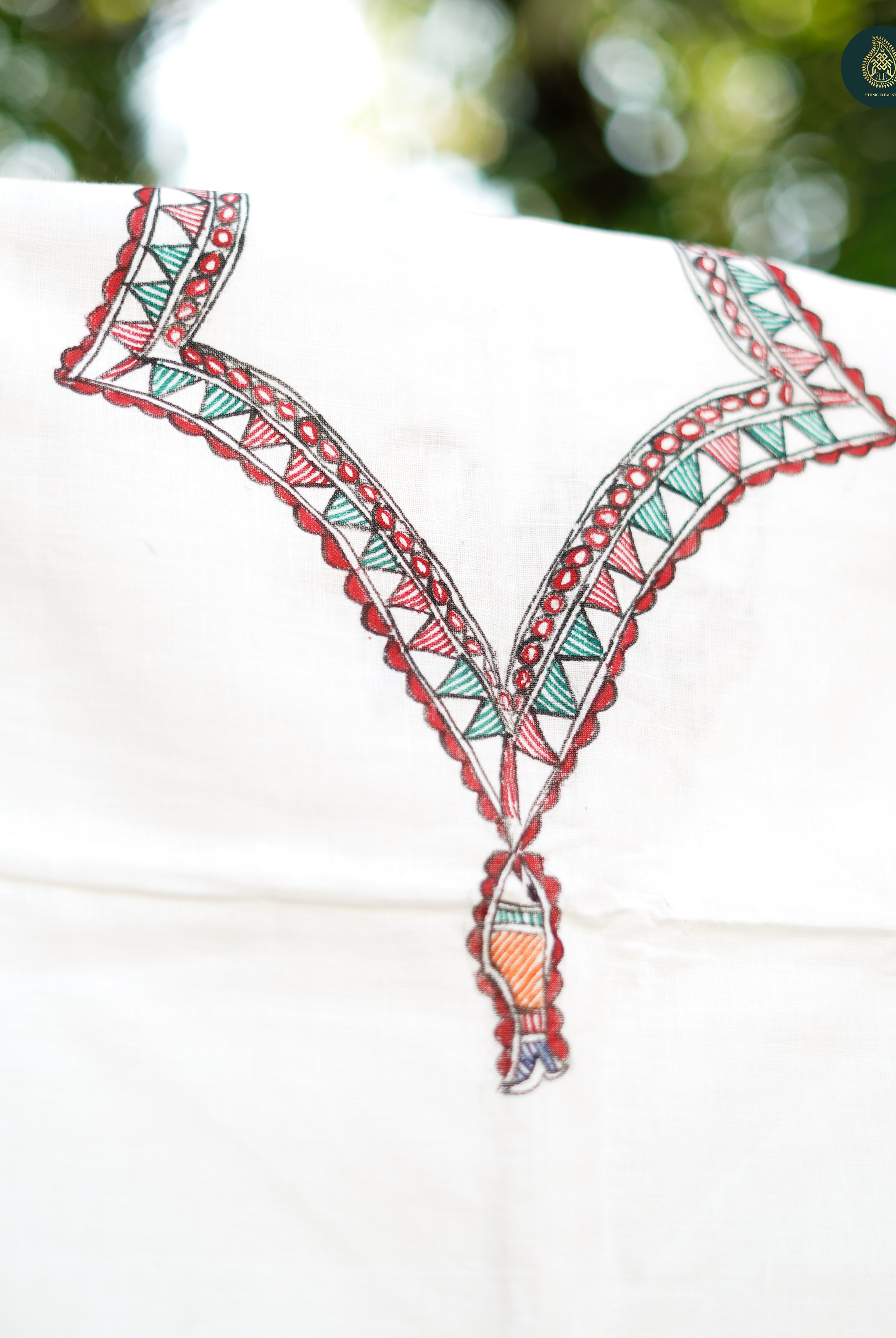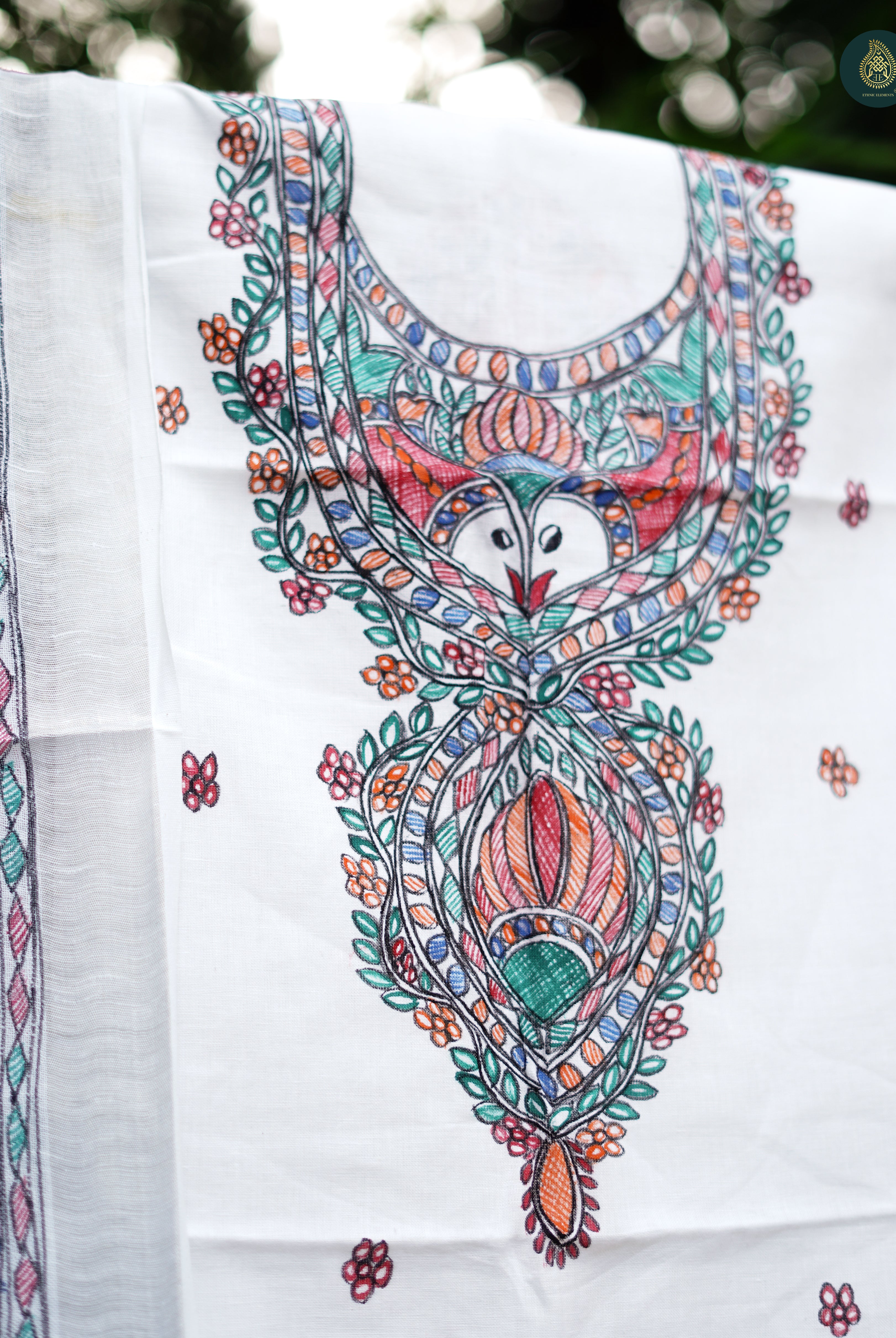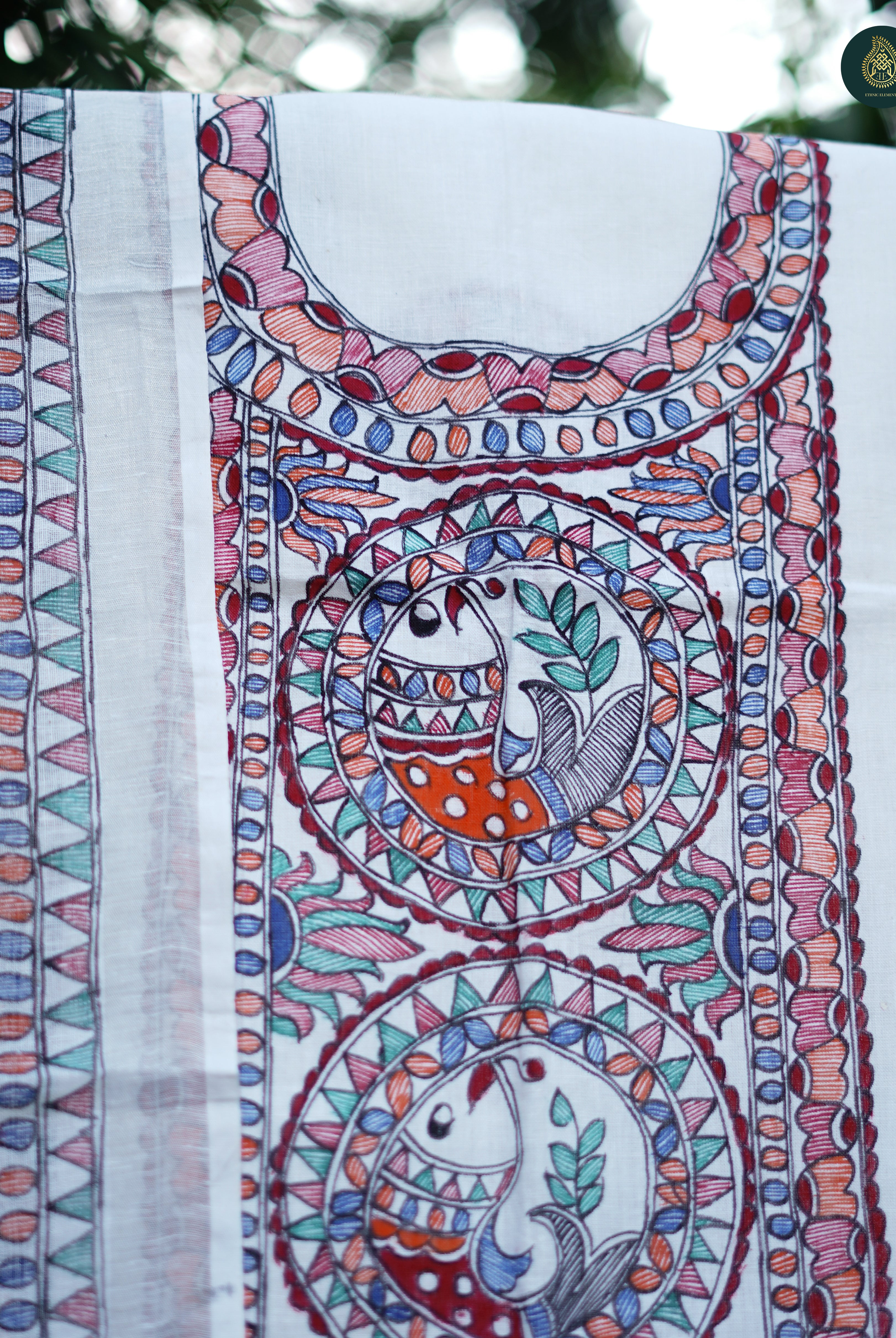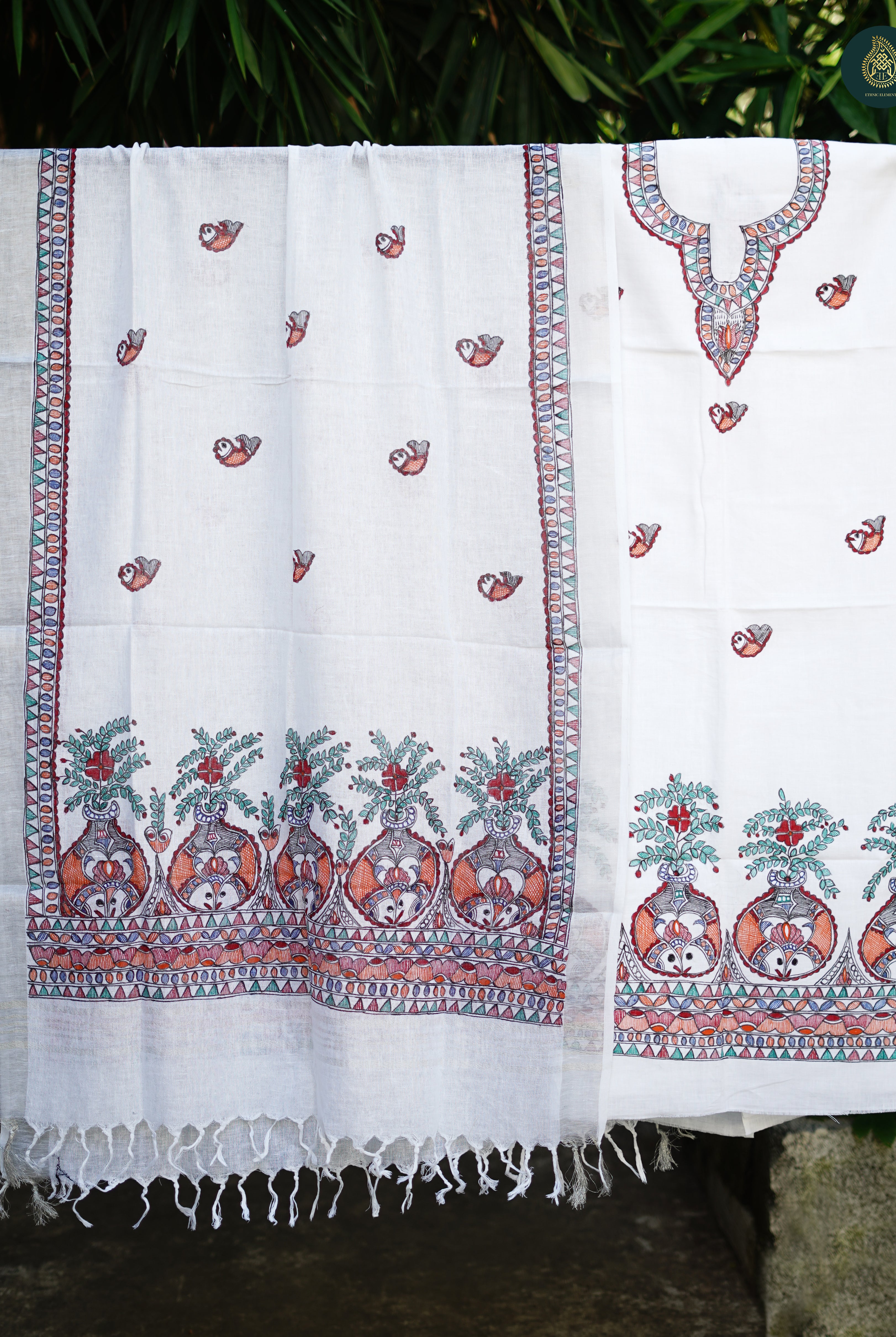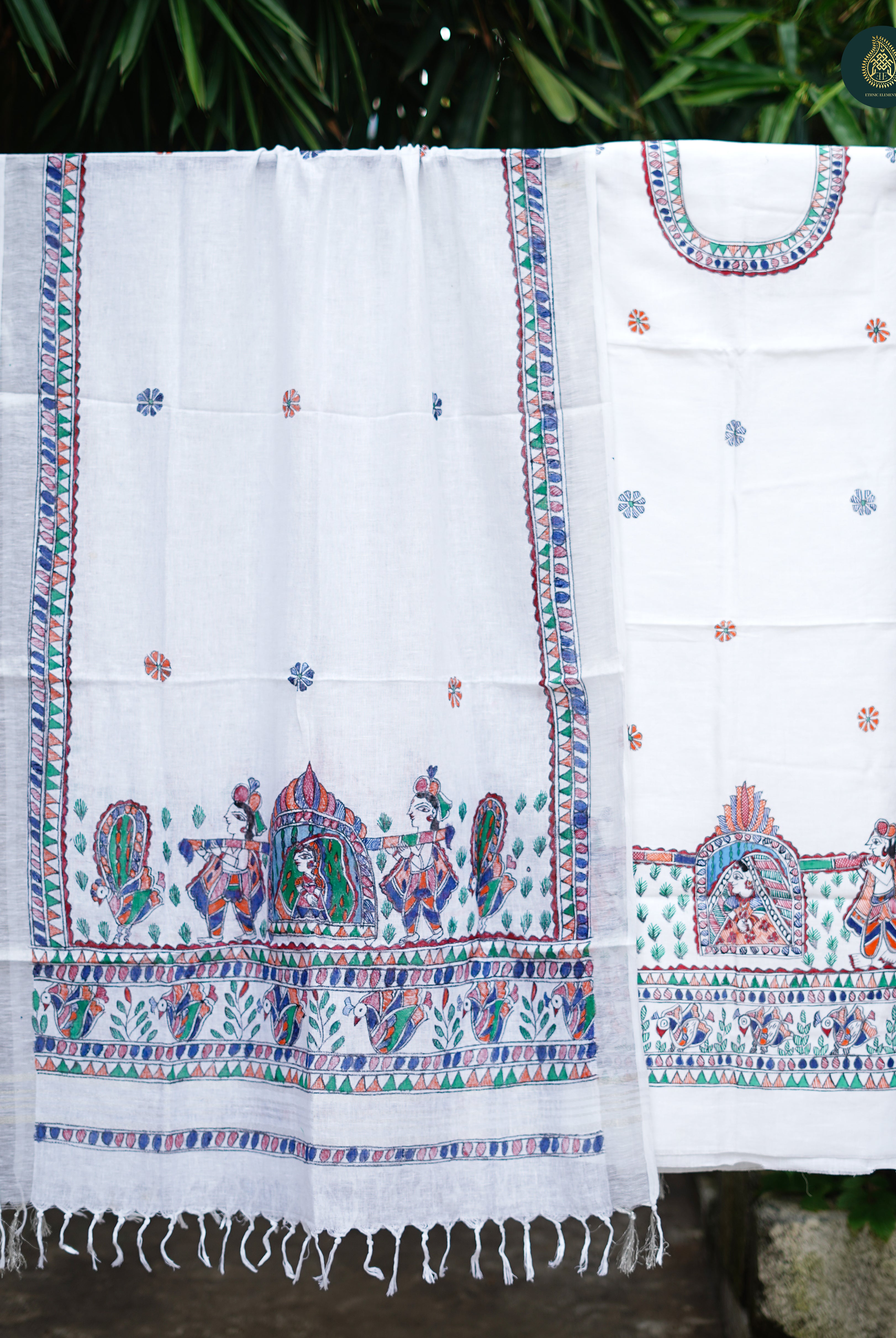 Authentic Original Hand-Painted Madhubani Suit Sets made from pure woven fabrics. Madhubani Art is a type of folk-art form. Each suit consists of line drawings filled with bright colors and contrasts or patterns. Only natural dyes and pigments are used for fabric color and painting.