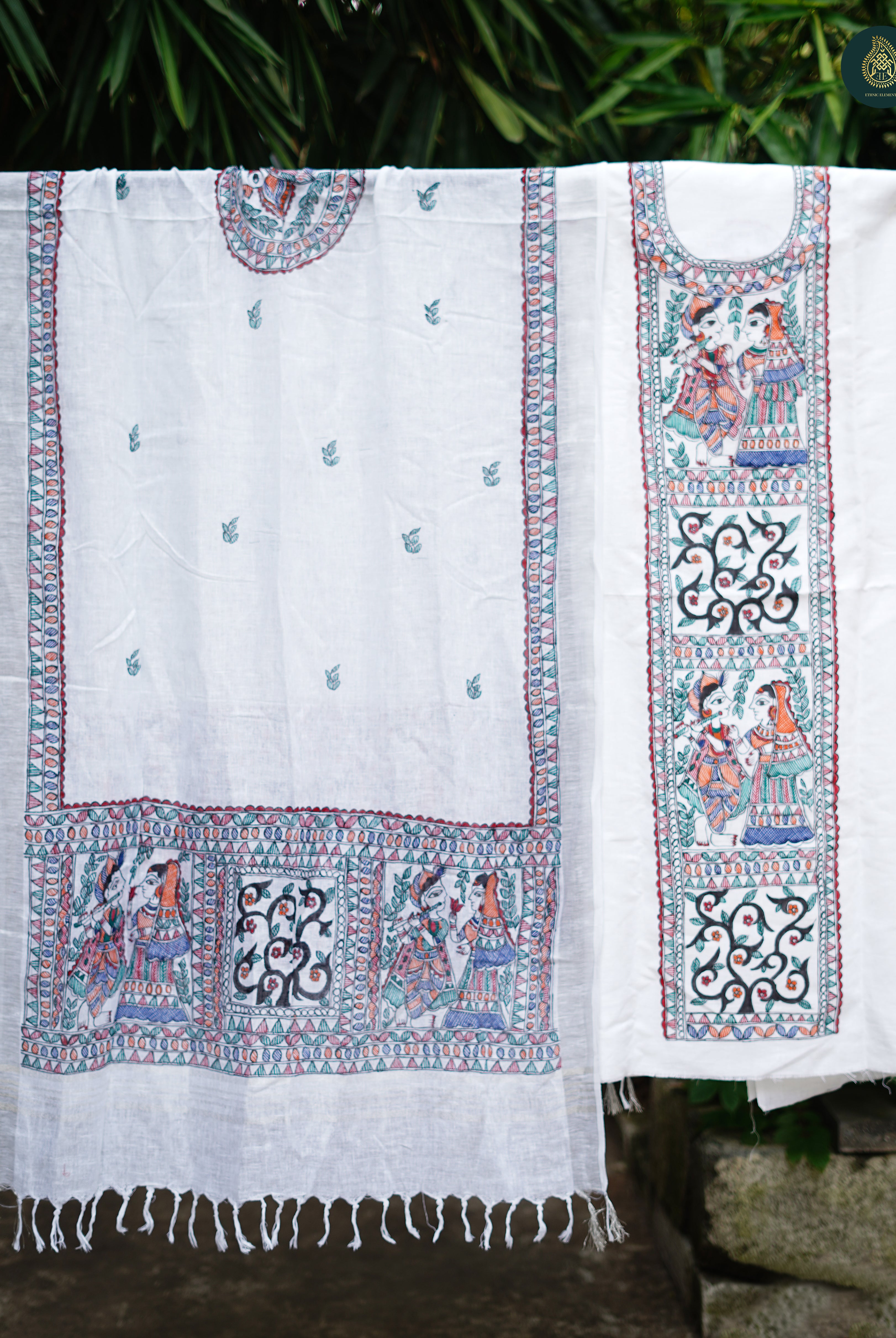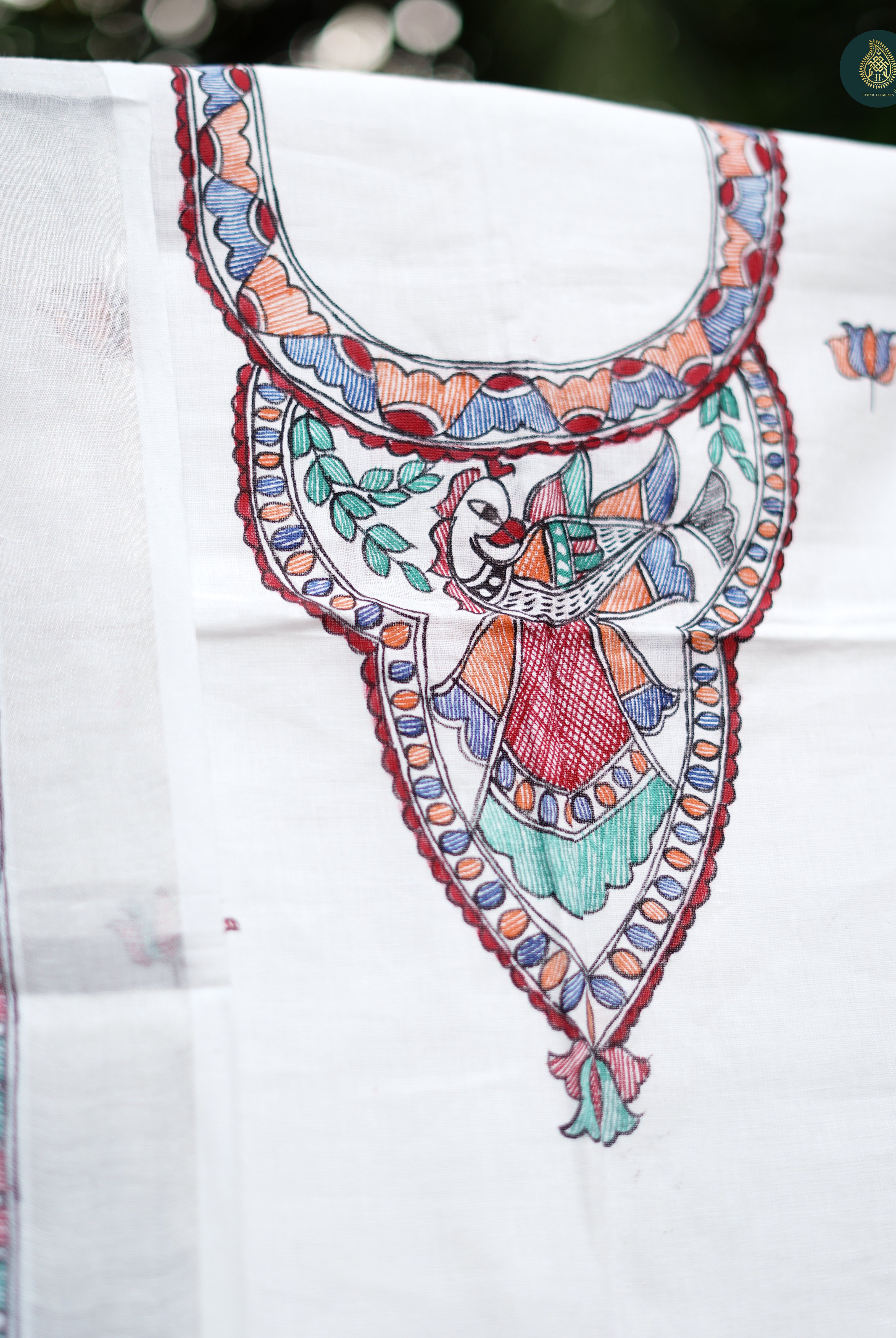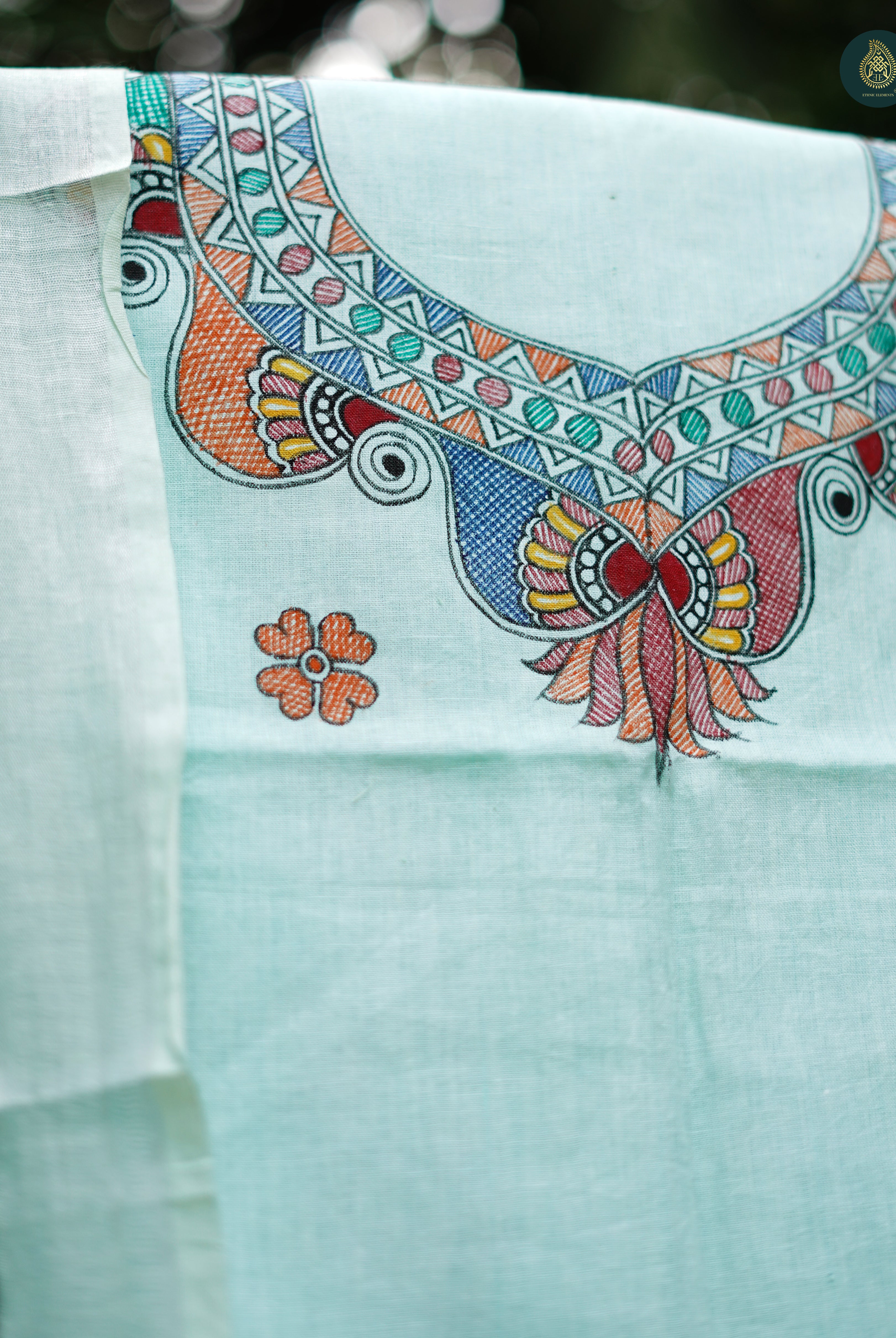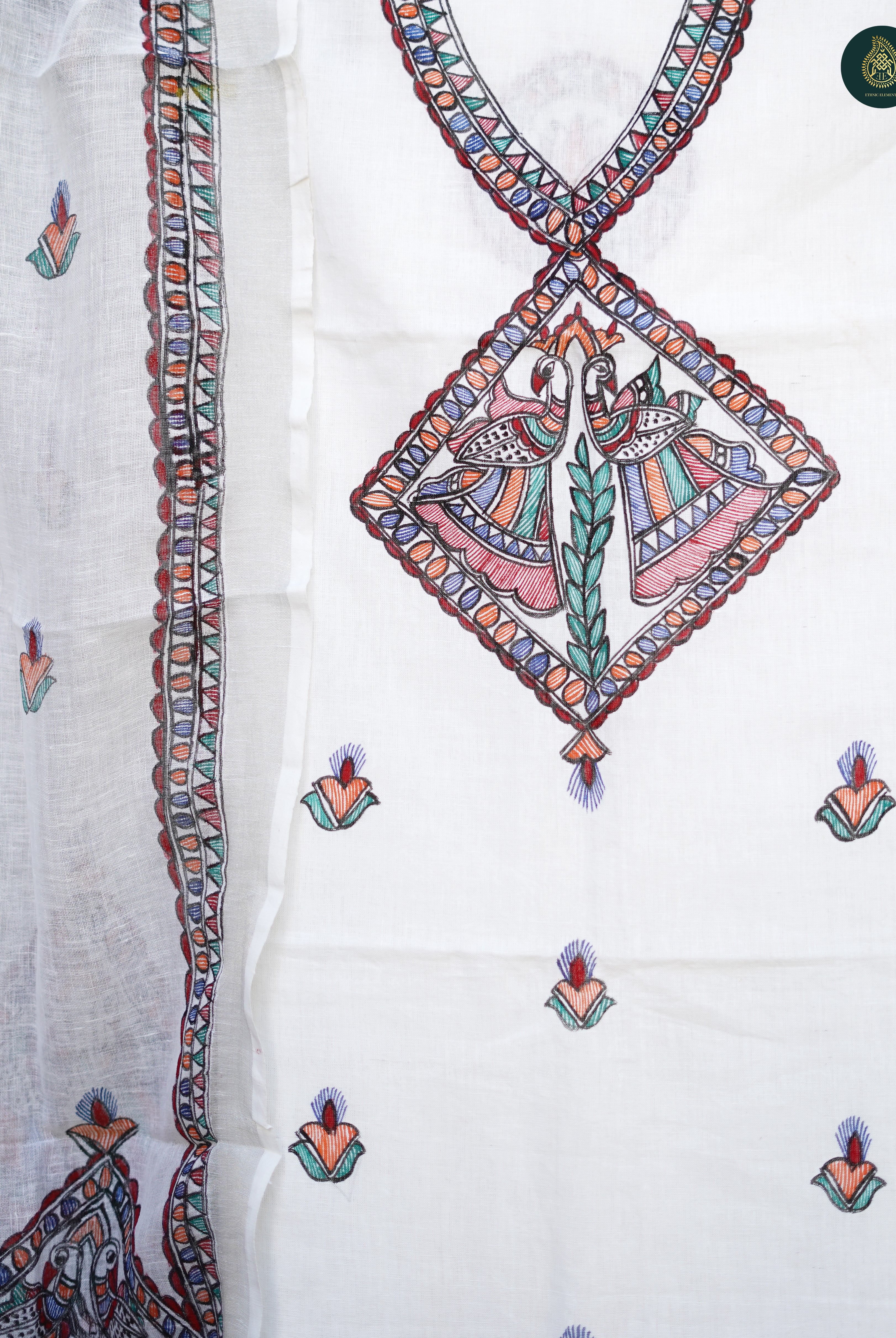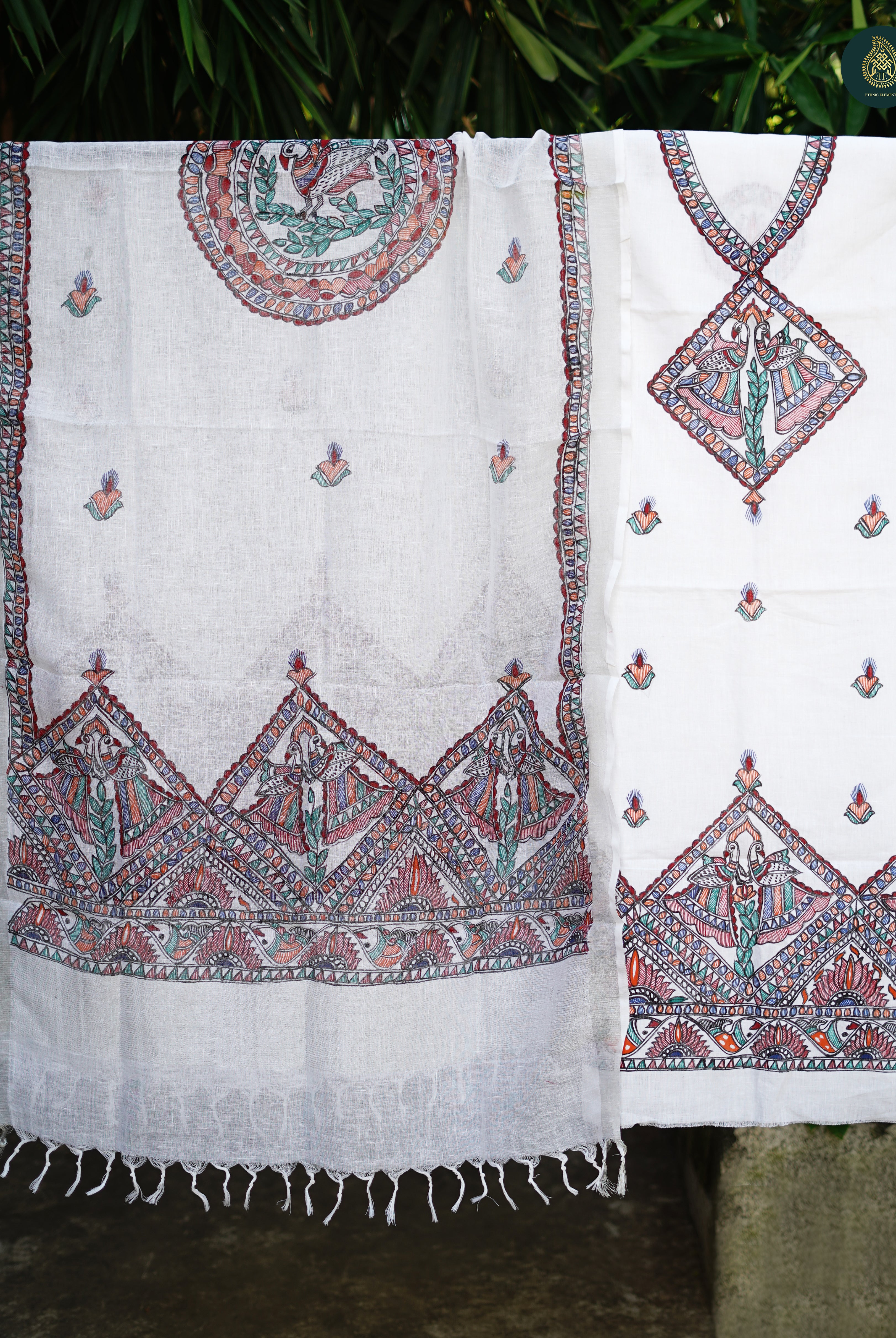 Authentic Original Hand-Painted Madhubani Suit Sets made from pure woven fabrics. Madhubani Art is a type of folk-art form. Each suit consists of line drawings filled with bright colors and contrasts or patterns. Only natural dyes and pigments are used for fabric color and painting.