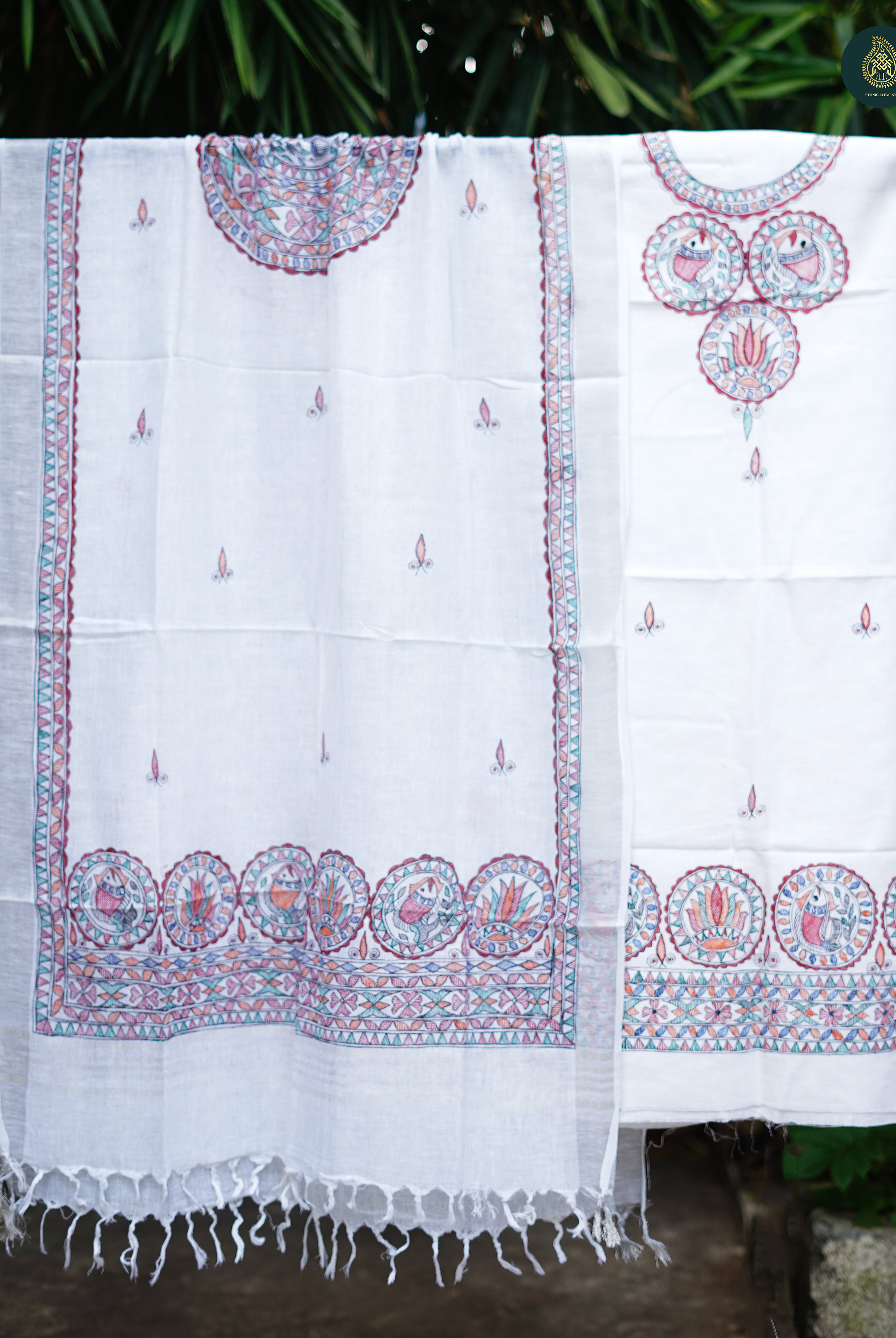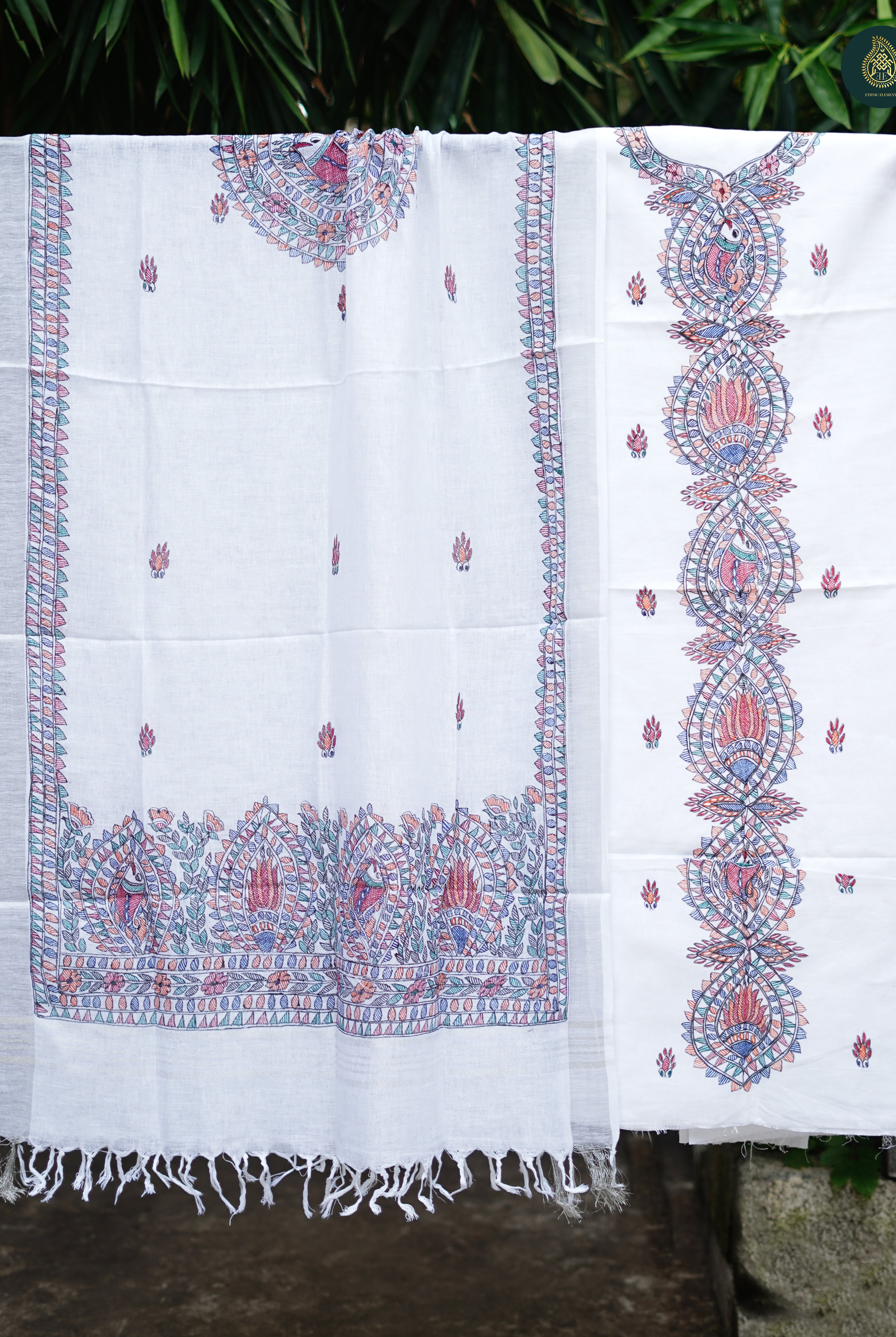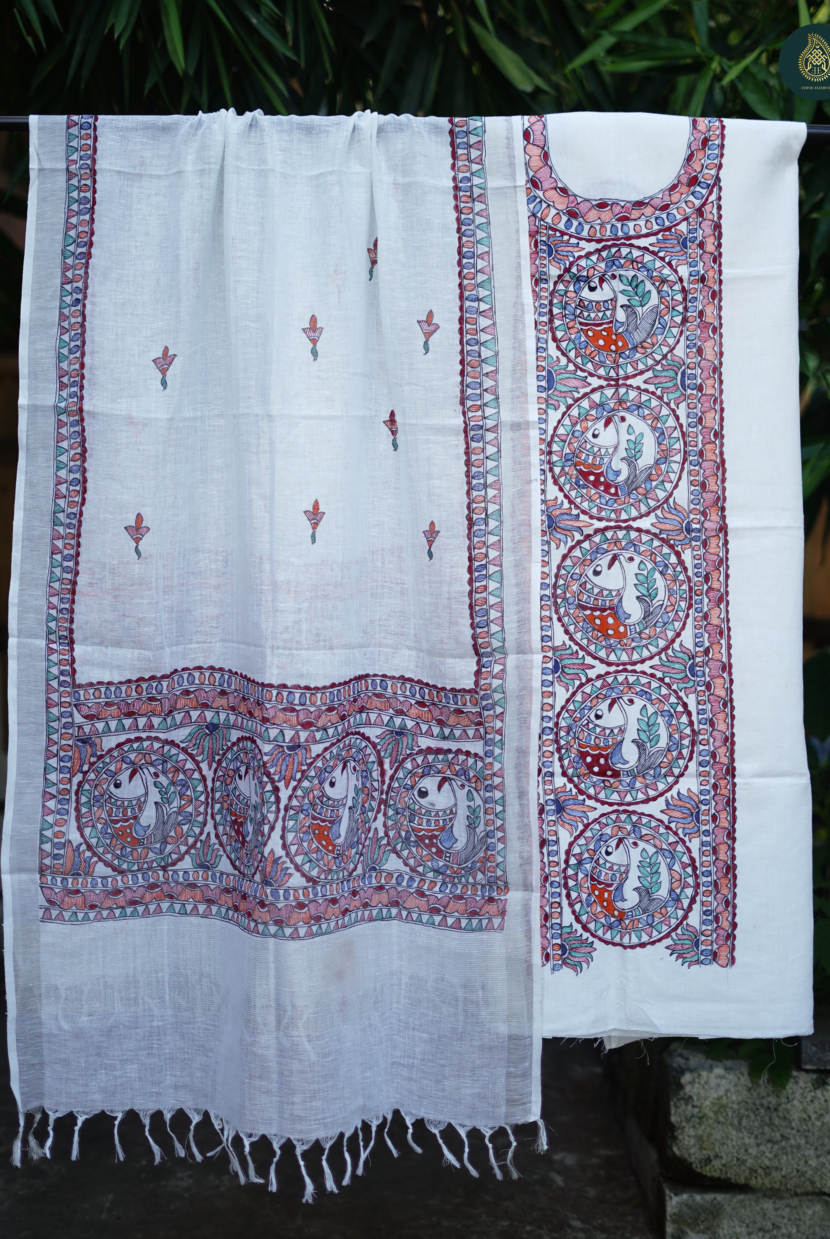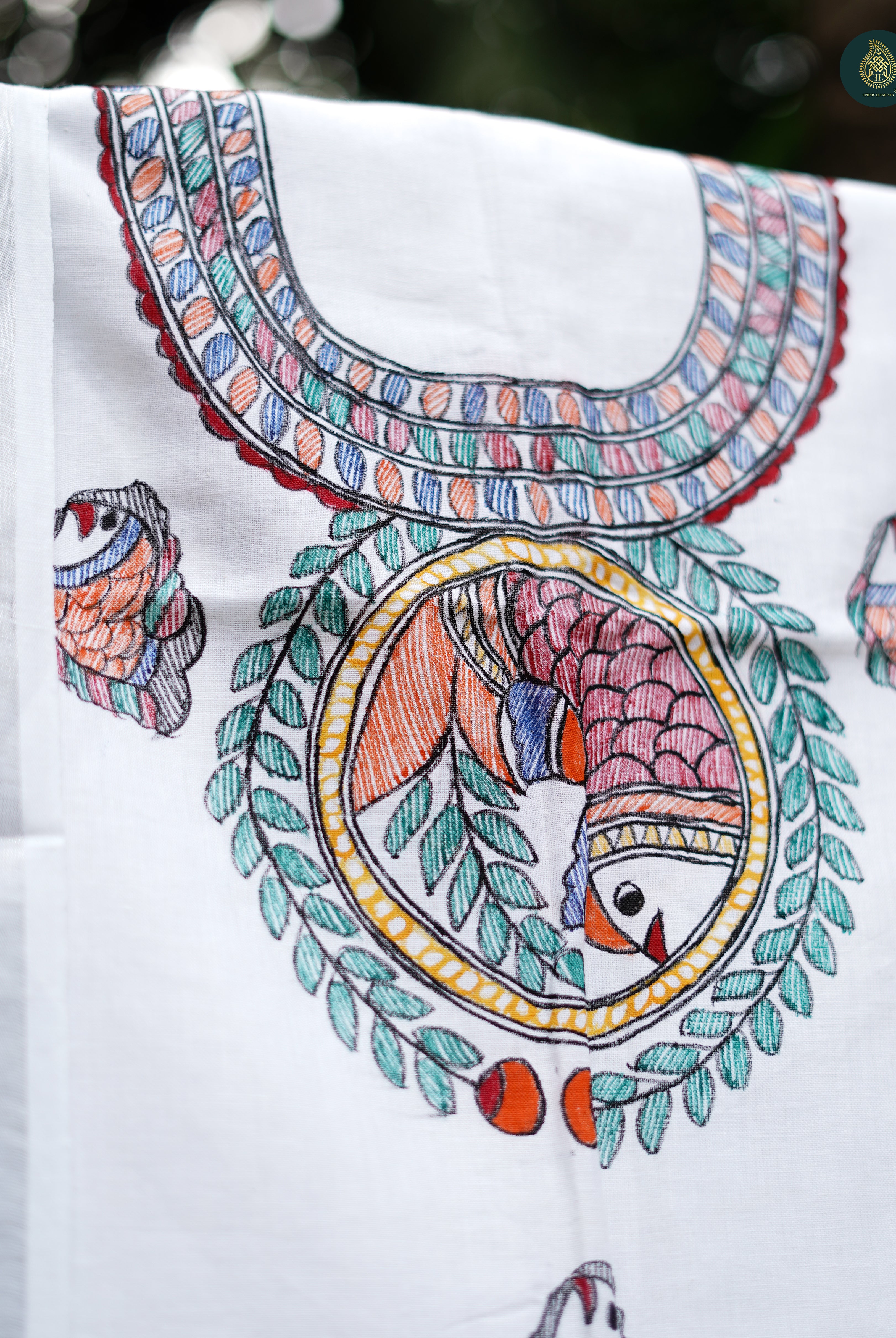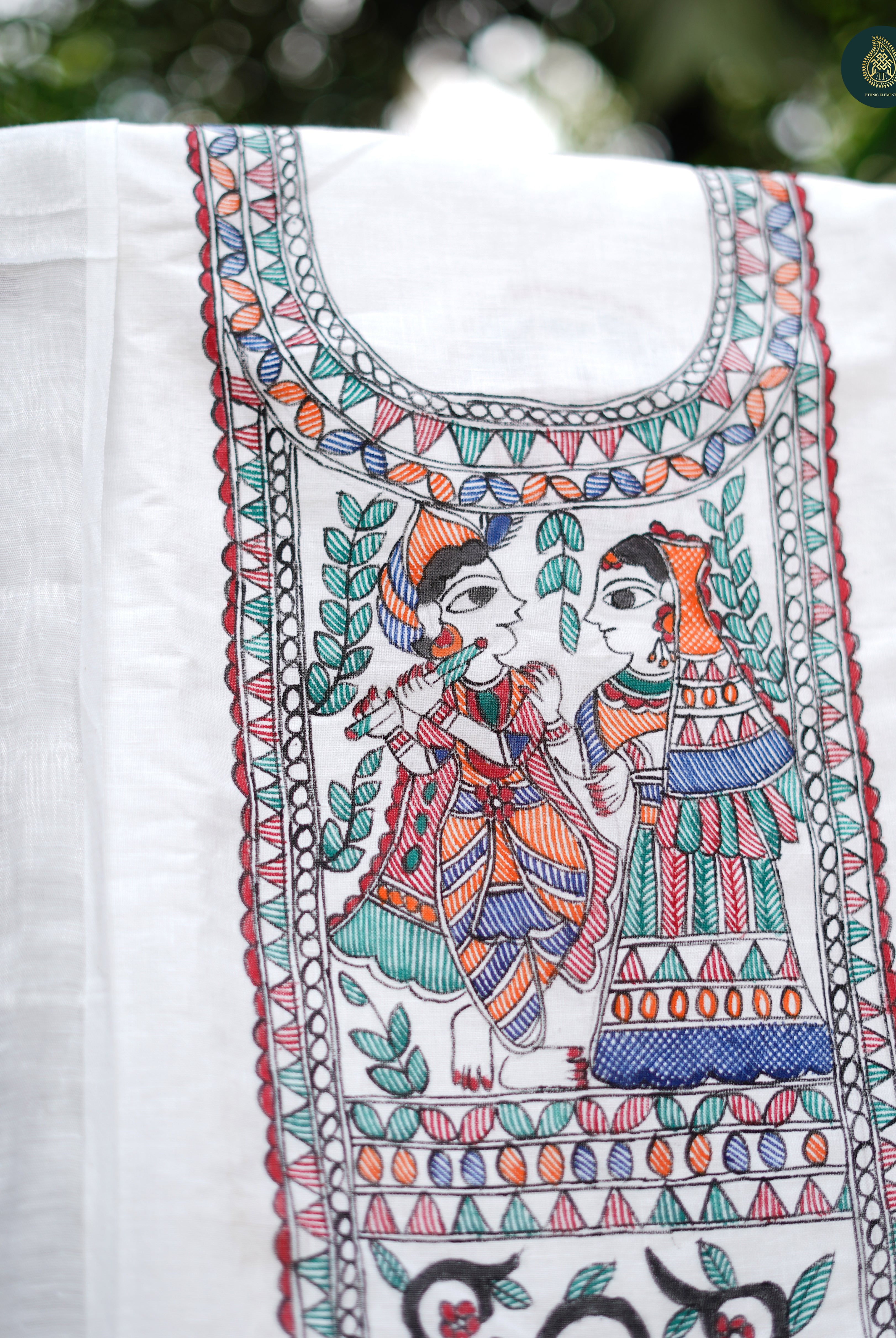 Authentic Original Hand-Painted Madhubani Suit Sets made from pure woven fabrics. Madhubani Art is a type of folk-art form. Each suit consists of line drawings filled with bright colors and contrasts or patterns. Only natural dyes and pigments are used for fabric color and painting.