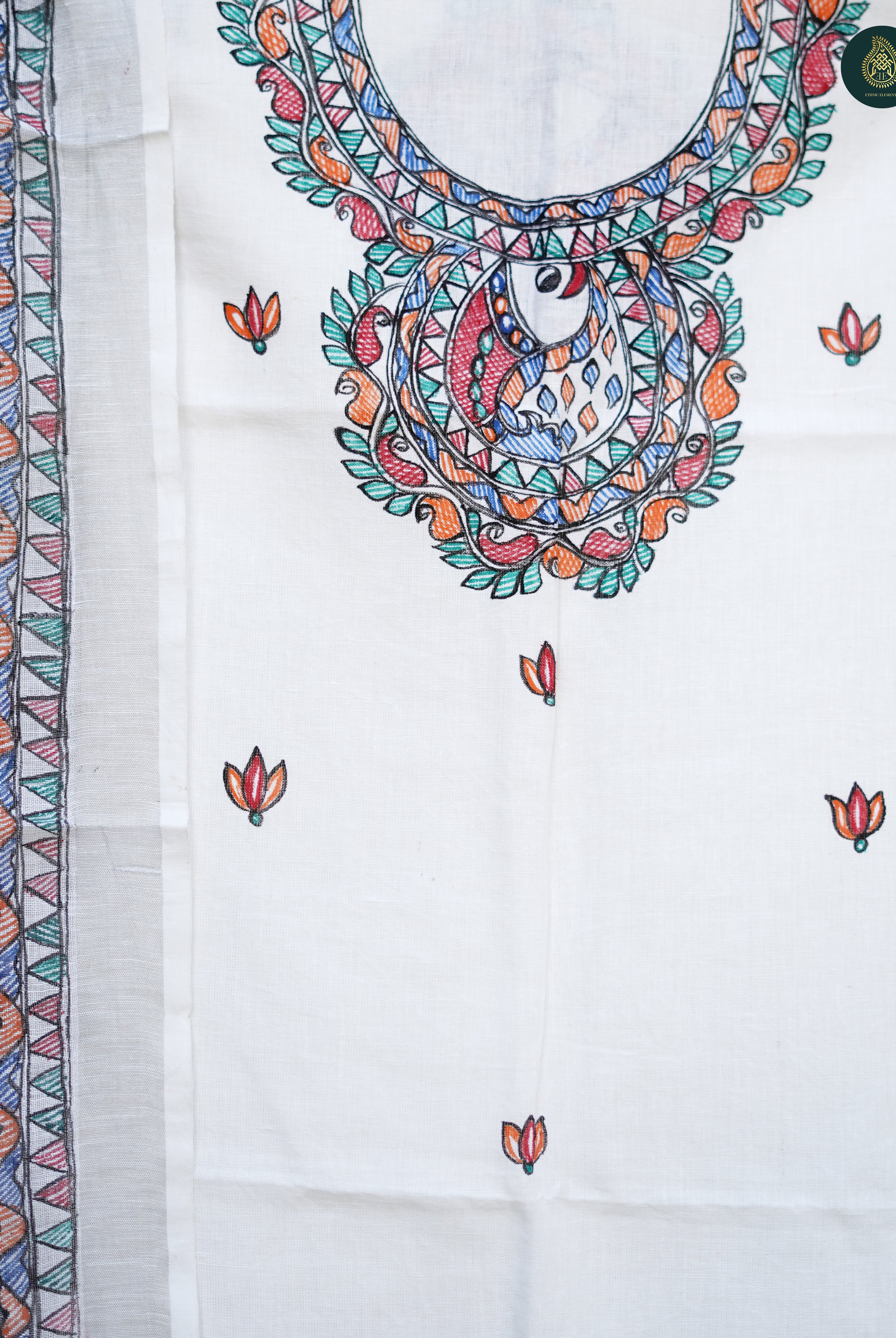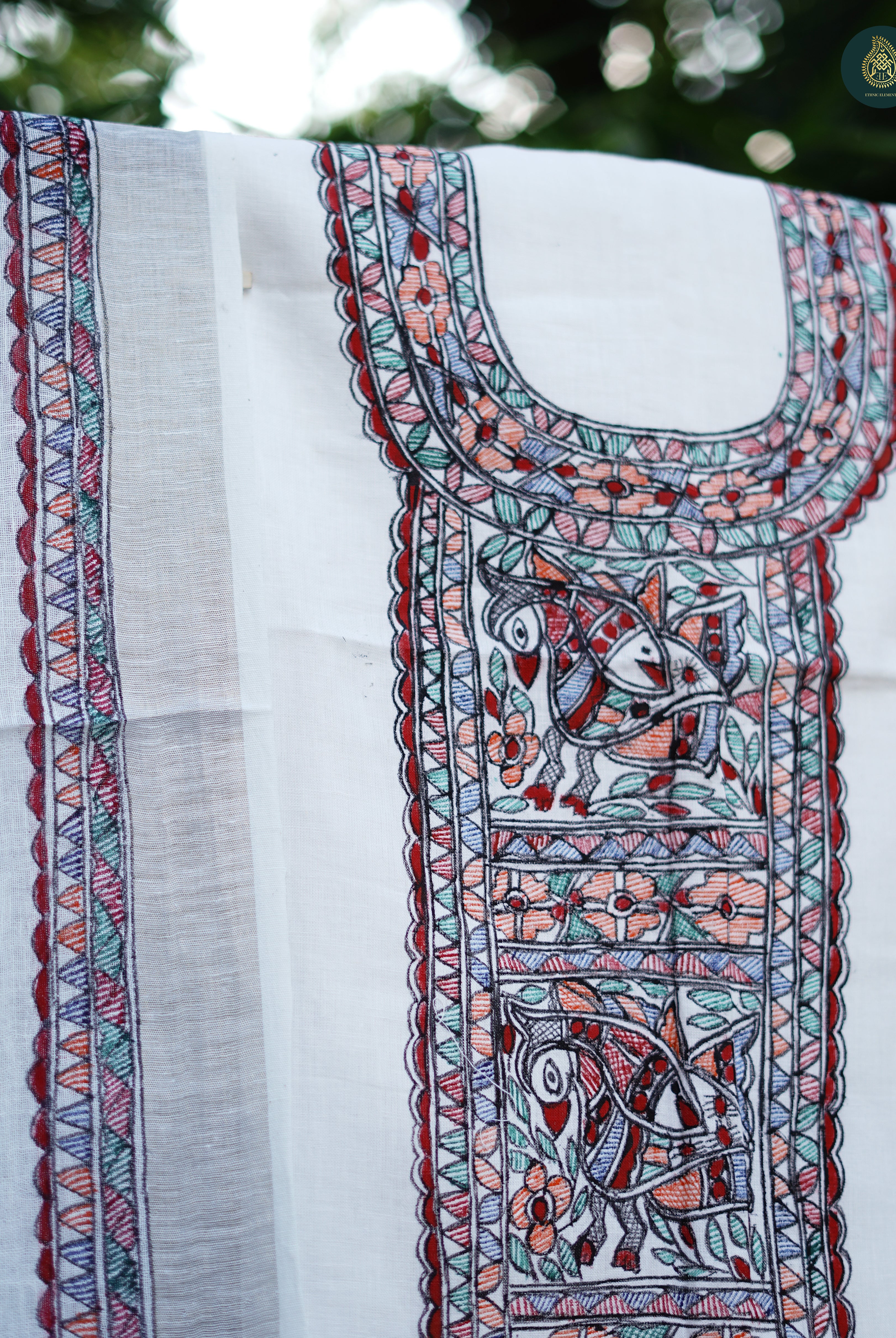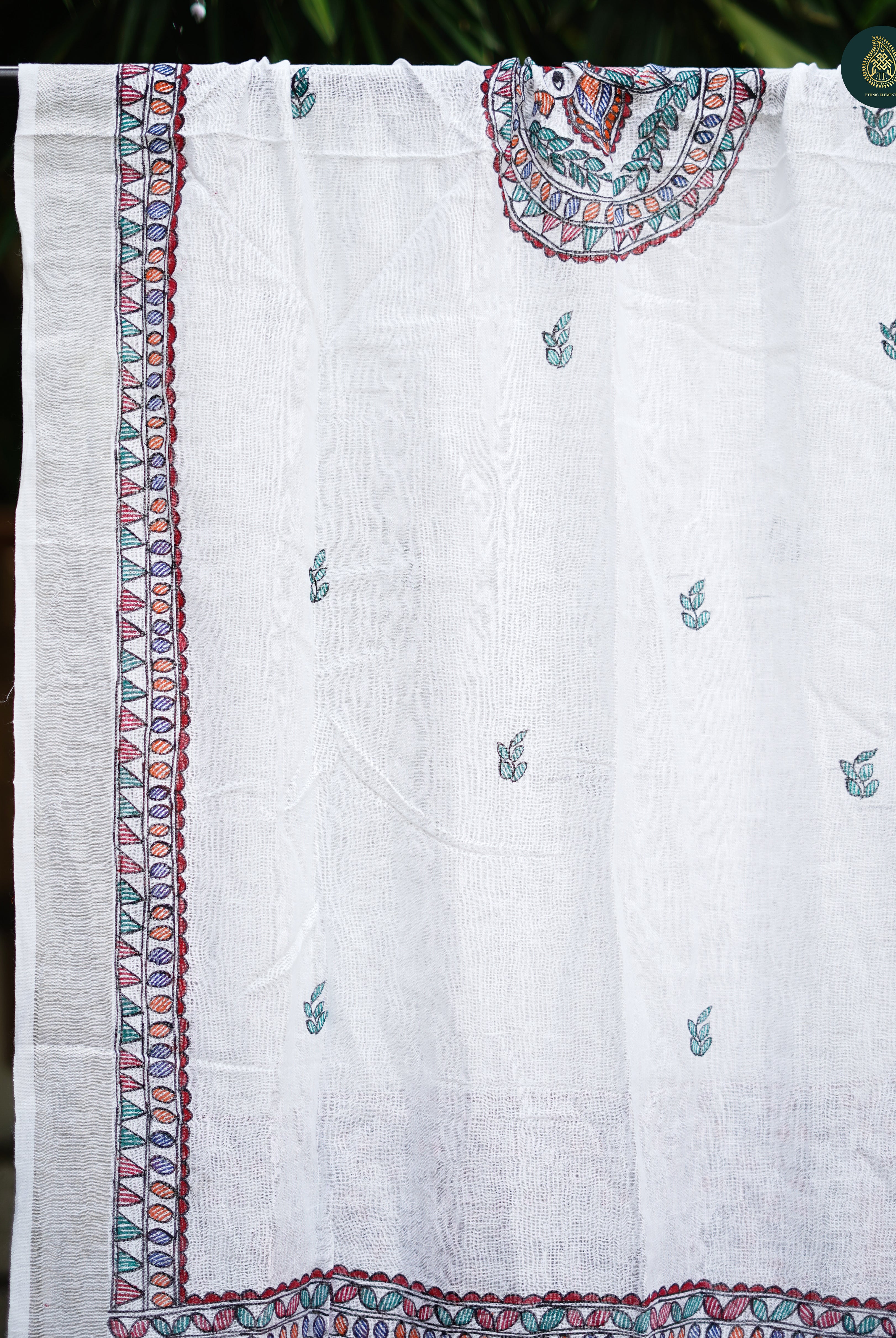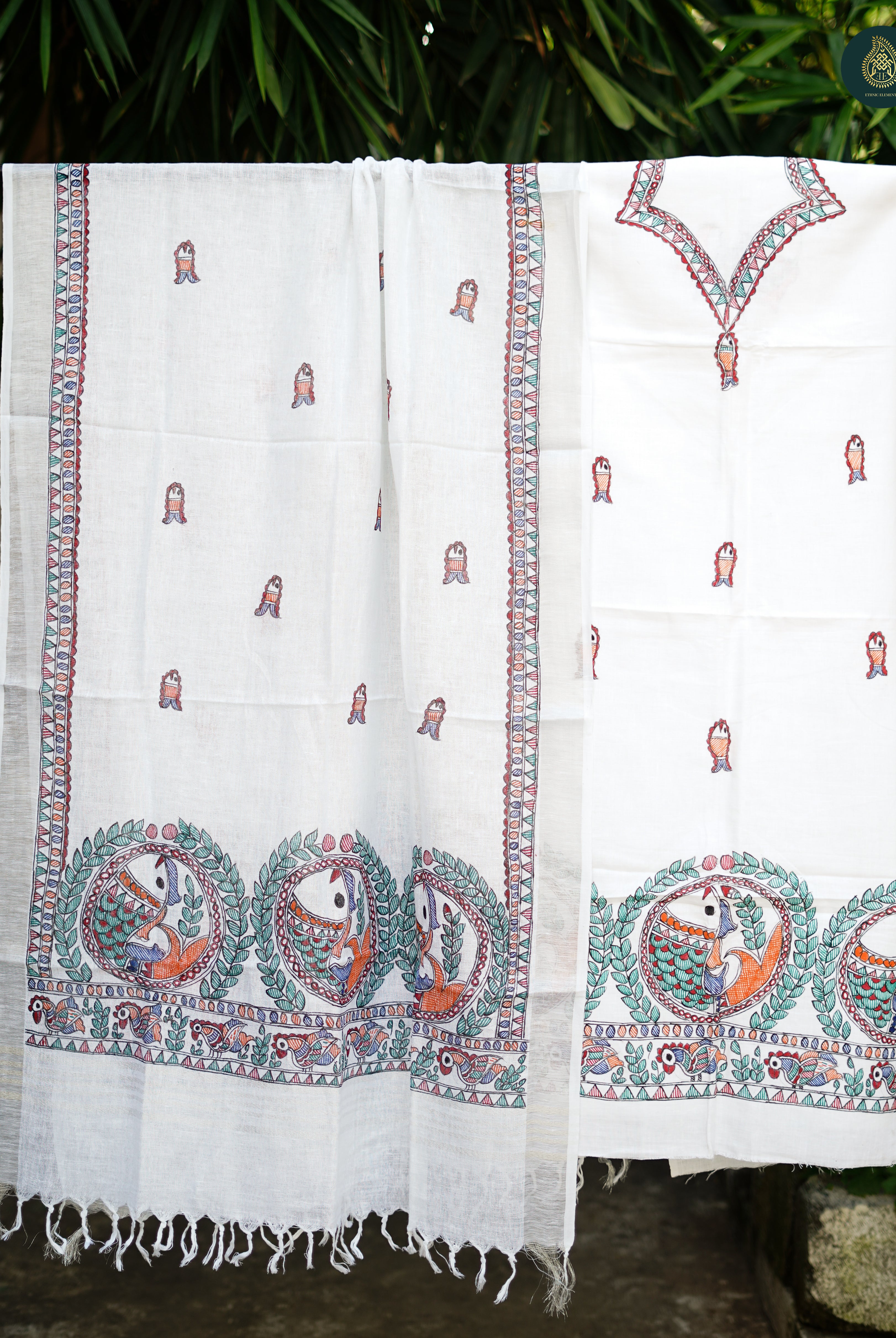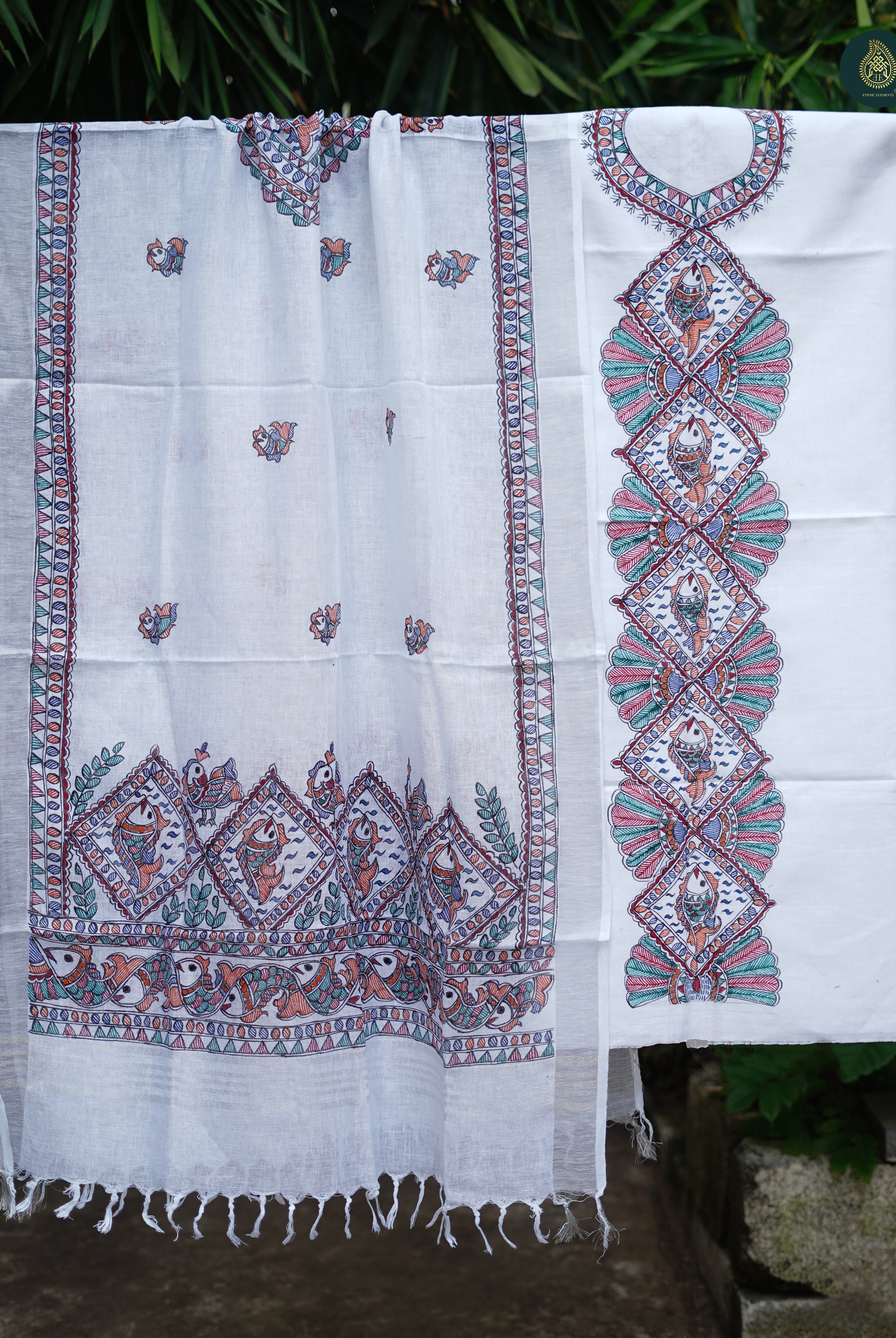 Authentic Original Hand-Painted Madhubani Suit Sets made from pure woven fabrics. Madhubani Art is a type of folk-art form. Each suit consists of line drawings filled with bright colors and contrasts or patterns. Only natural dyes and pigments are used for fabric color and painting.
