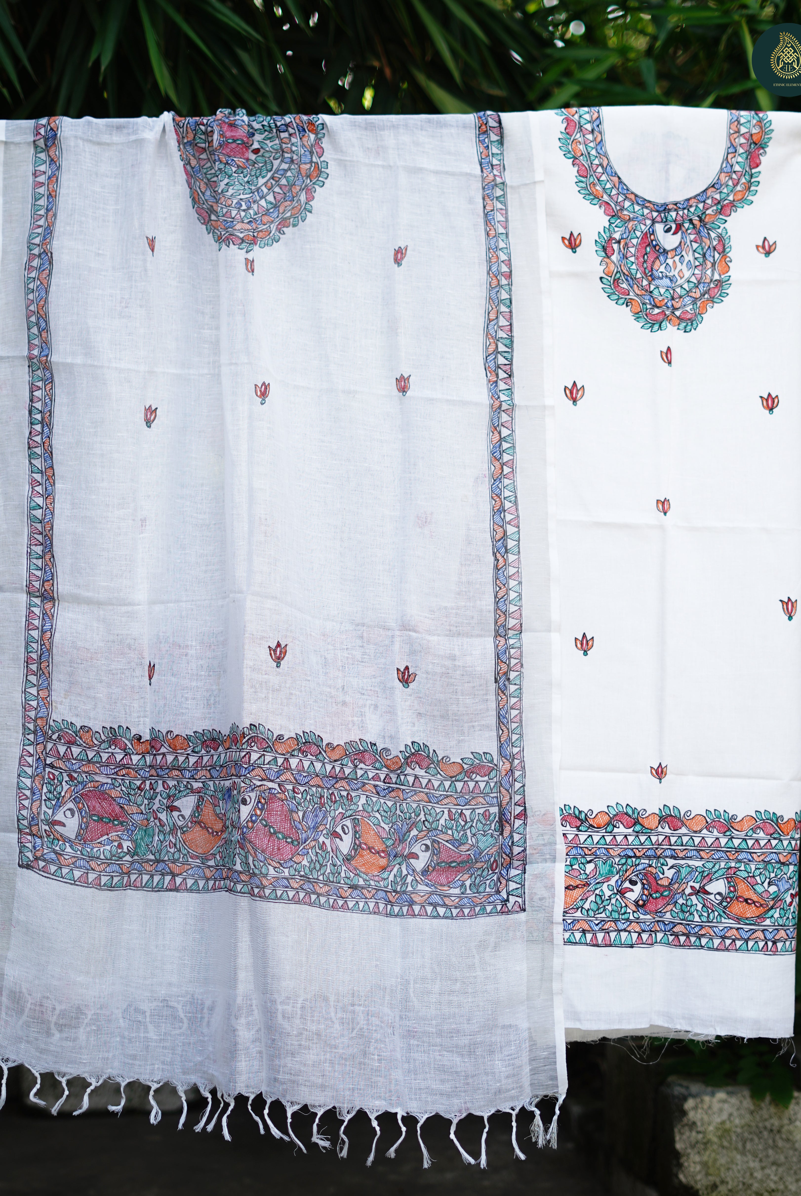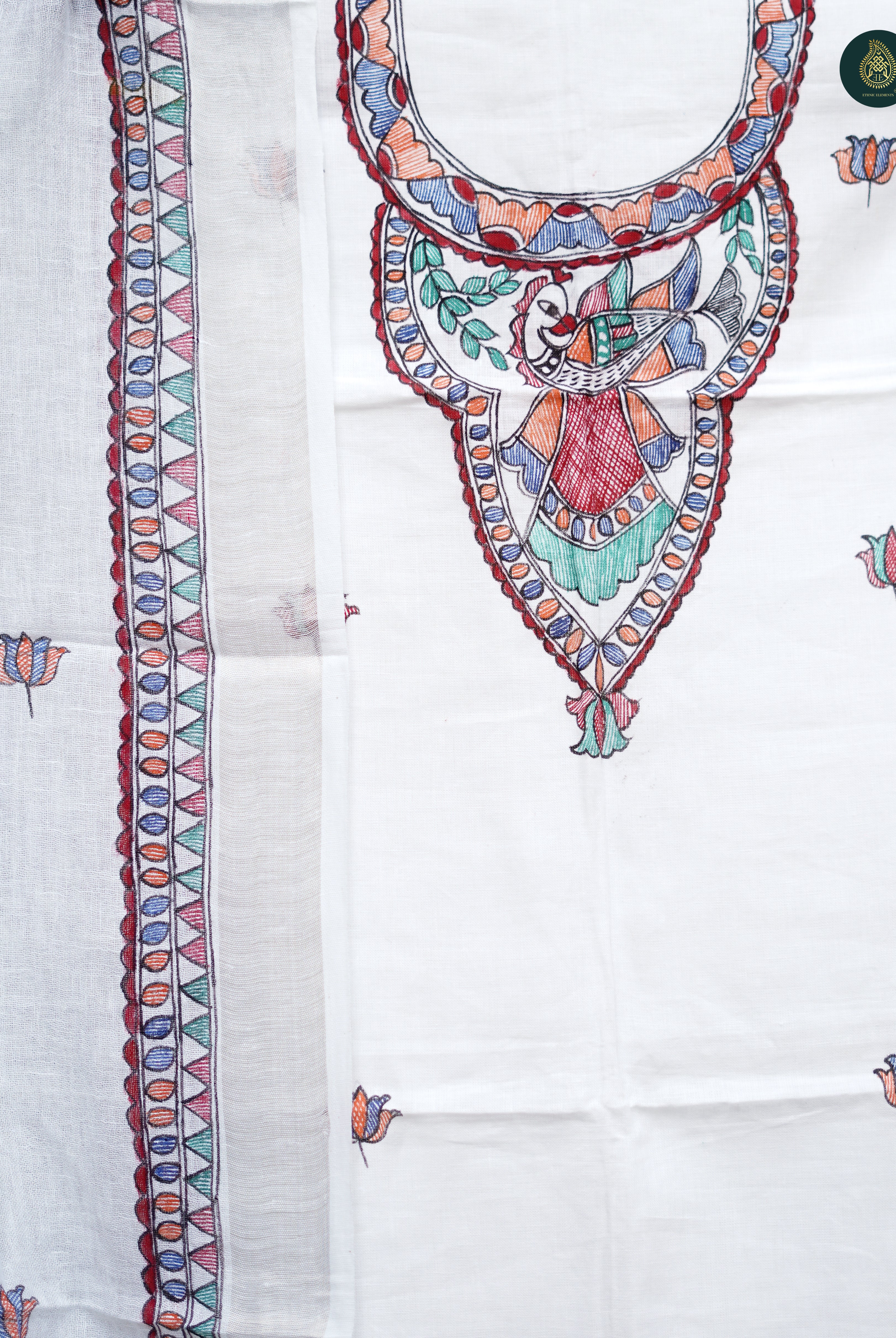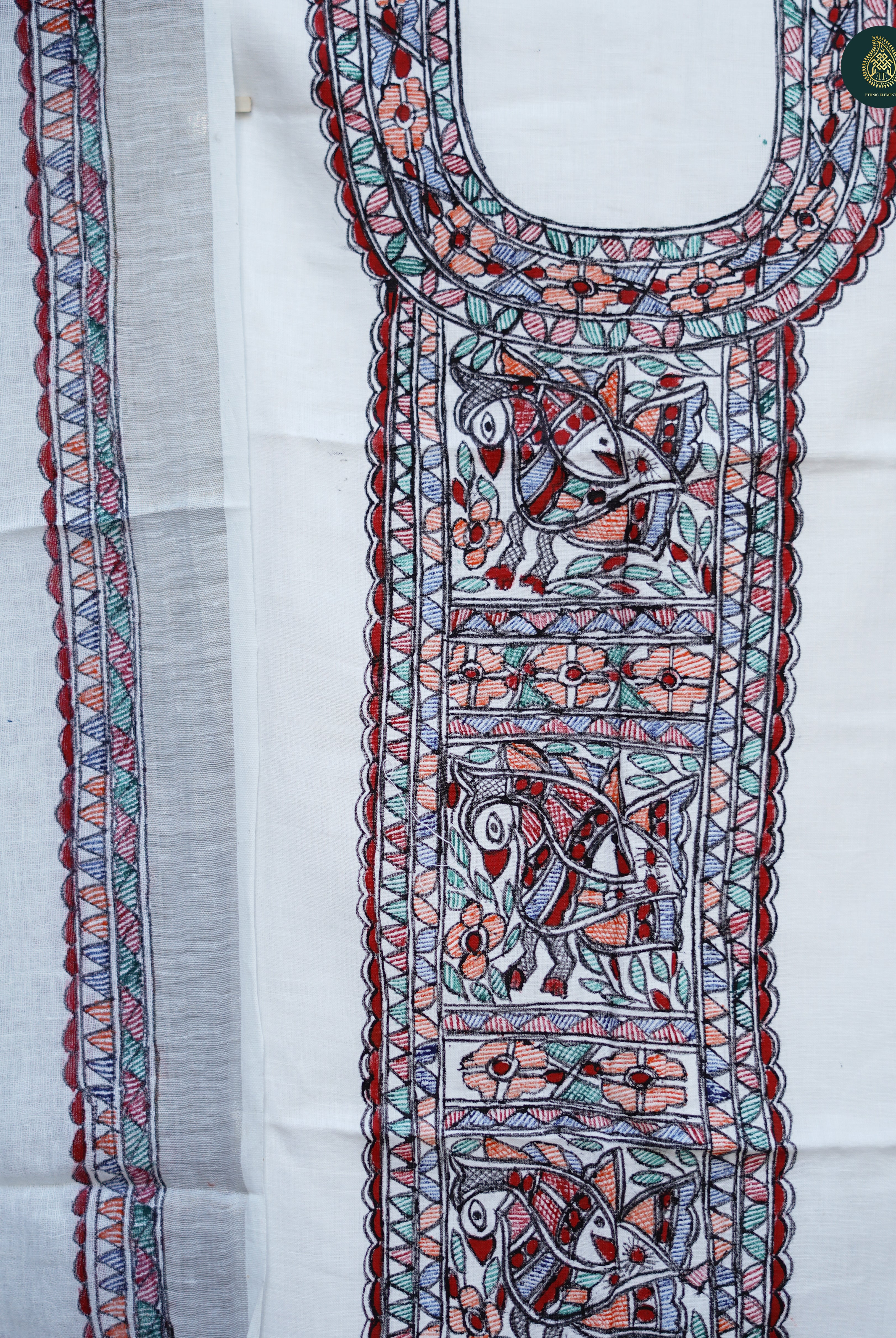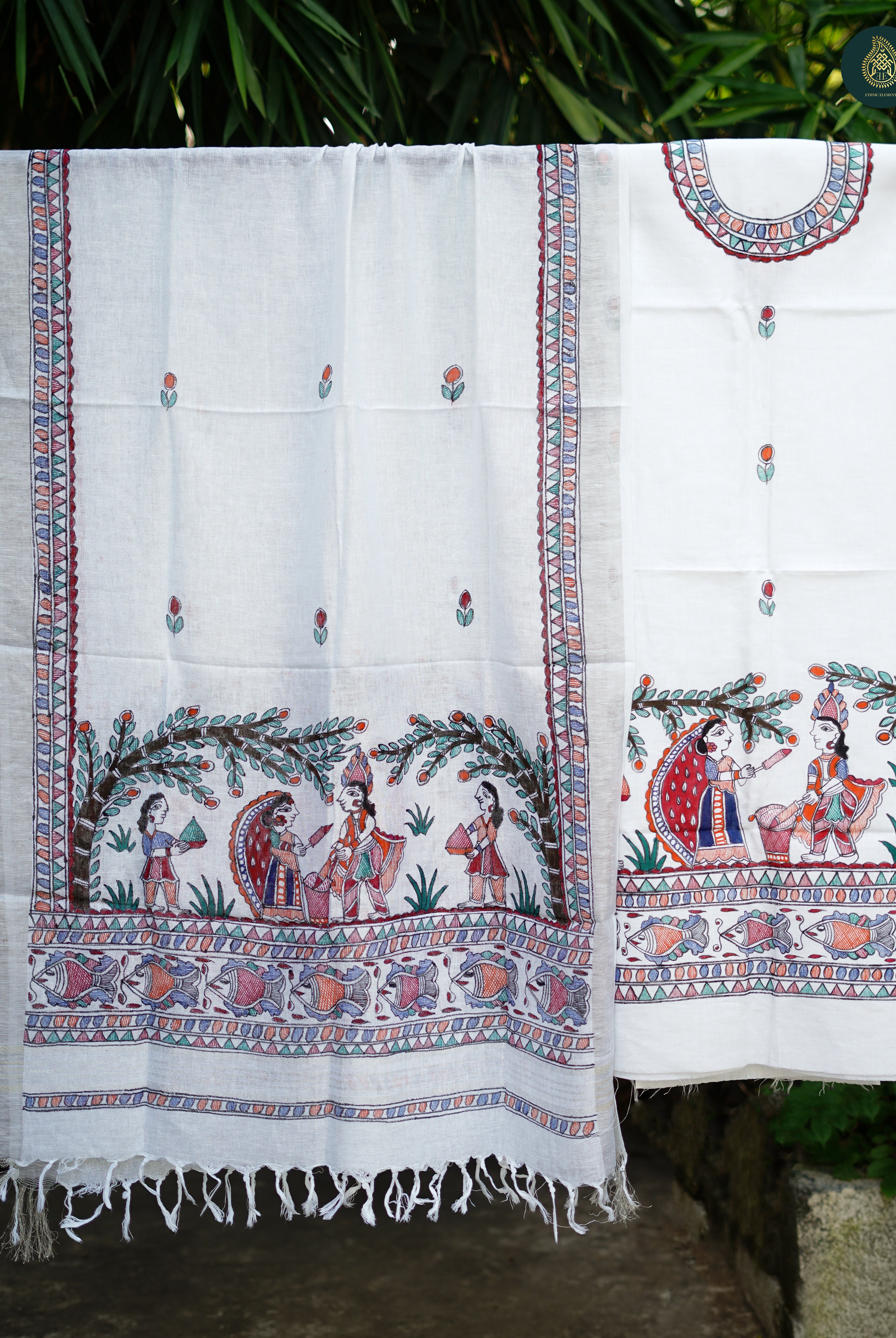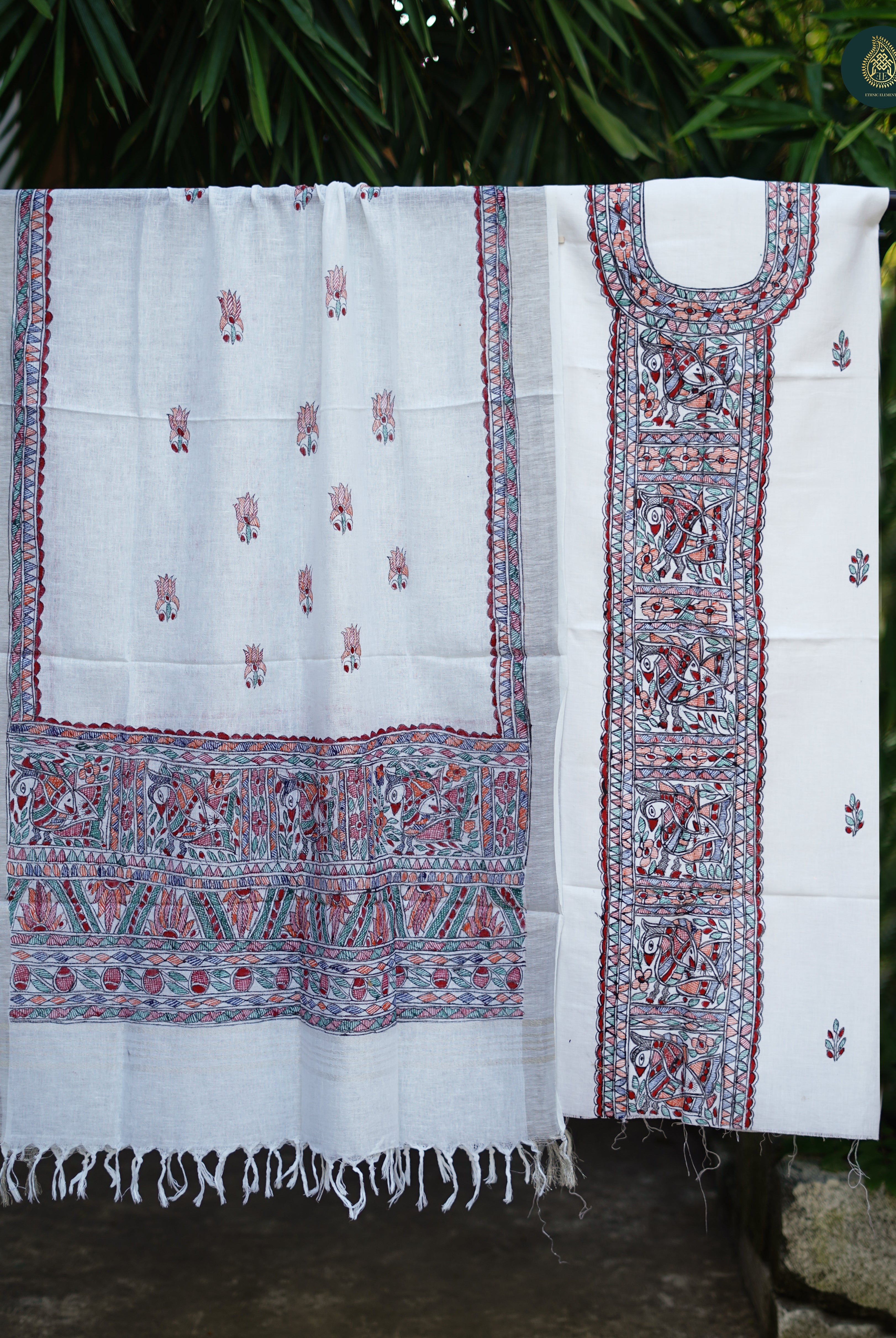 Authentic Original Hand-Painted Madhubani Suit Sets made from pure woven fabrics. Madhubani Art is a type of folk-art form. Each suit consists of line drawings filled with bright colors and contrasts or patterns. Only natural dyes and pigments are used for fabric color and painting.