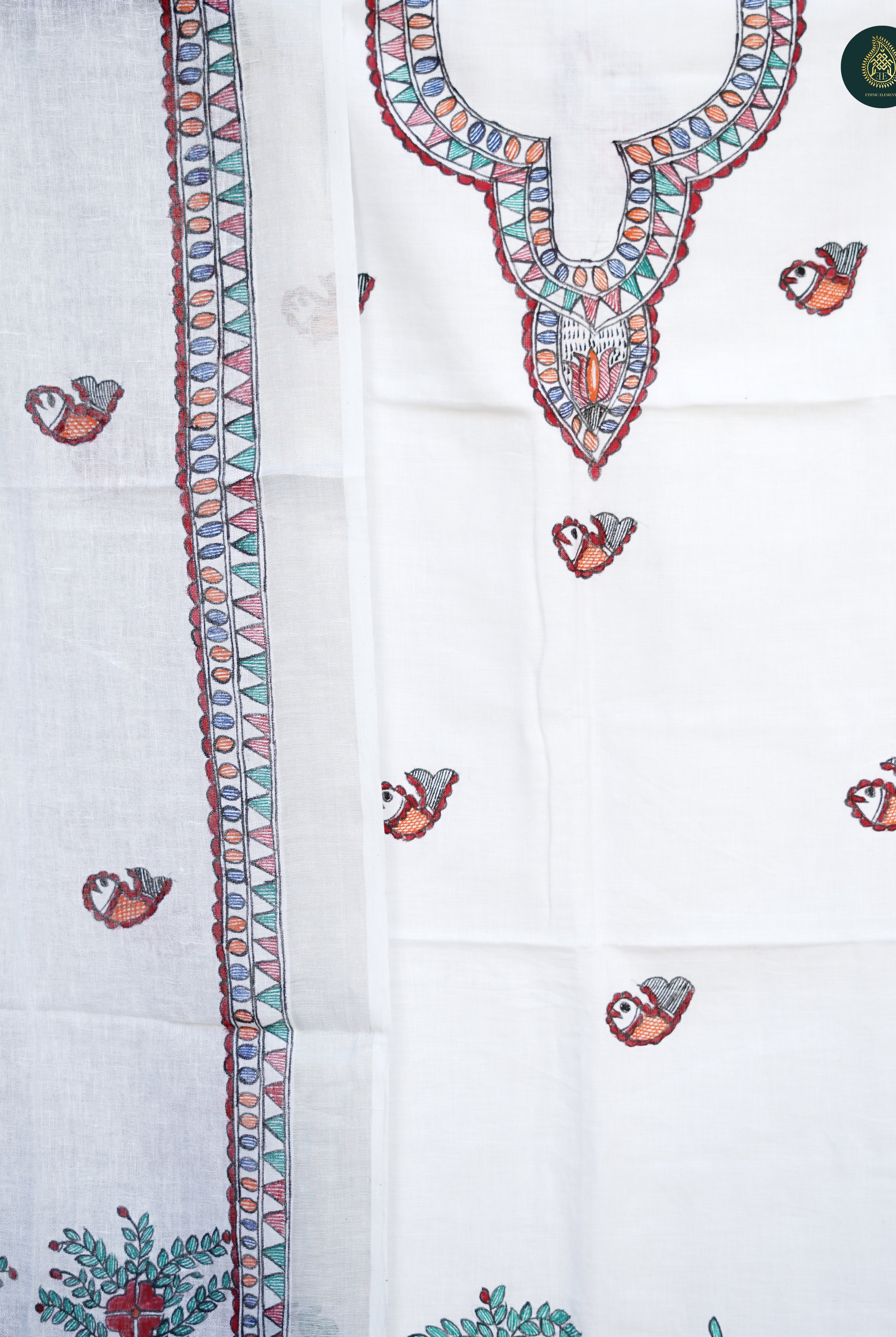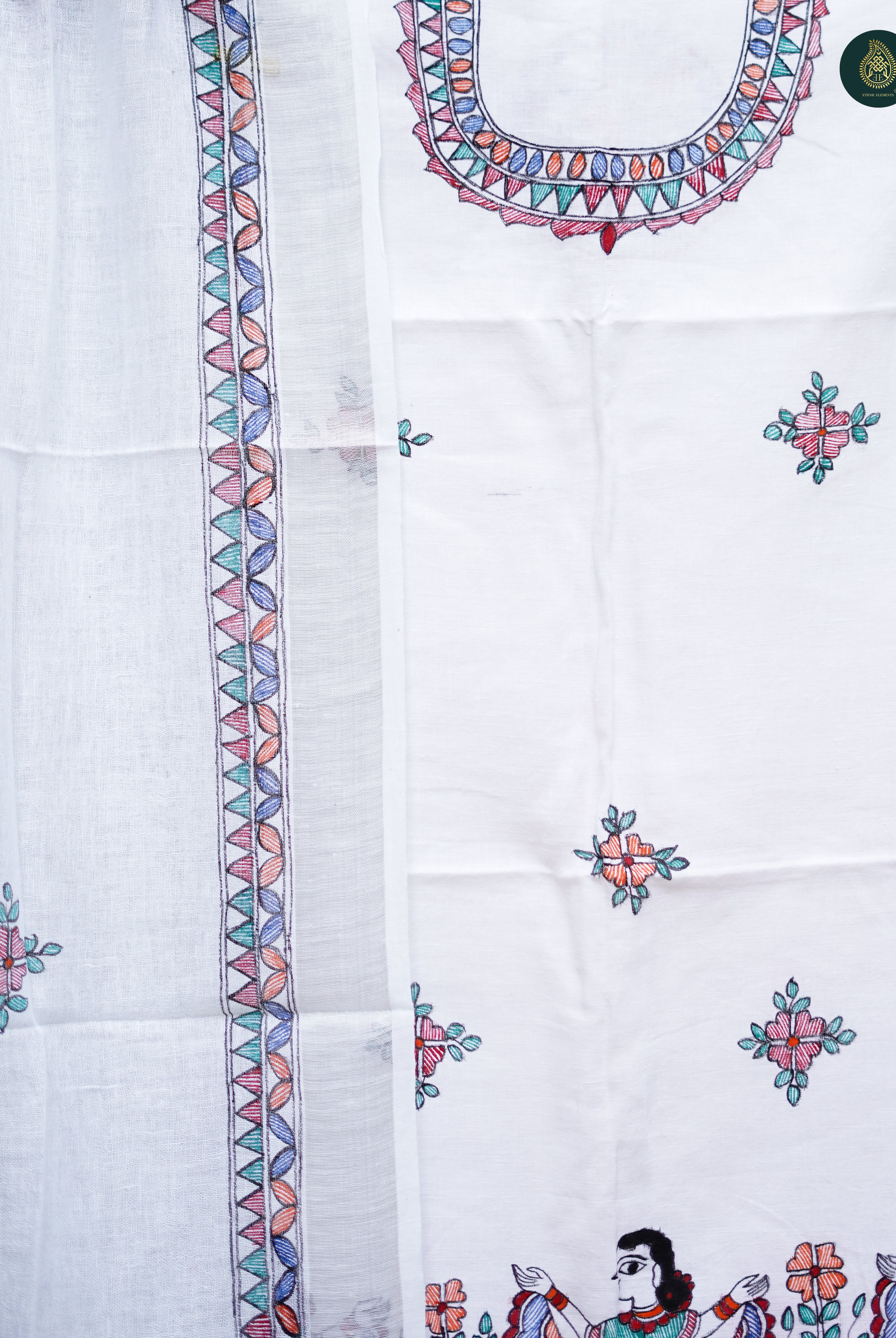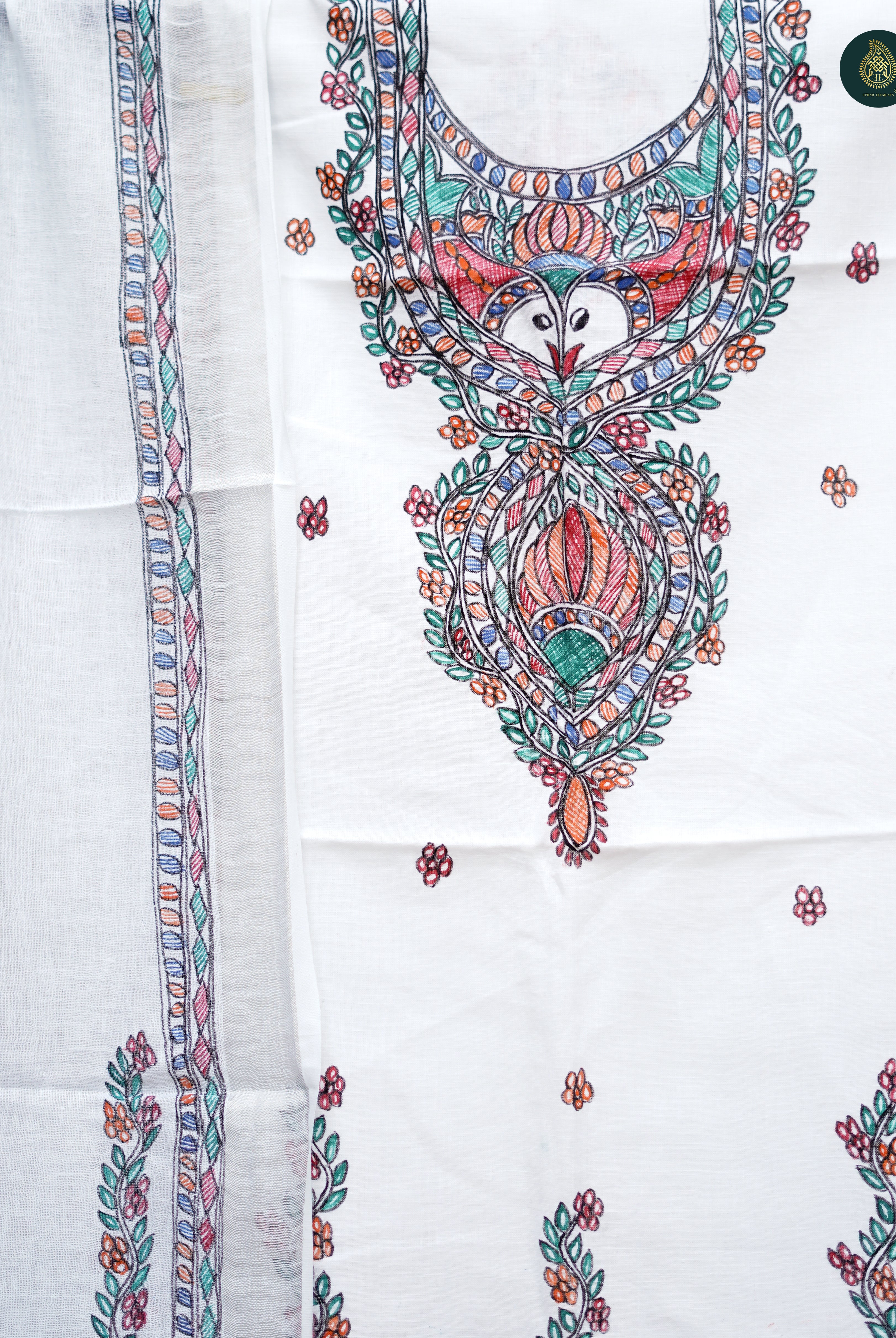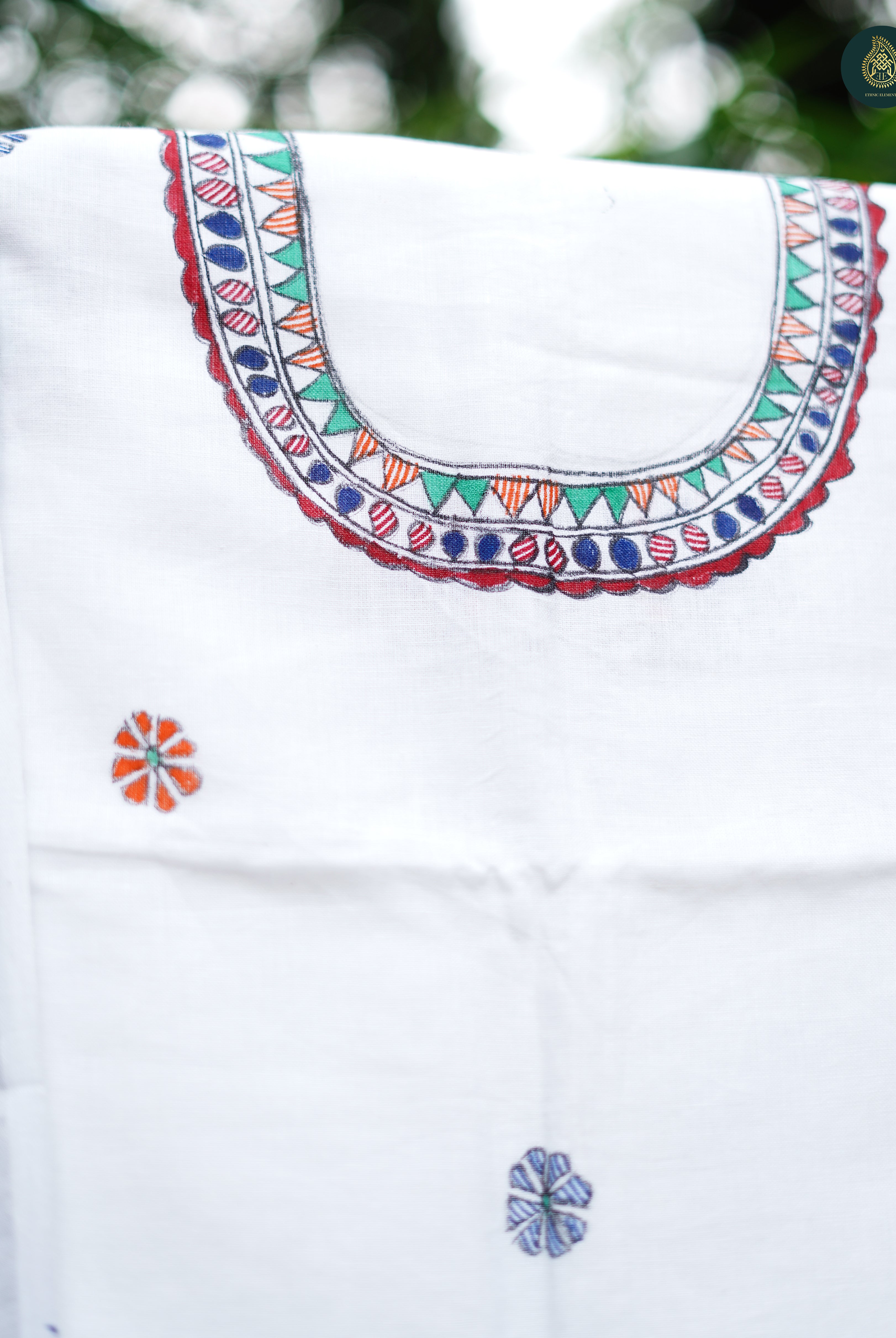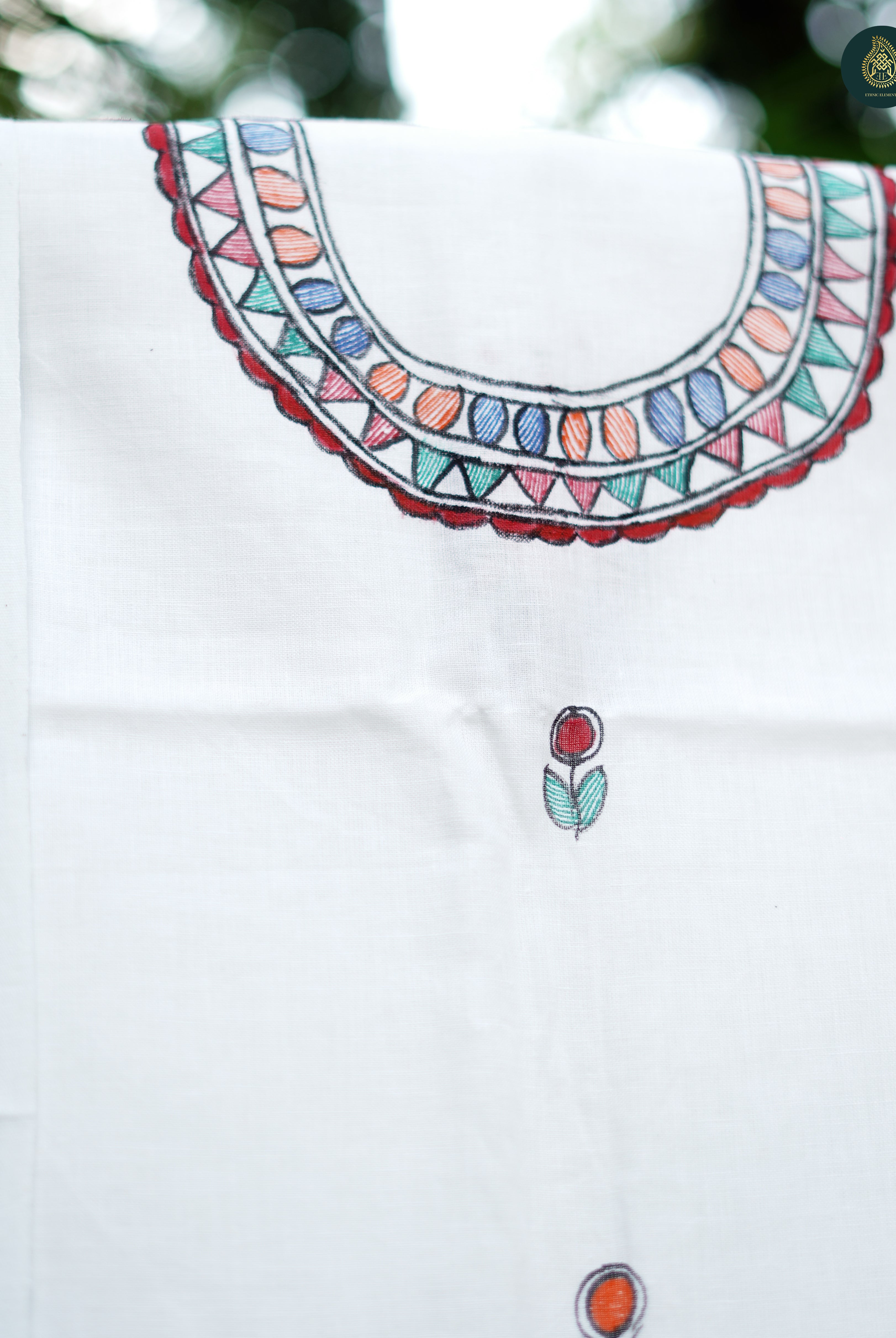 Authentic Original Hand-Painted Madhubani Suit Sets made from pure woven fabrics. Madhubani Art is a type of folk-art form. Each suit consists of line drawings filled with bright colors and contrasts or patterns. Only natural dyes and pigments are used for fabric color and painting.