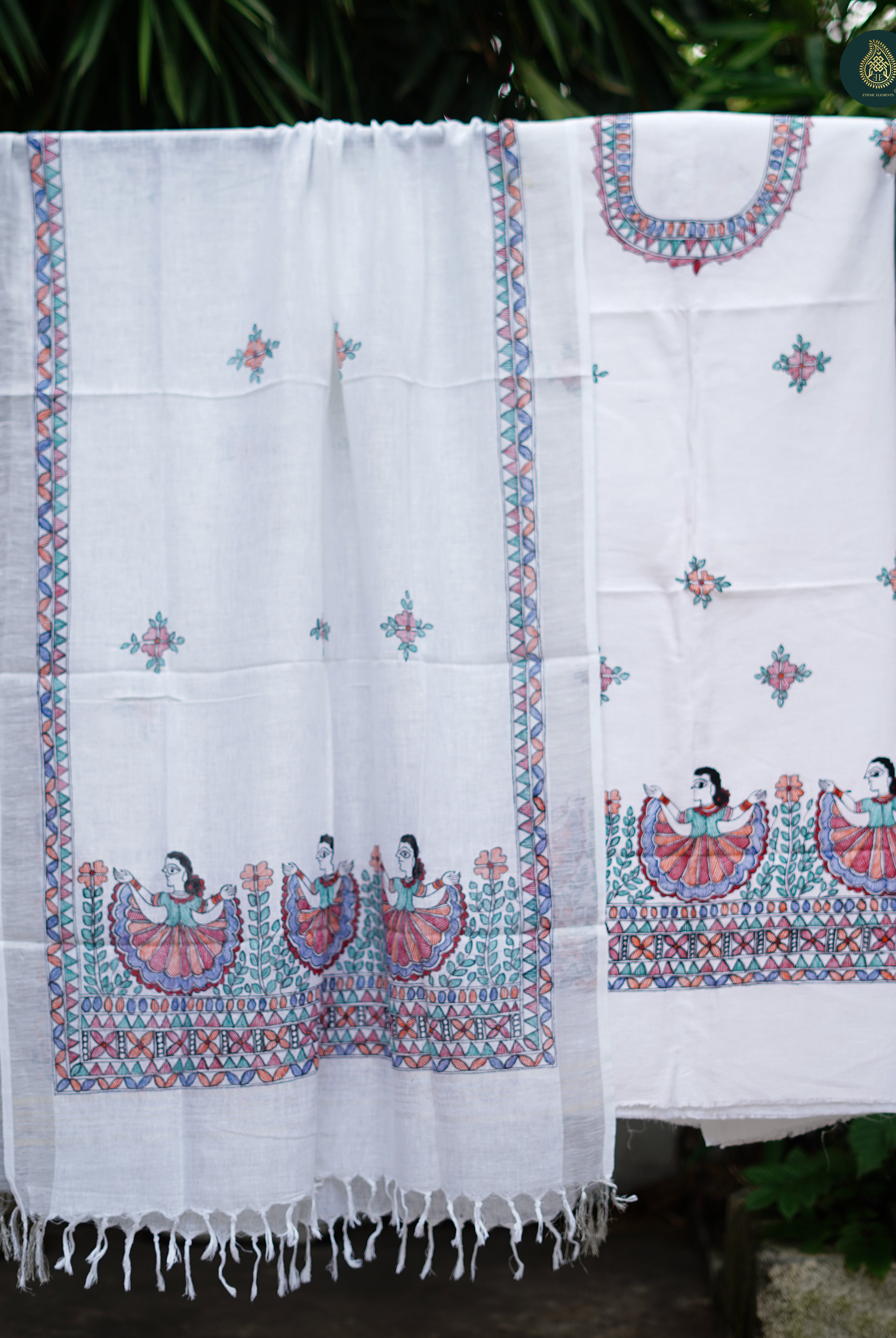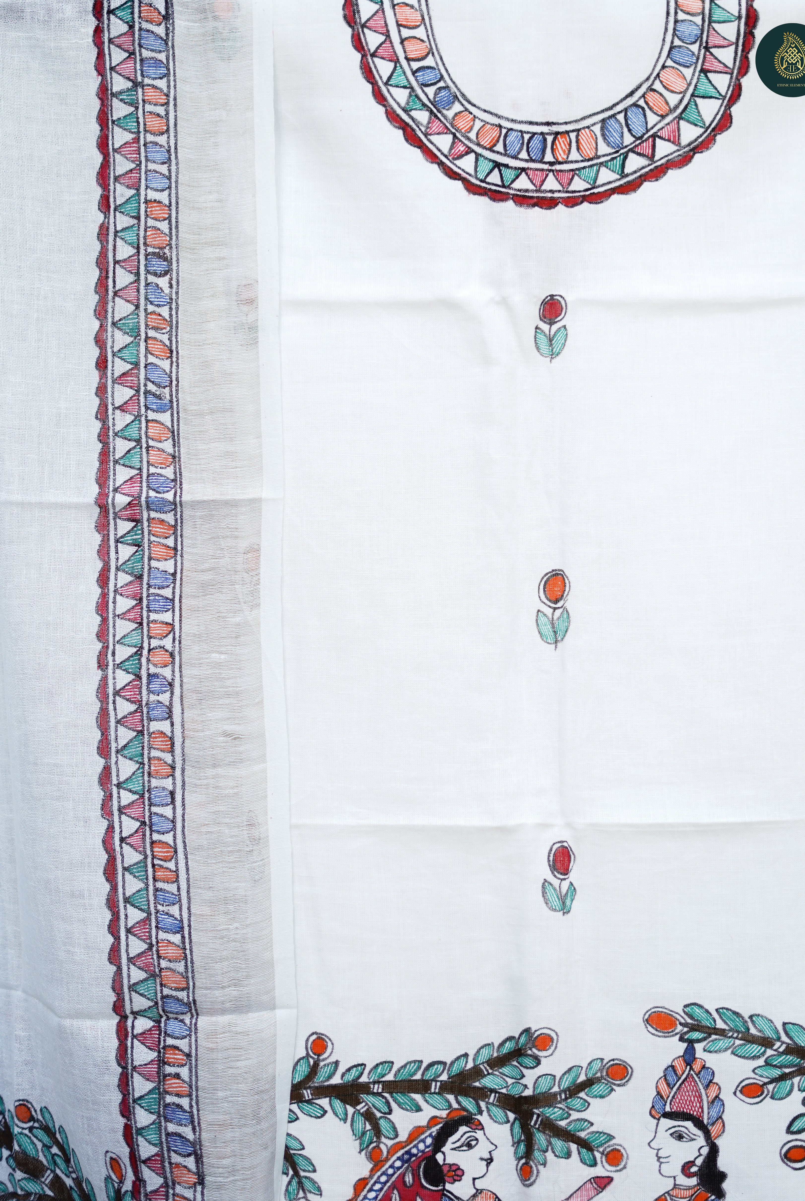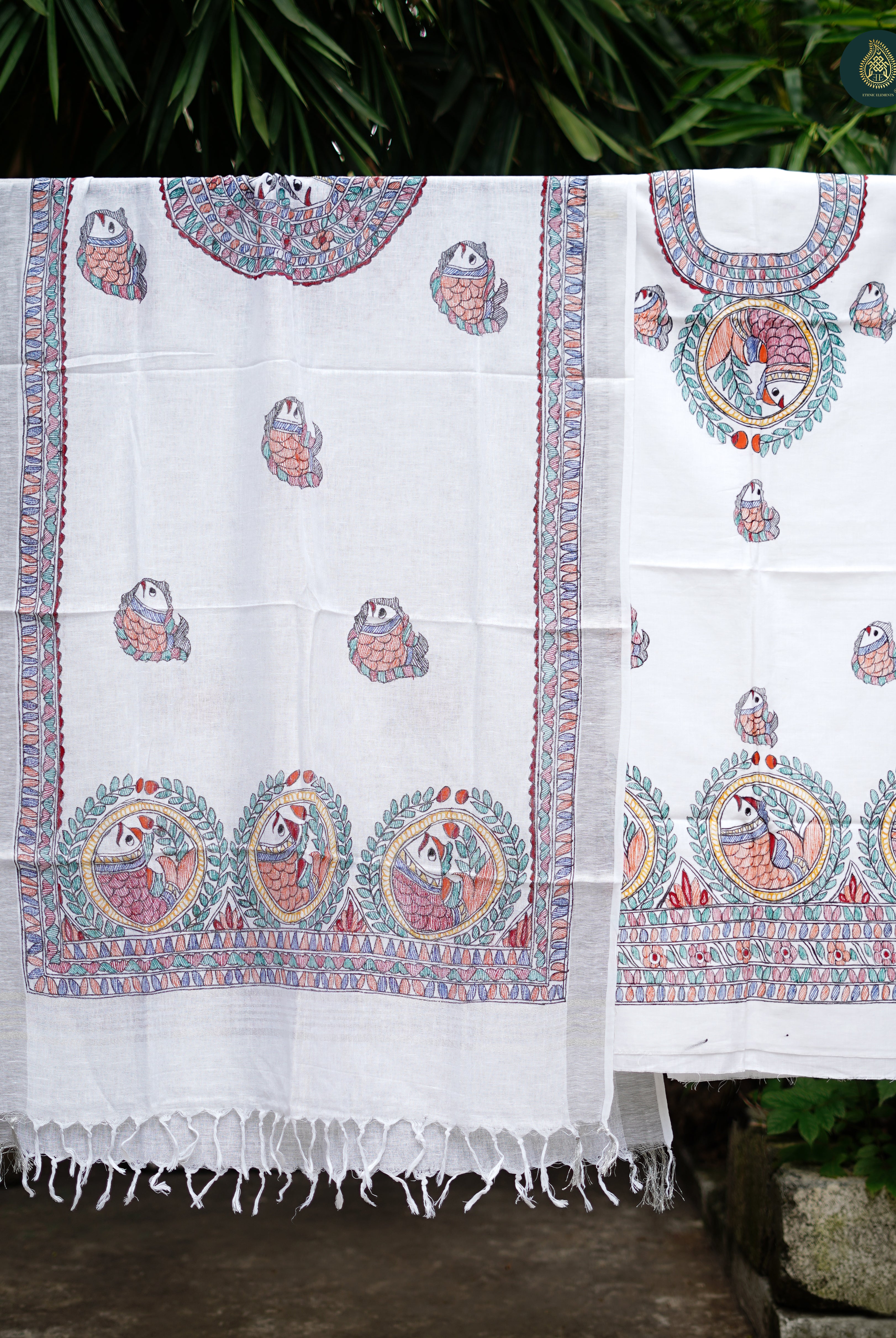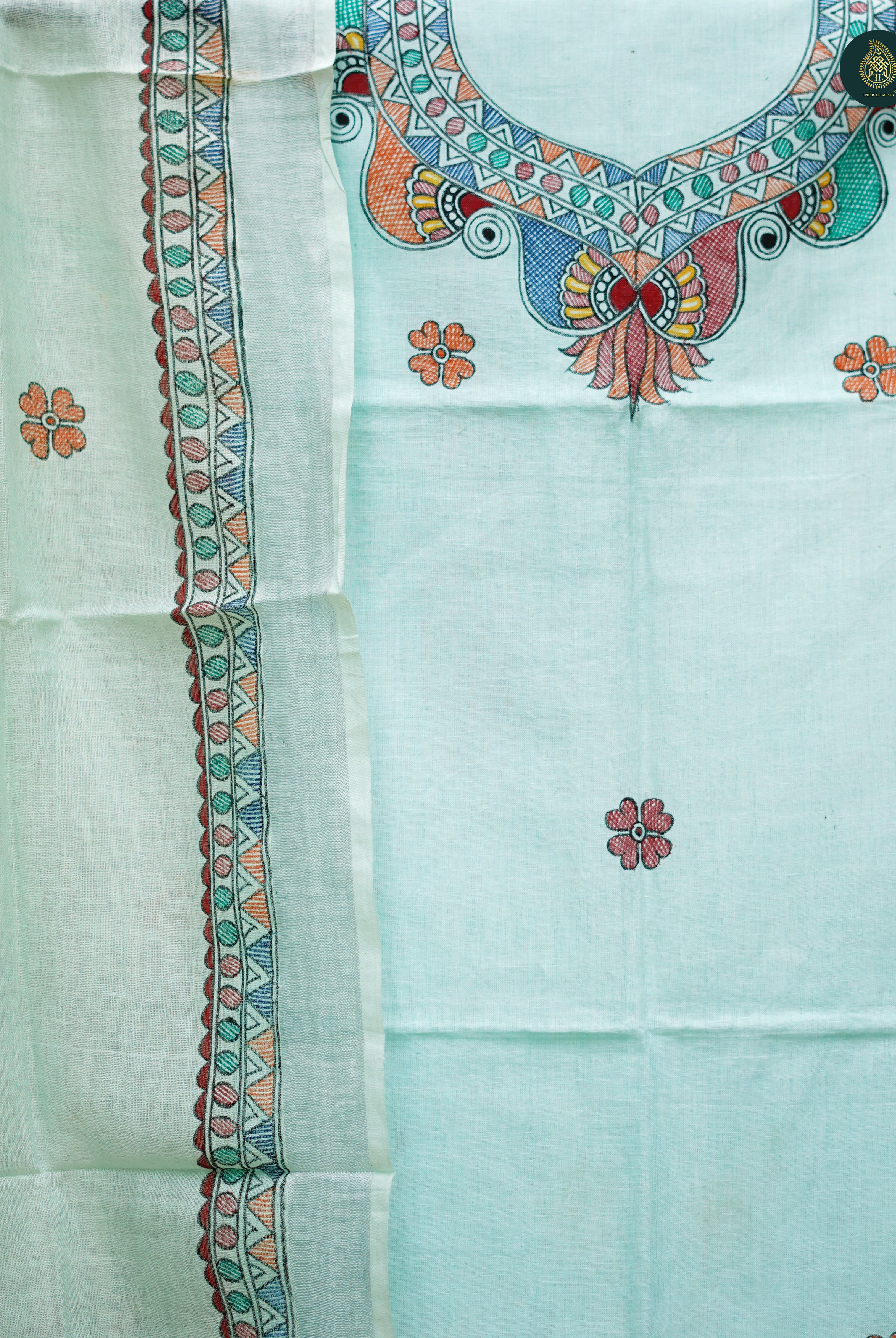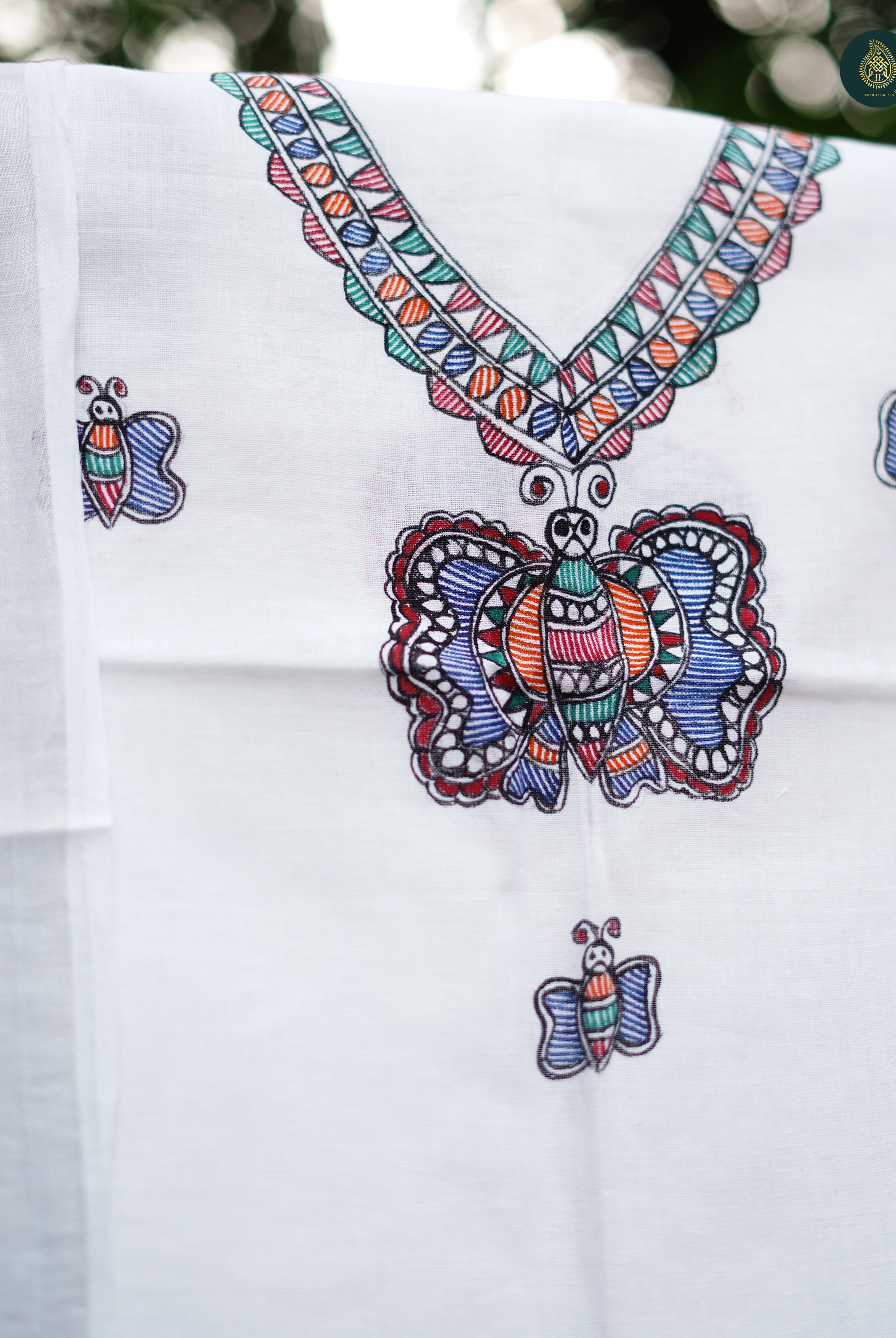Authentic Original Hand-Painted Madhubani Suit Sets made from pure woven fabrics. Madhubani Art is a type of folk-art form. Each suit consists of line drawings filled with bright colors and contrasts or patterns. Only natural dyes and pigments are used for fabric color and painting.